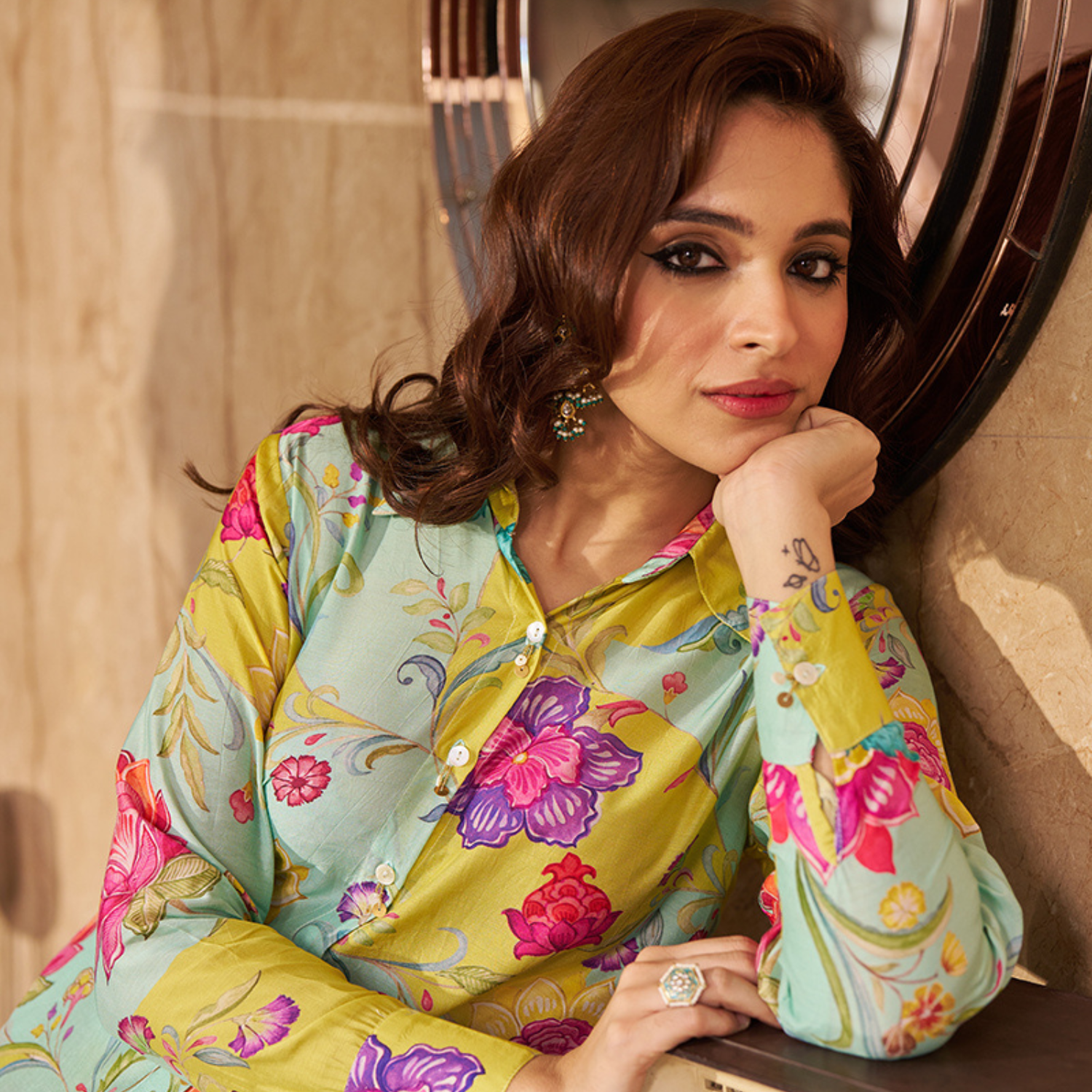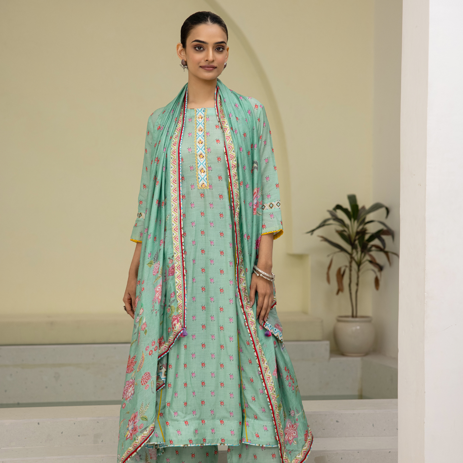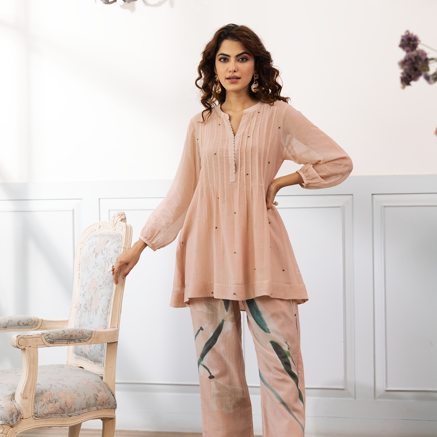 Madhuri Grover in Coral Motif Pintuck Inaya Kurta Set