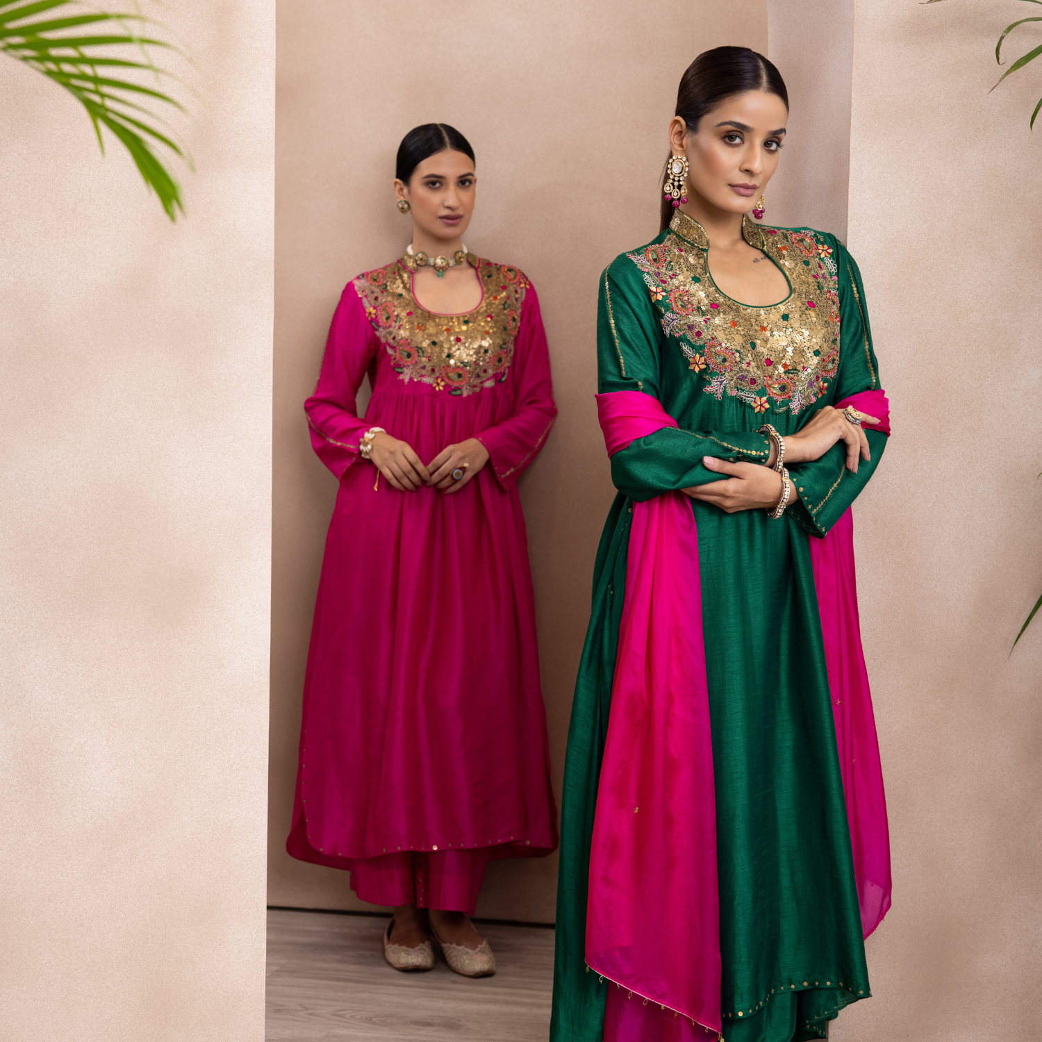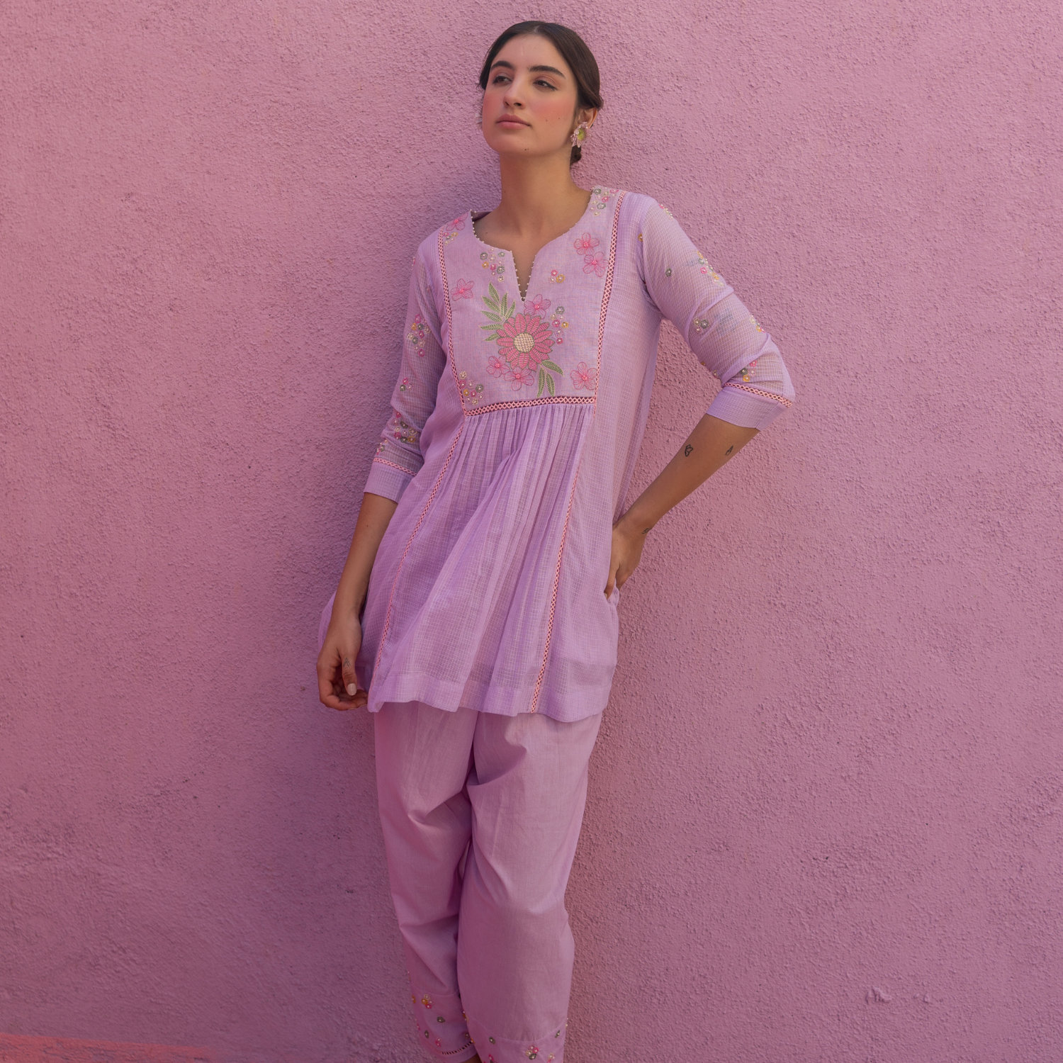 Meghna Nayyar in Rani Pink with Hand-Embroidered Yoke Kurta Set