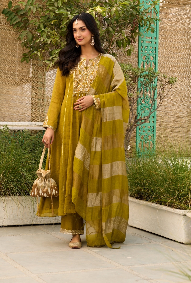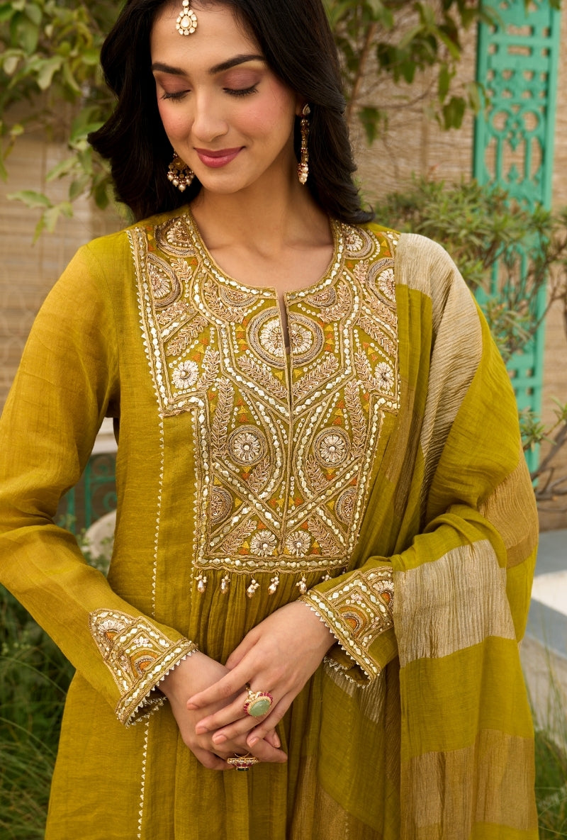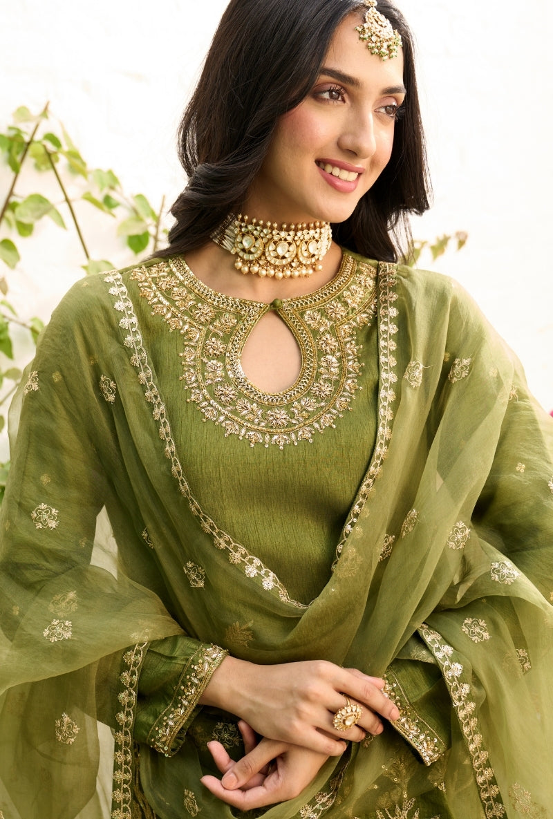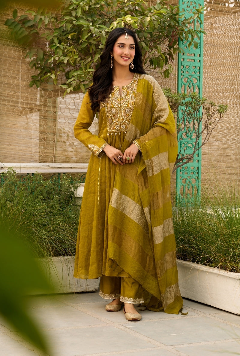 Olive Green Embroidered Square Yoke Sabah Anarkali Set