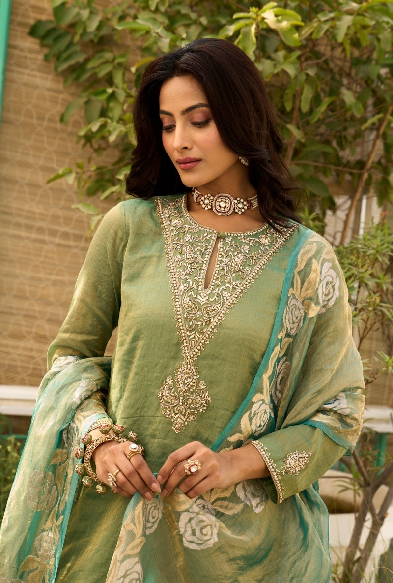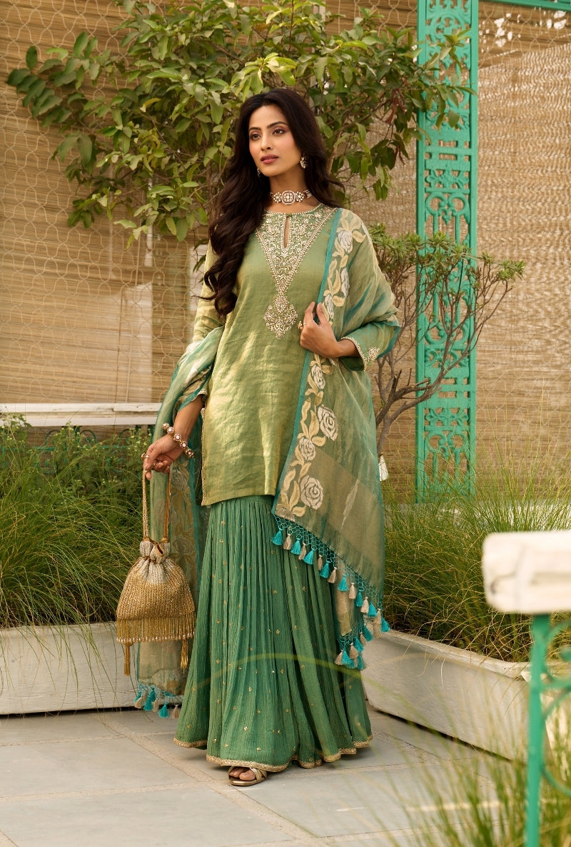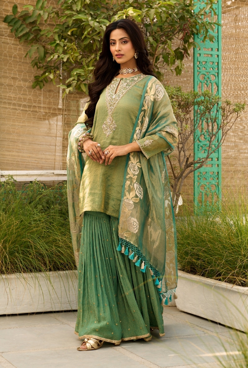 Green Embroidered Yoke Tissue Sabah Sharara Set