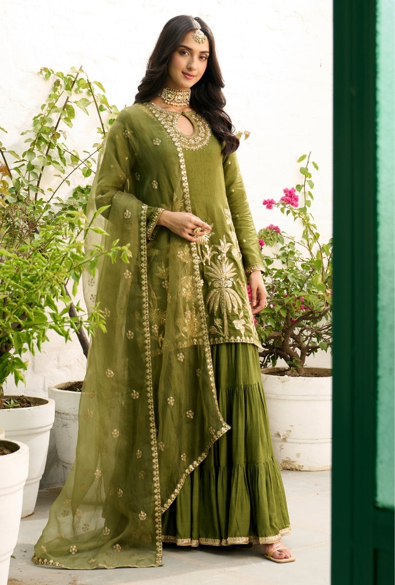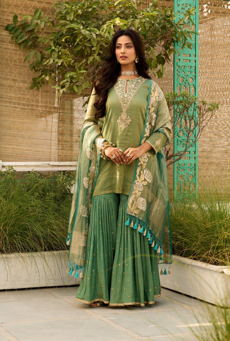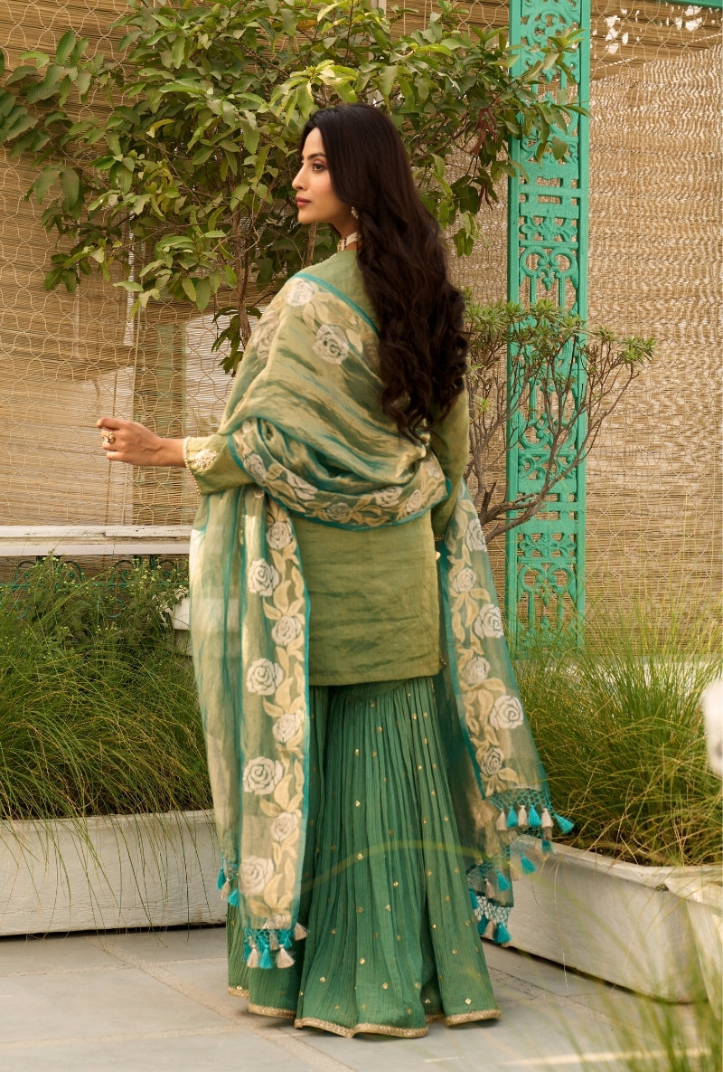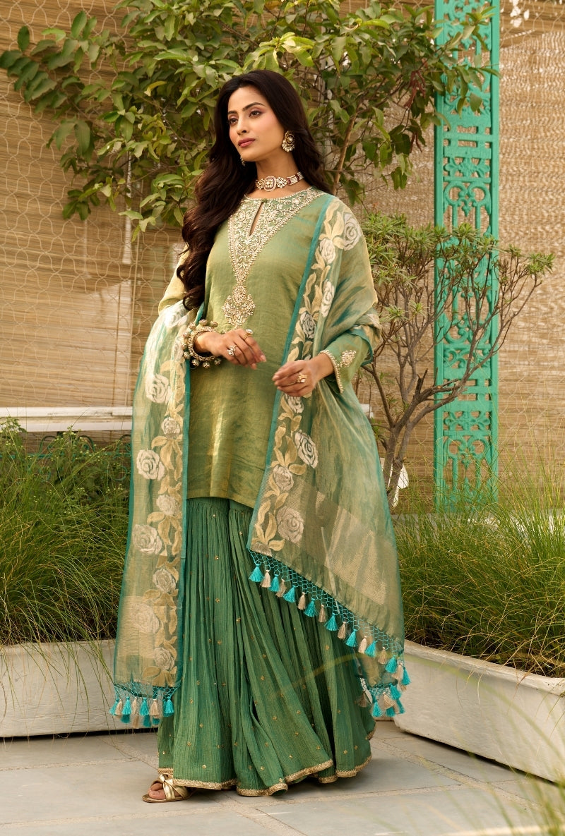 Green Palm Tree Zardosi Embroidered Sabah Sharara Set