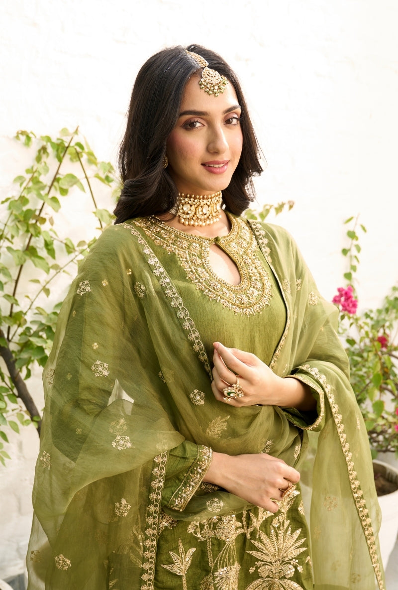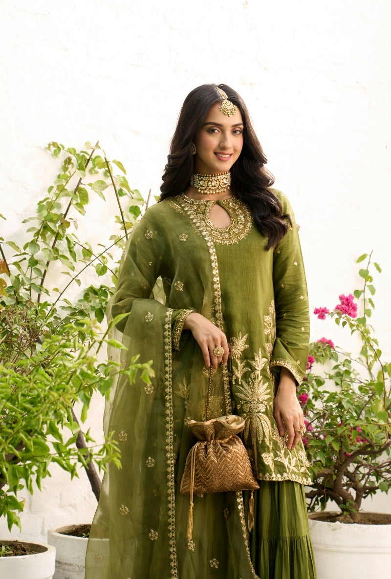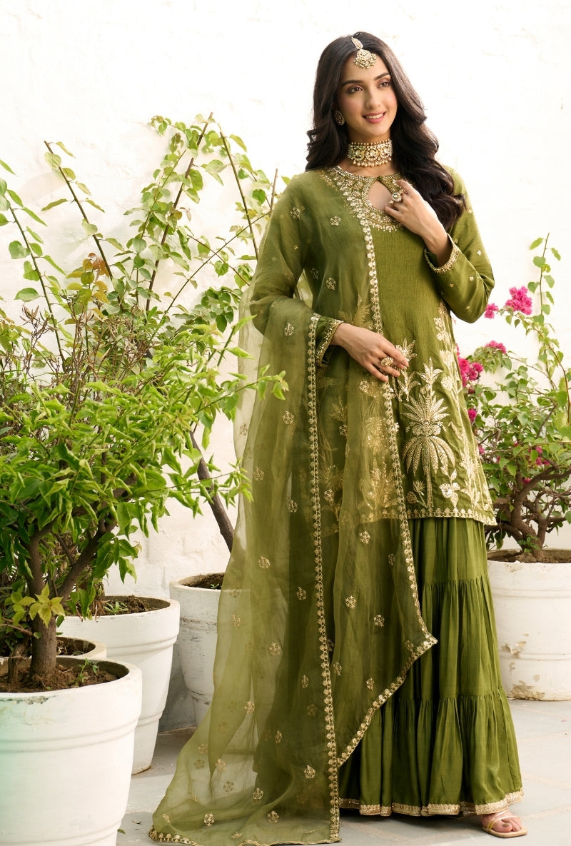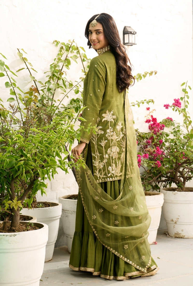 Green Palm Tree Zardosi Embroidered Sabah Sharara Set