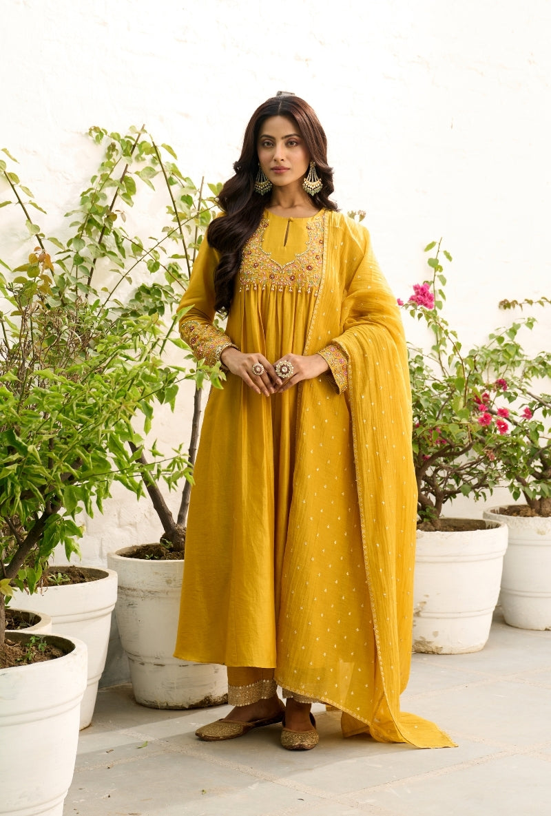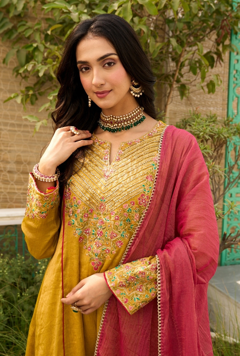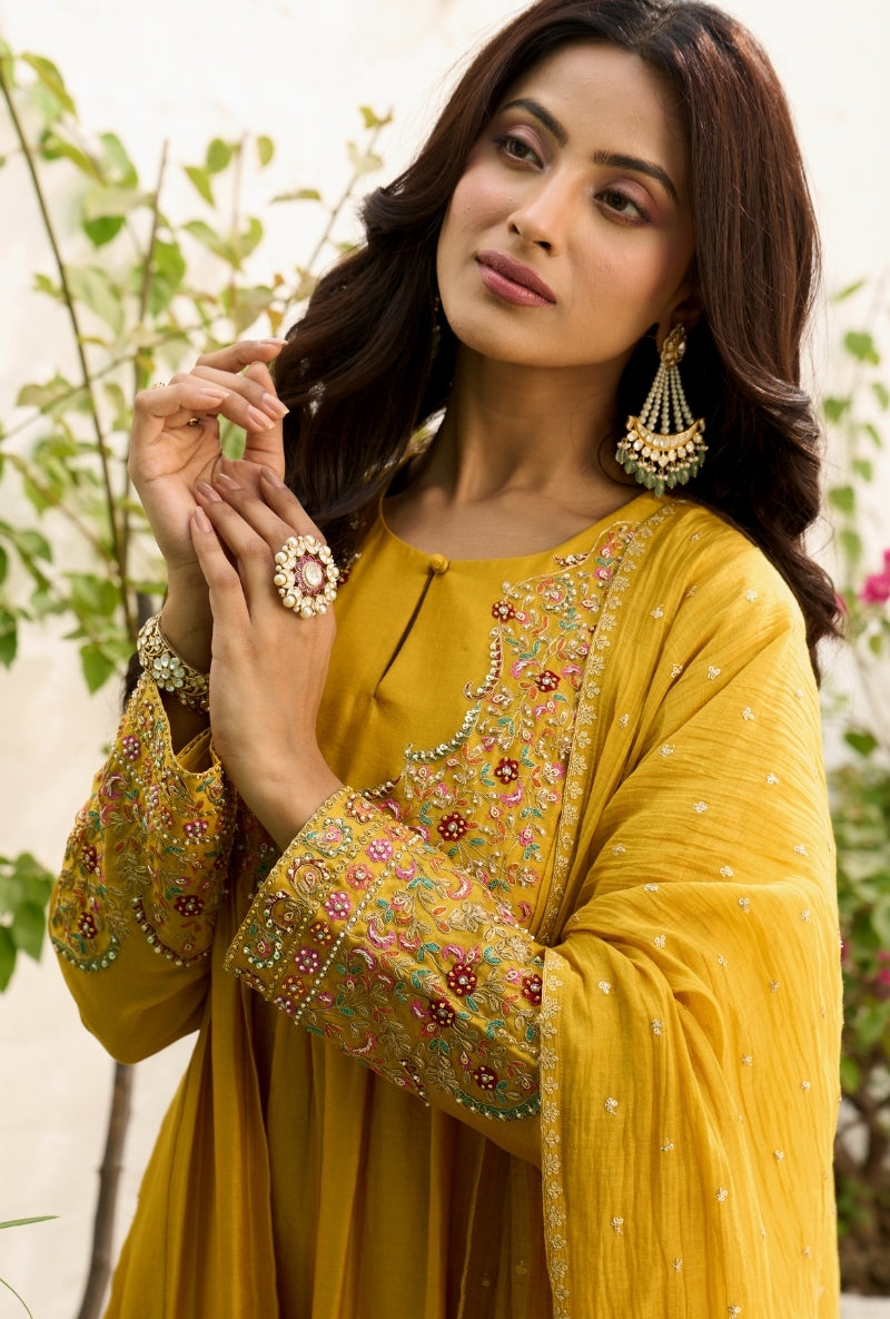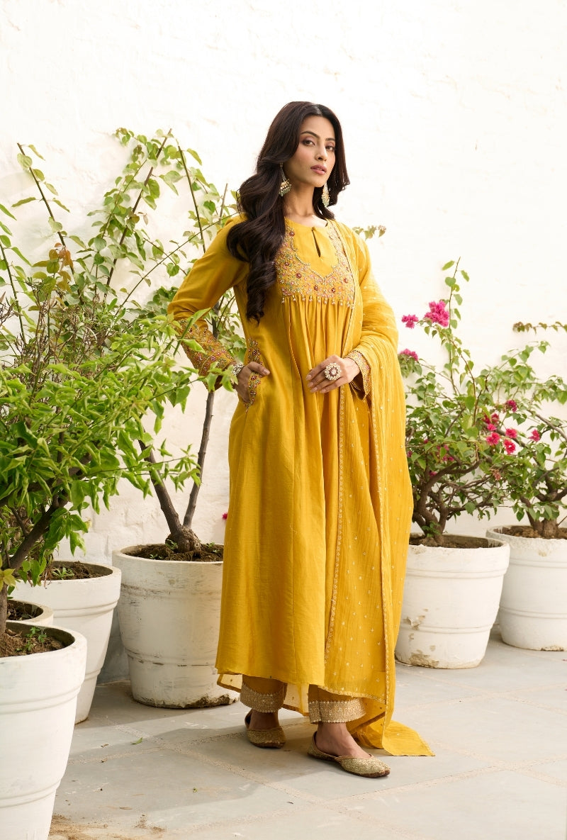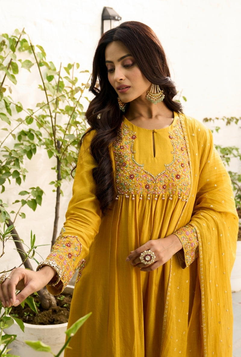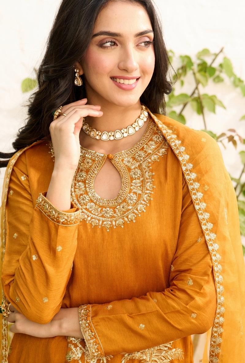 Mustard Heavy Yoke Paneled Sabah Anarkali Set