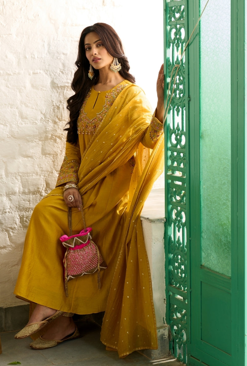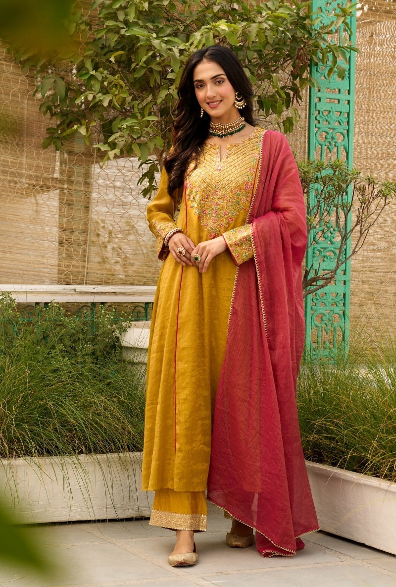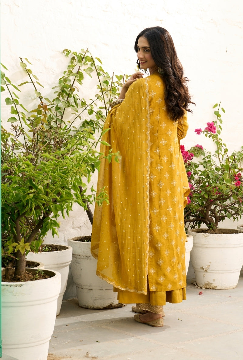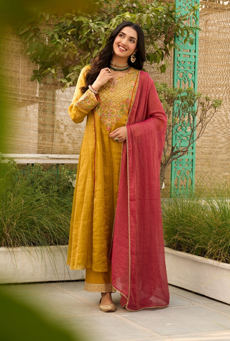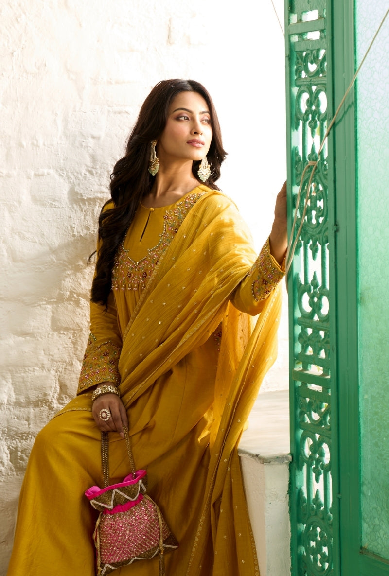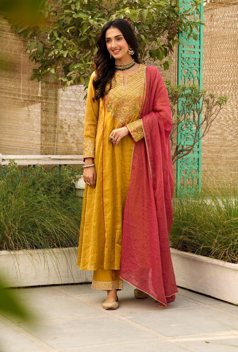 Mustard Heavy Yoke Paneled Sabah Anarkali Set