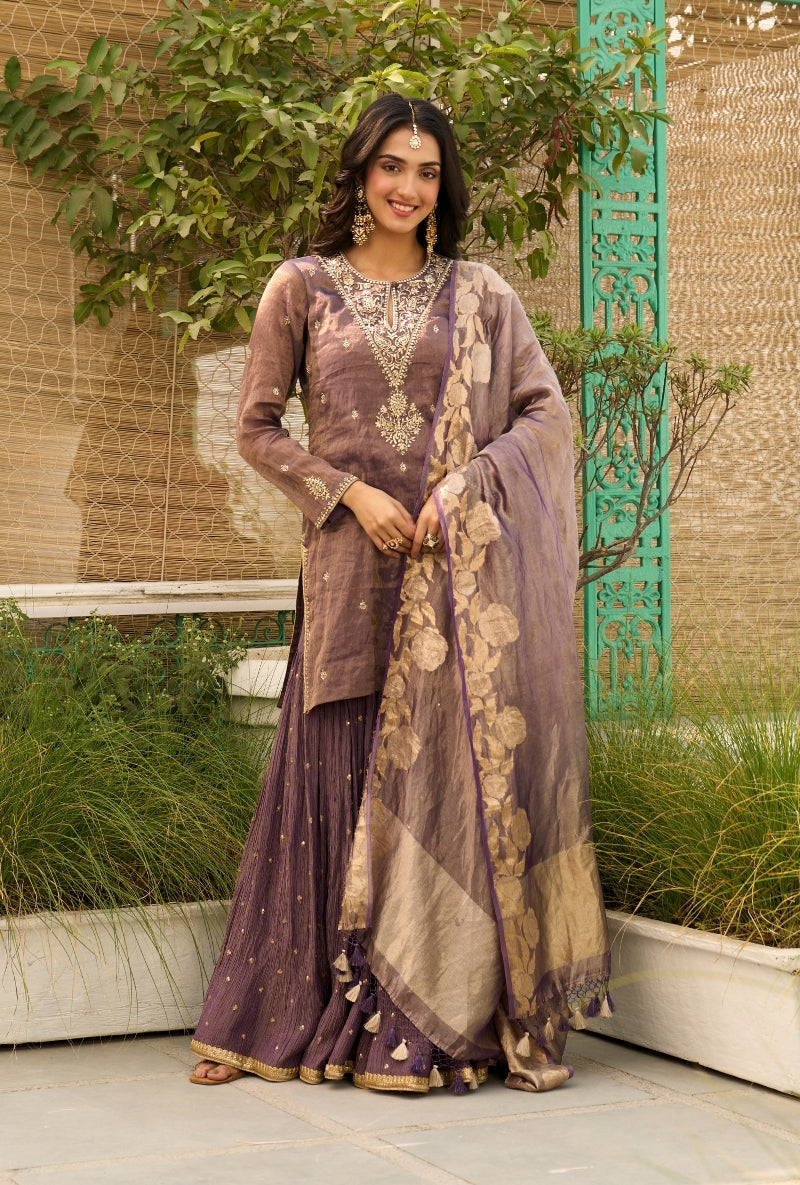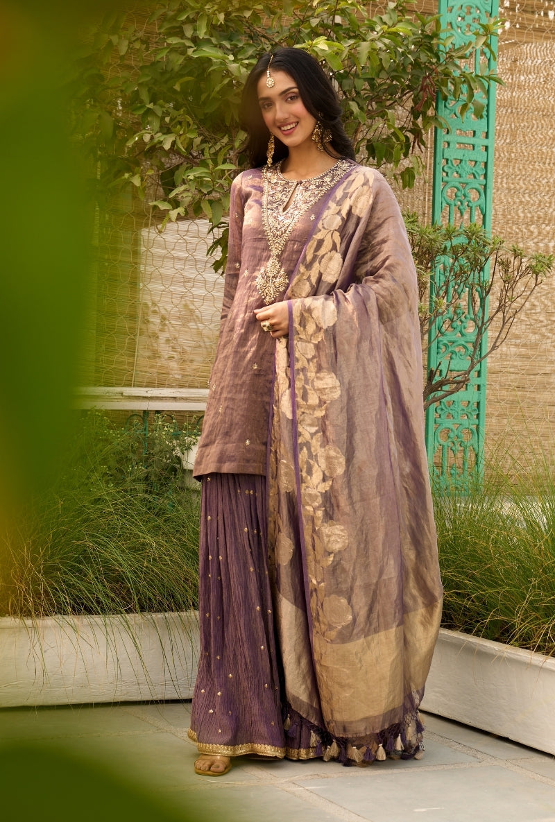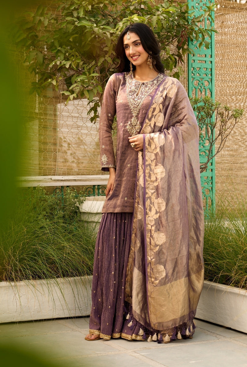 Purple Embroidered Yoke Tissue Sabah Sharara Set