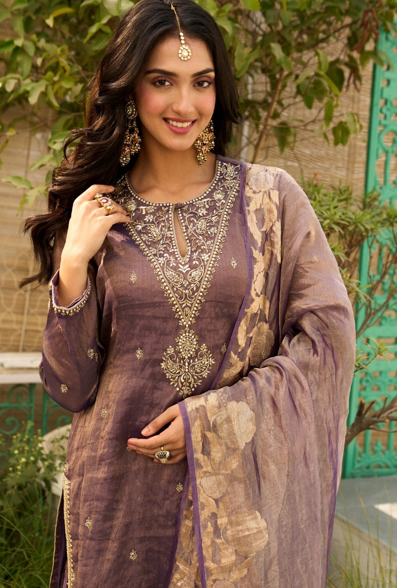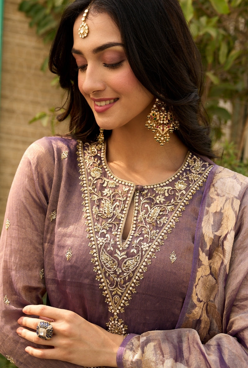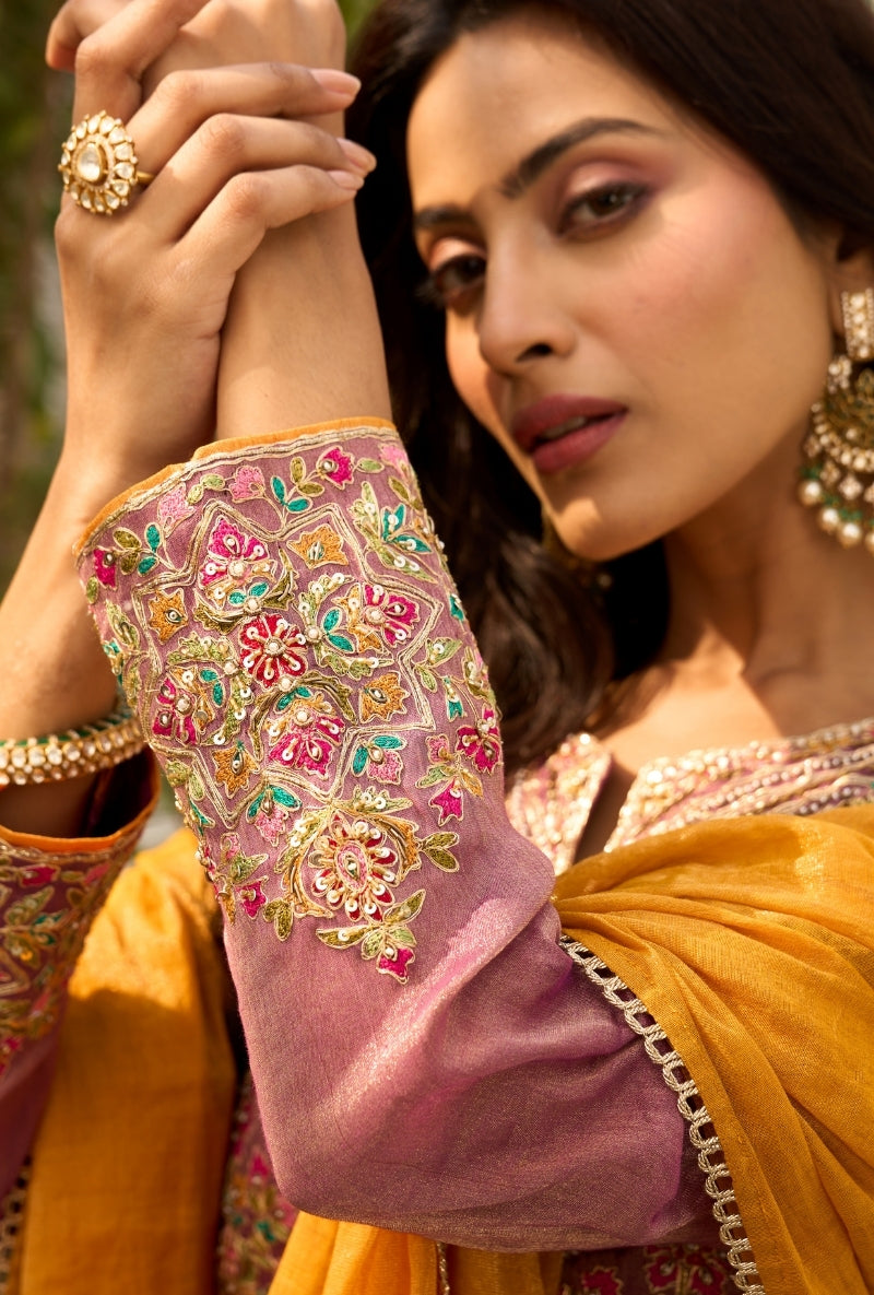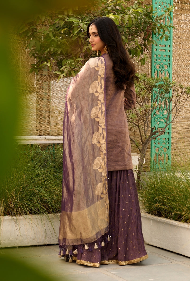 Purple Embroidered Yoke Tissue Sabah Sharara Set