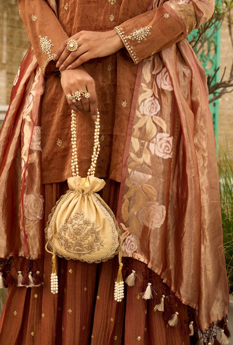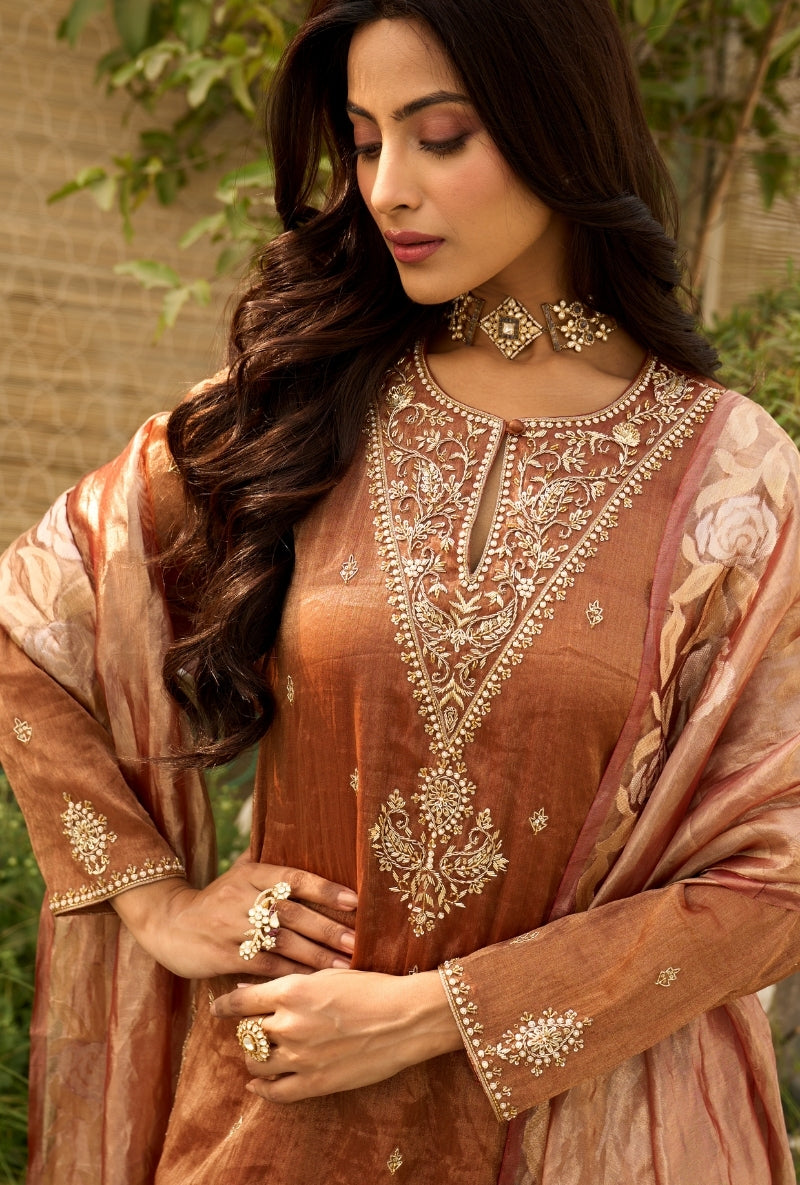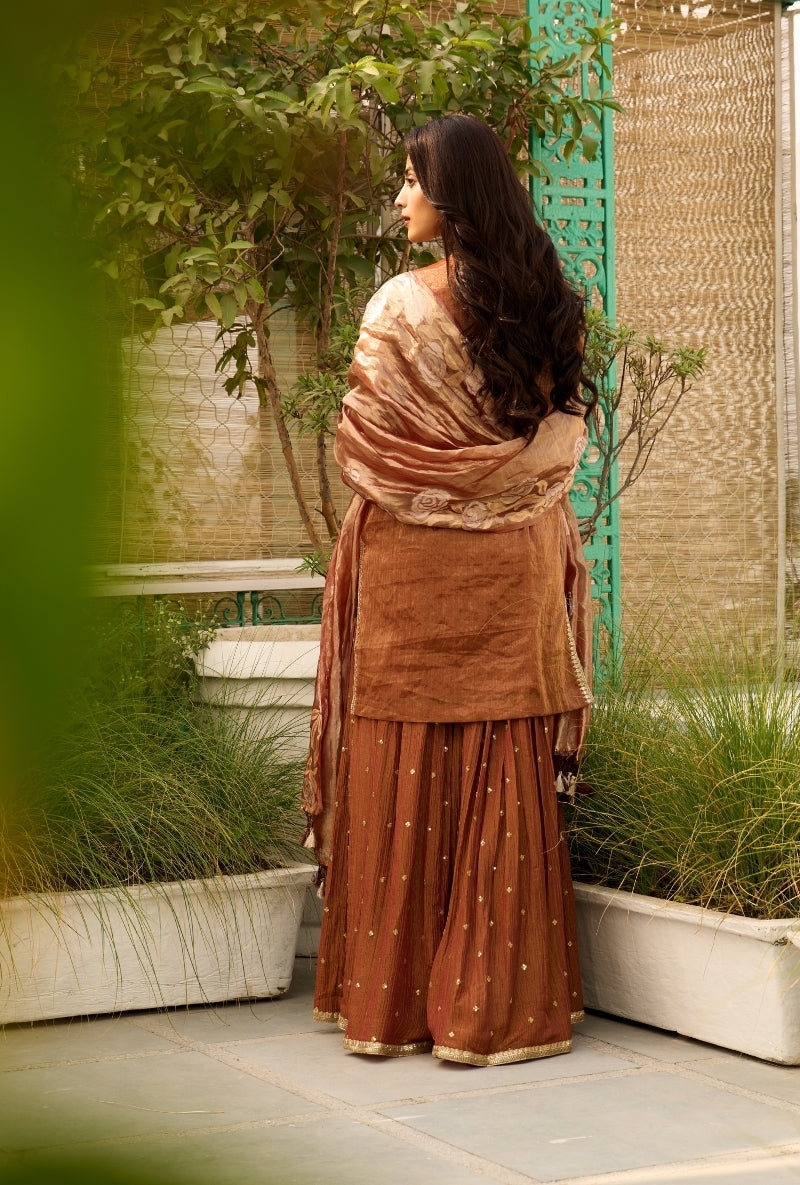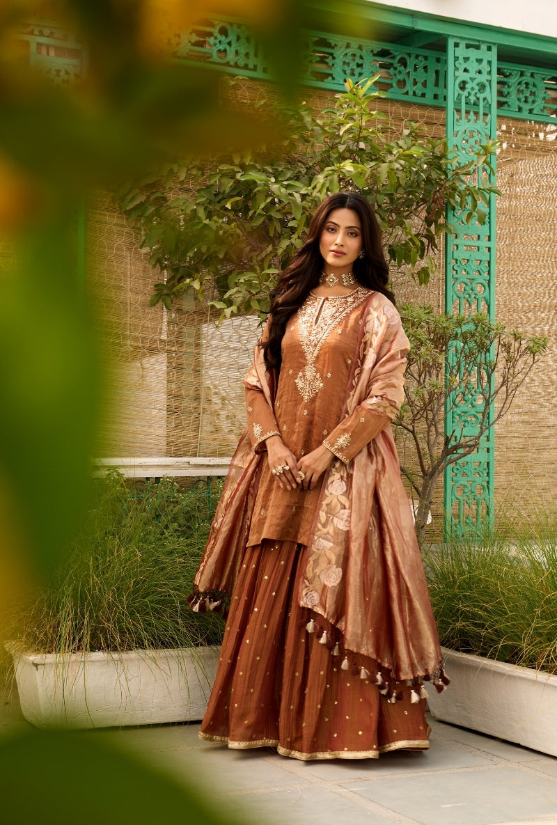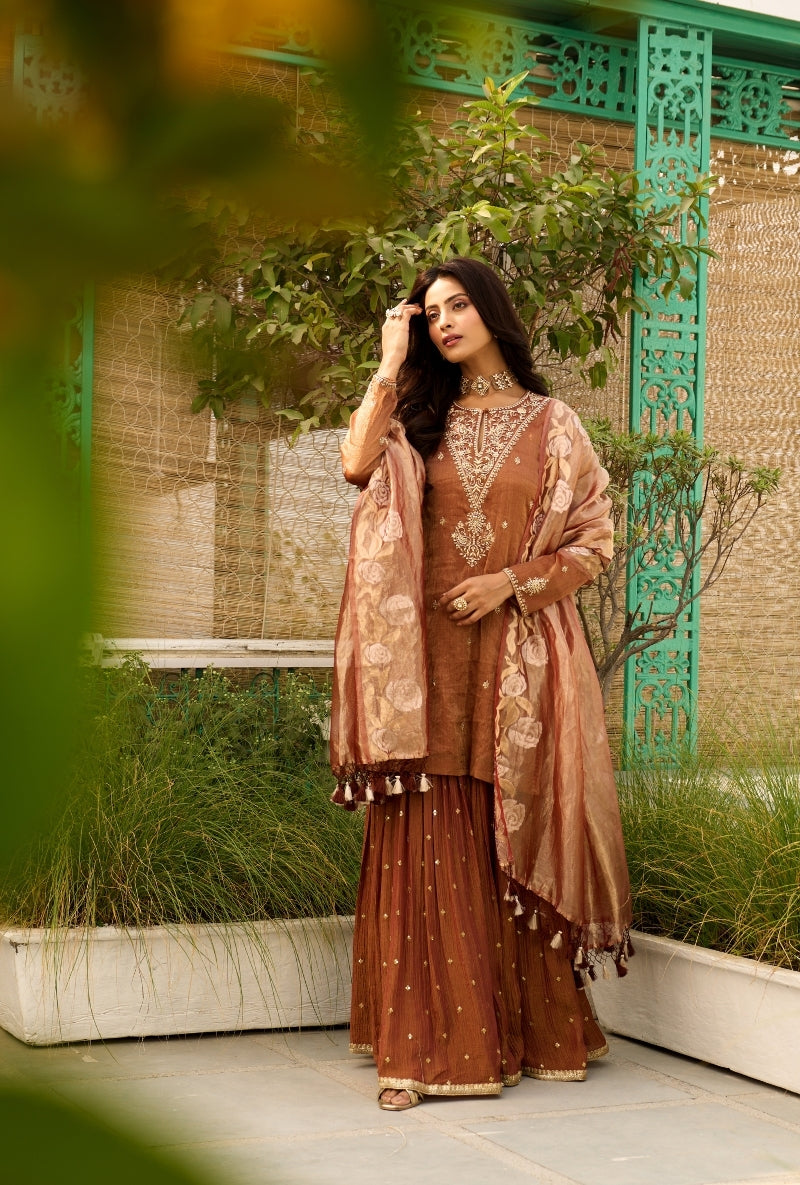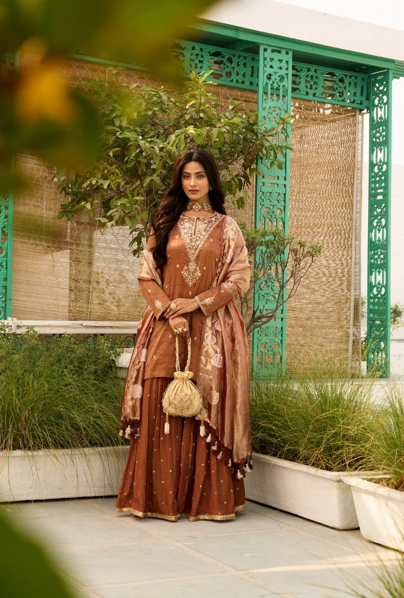 Brown Embroidered Yoke Tissue Sabah Sharara Set