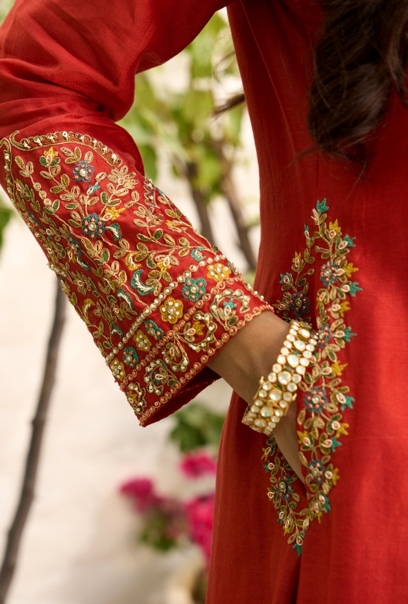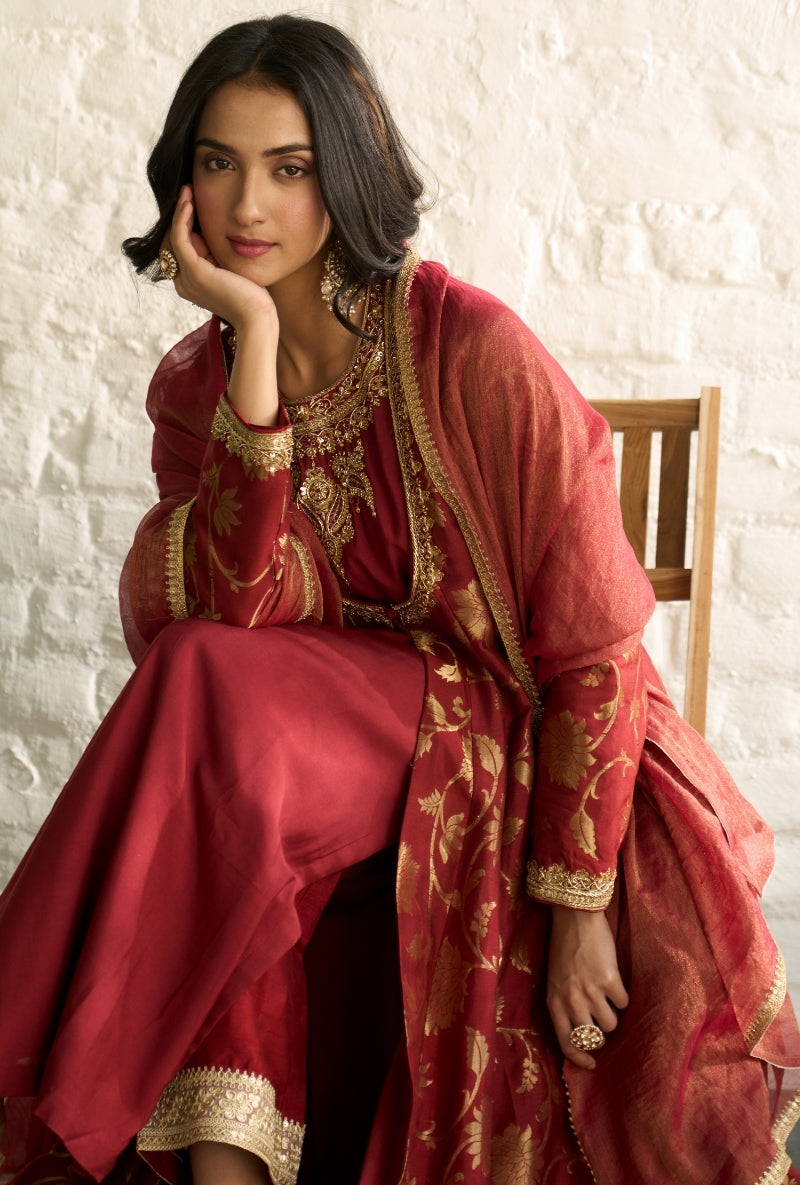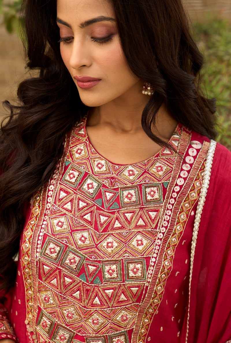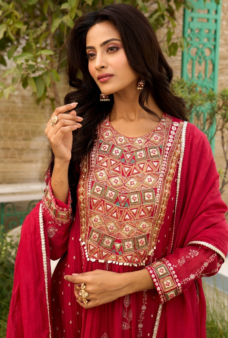Red Embroidered Yoke Jalsa Kurta Set