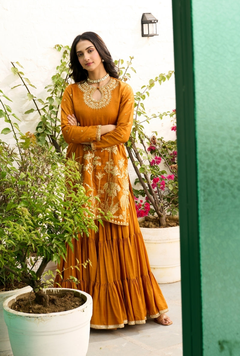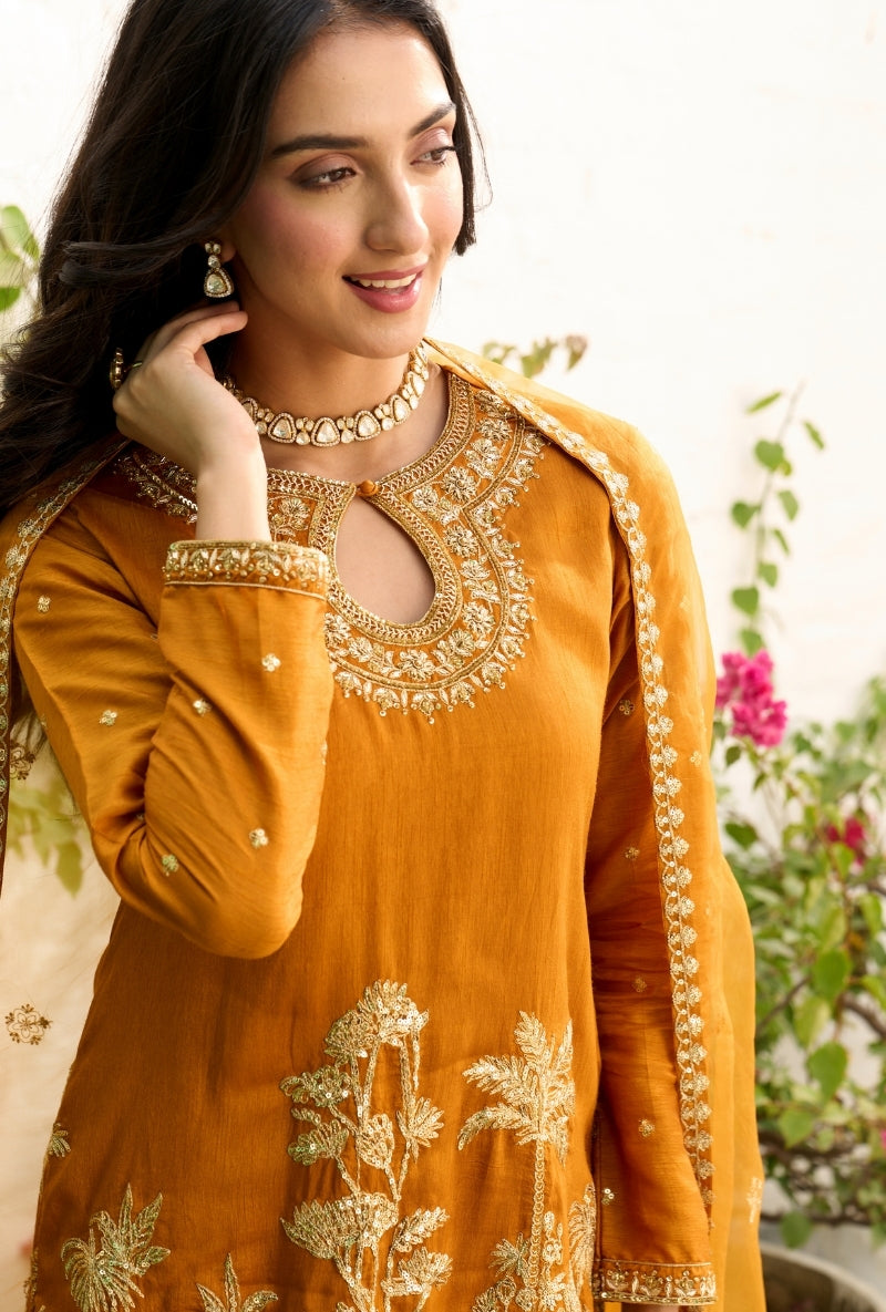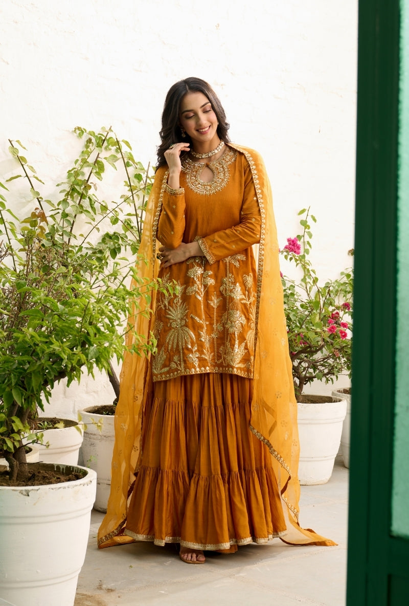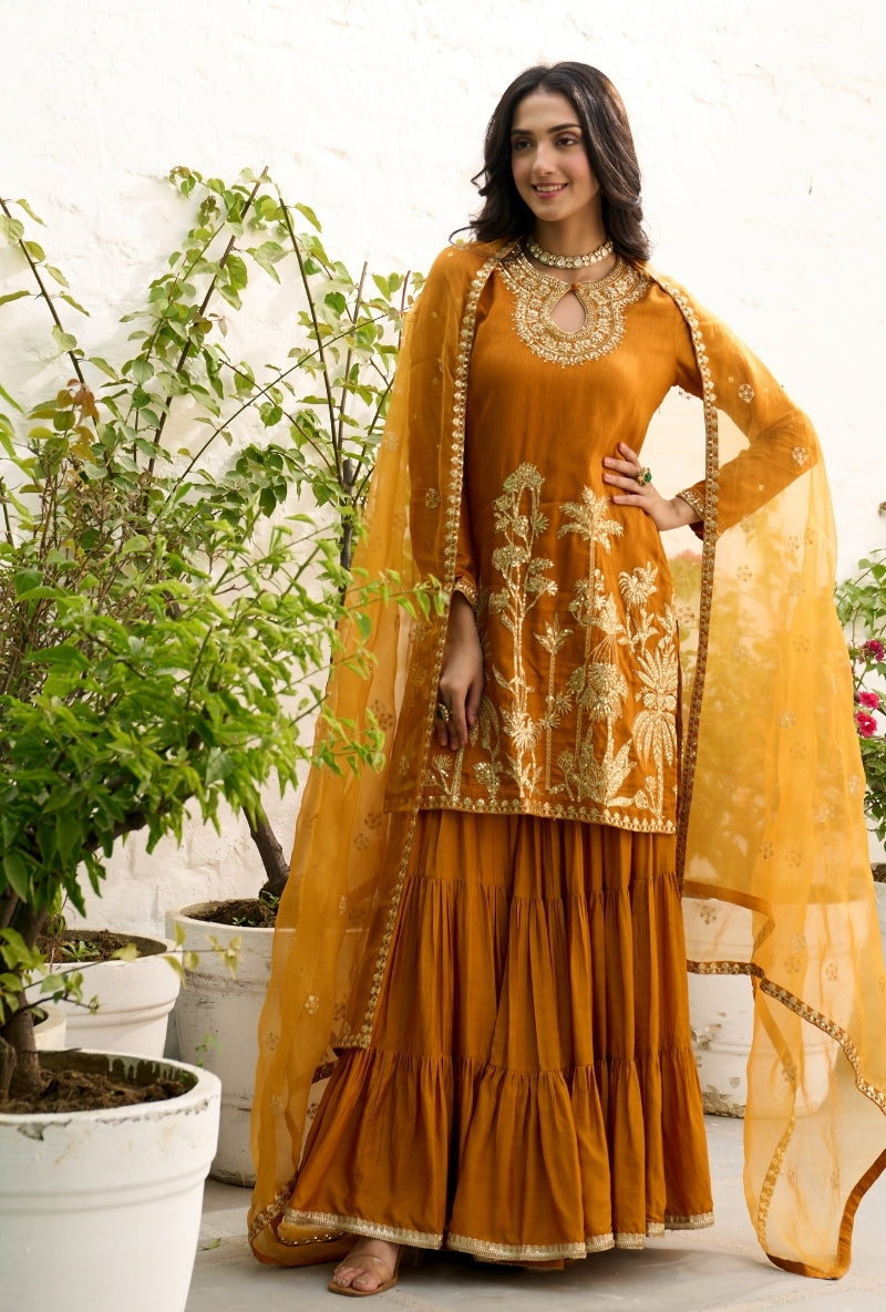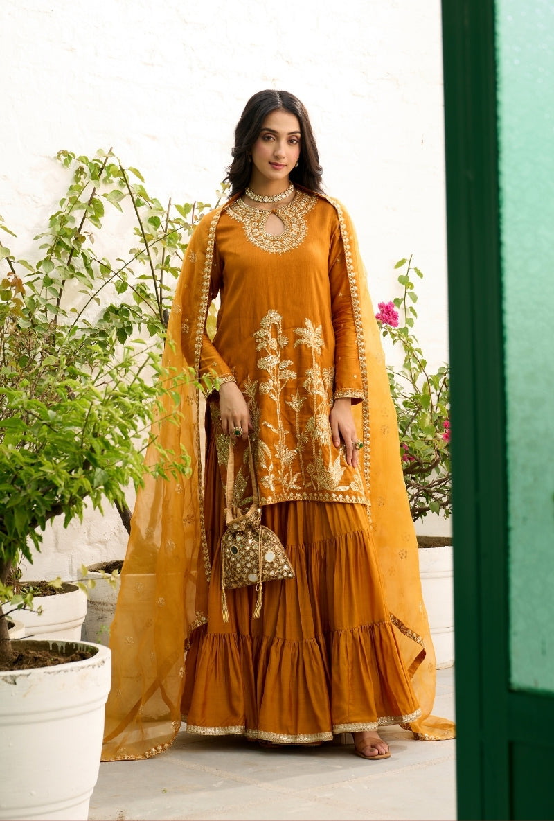 Mustard Palm Tree Zardosi Embroidered Sabah Sharara Set