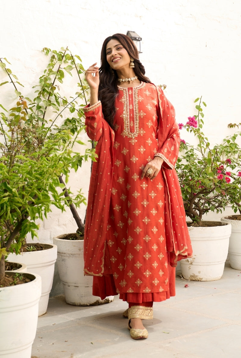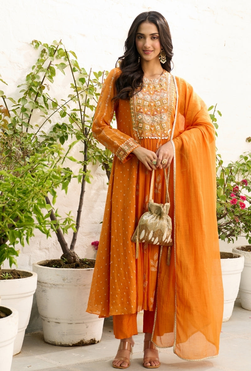 Orange Long Embroidered Sabah Kurta Set
