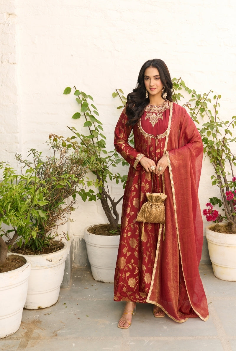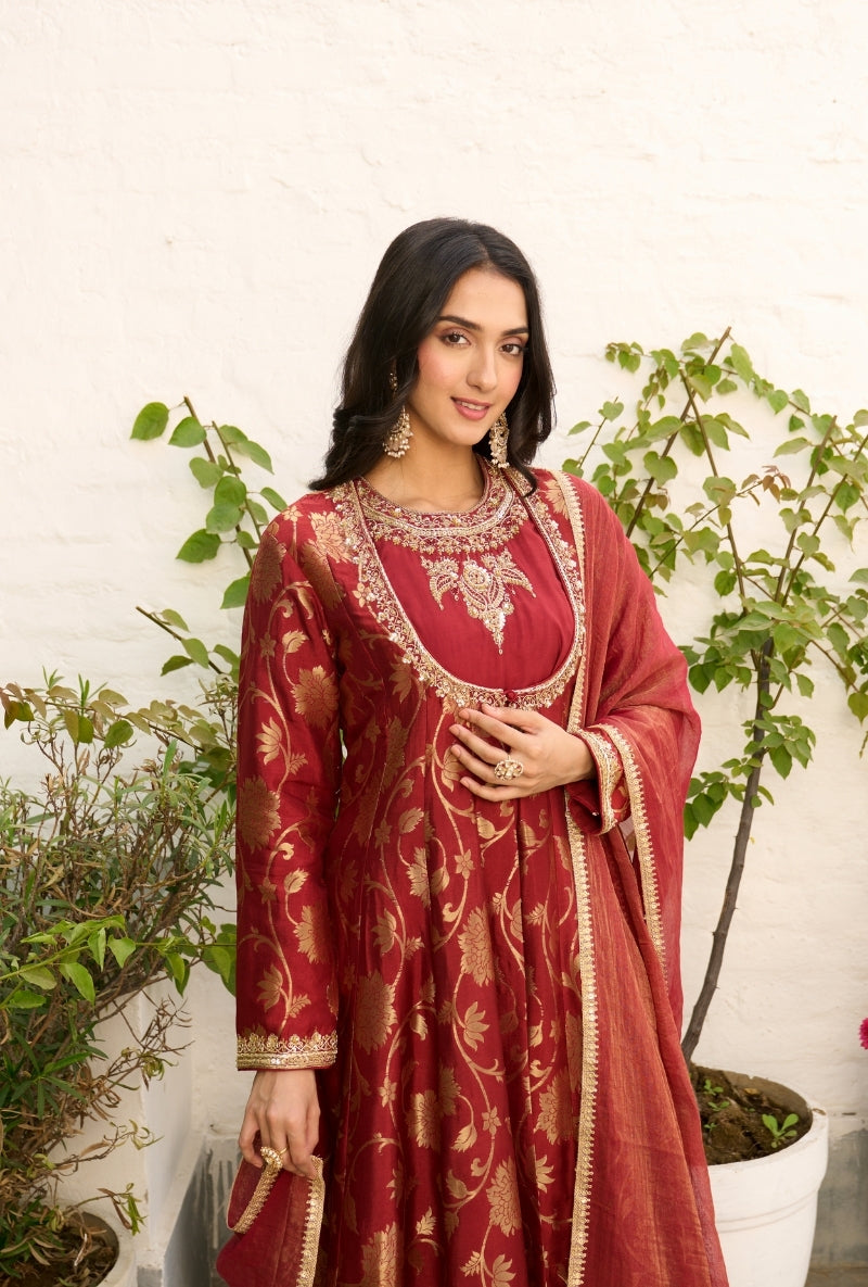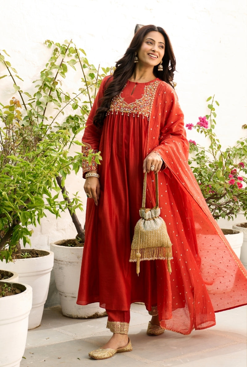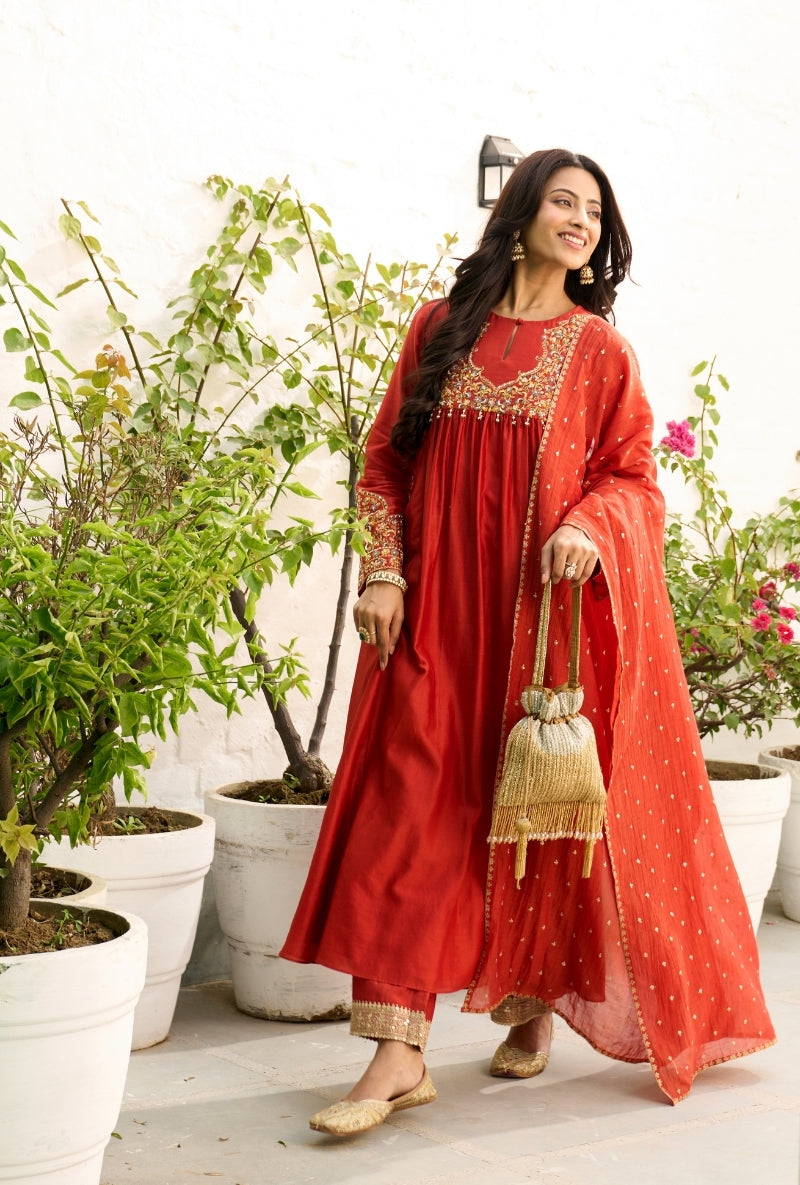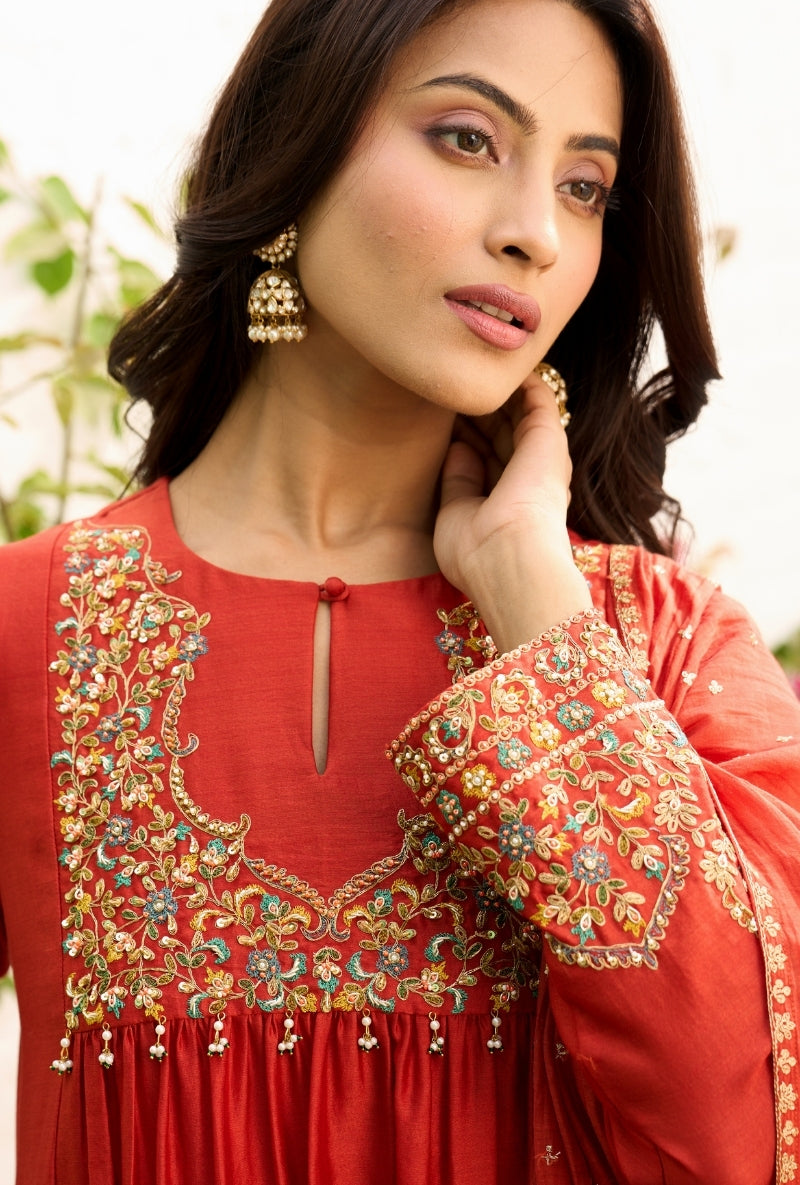 Meghna Nayyar In Red Embroidered Yoke Sabah Anarkali Set