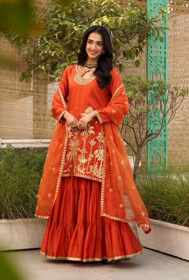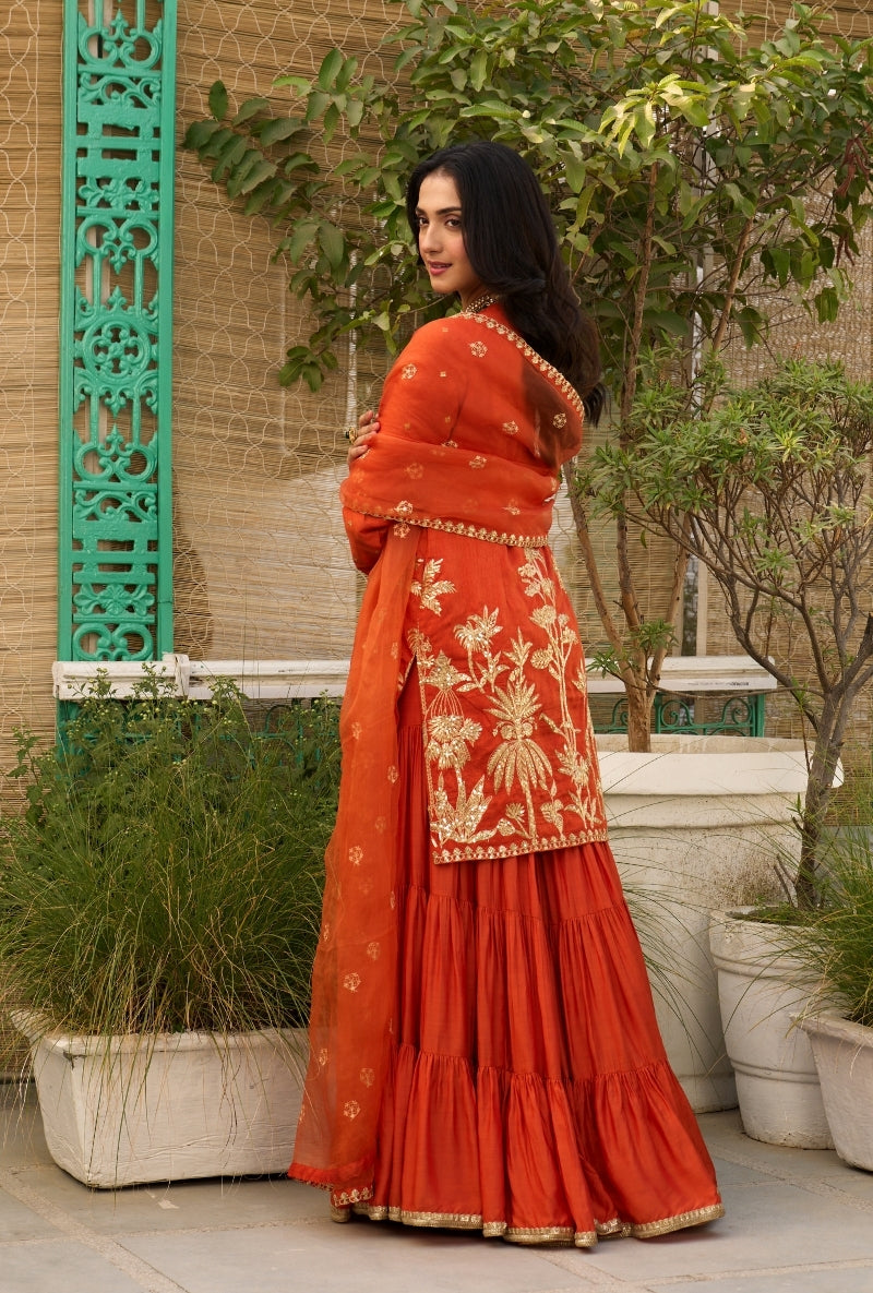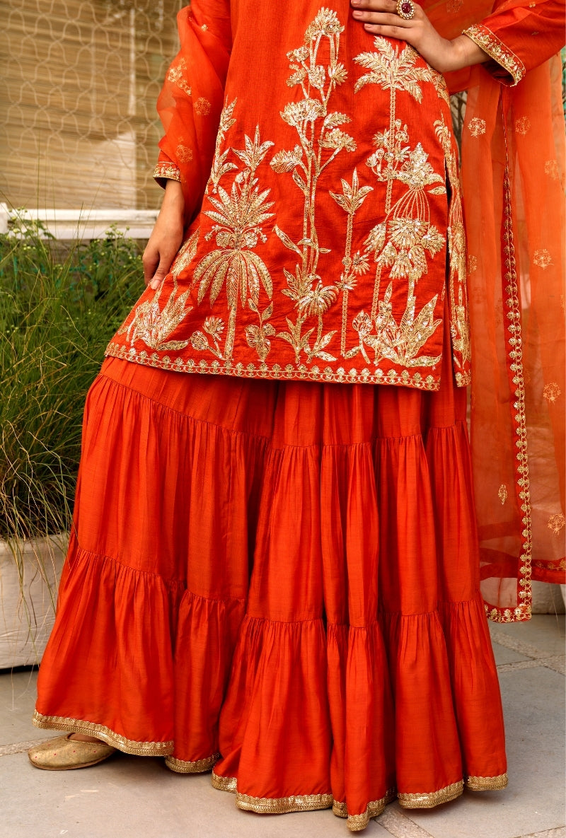 Orange Palm Tree Zardosi Embroidered Sabah Sharara Set
