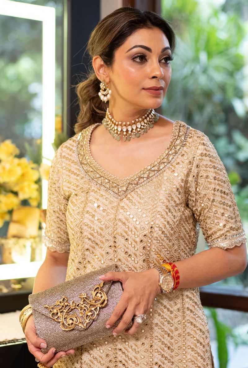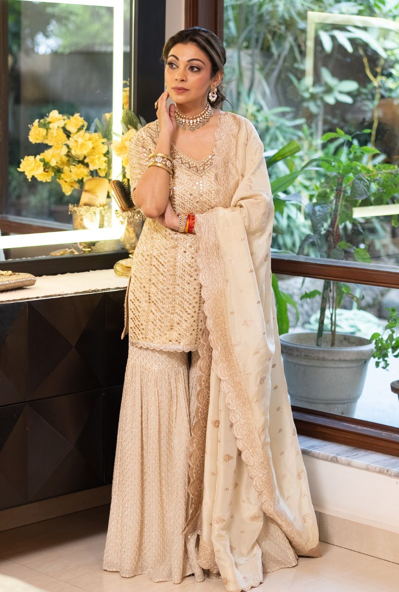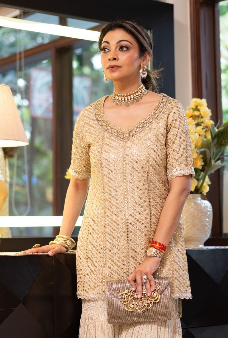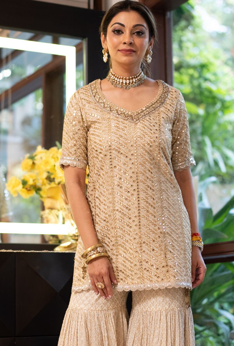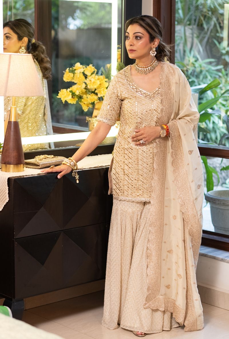 Meghna Nayyar in Beige Diagonal Mirror Hoor 3.0 Gharara Set