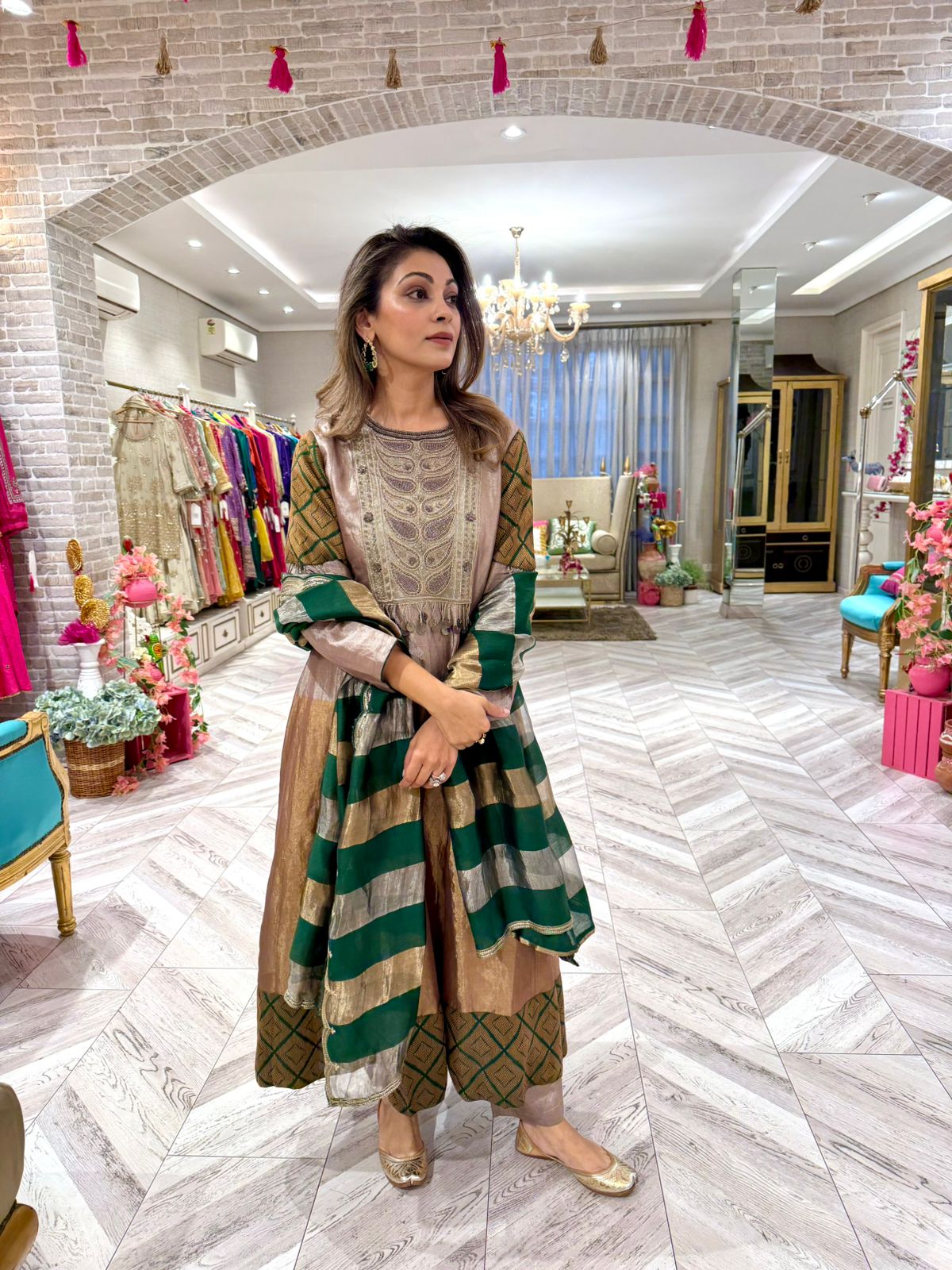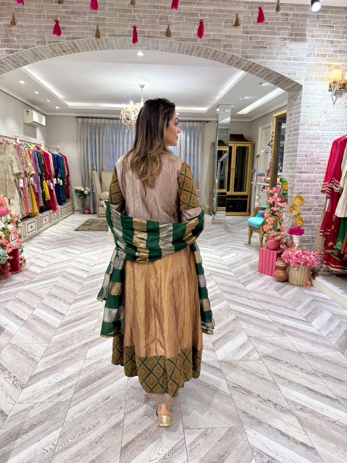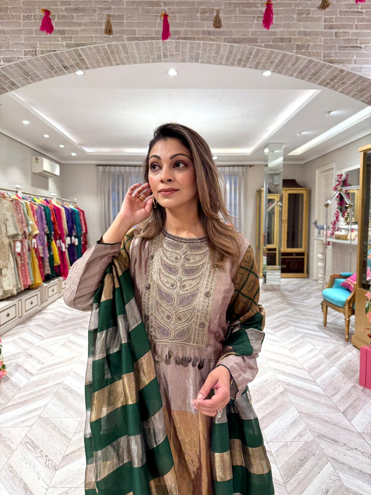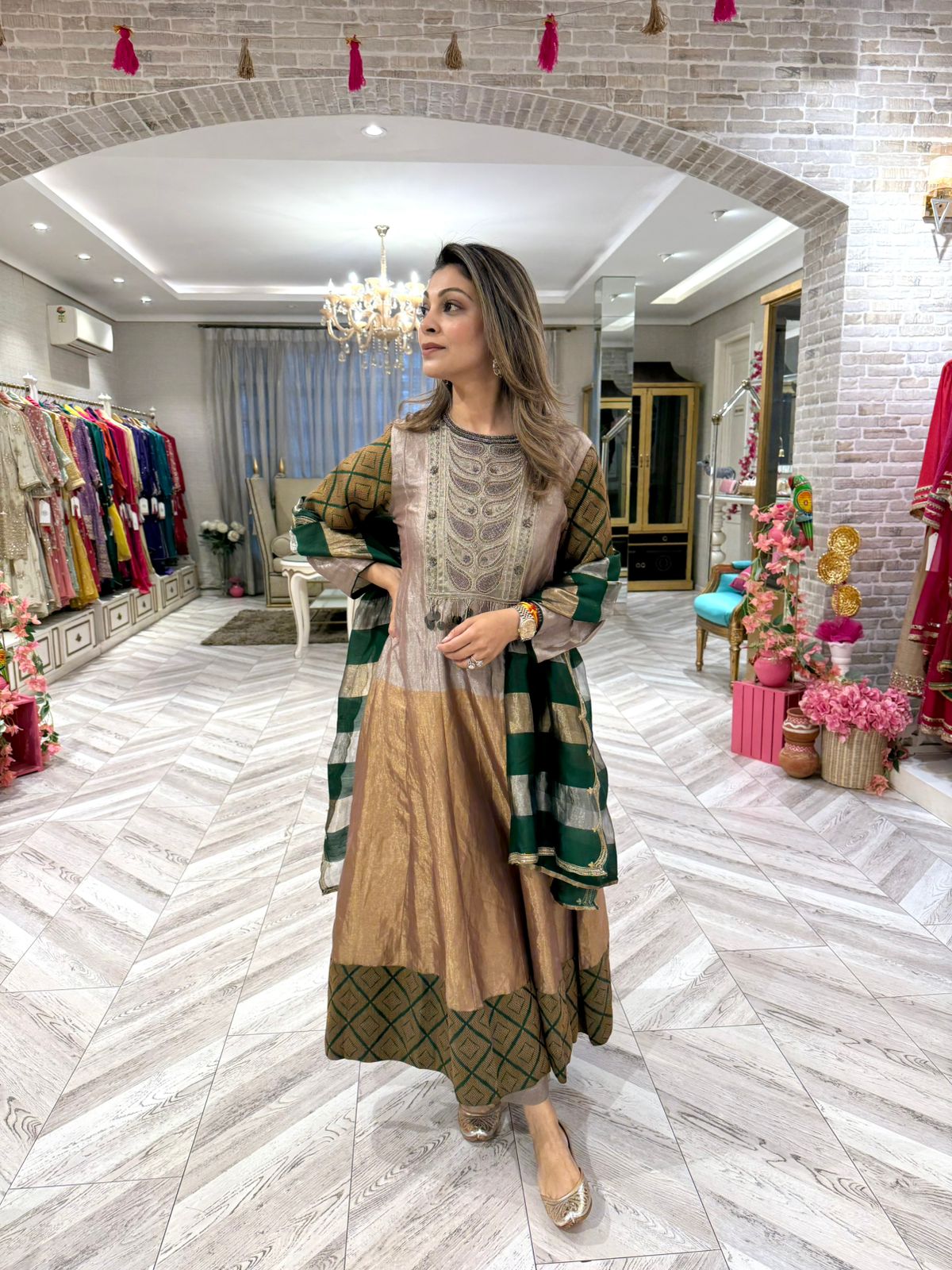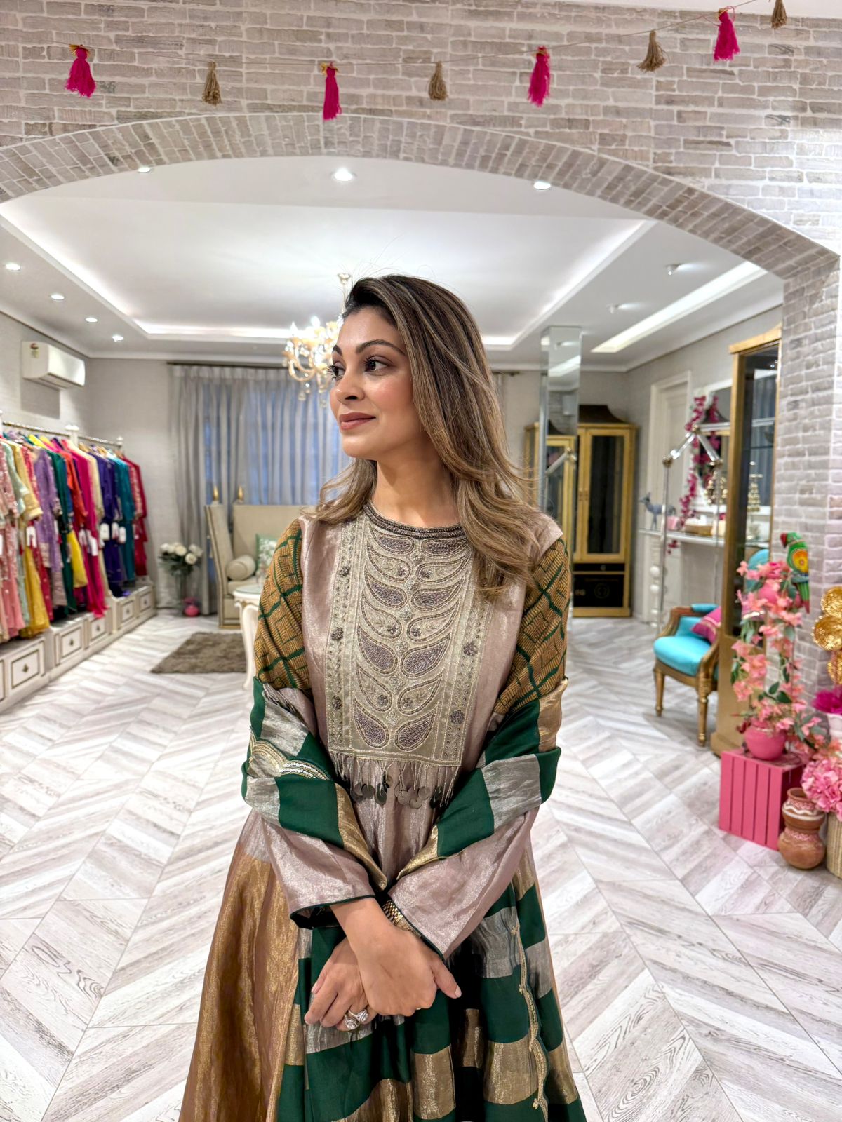 Meghna Nayyar in Brown Tissue Yoke High Low Long Kurta Set
