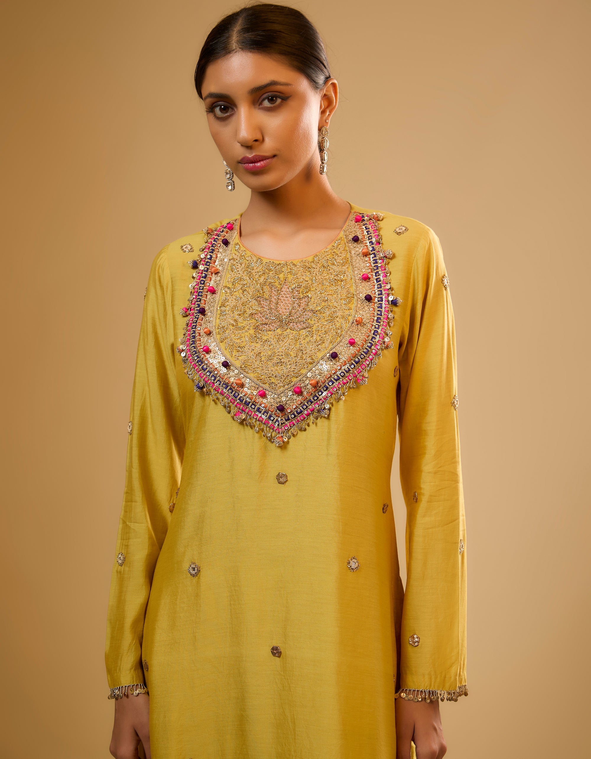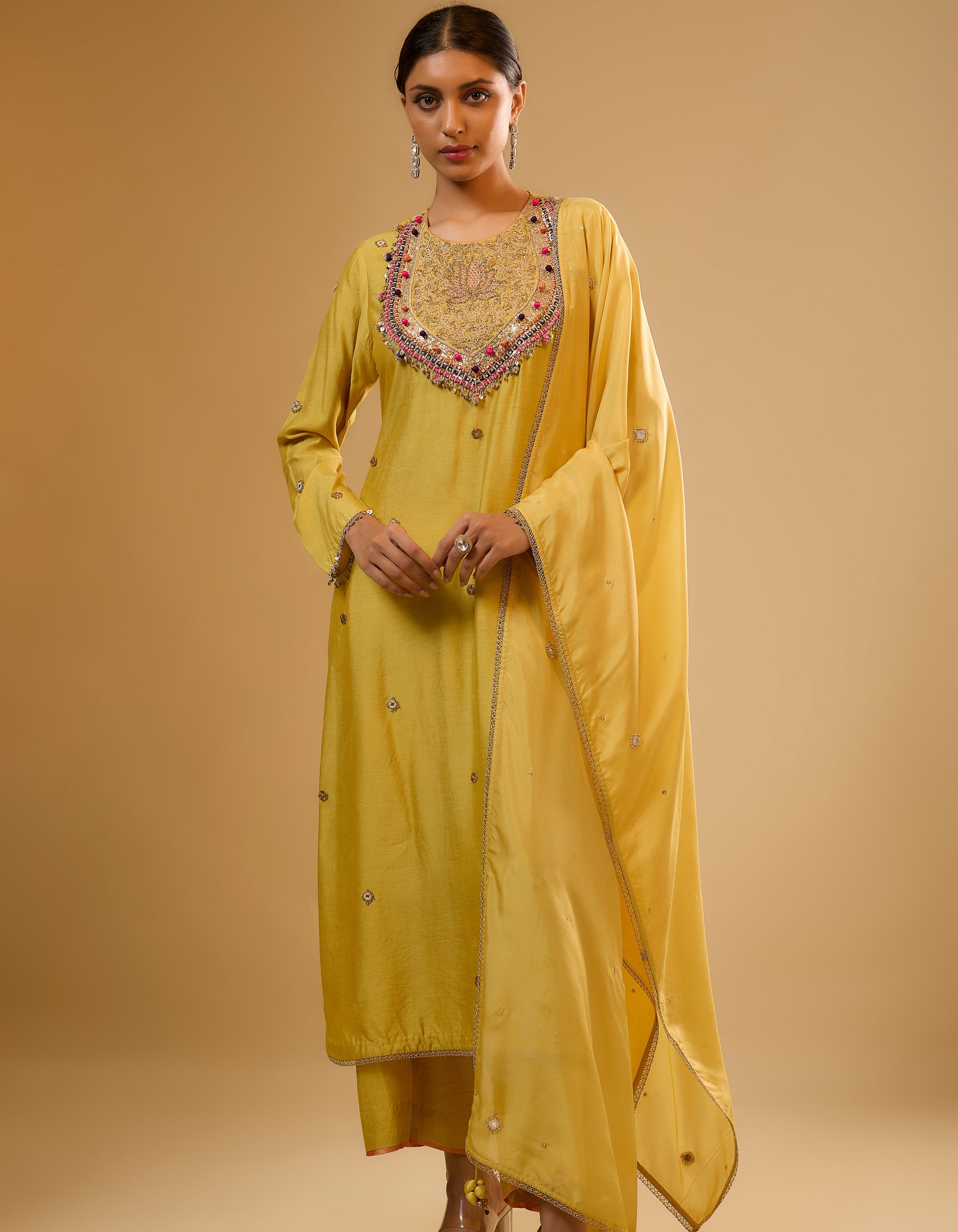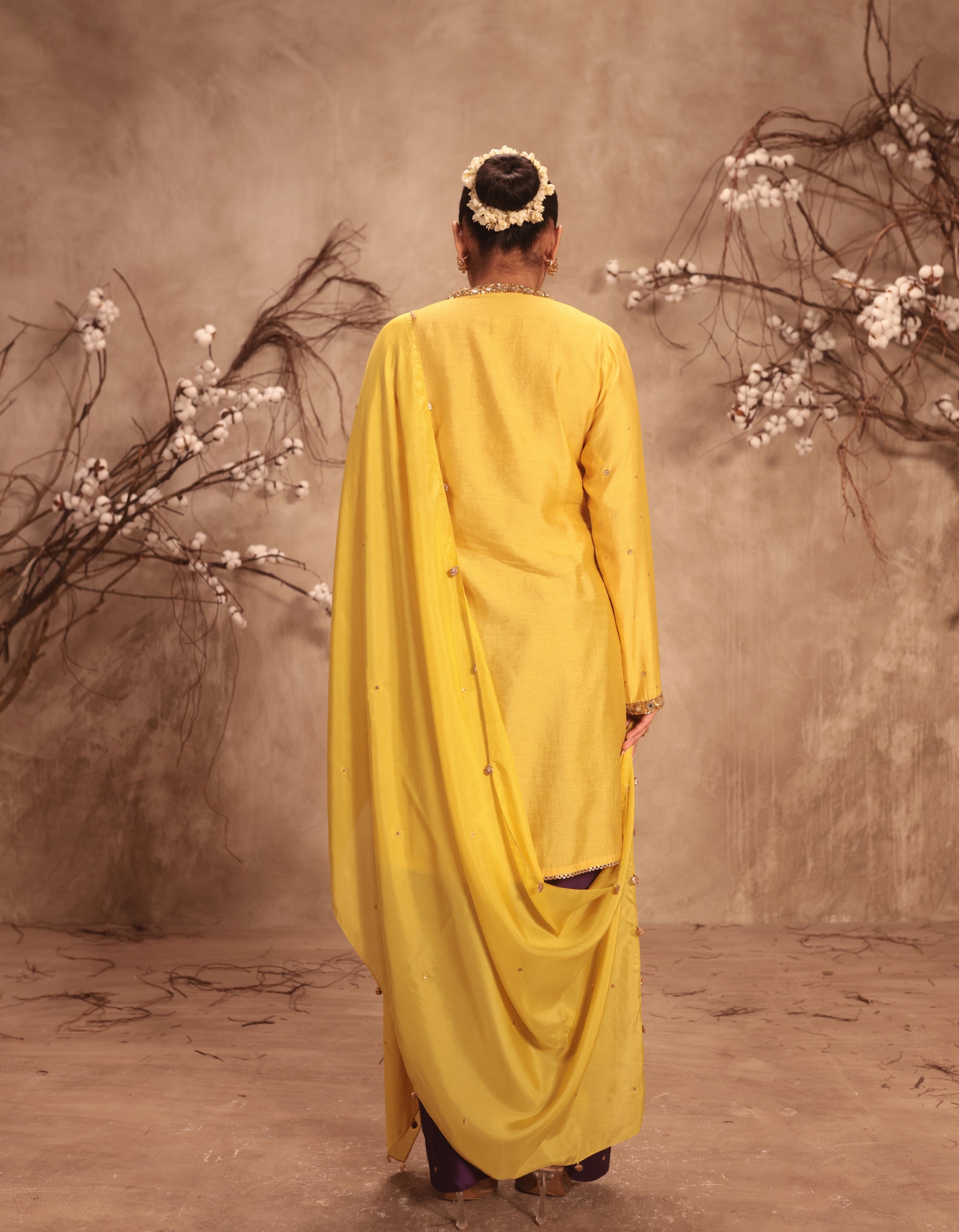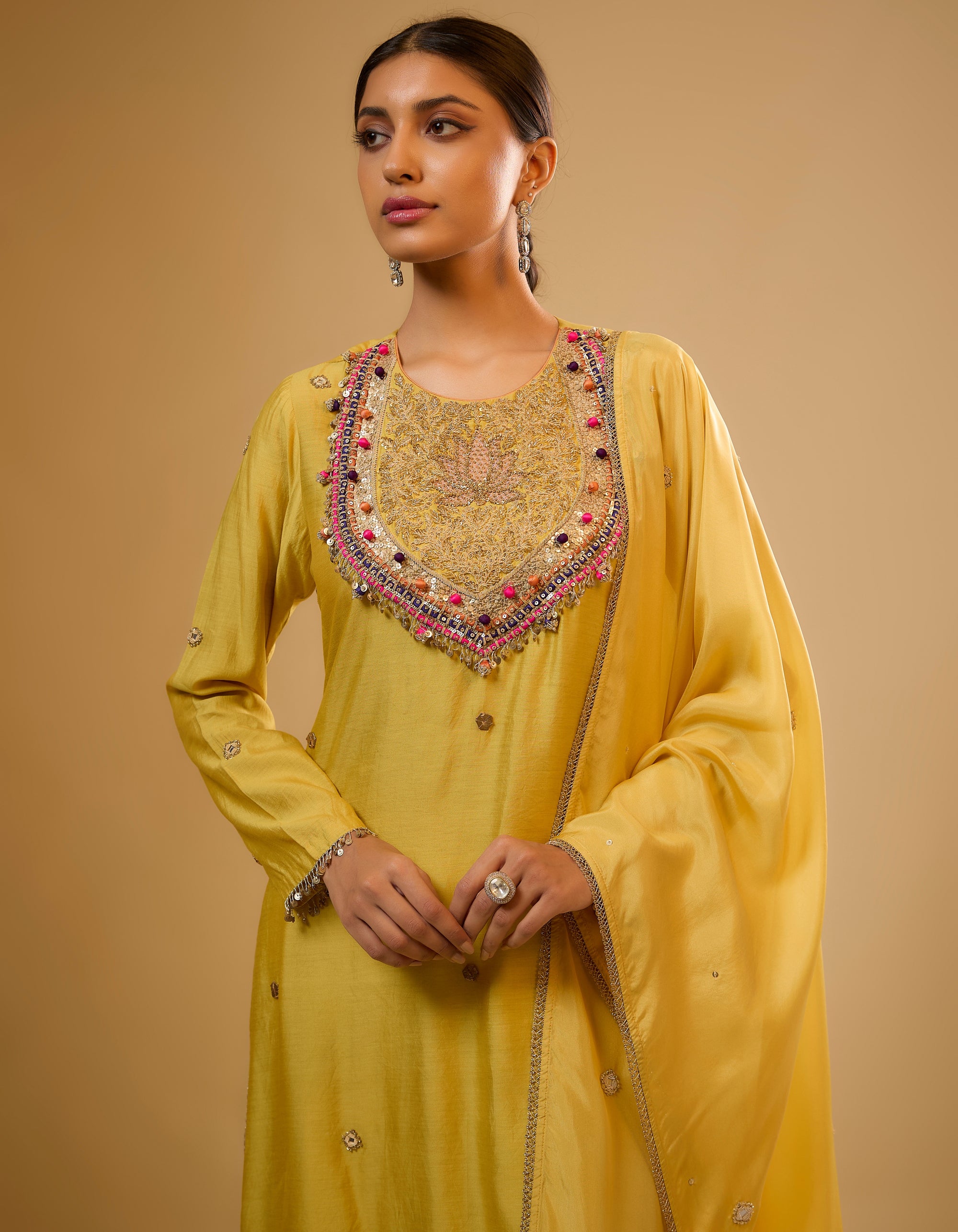 Mustard Embroidered V Neck Bageecha Kurta Set