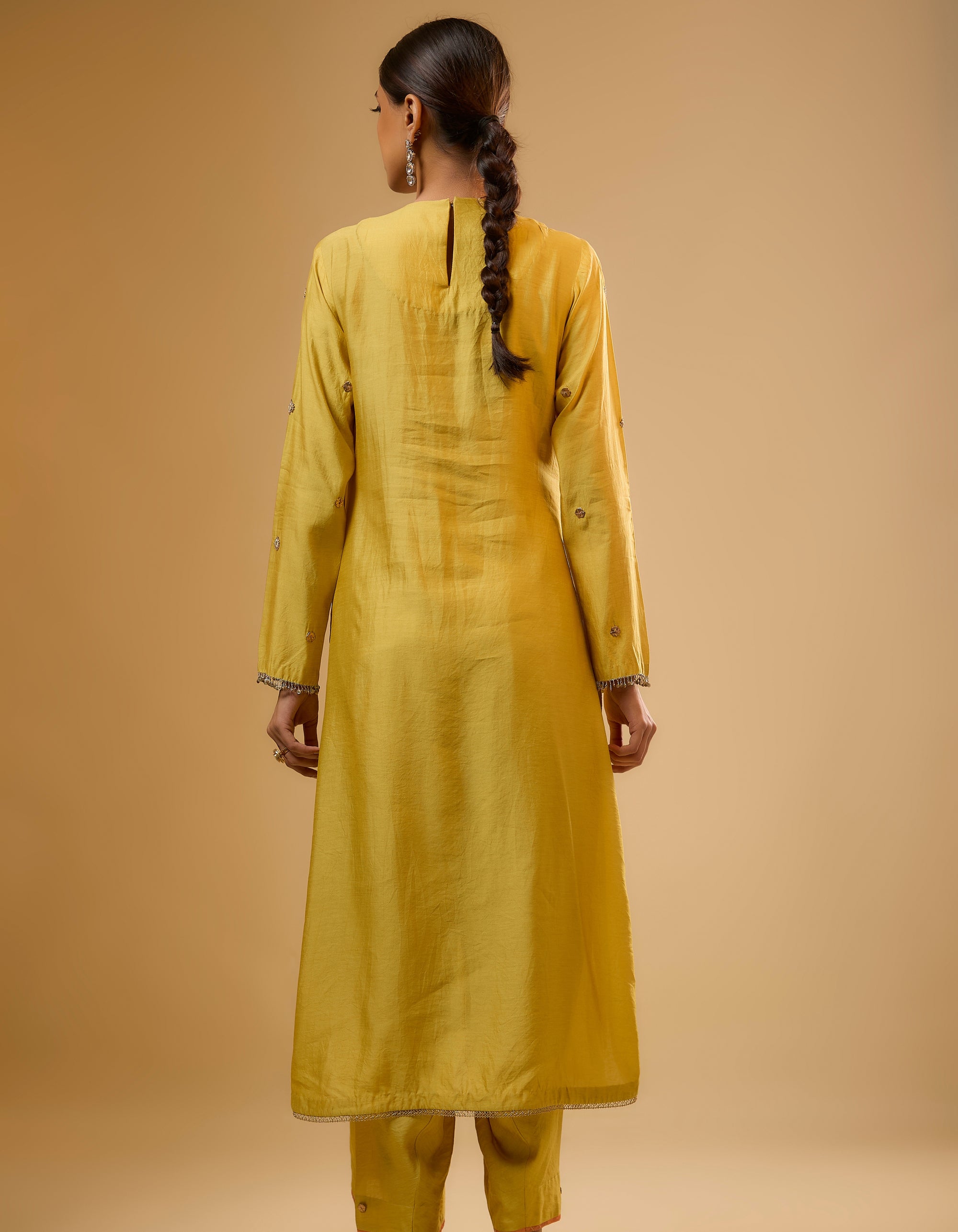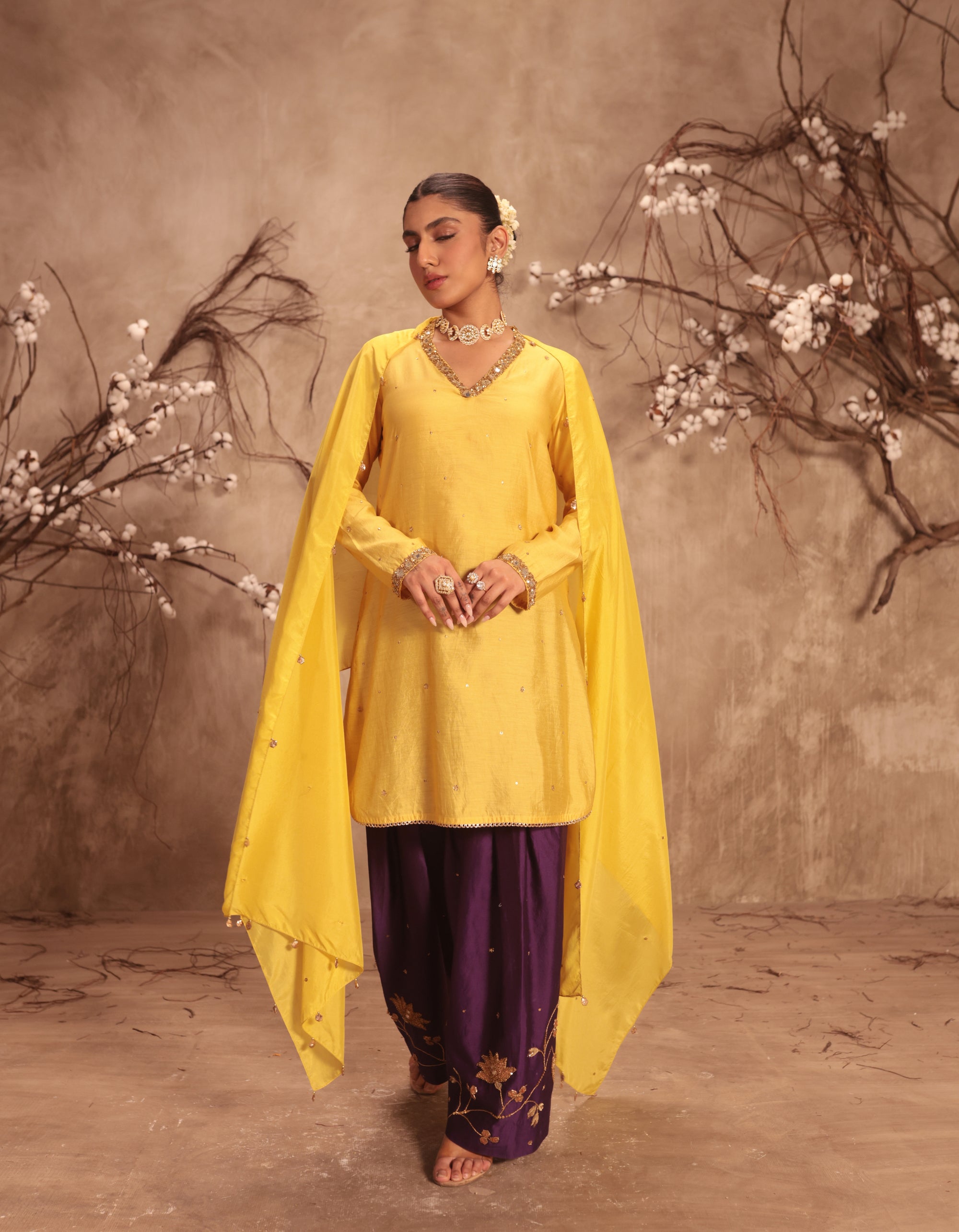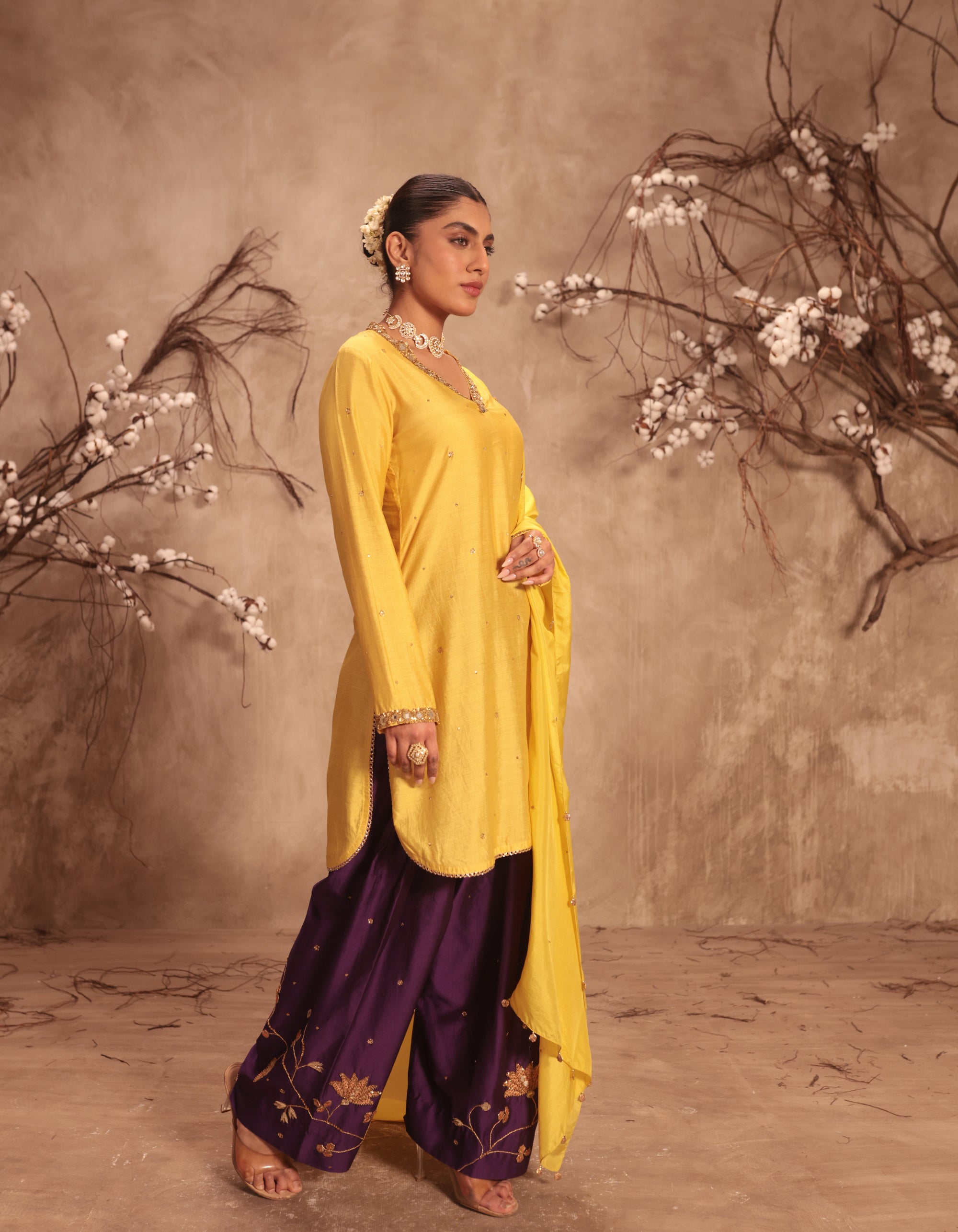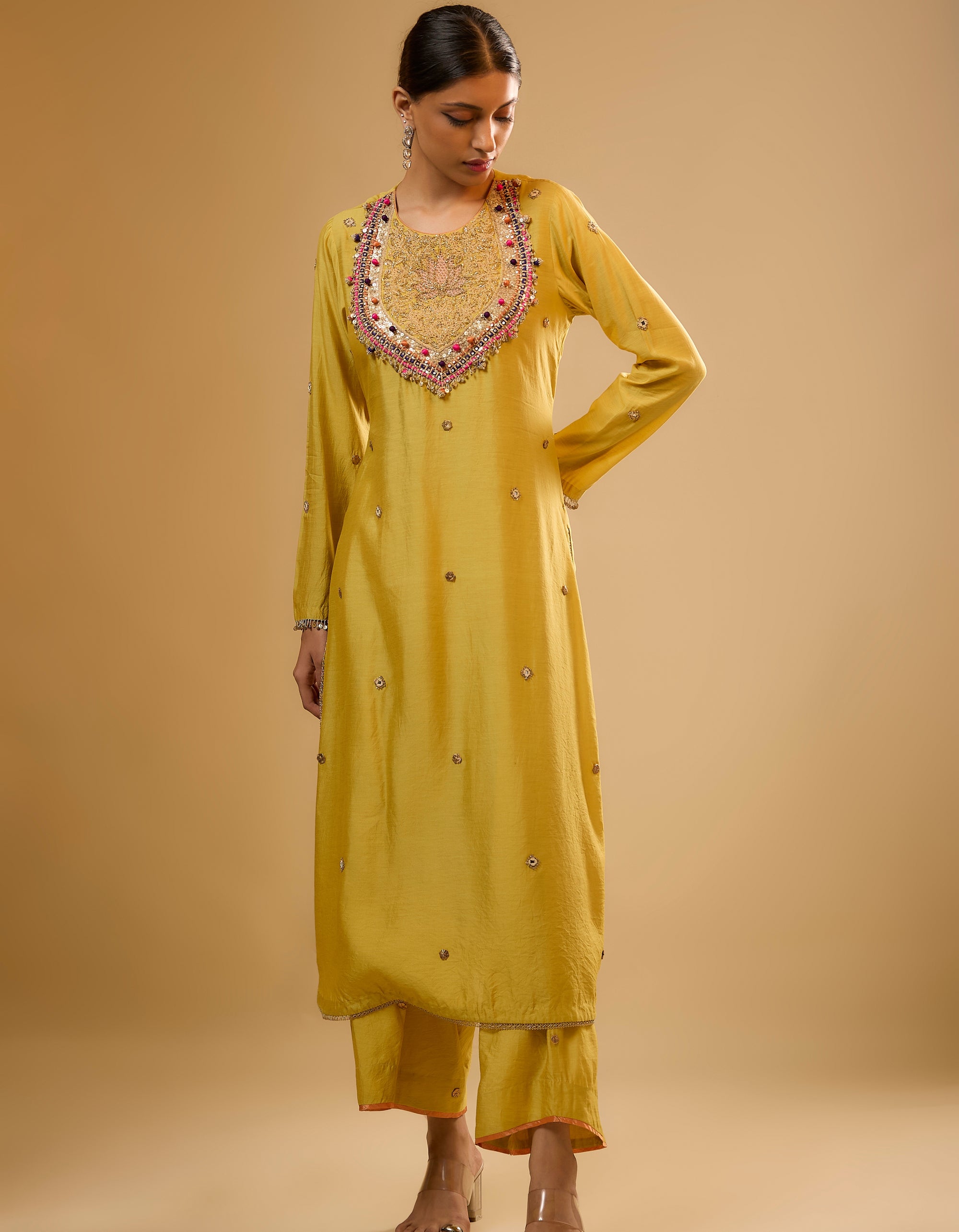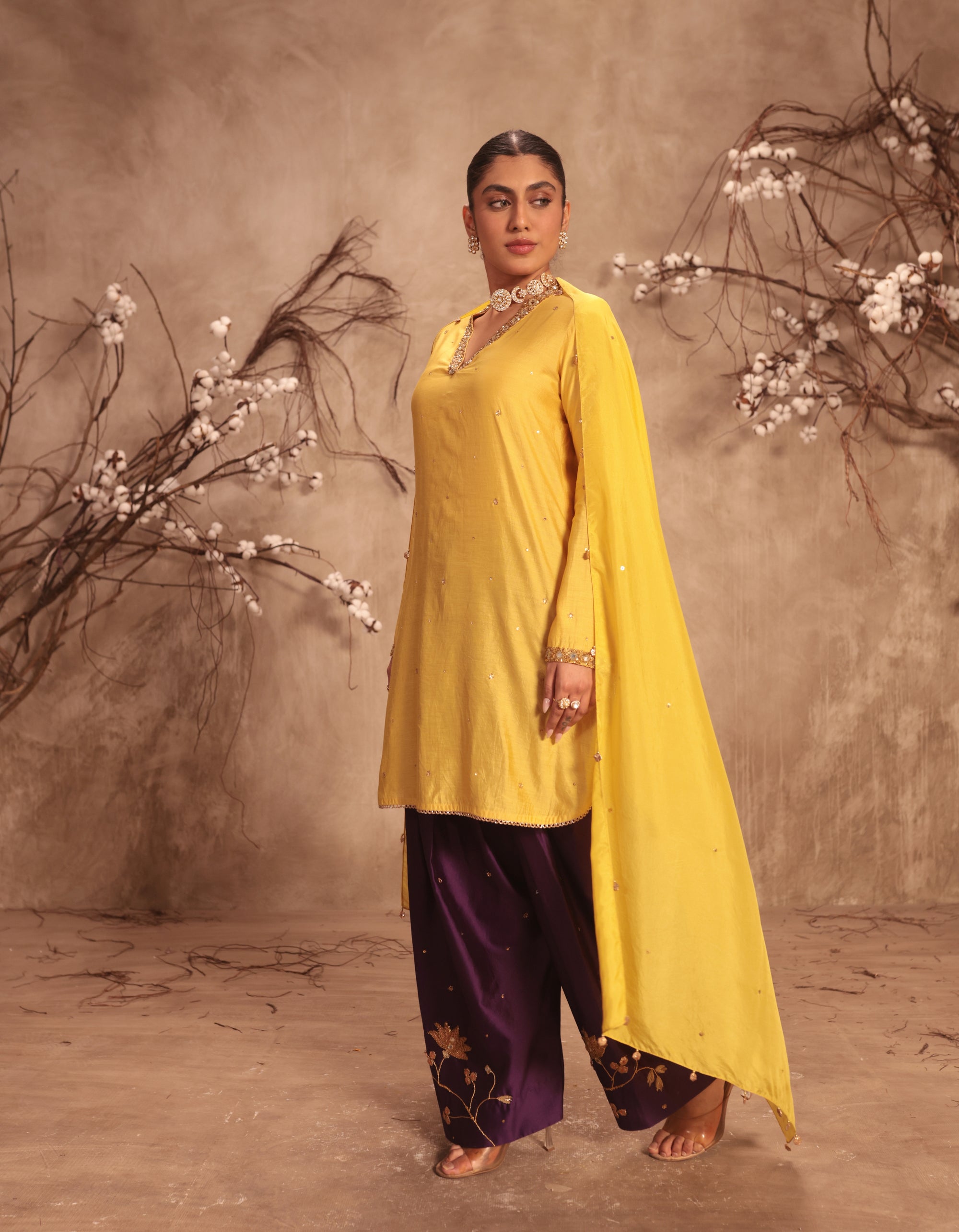 Mustard Embroidered V Neck Bageecha Kurta Set