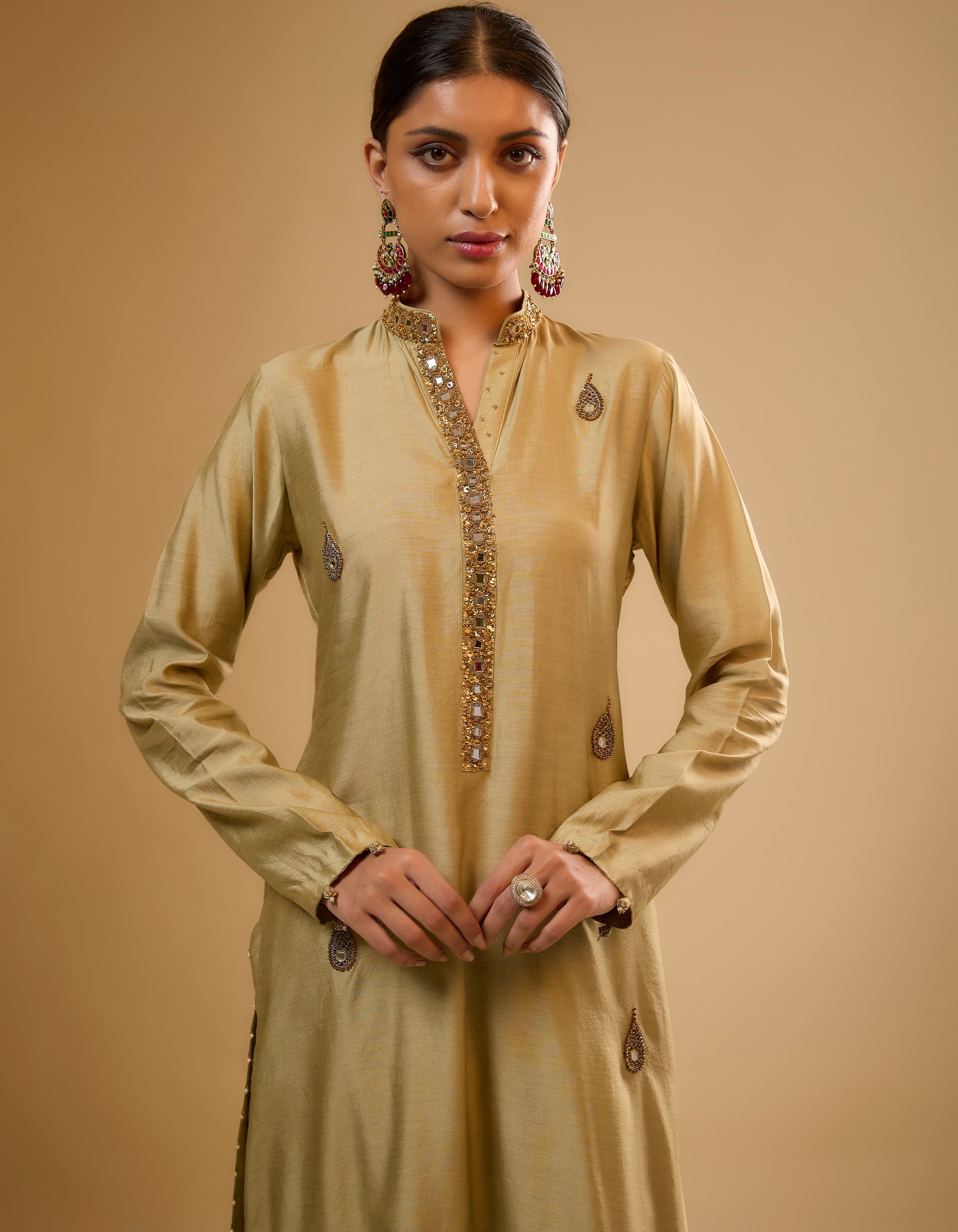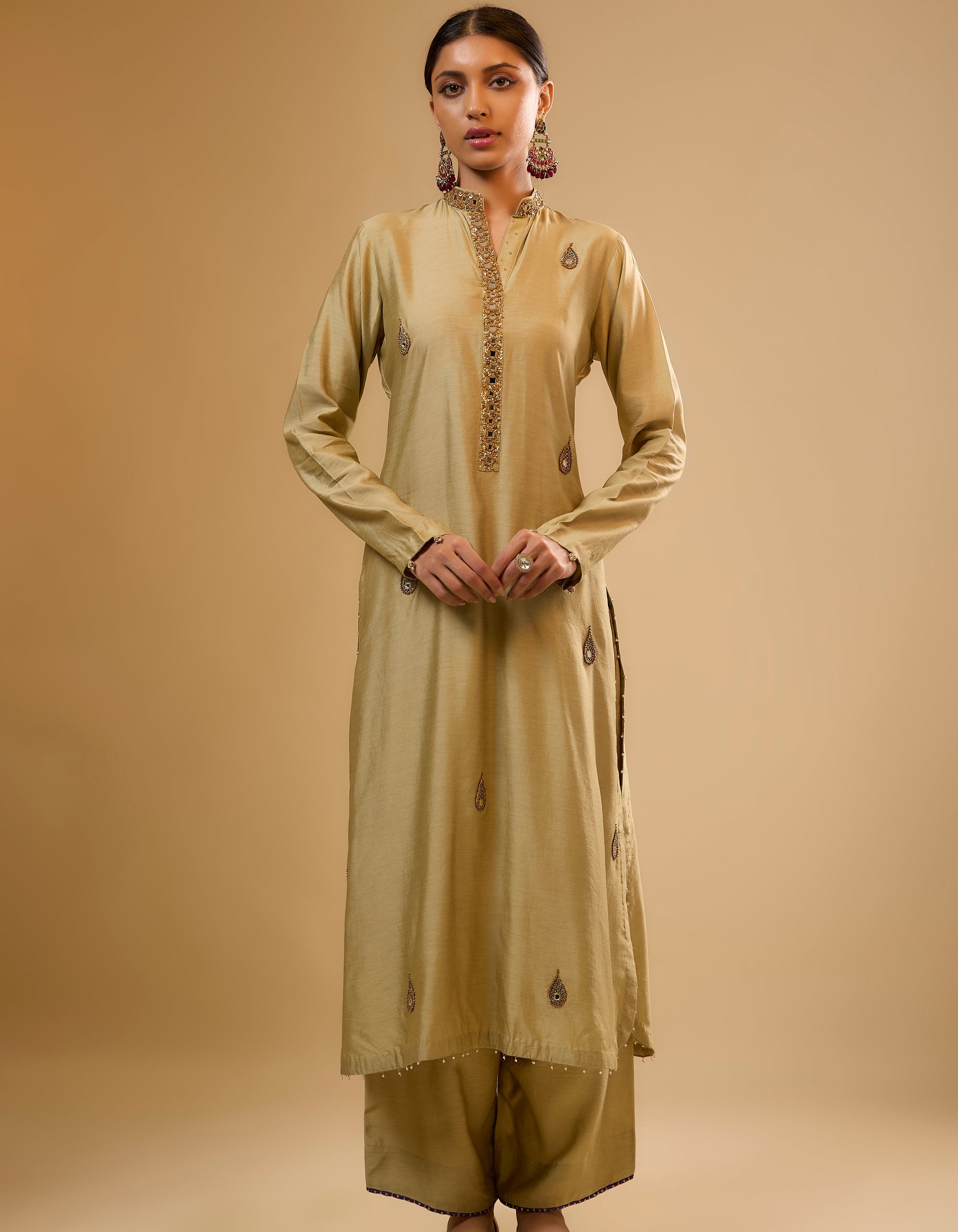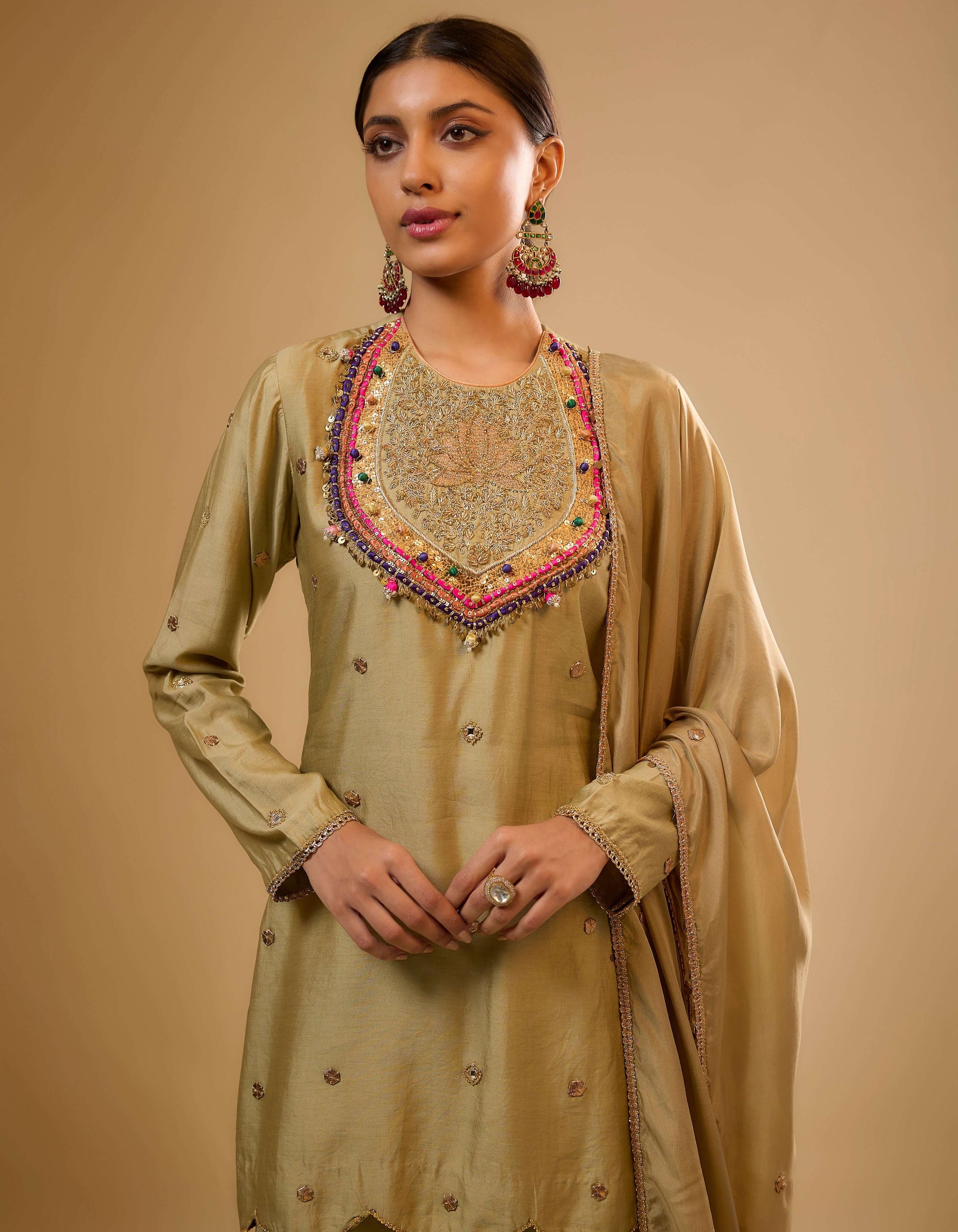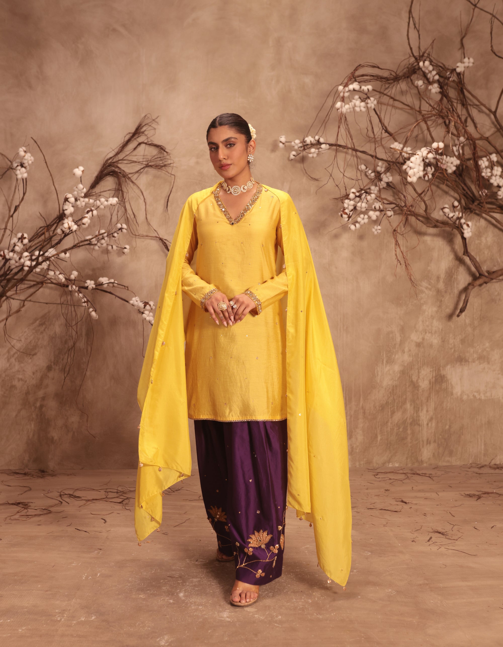 Mustard Embroidered V Neck Bageecha Kurta Set