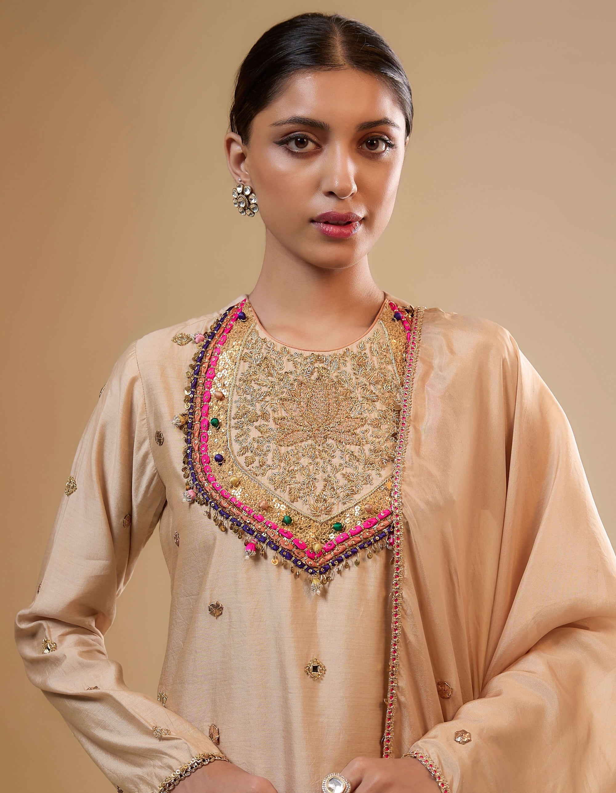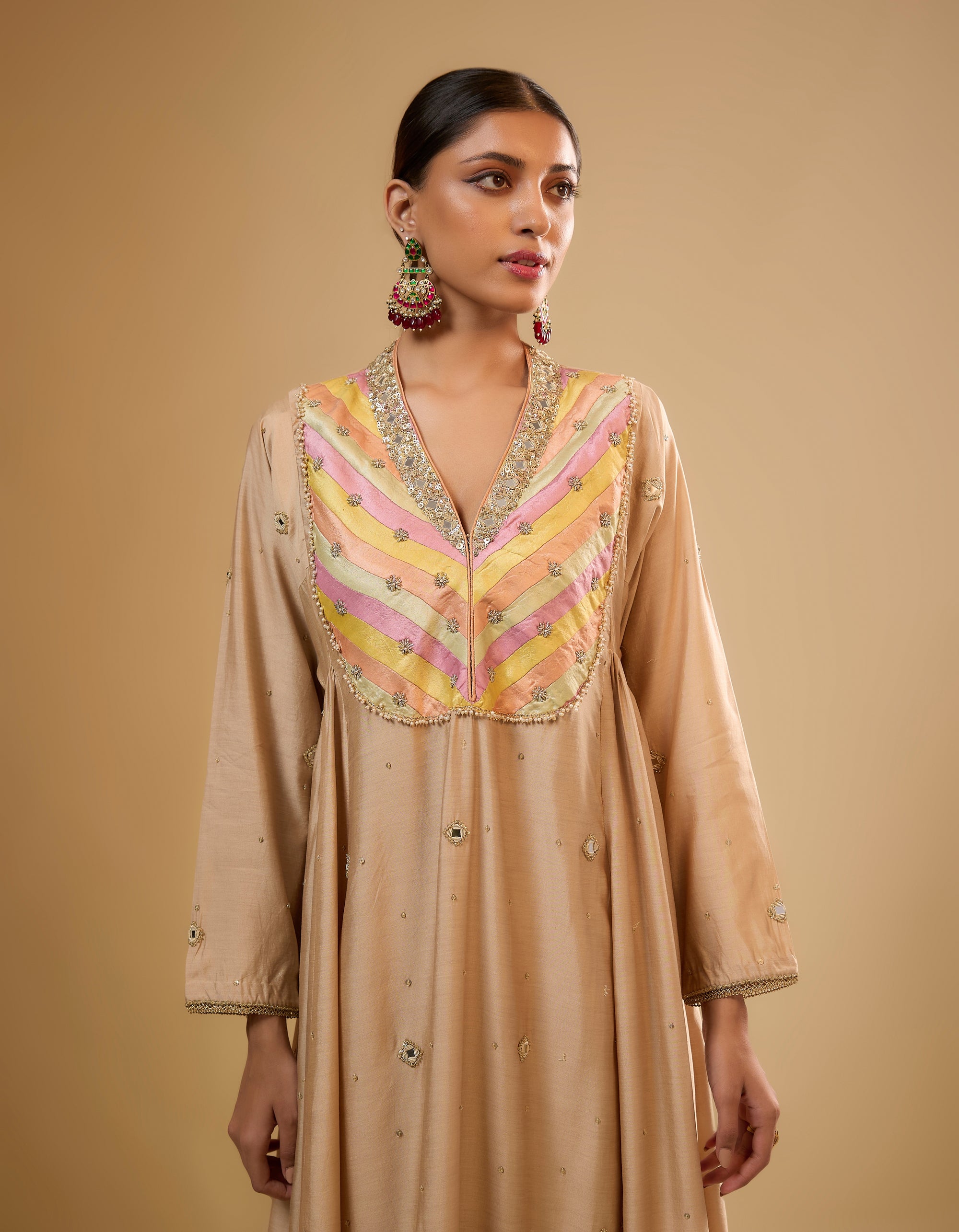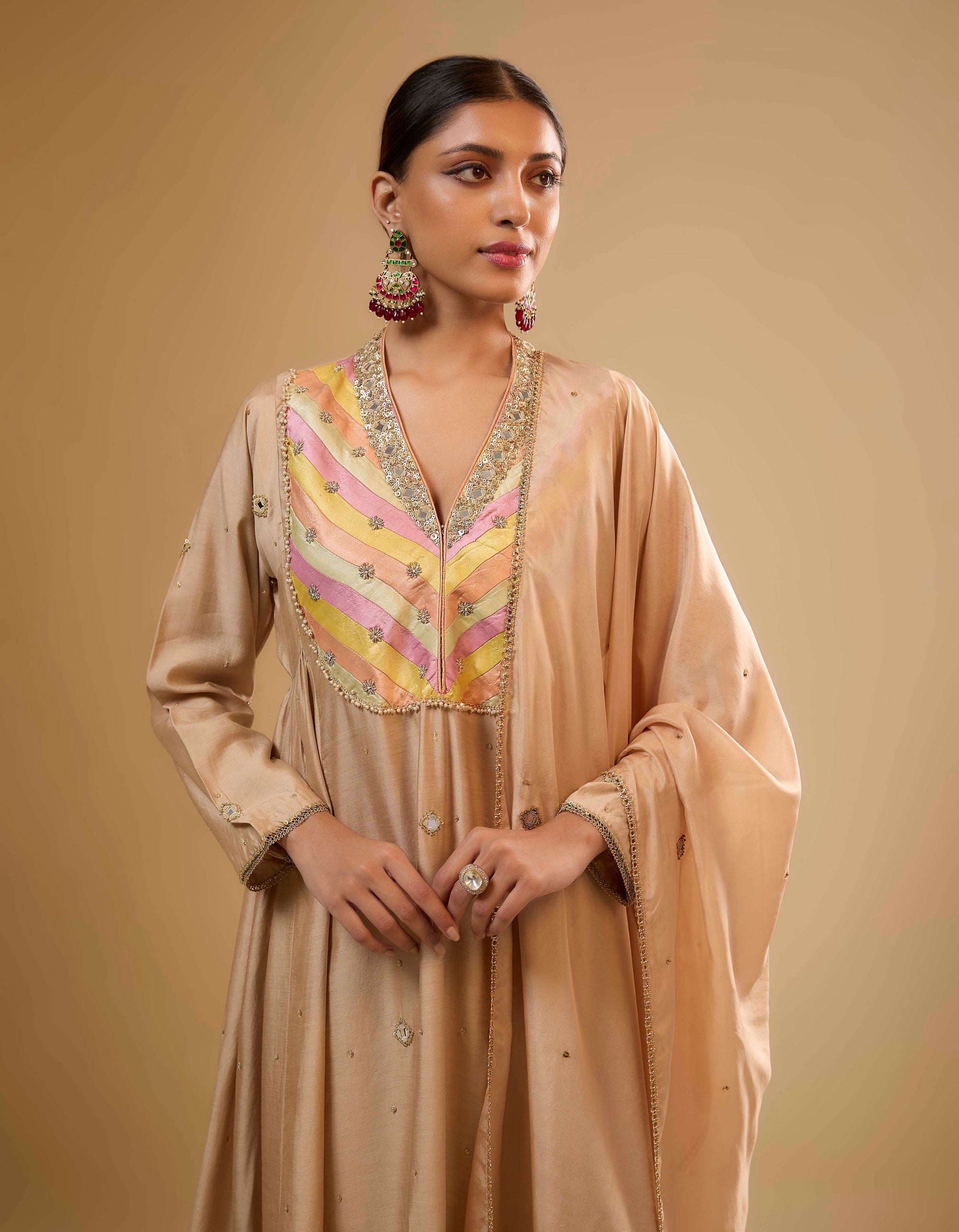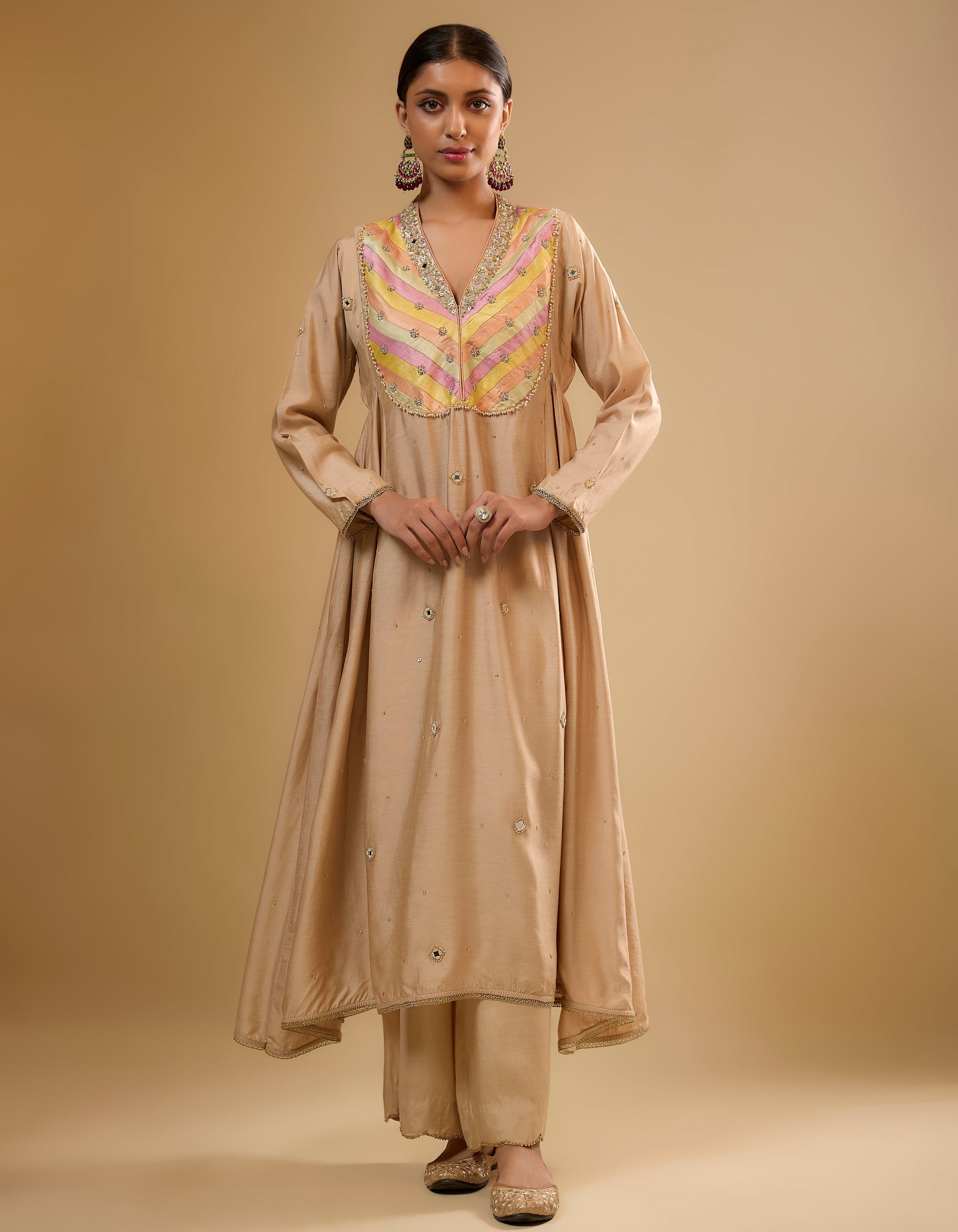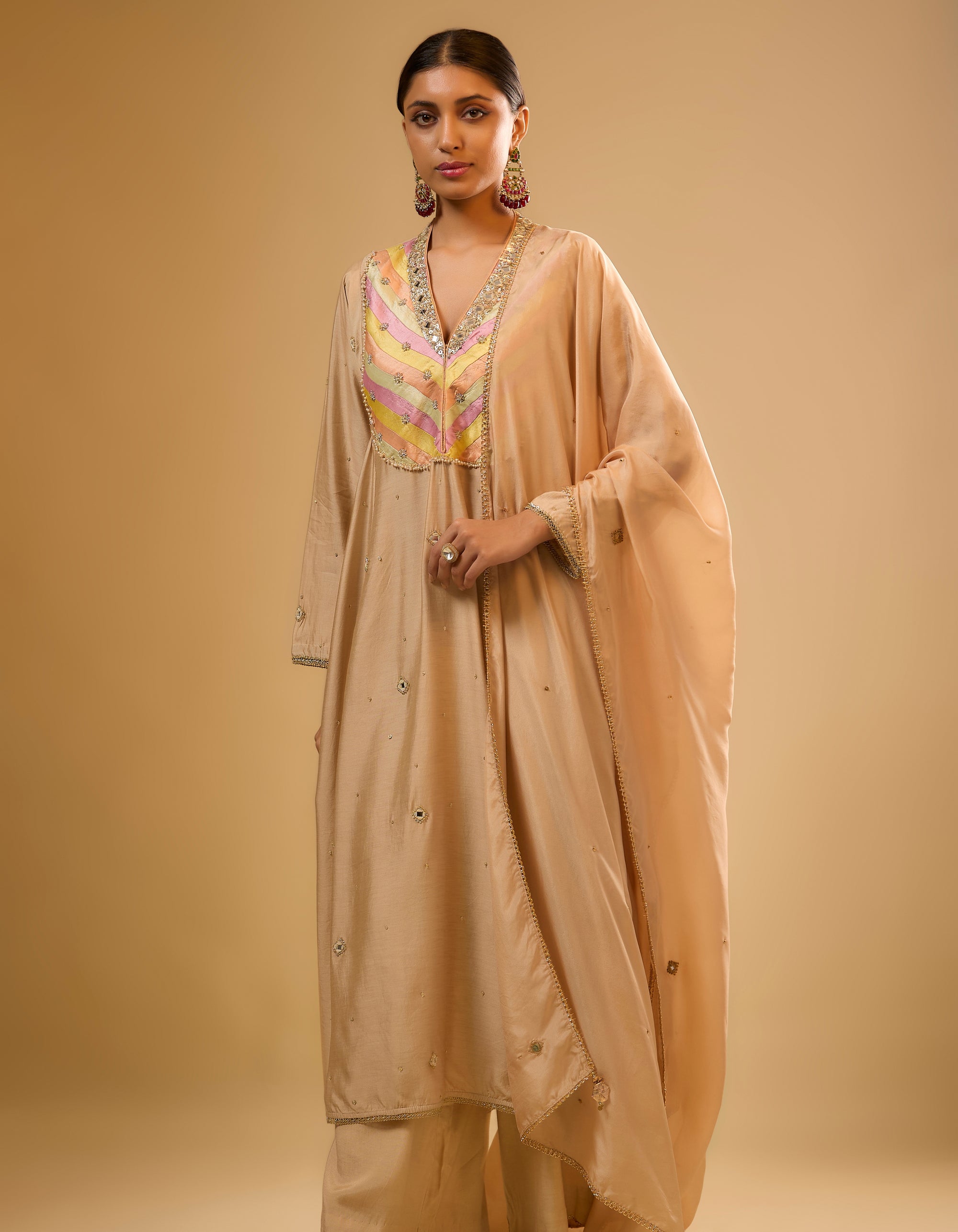 Beige Stripe Yoke Full Chunat Bageecha Kurta Set