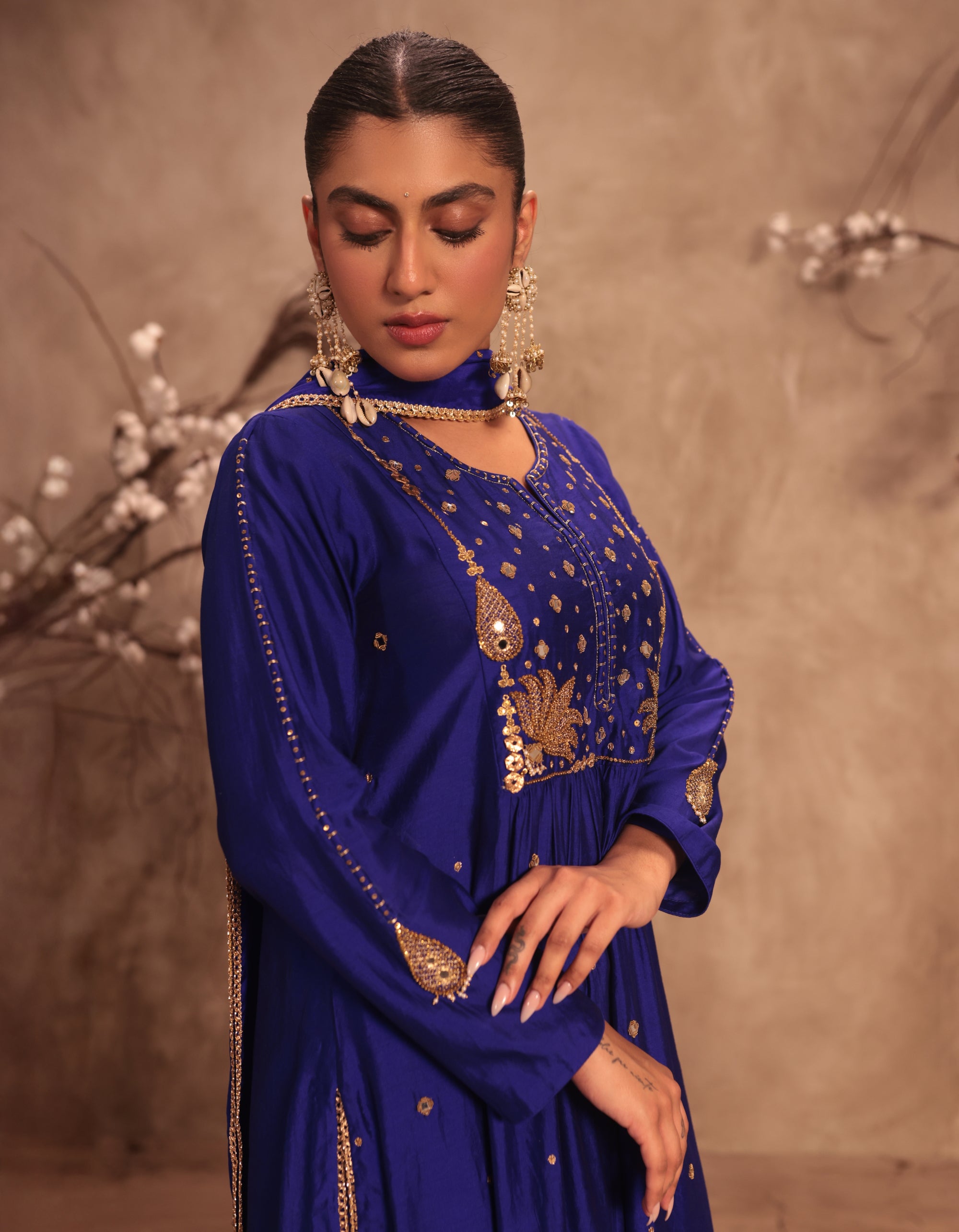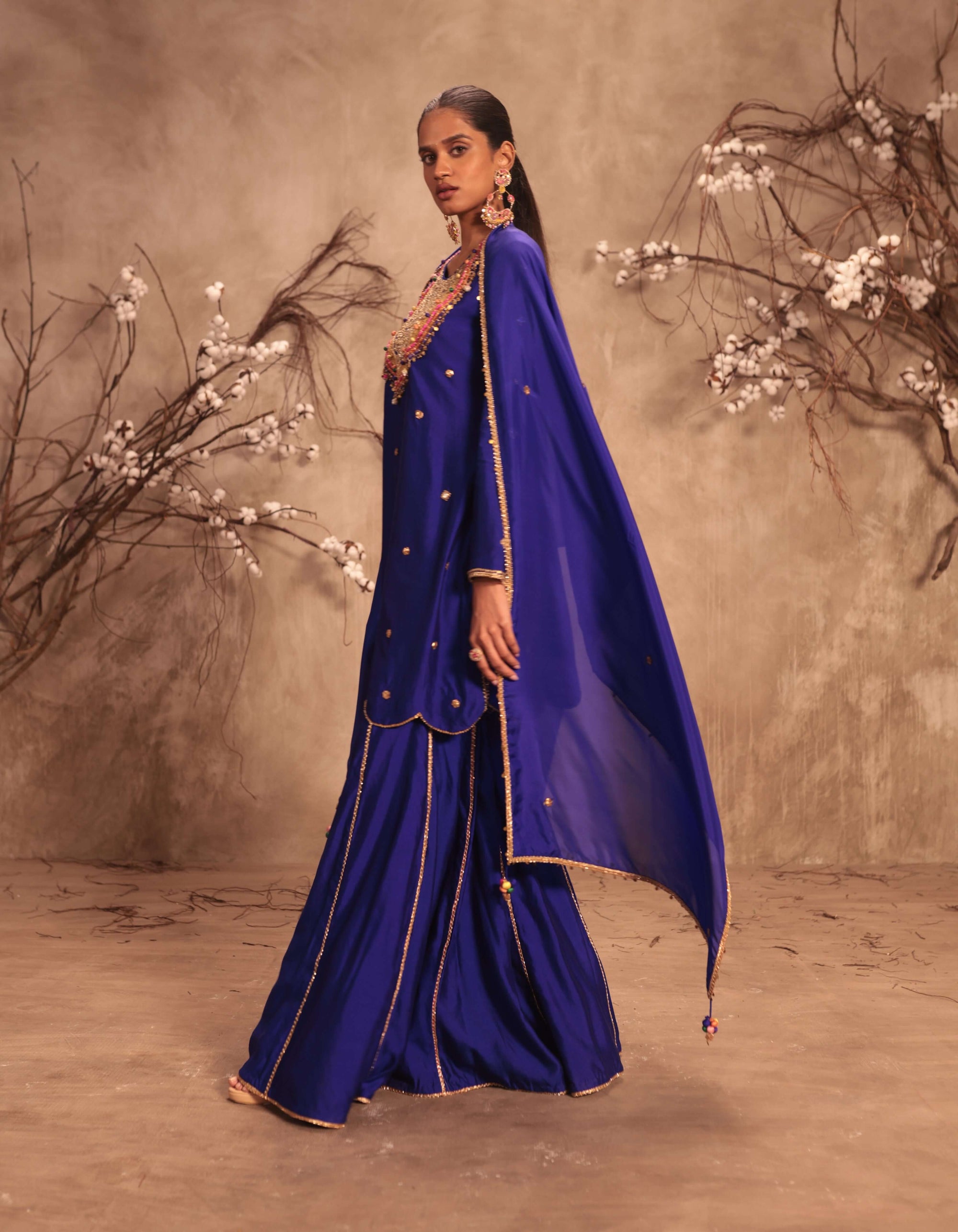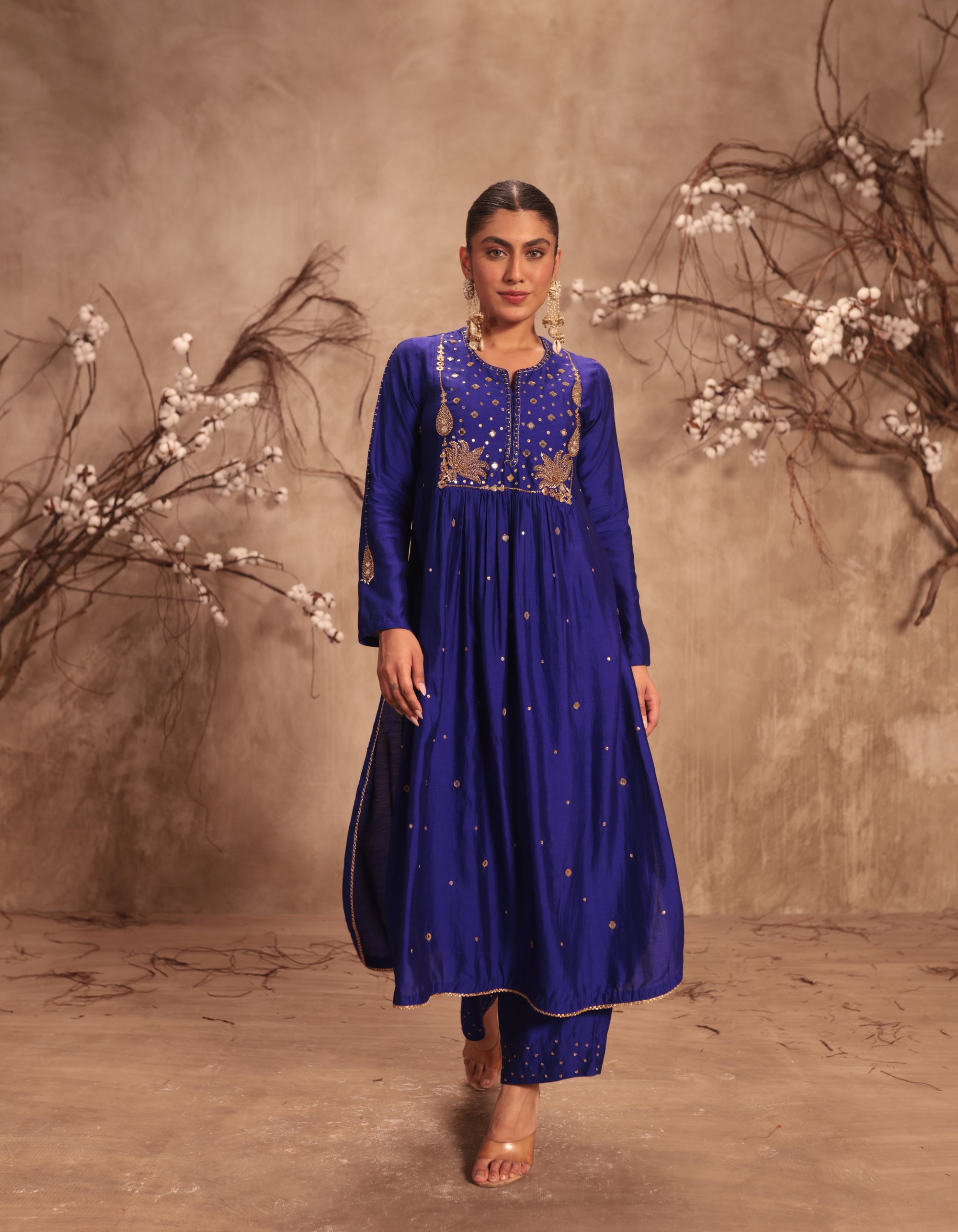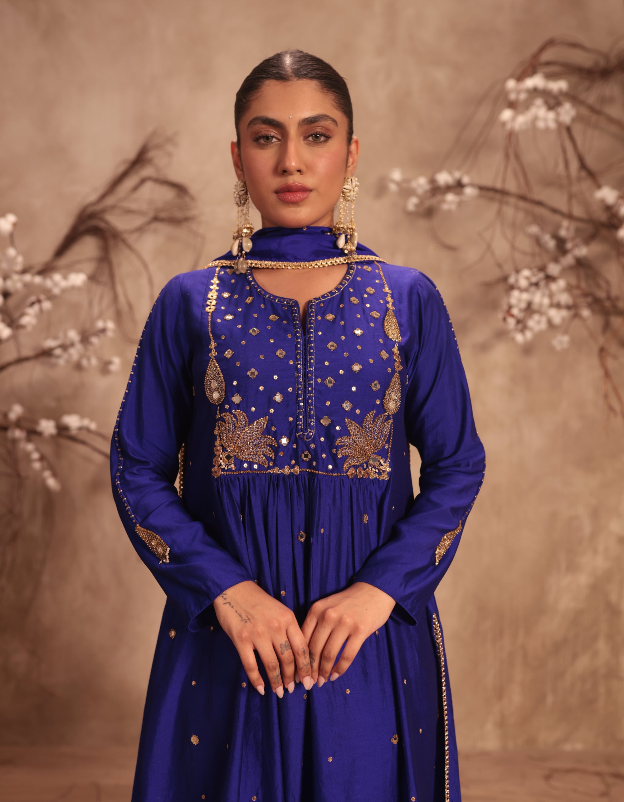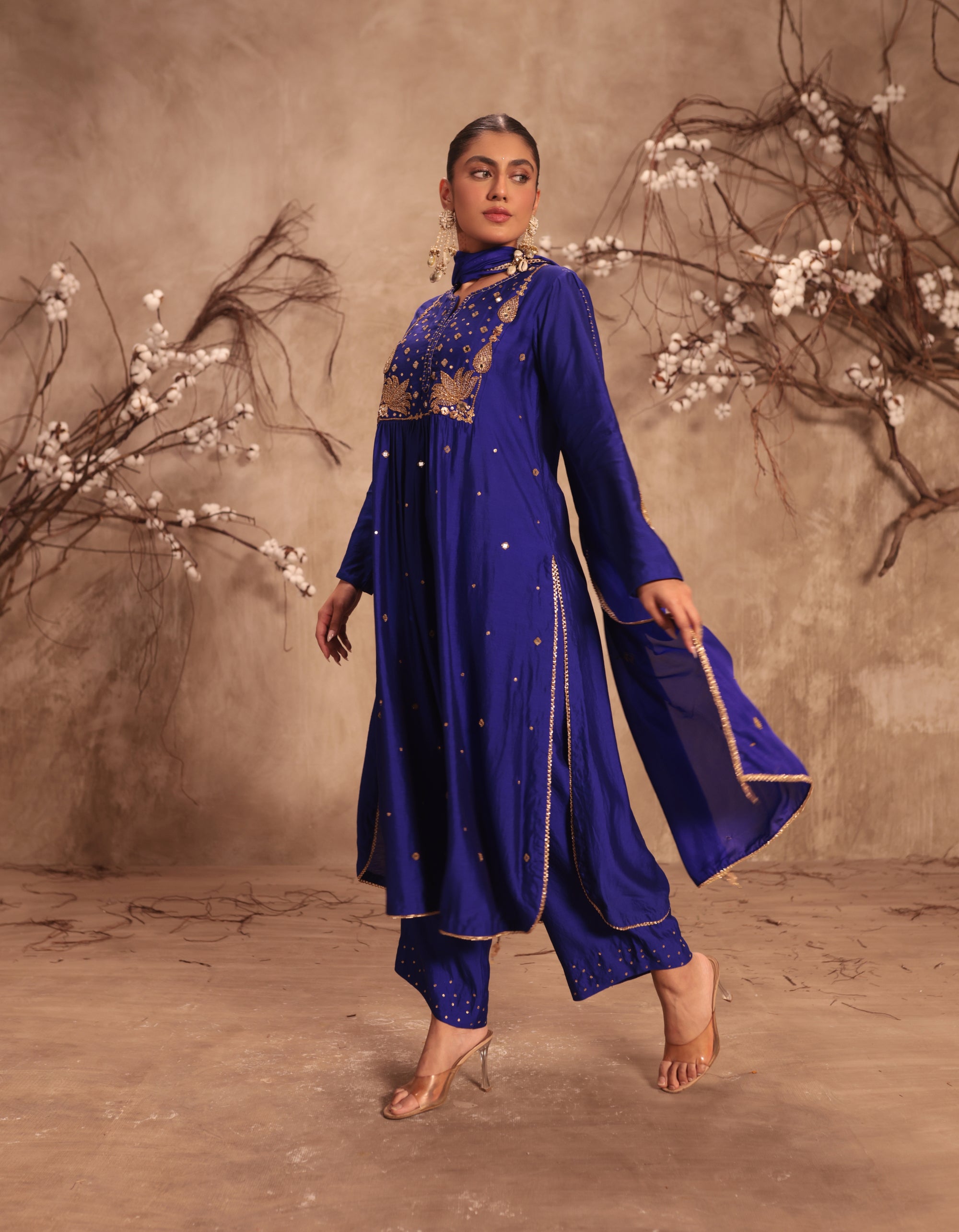 Meghna Nayyar in English Blue Threadwork Long Yoke Noor Kurta Set