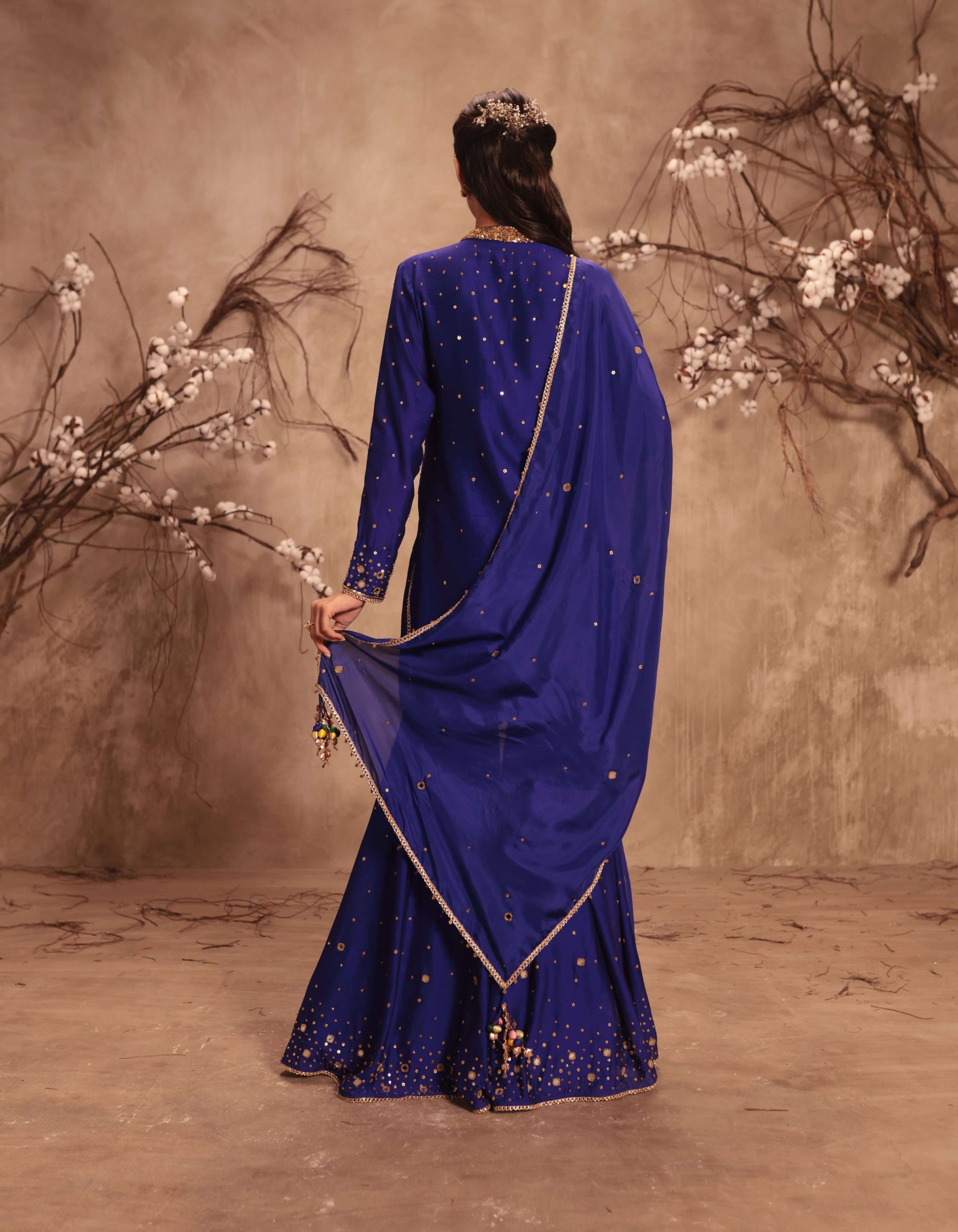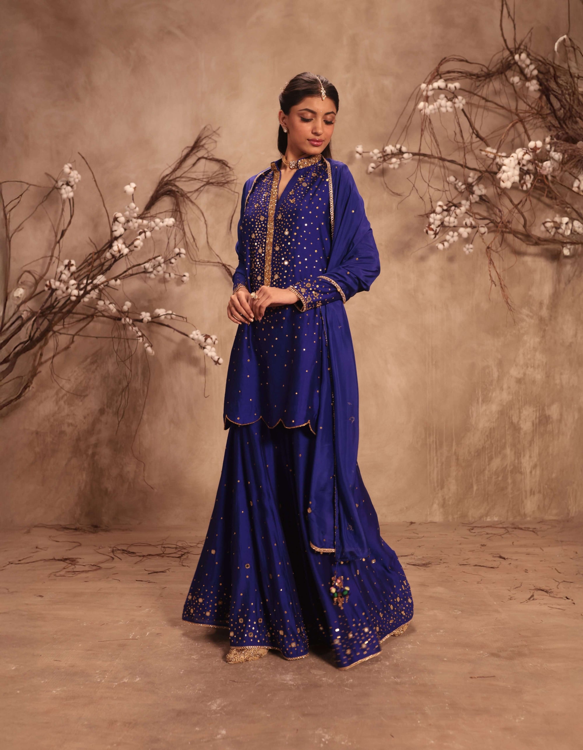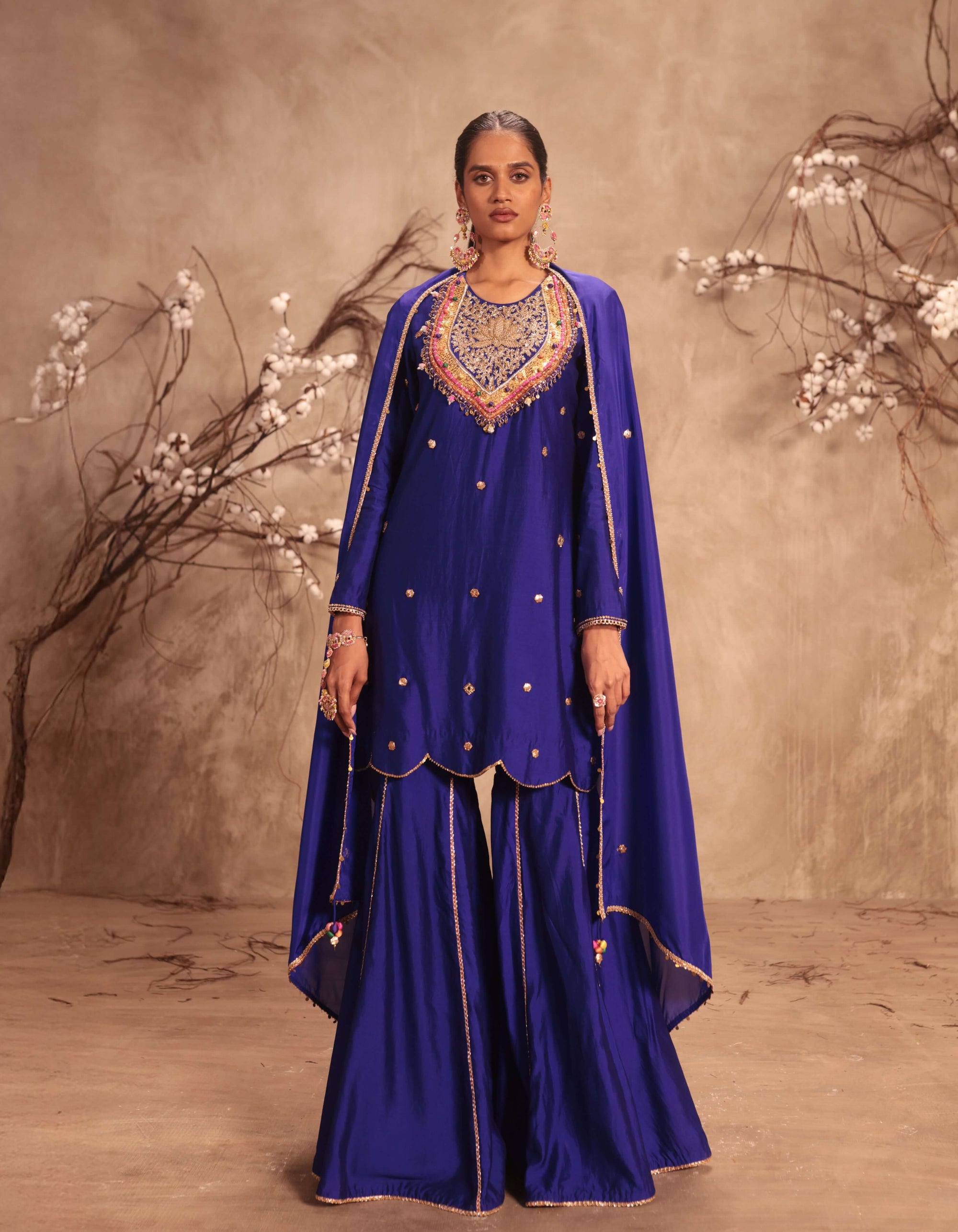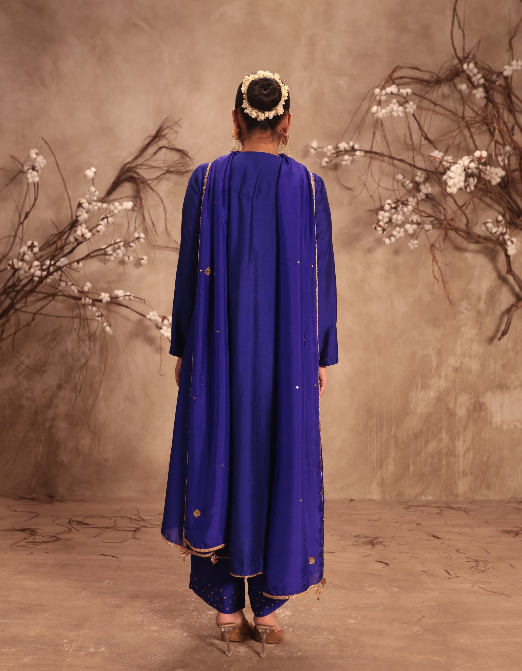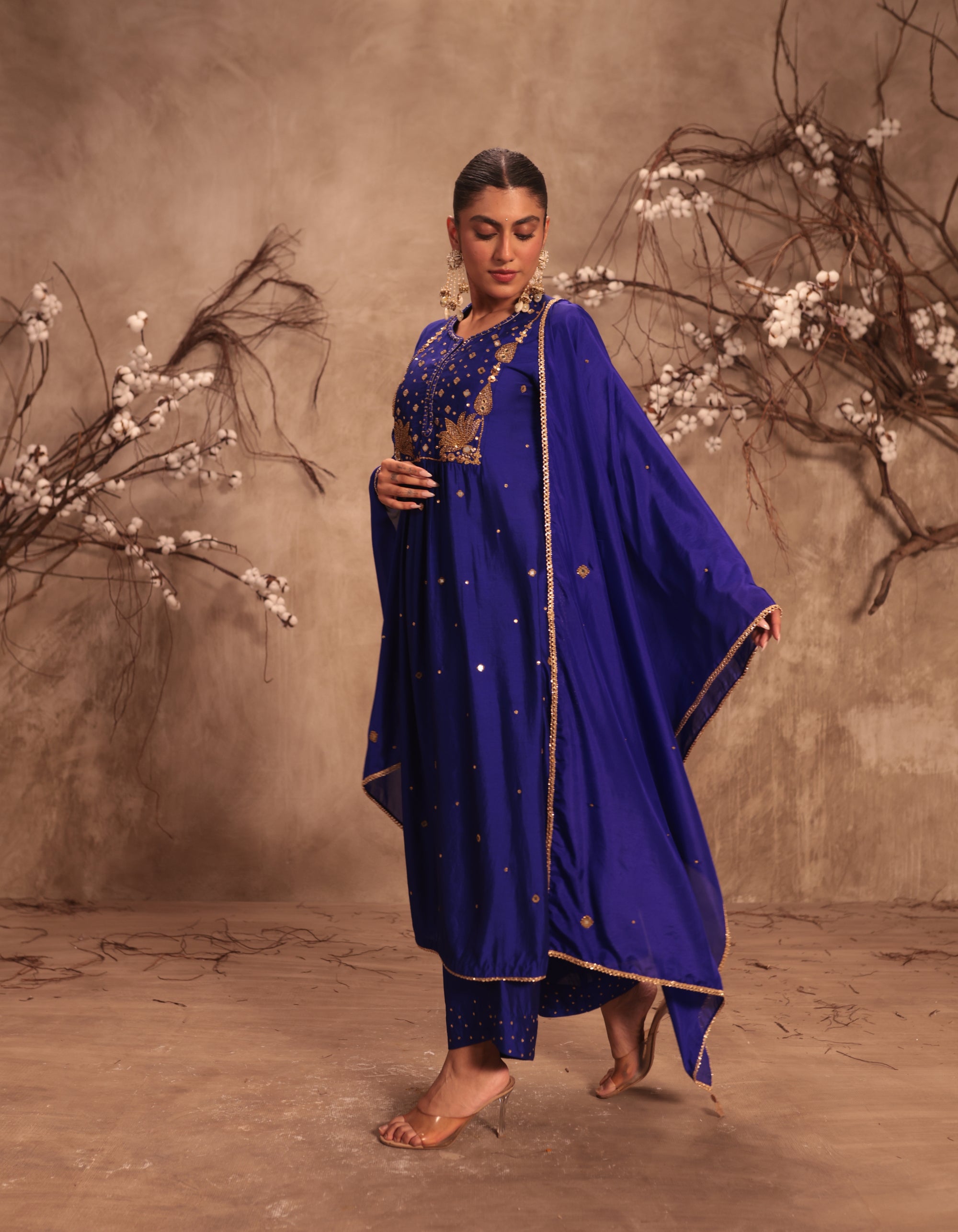 Meghna Nayyar in English Blue Threadwork Long Yoke Noor Kurta Set