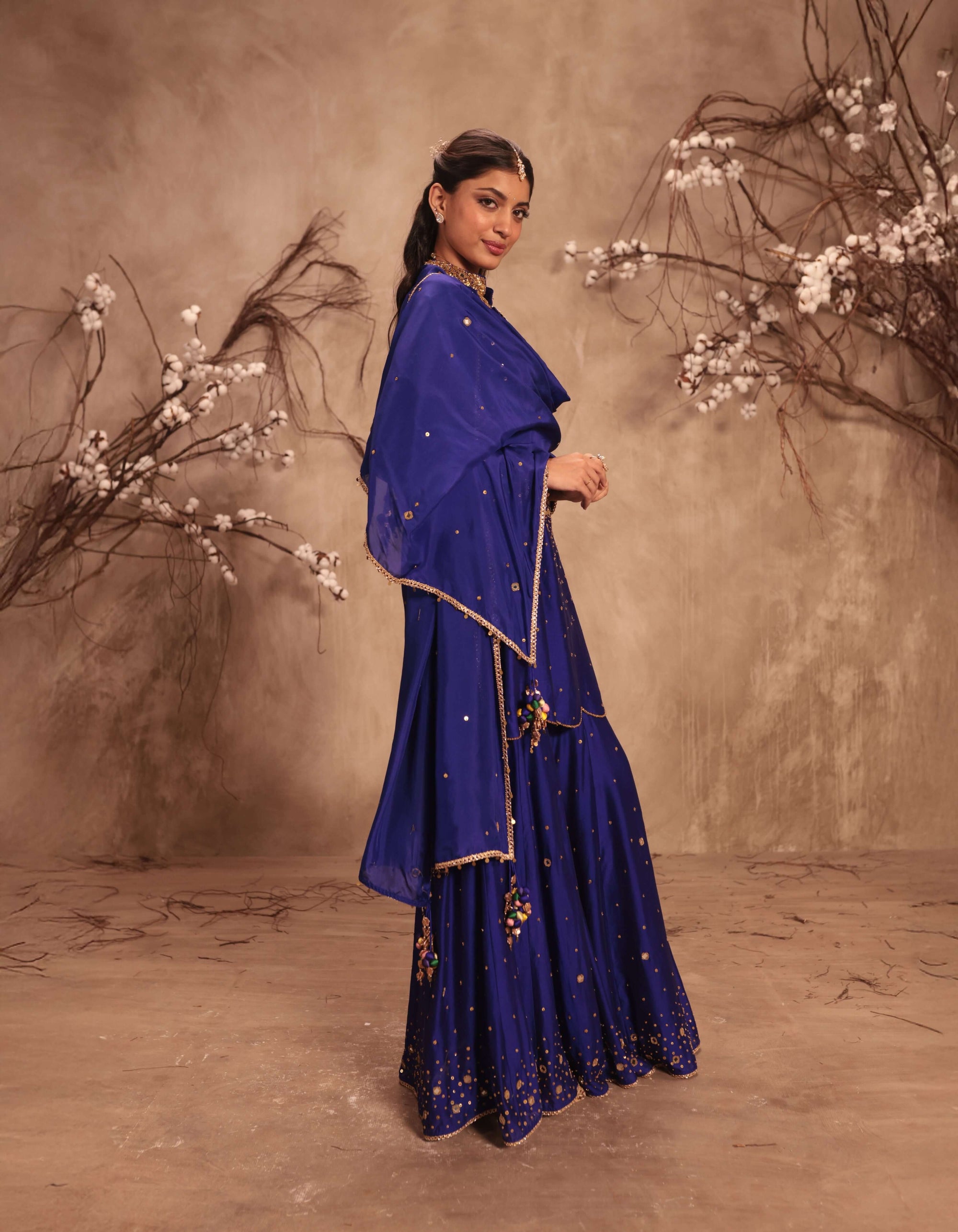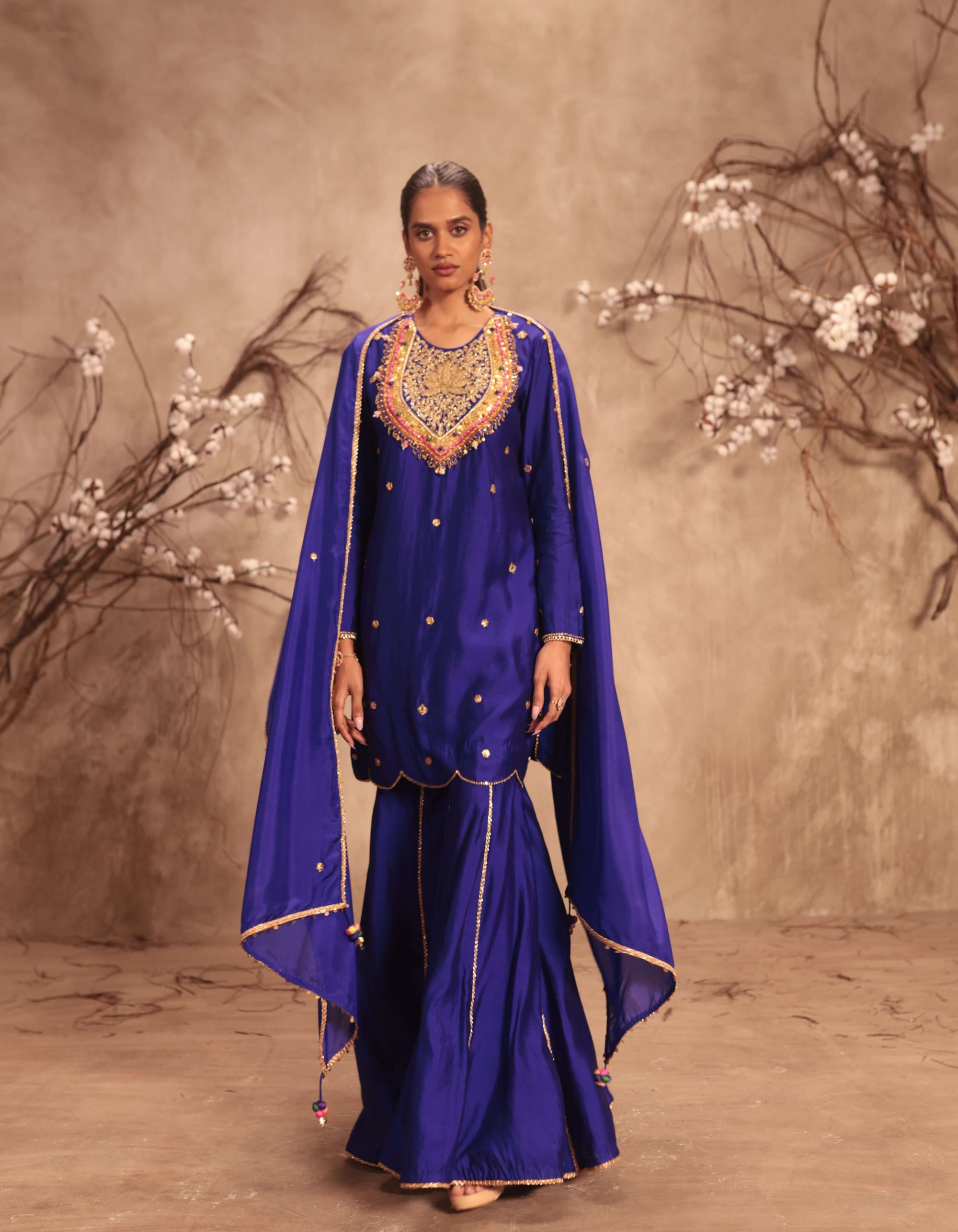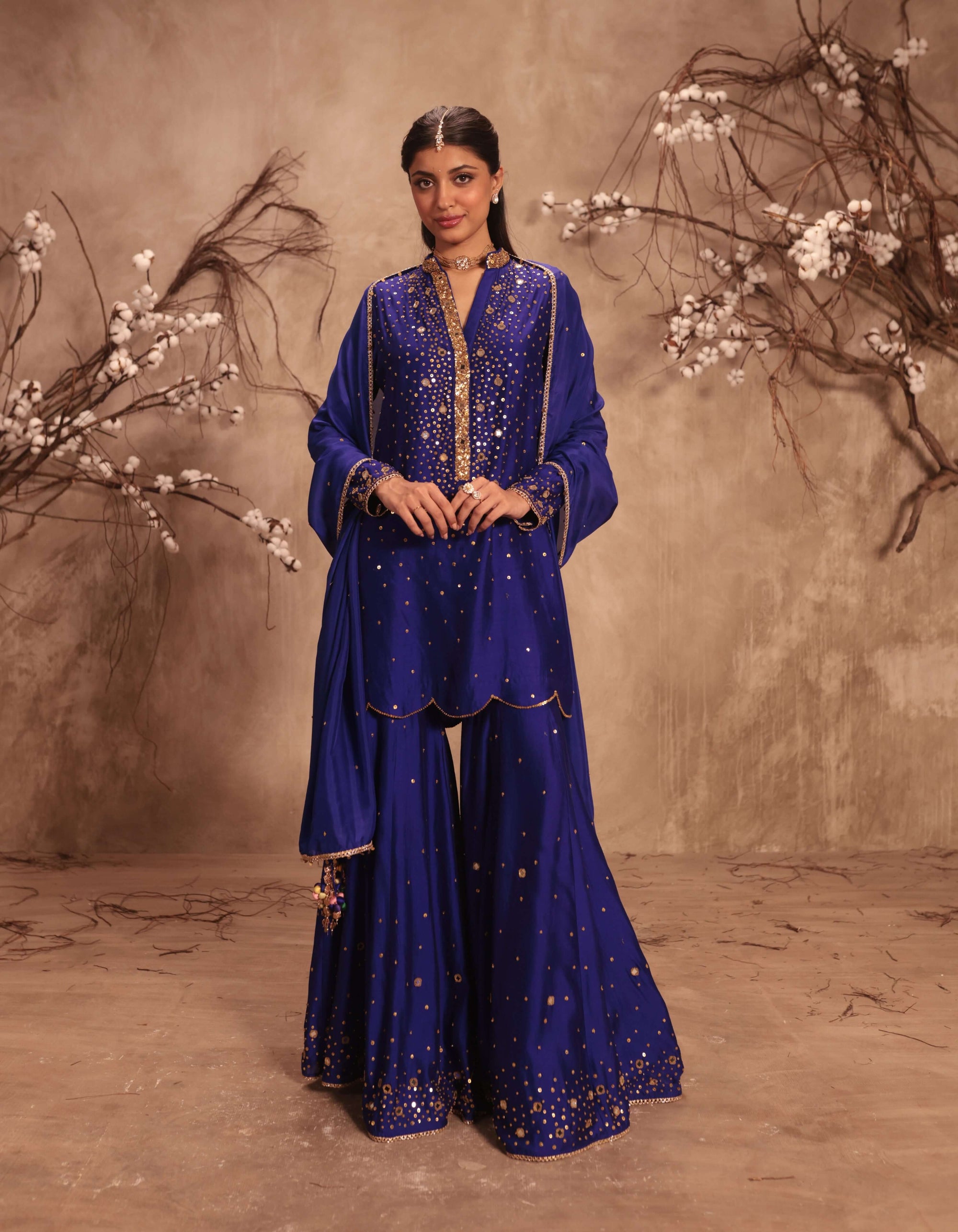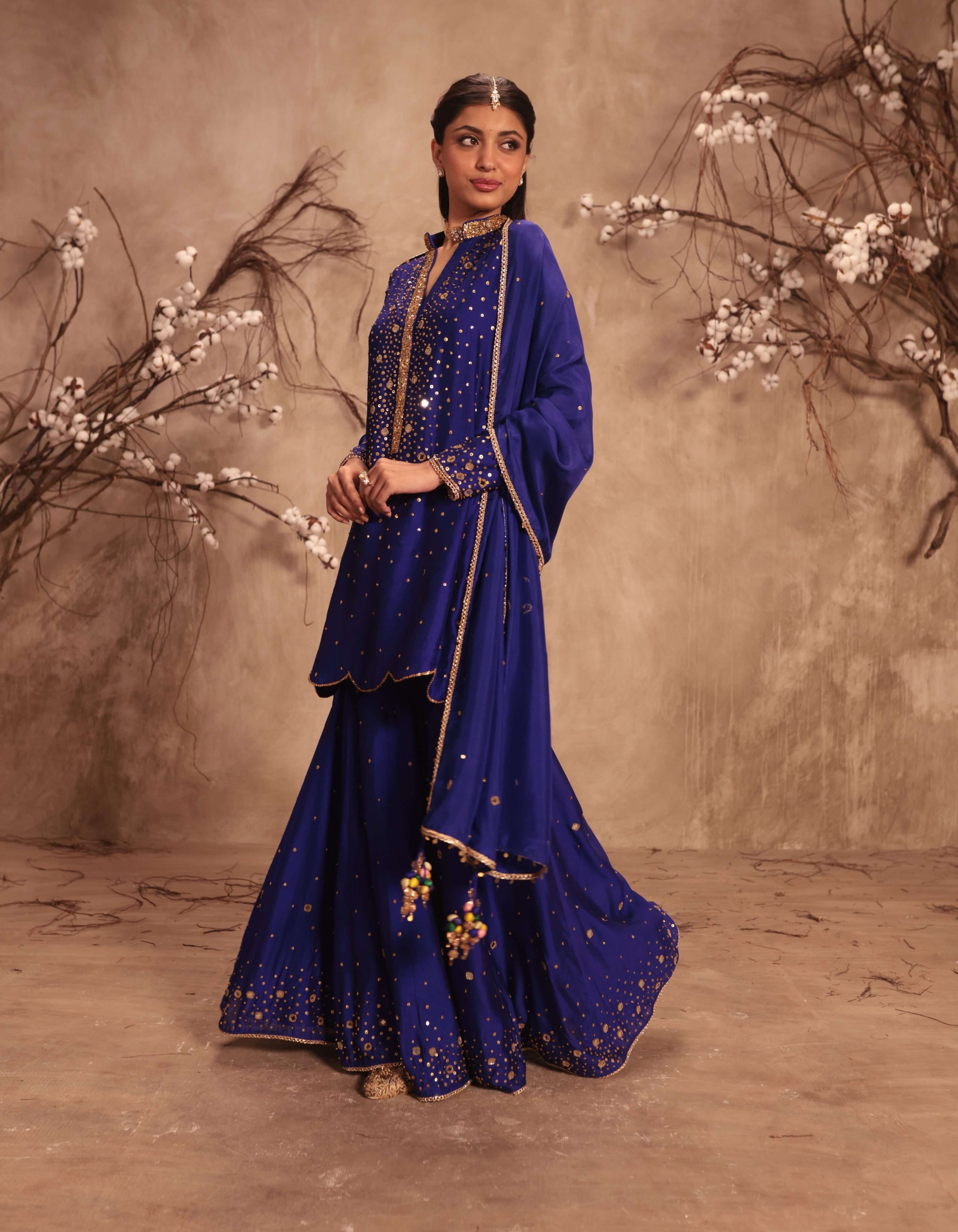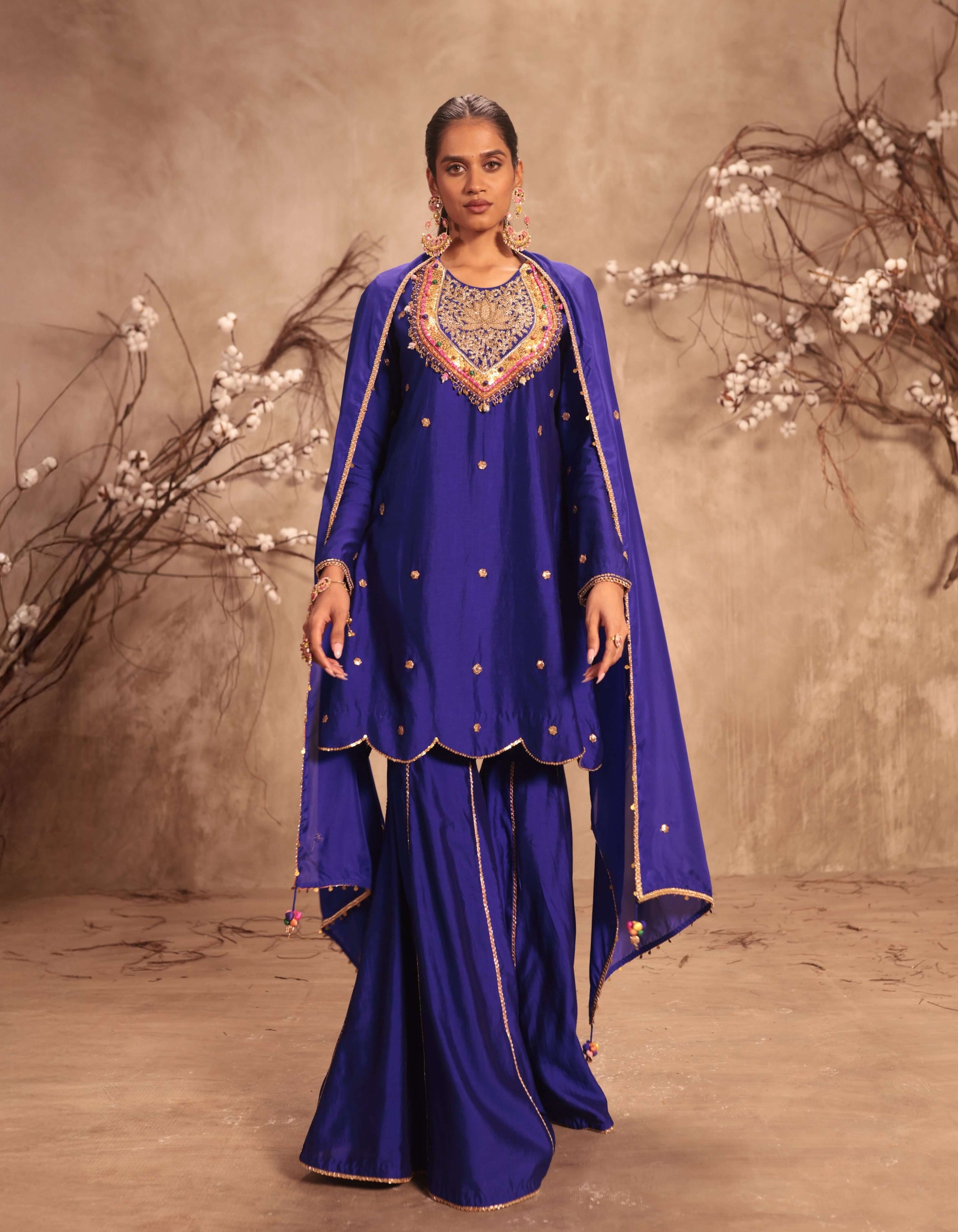 Meghna Nayyar in English Blue Threadwork Long Yoke Noor Kurta Set