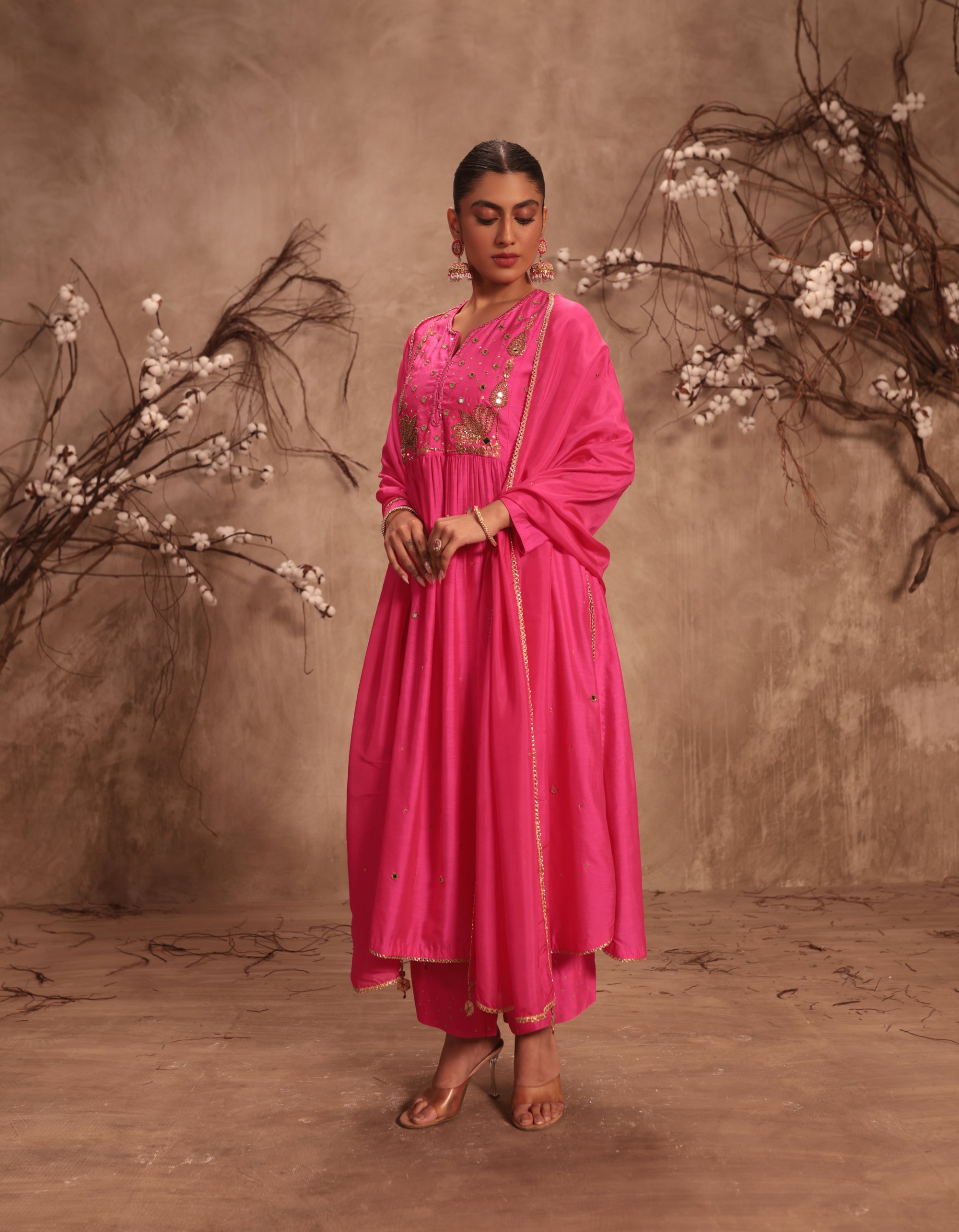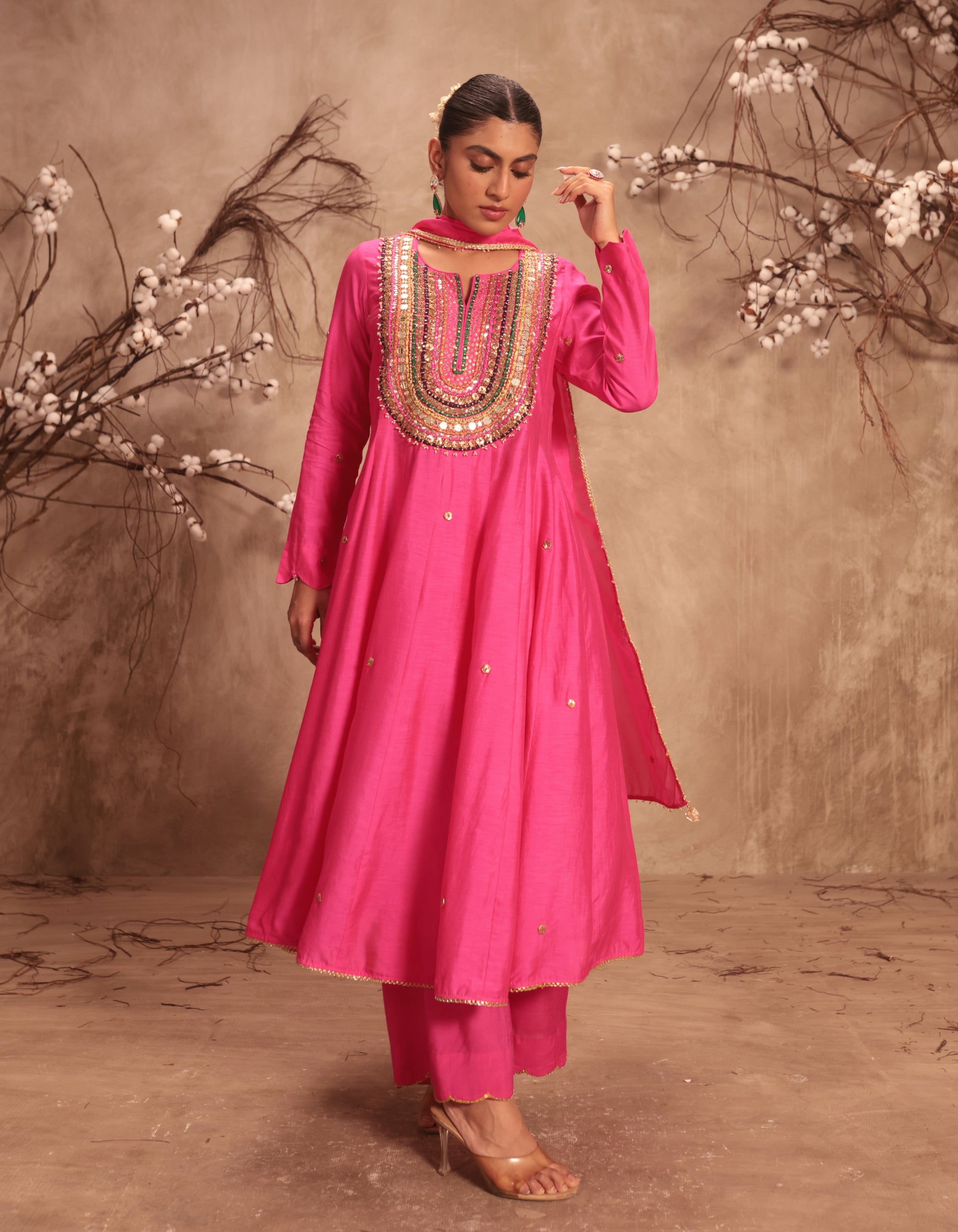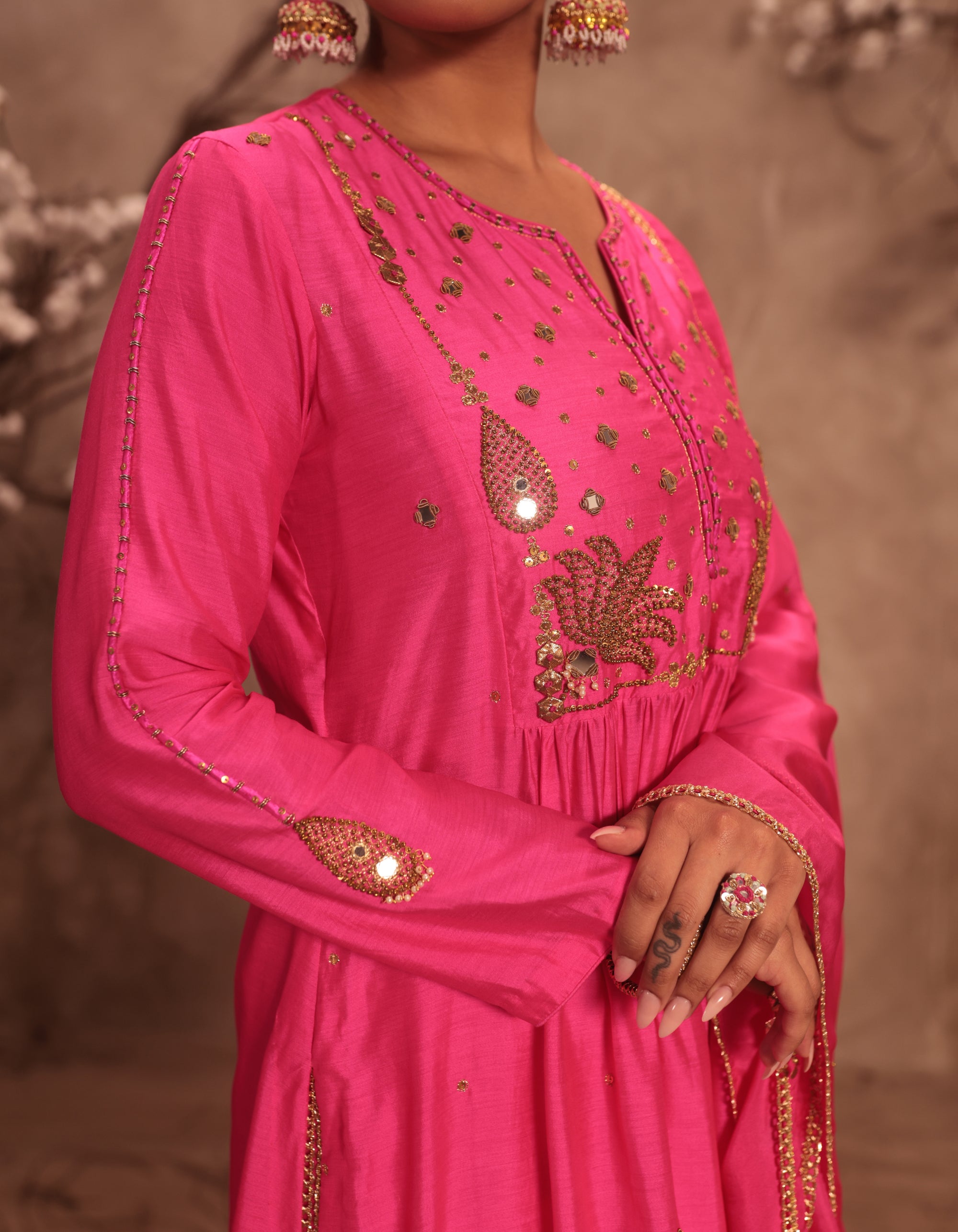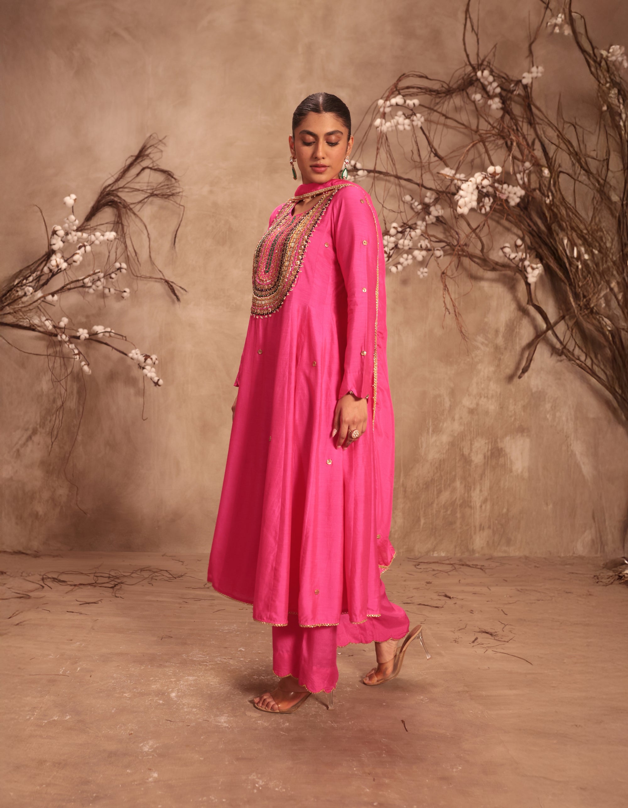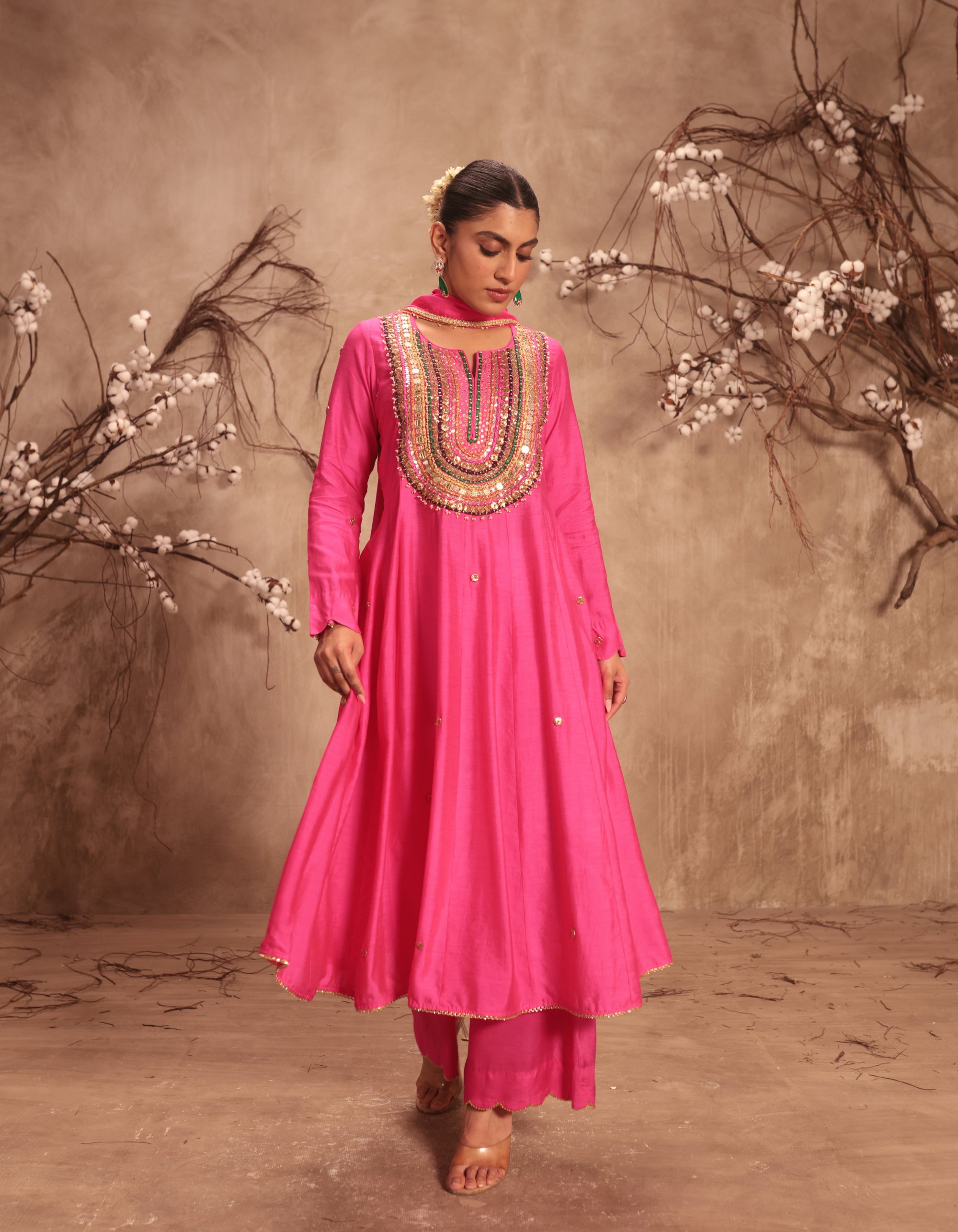Hot Pink Multicolour Yoke Rani Anarkali Set