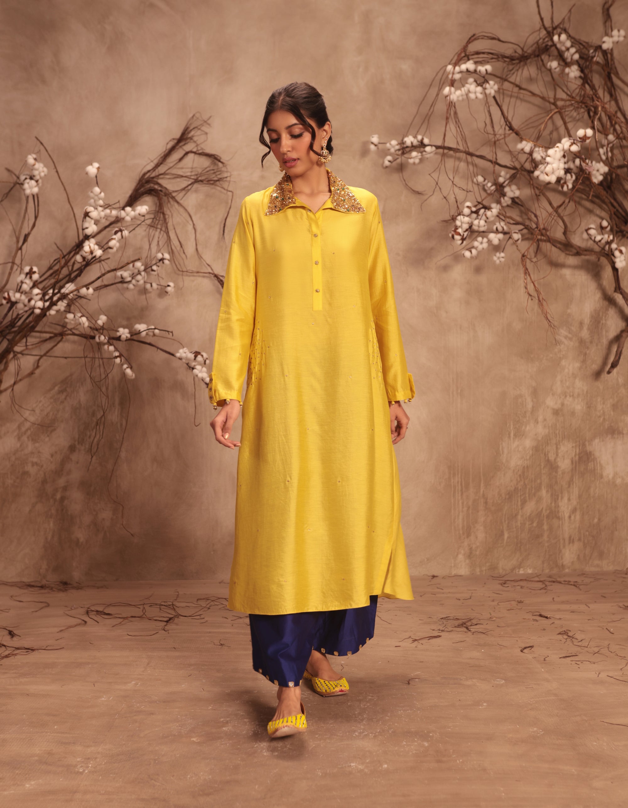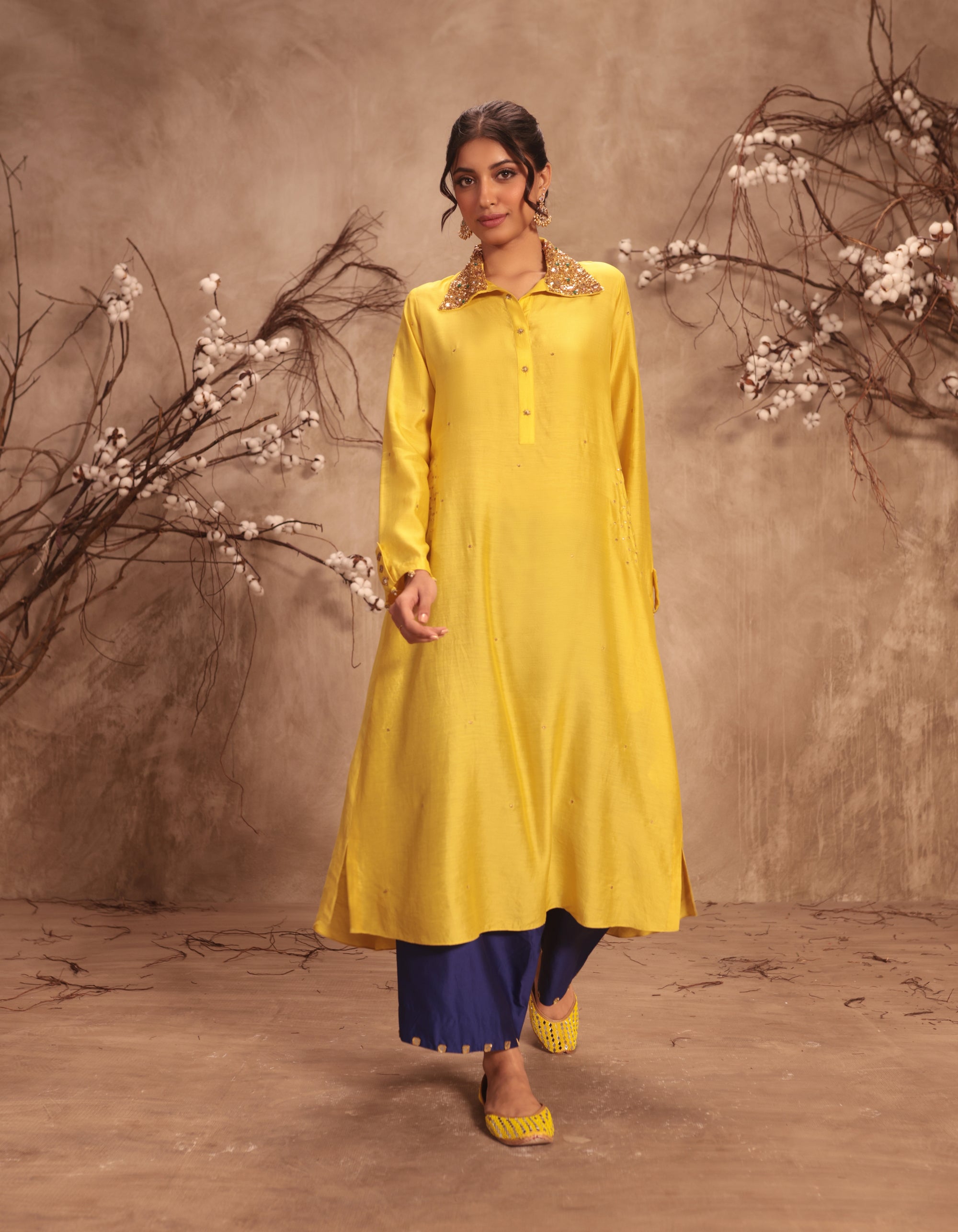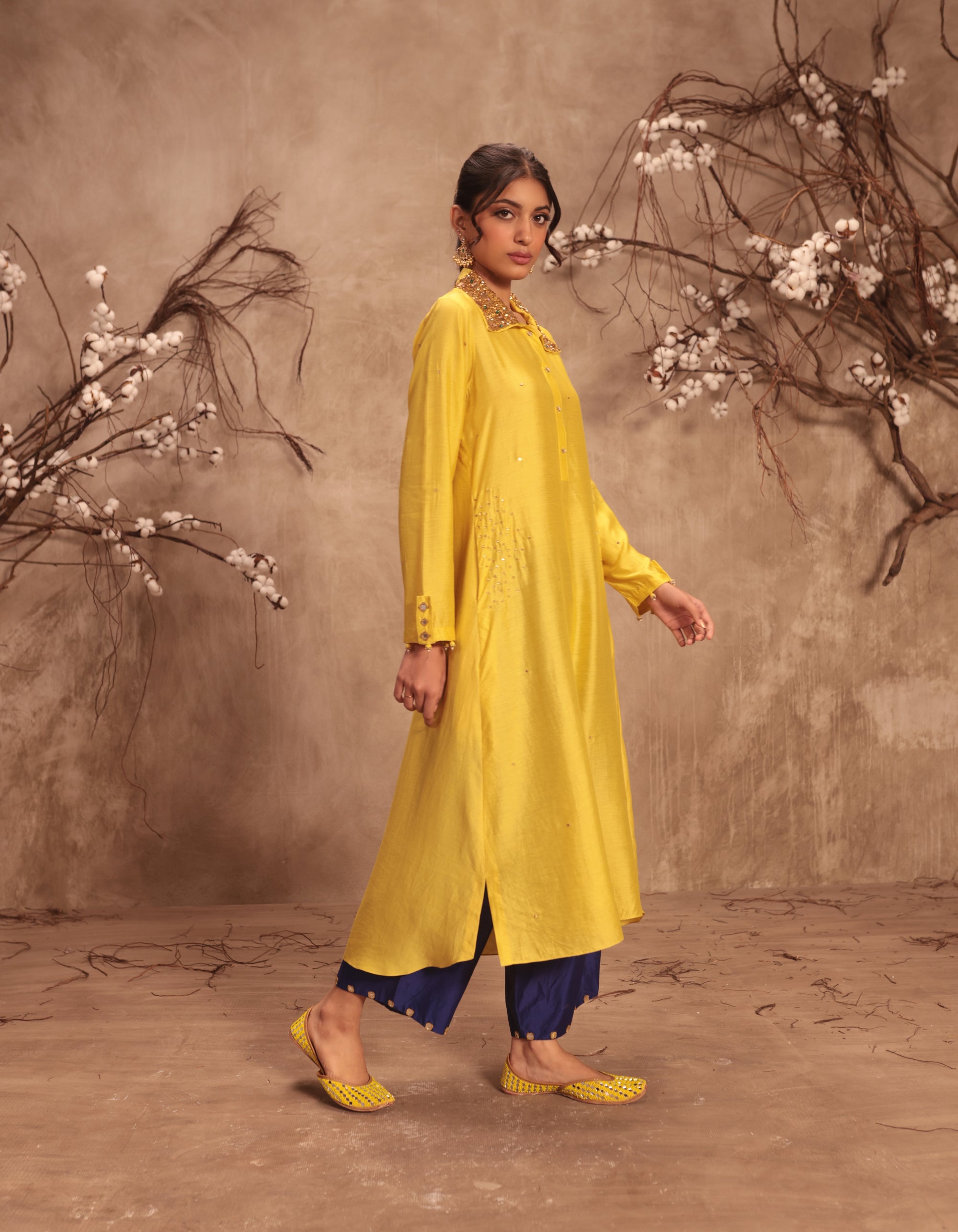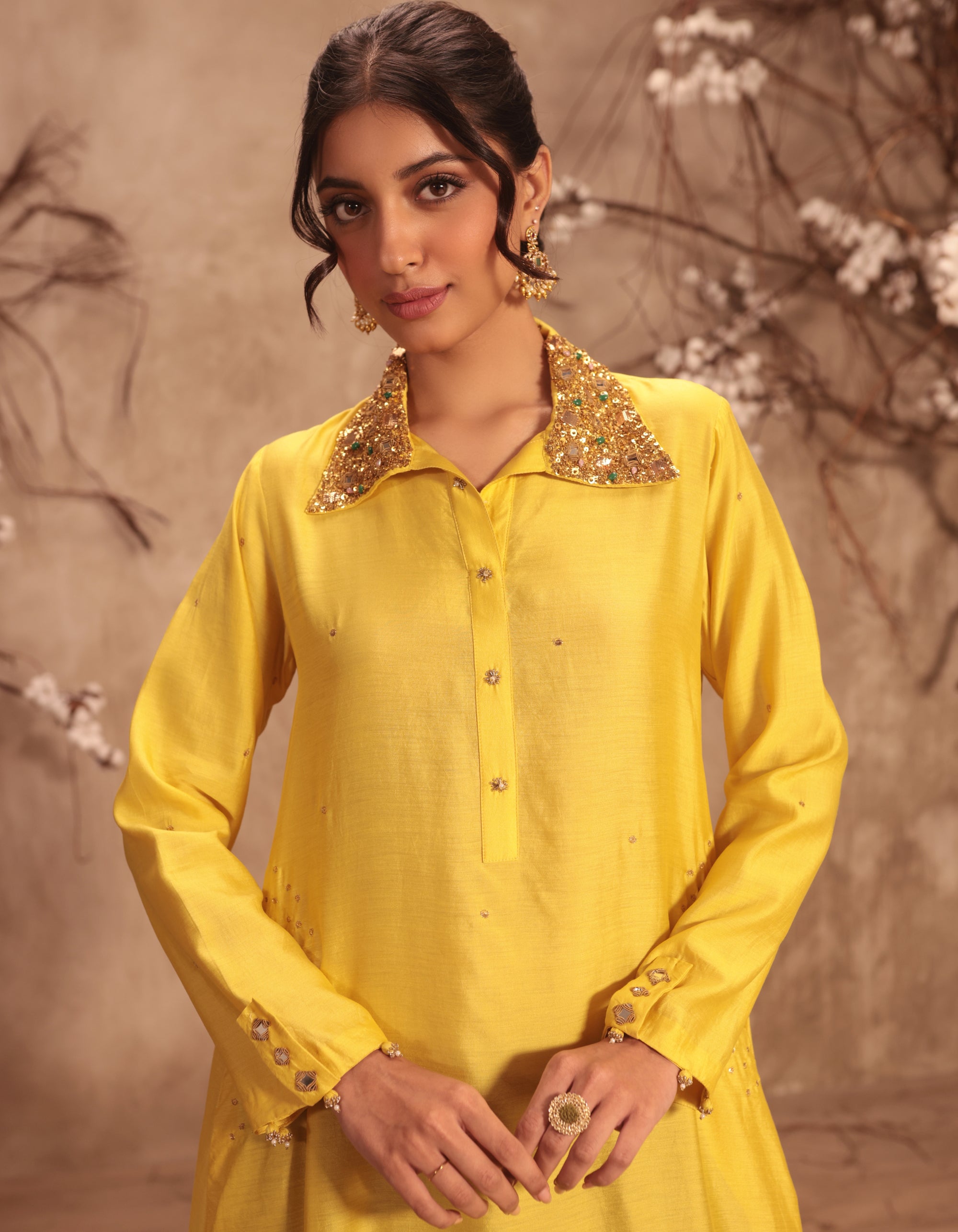 Mustard Threadwork Long Yoke Noor Kurta Set
