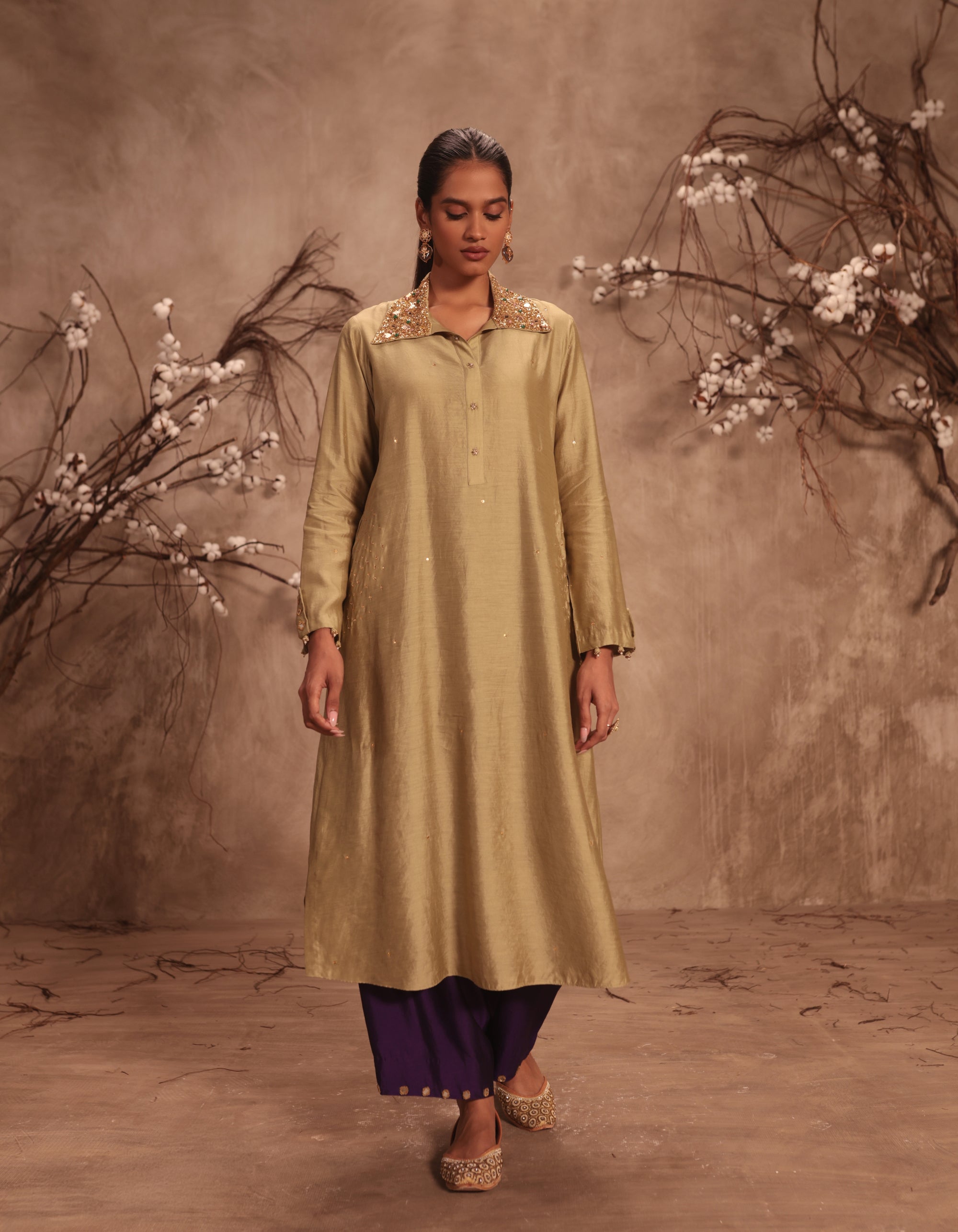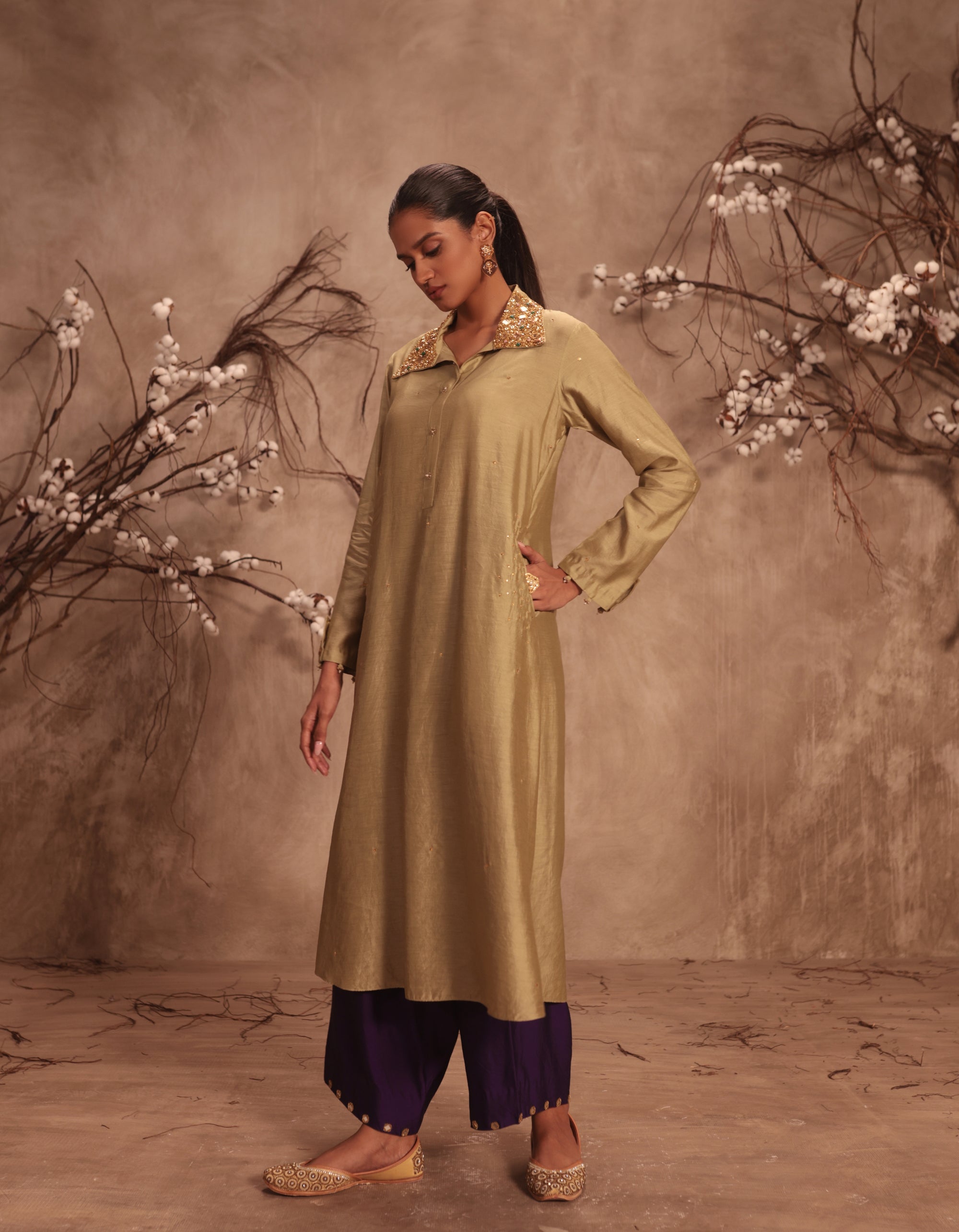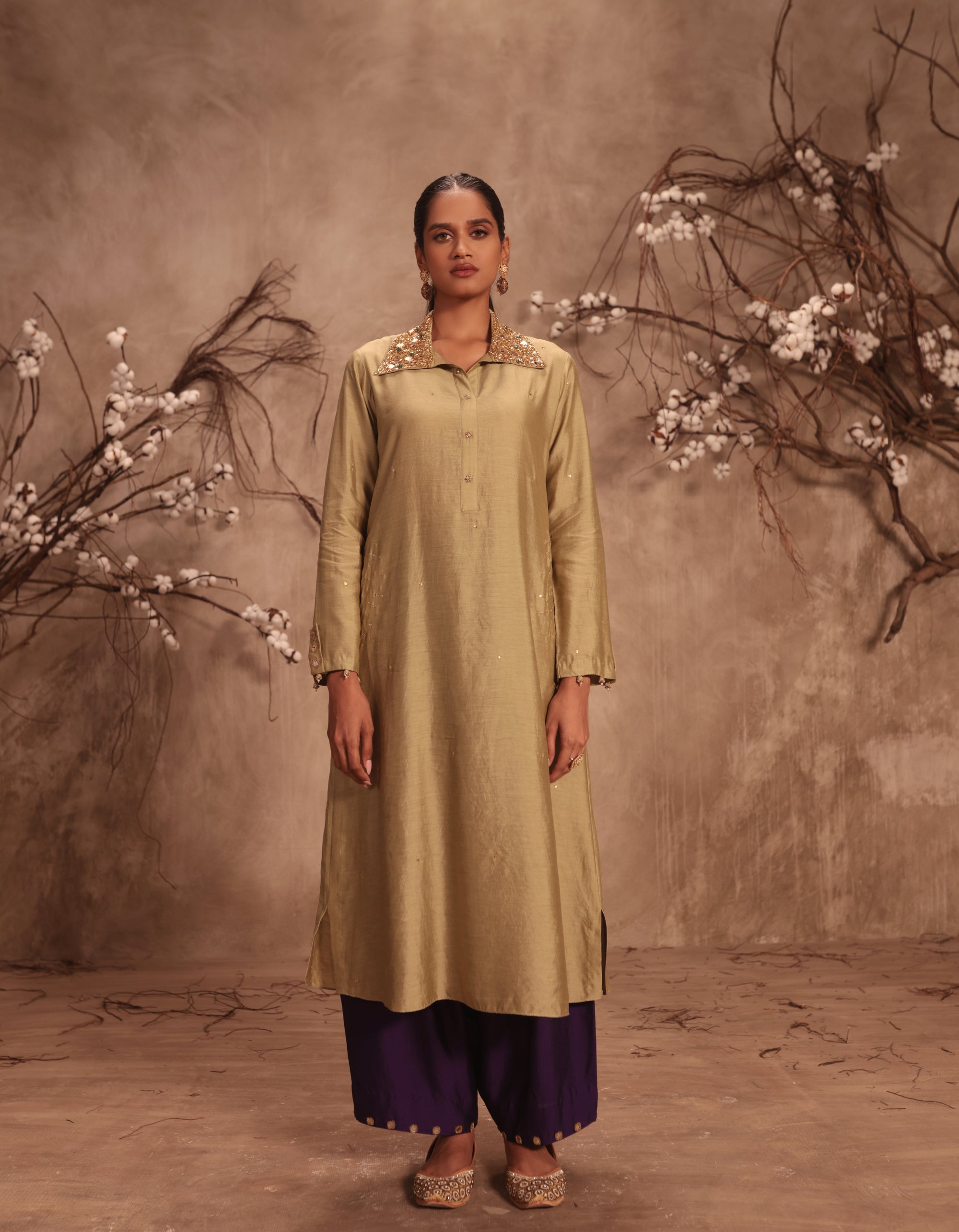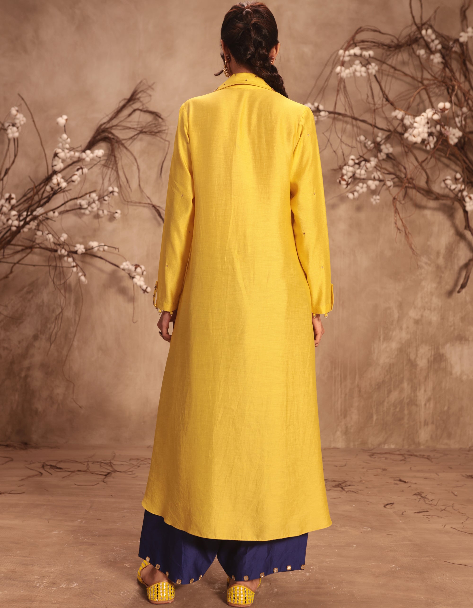Mustard Threadwork Long Yoke Noor Kurta Set