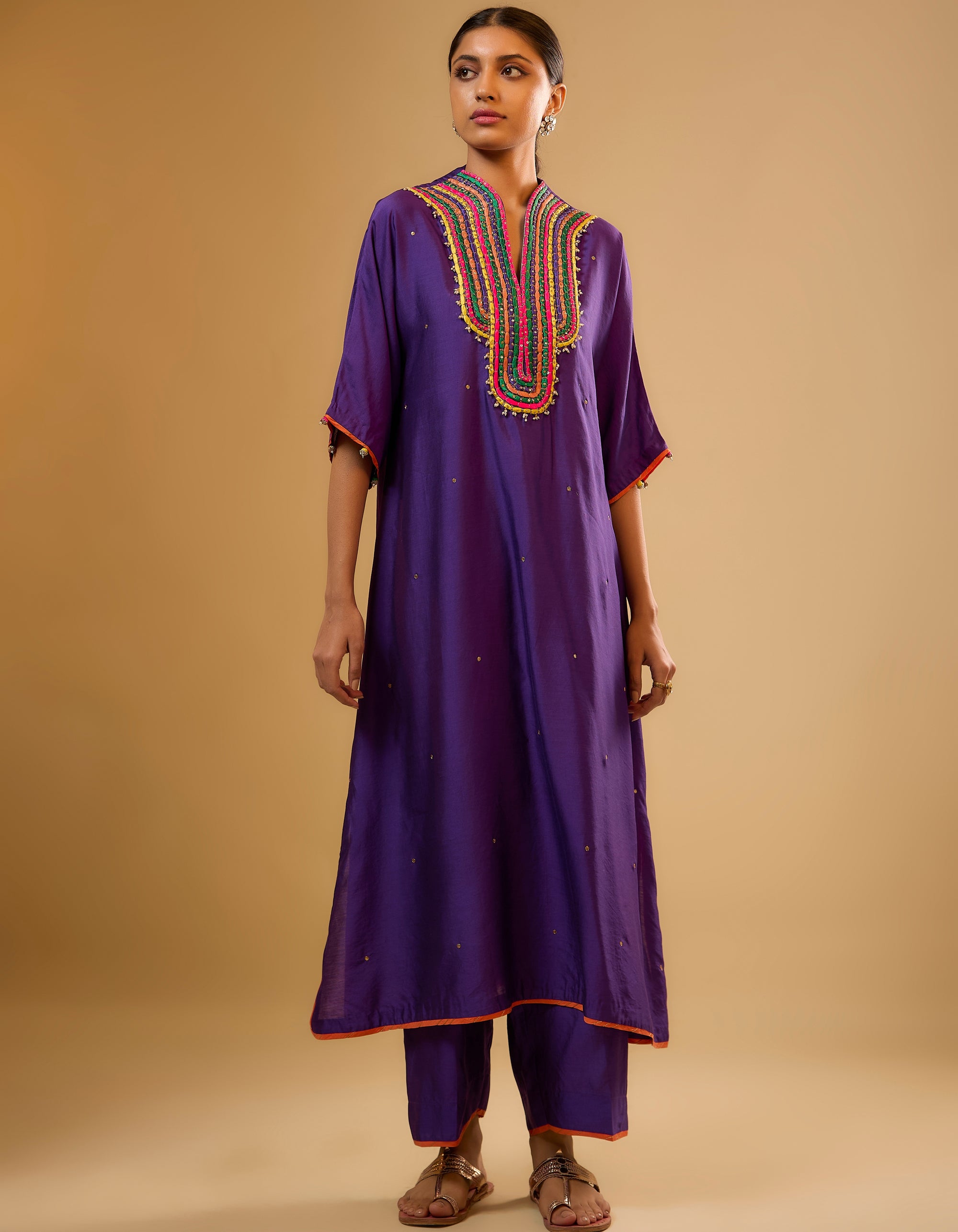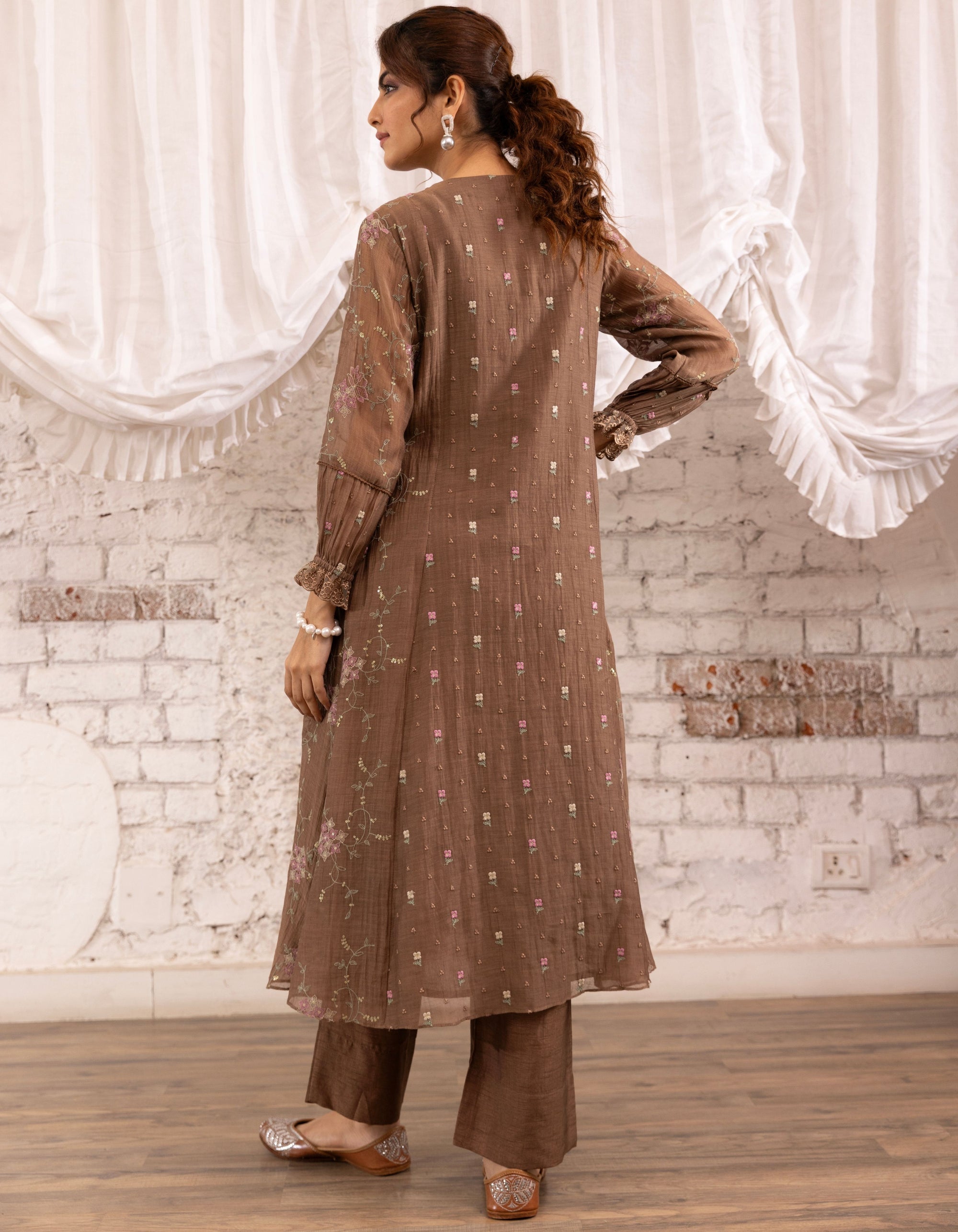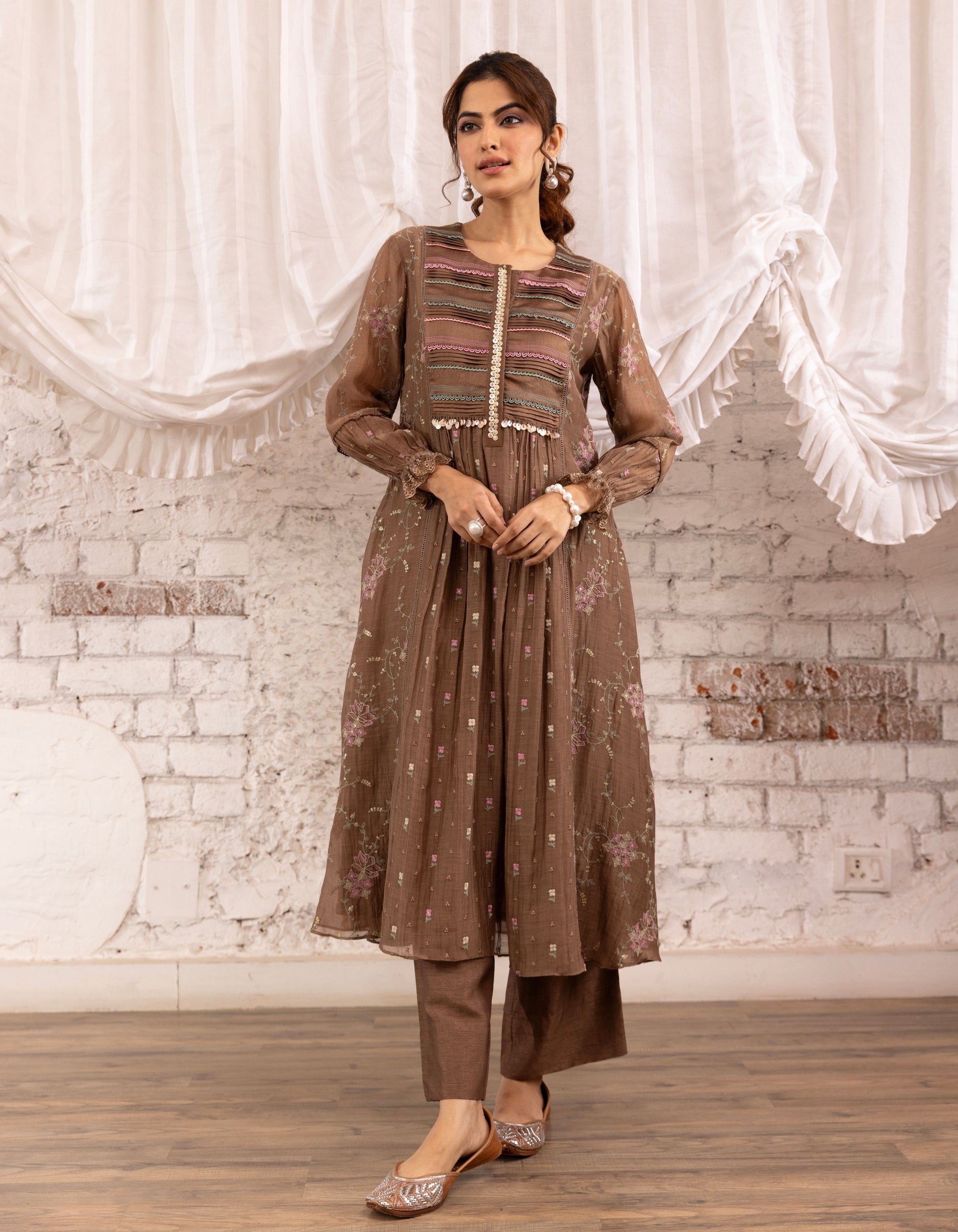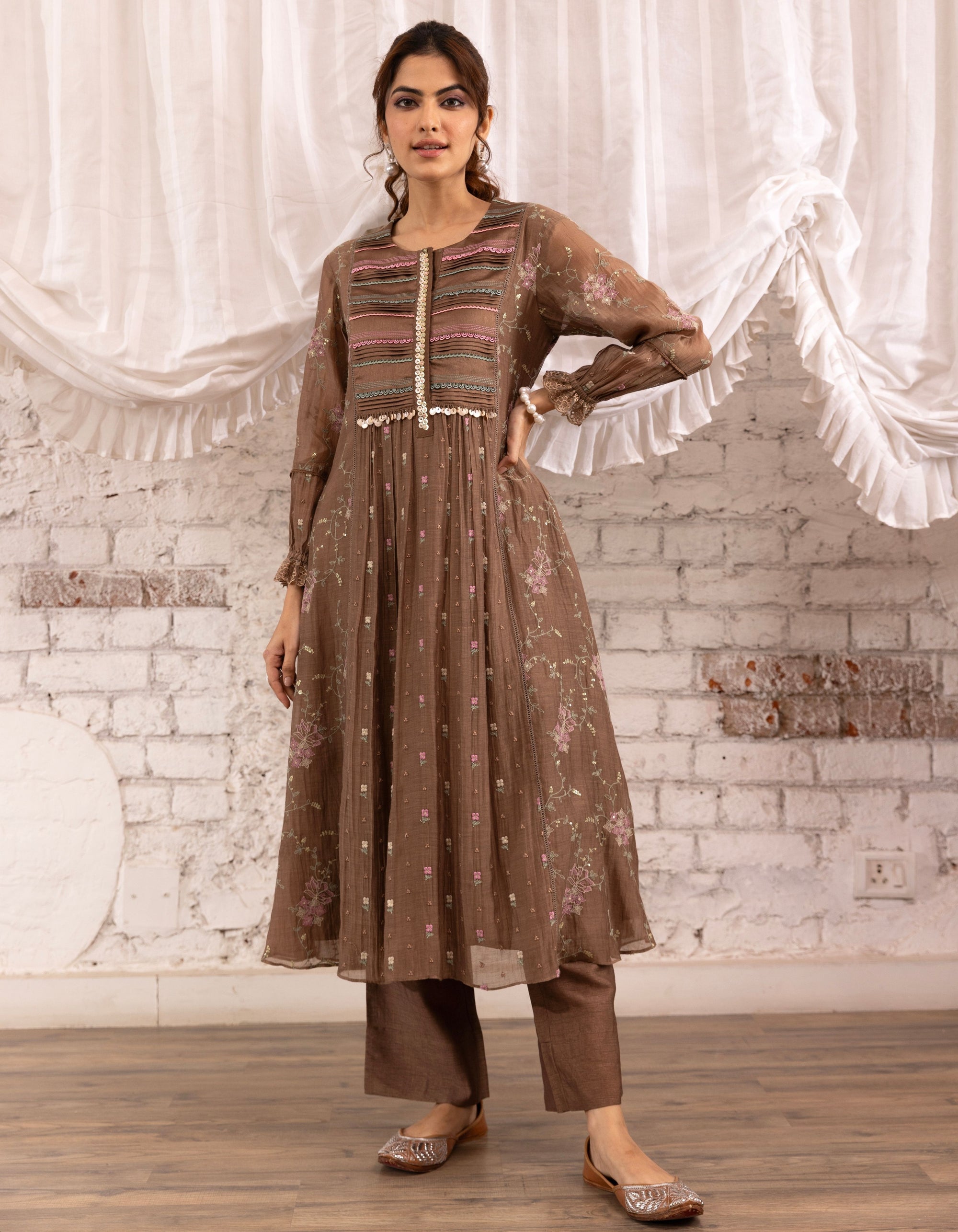 Mustard Threadwork Long Yoke Noor Kurta Set