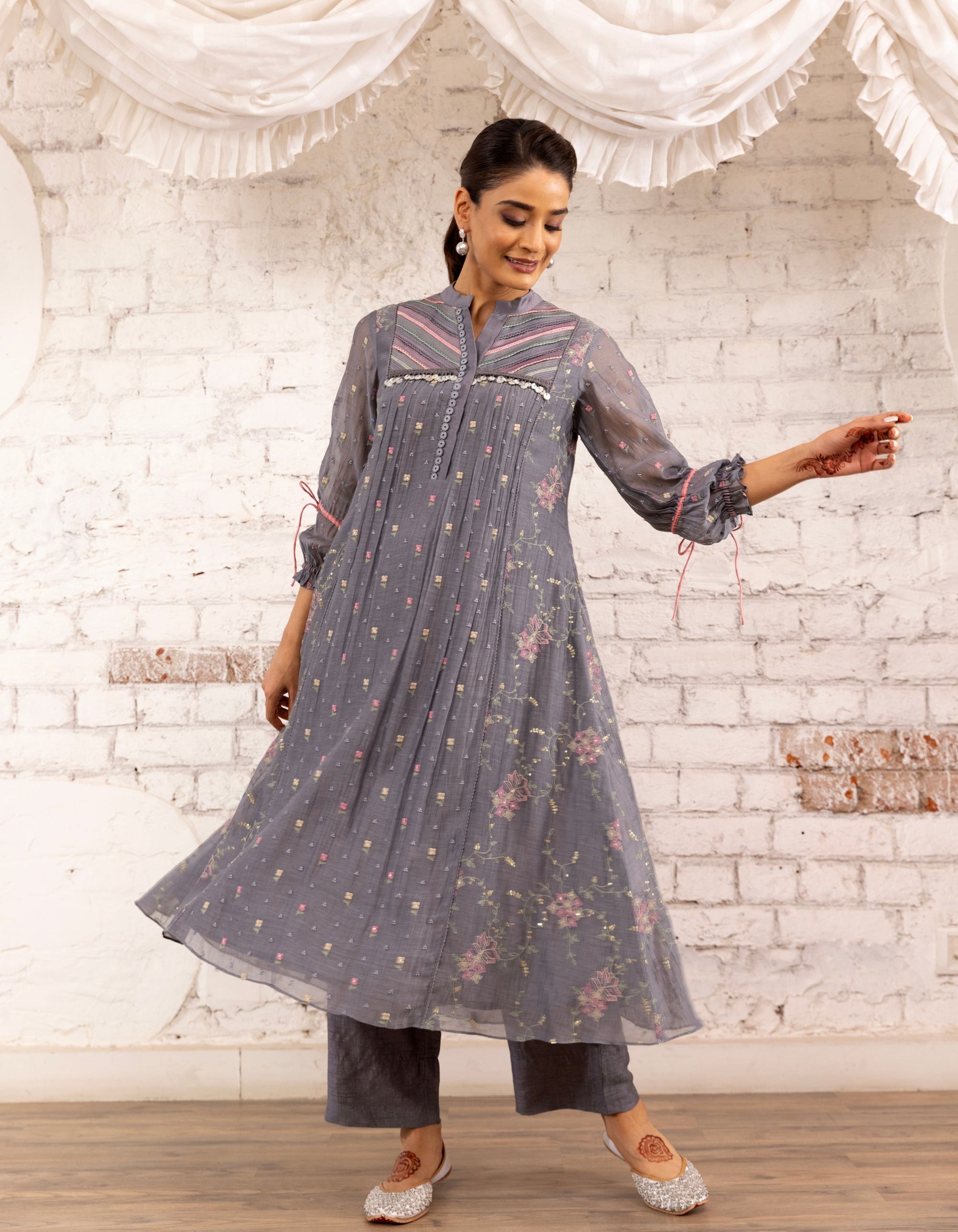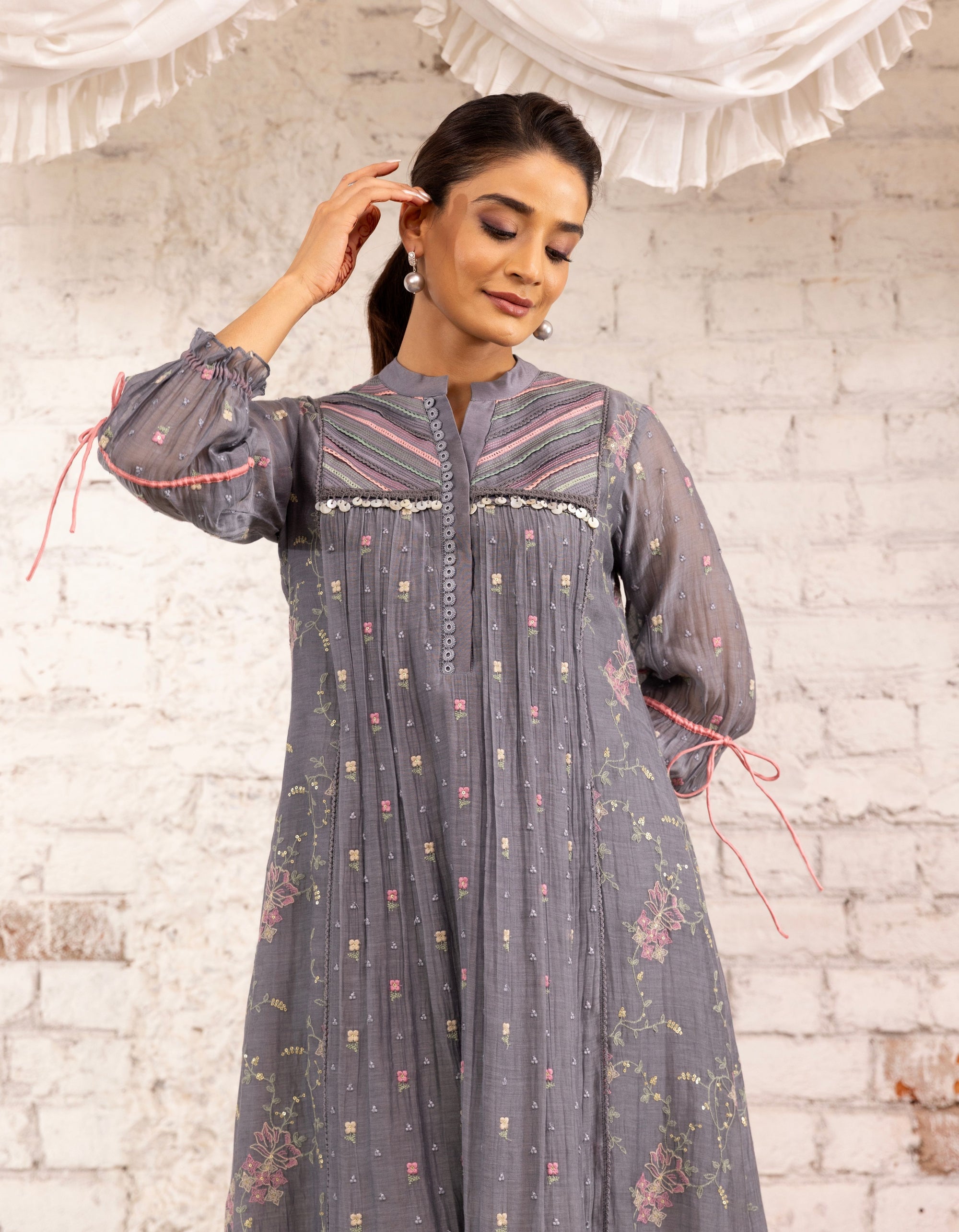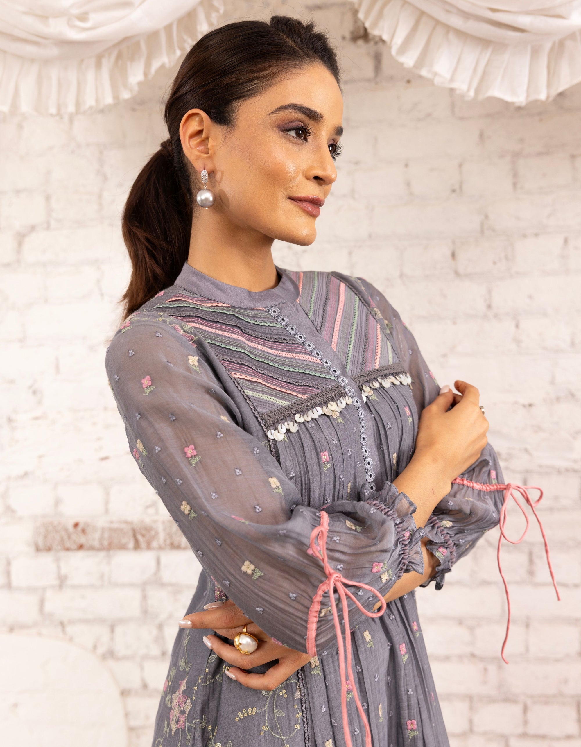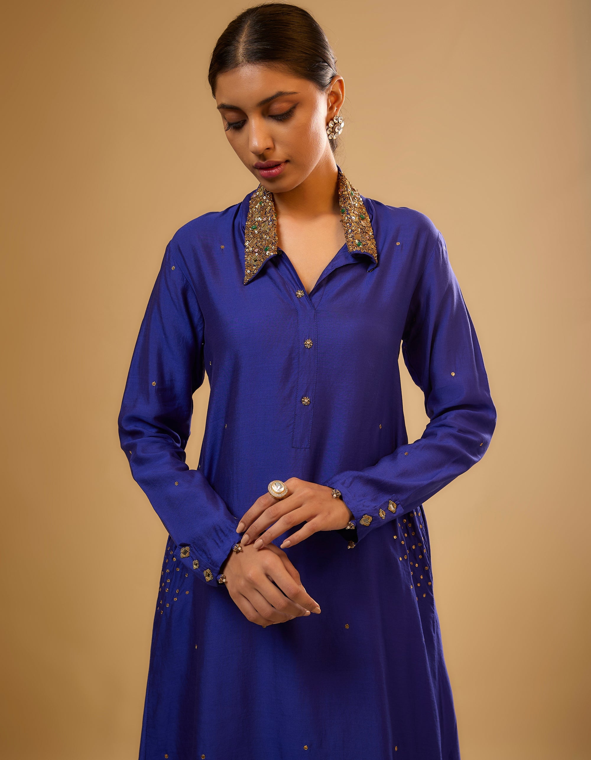 English Blue Threadwork Short Yoke Noor Kurta Set