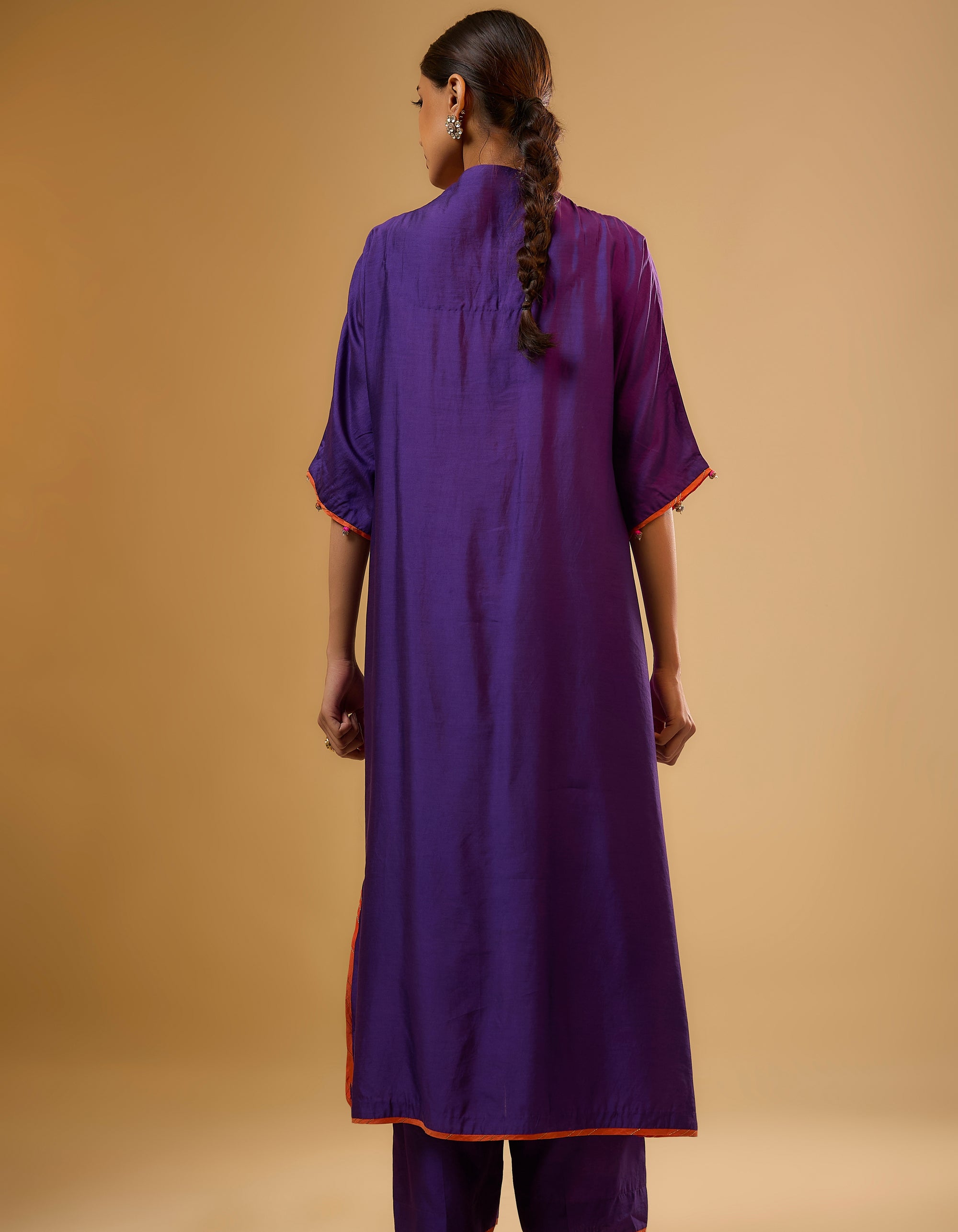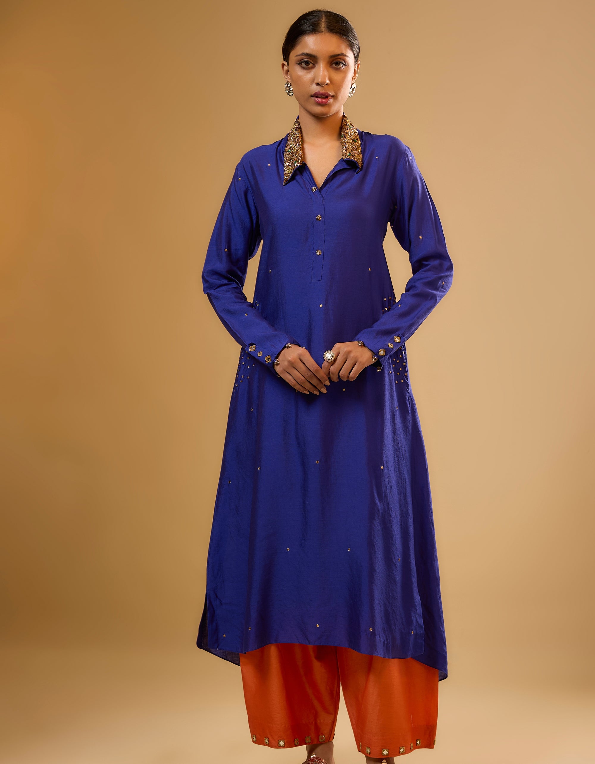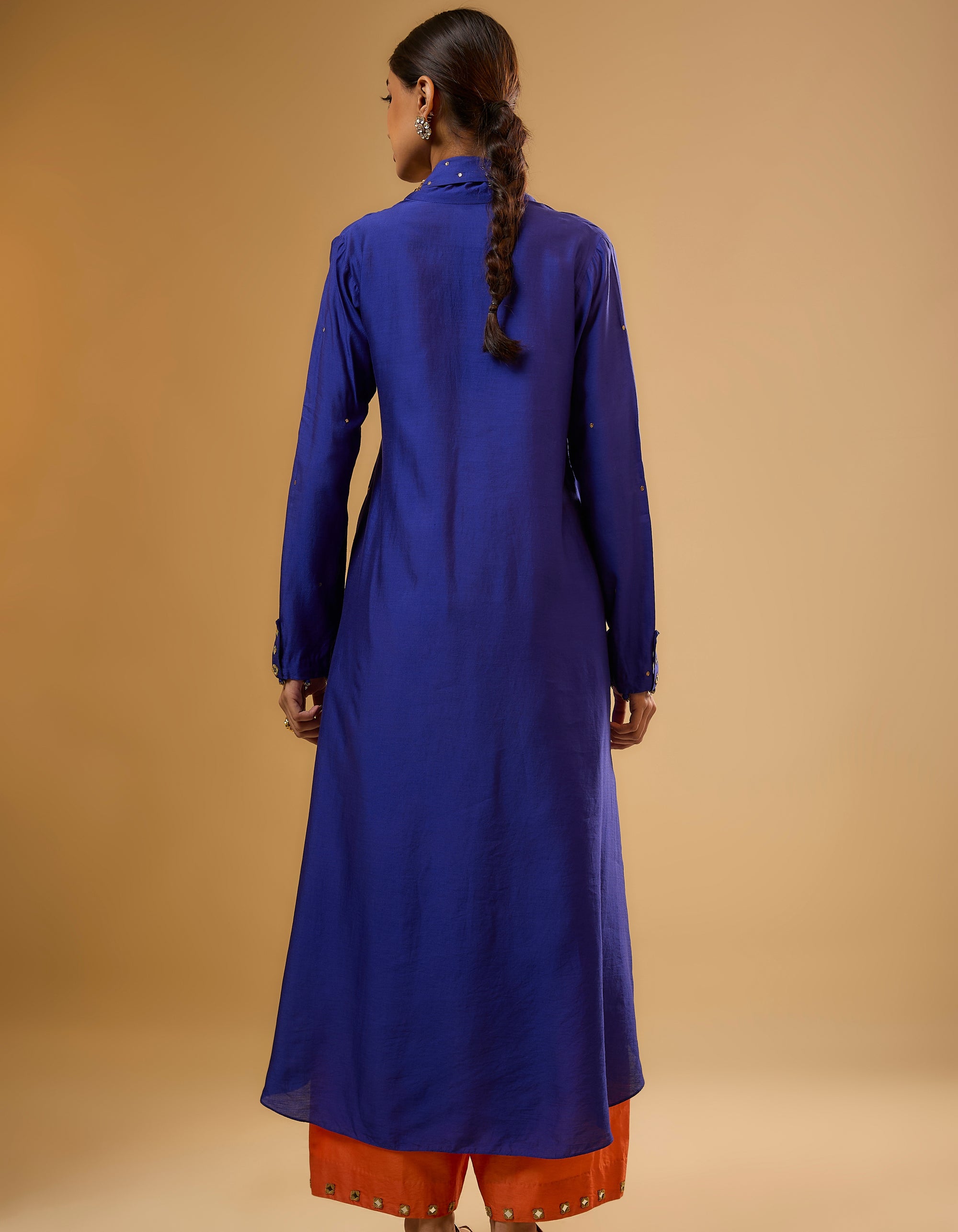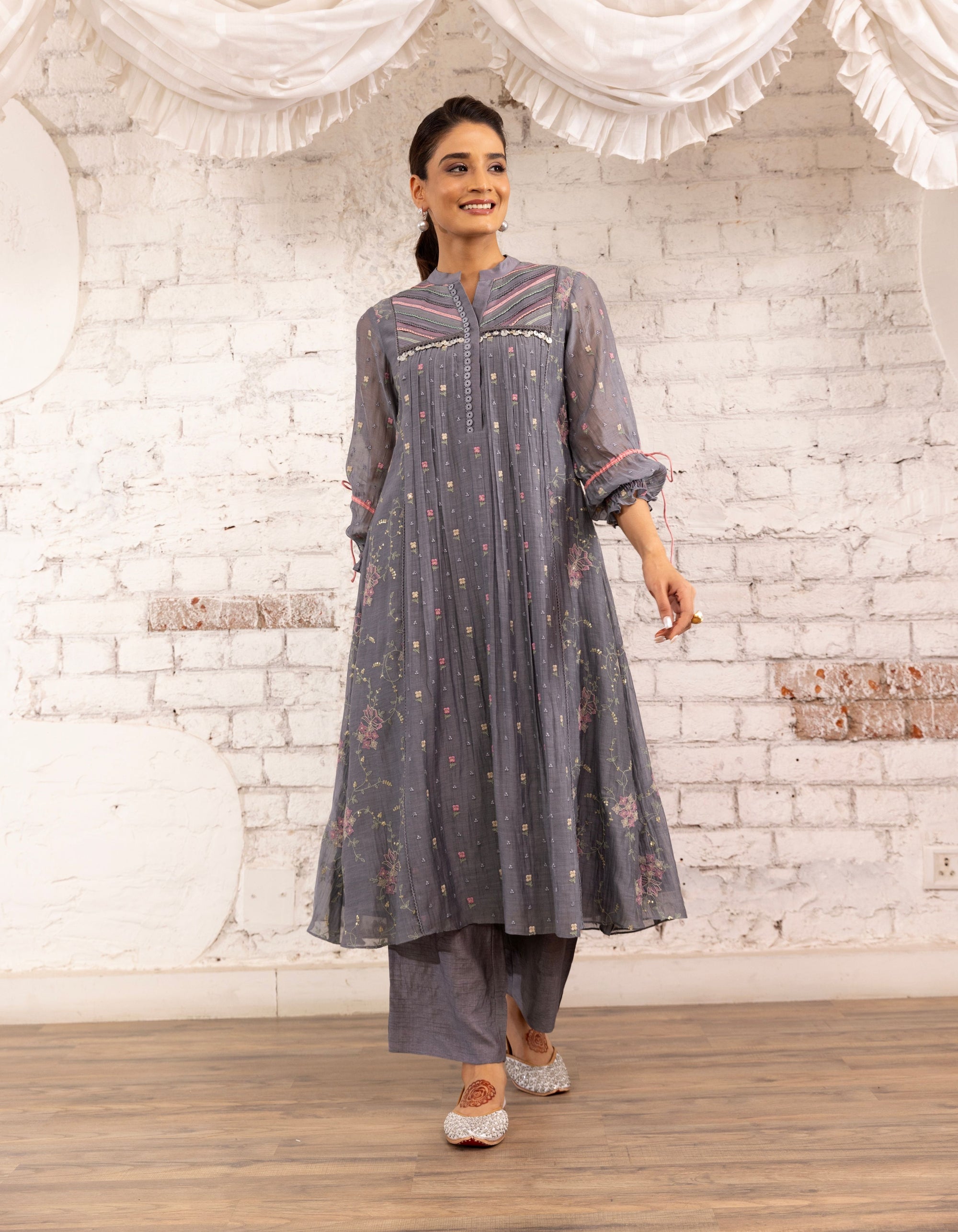 English Blue Threadwork Short Yoke Noor Kurta Set