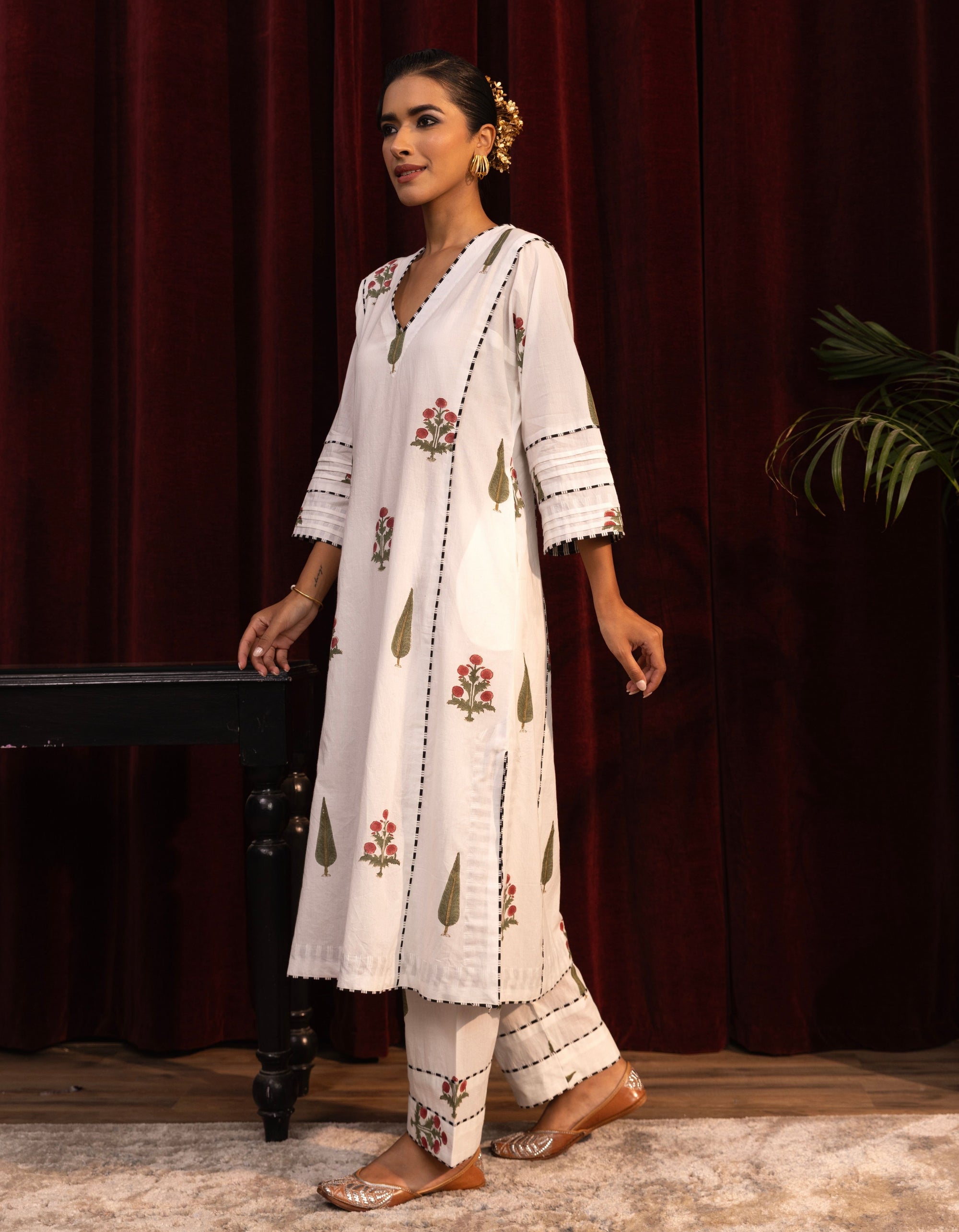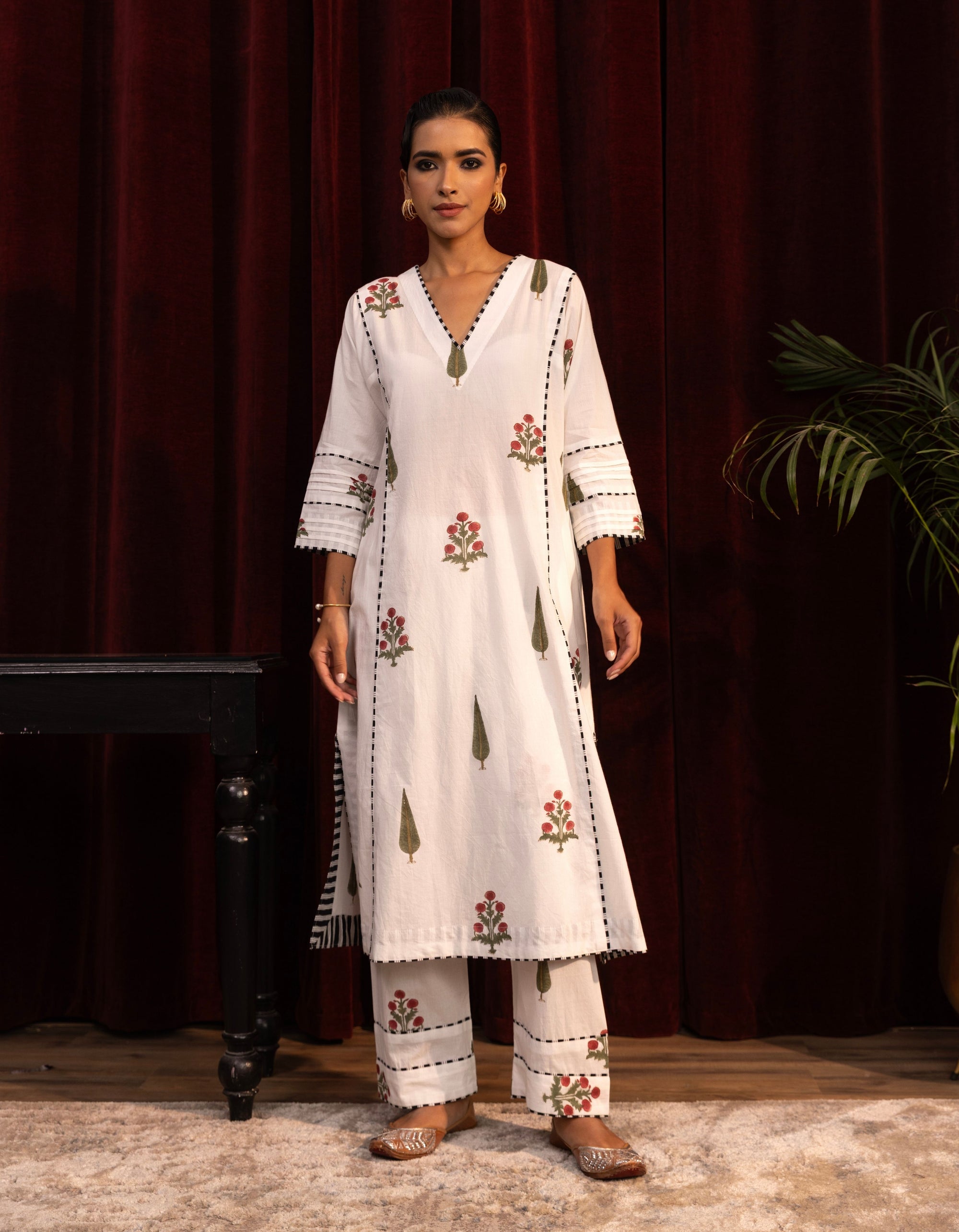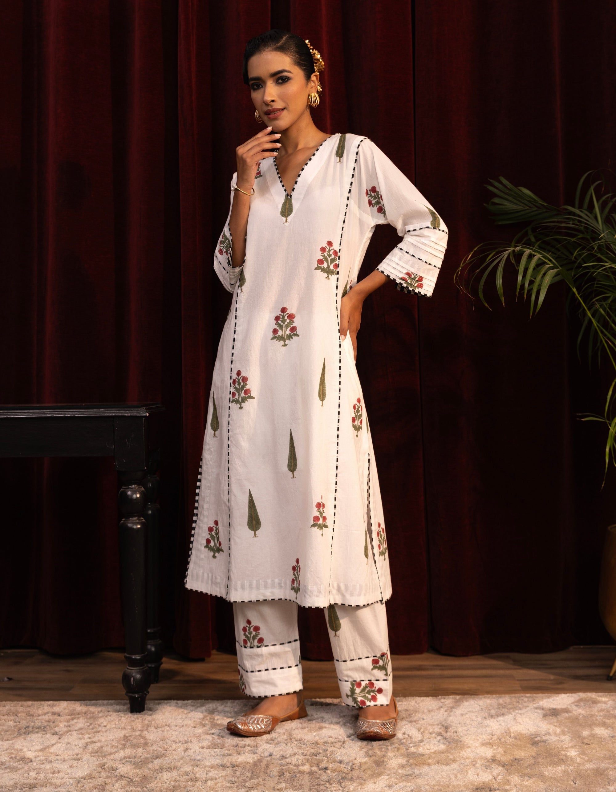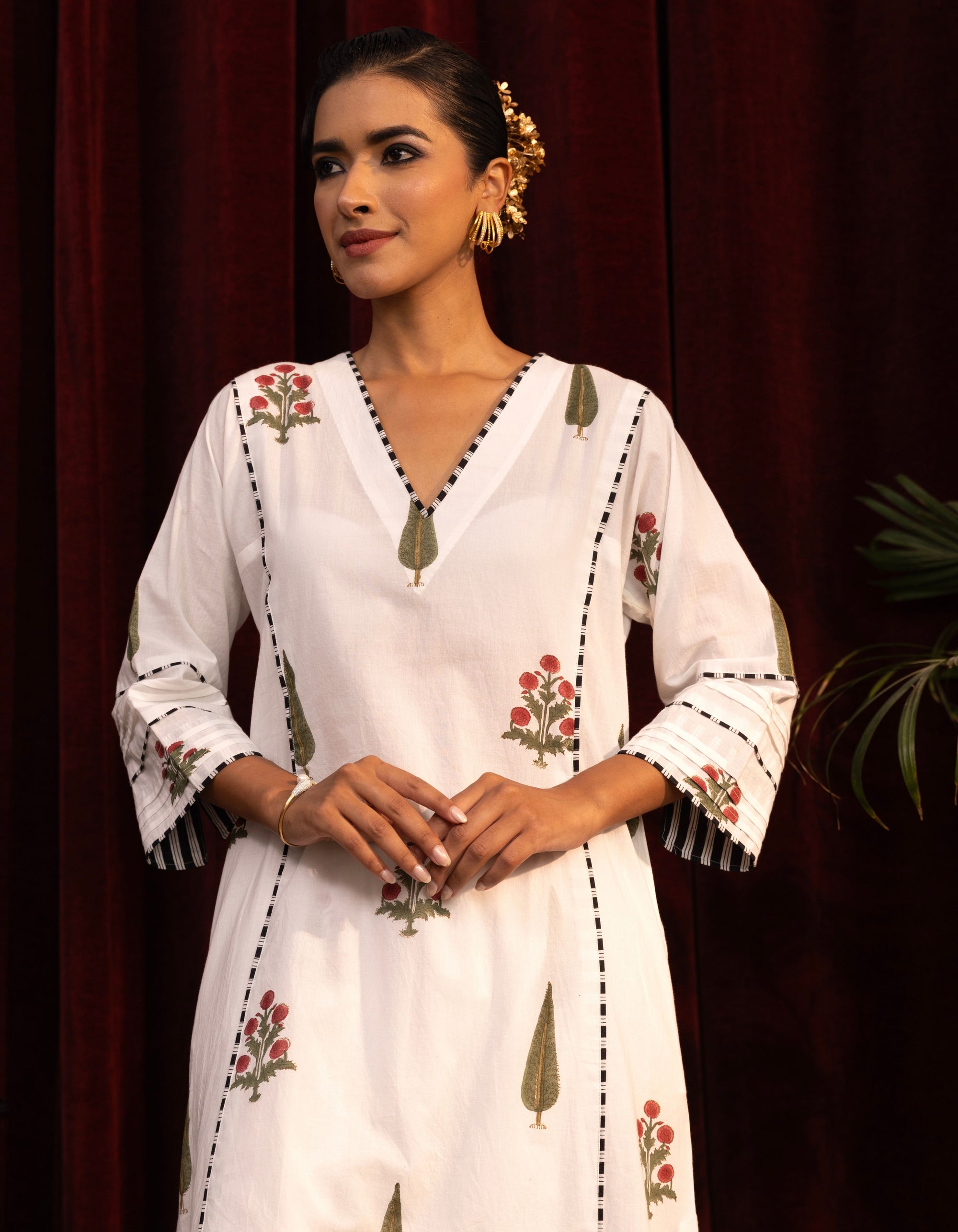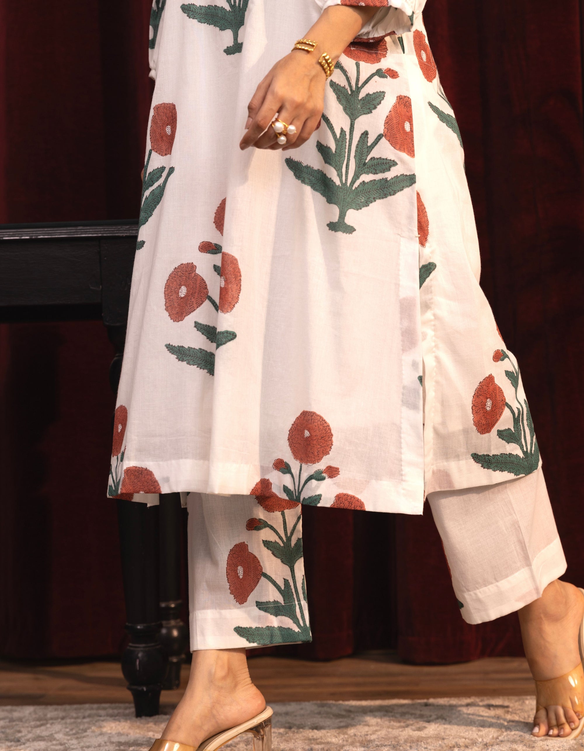 White Cypress Leaf and Poppy Print Mogra Kurta Set