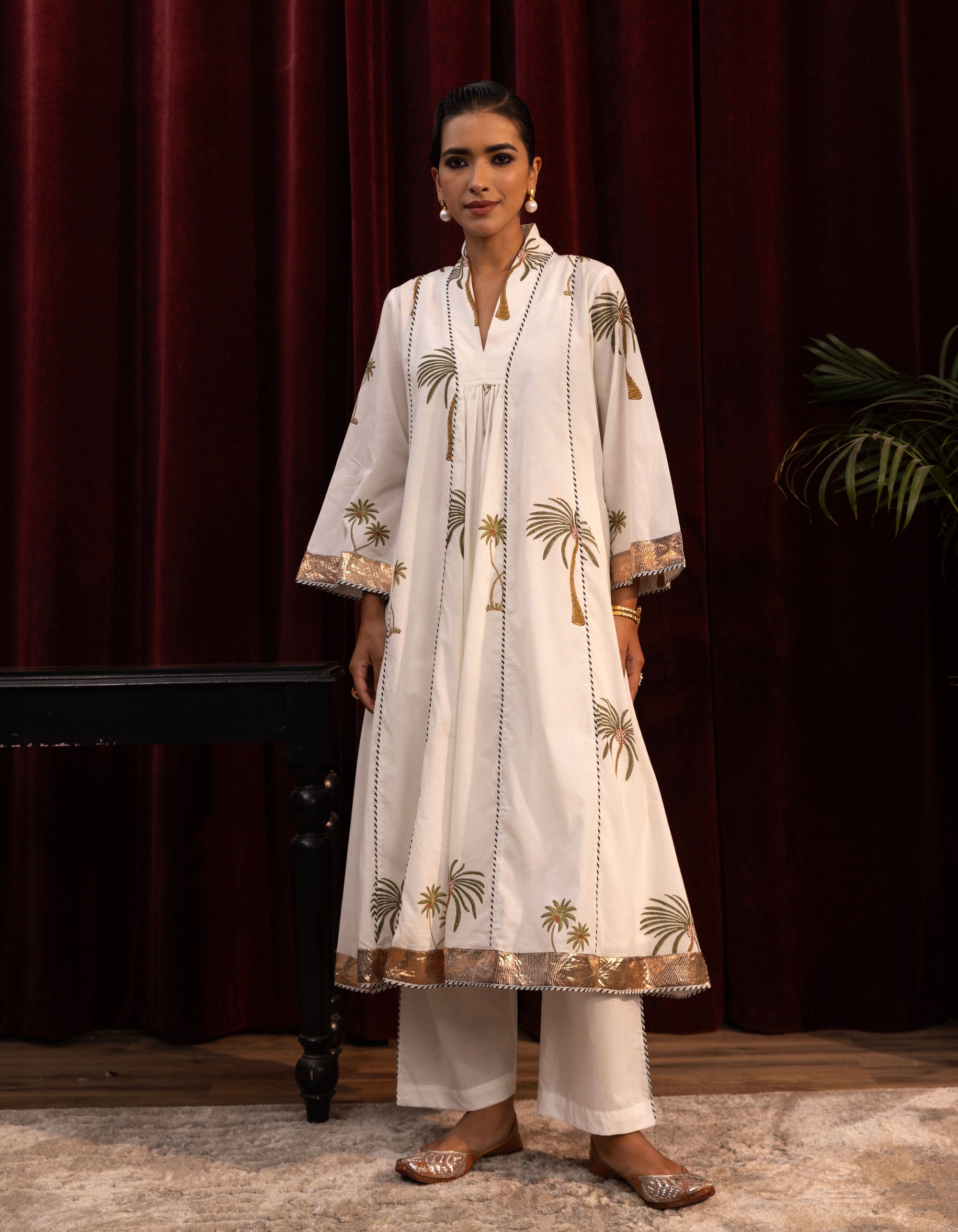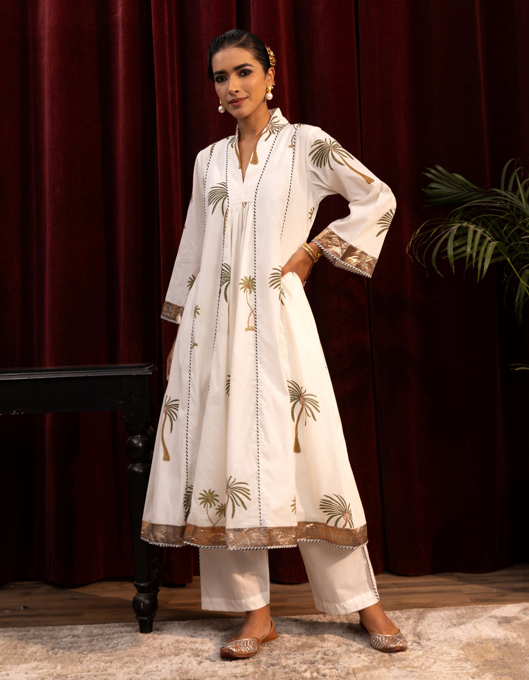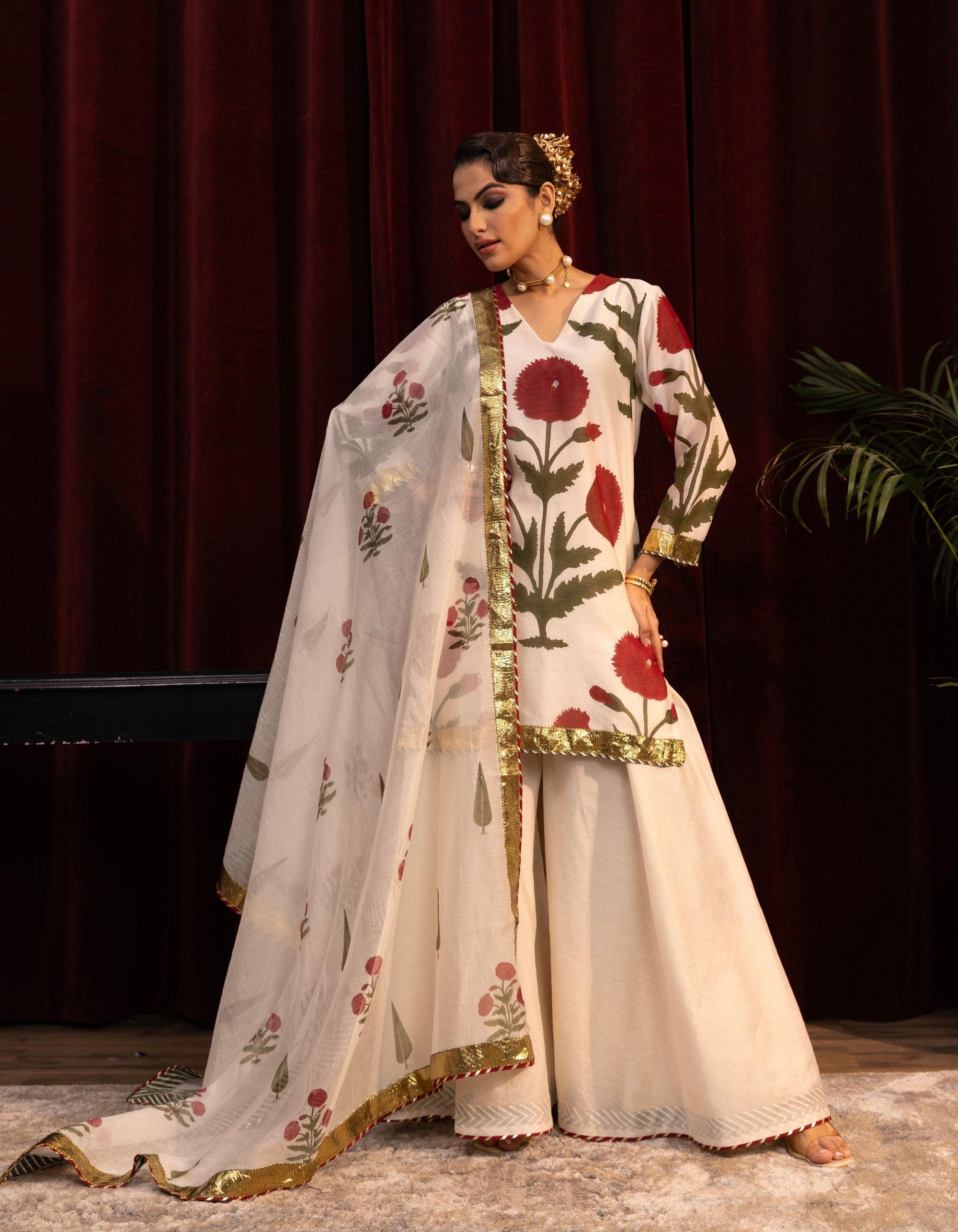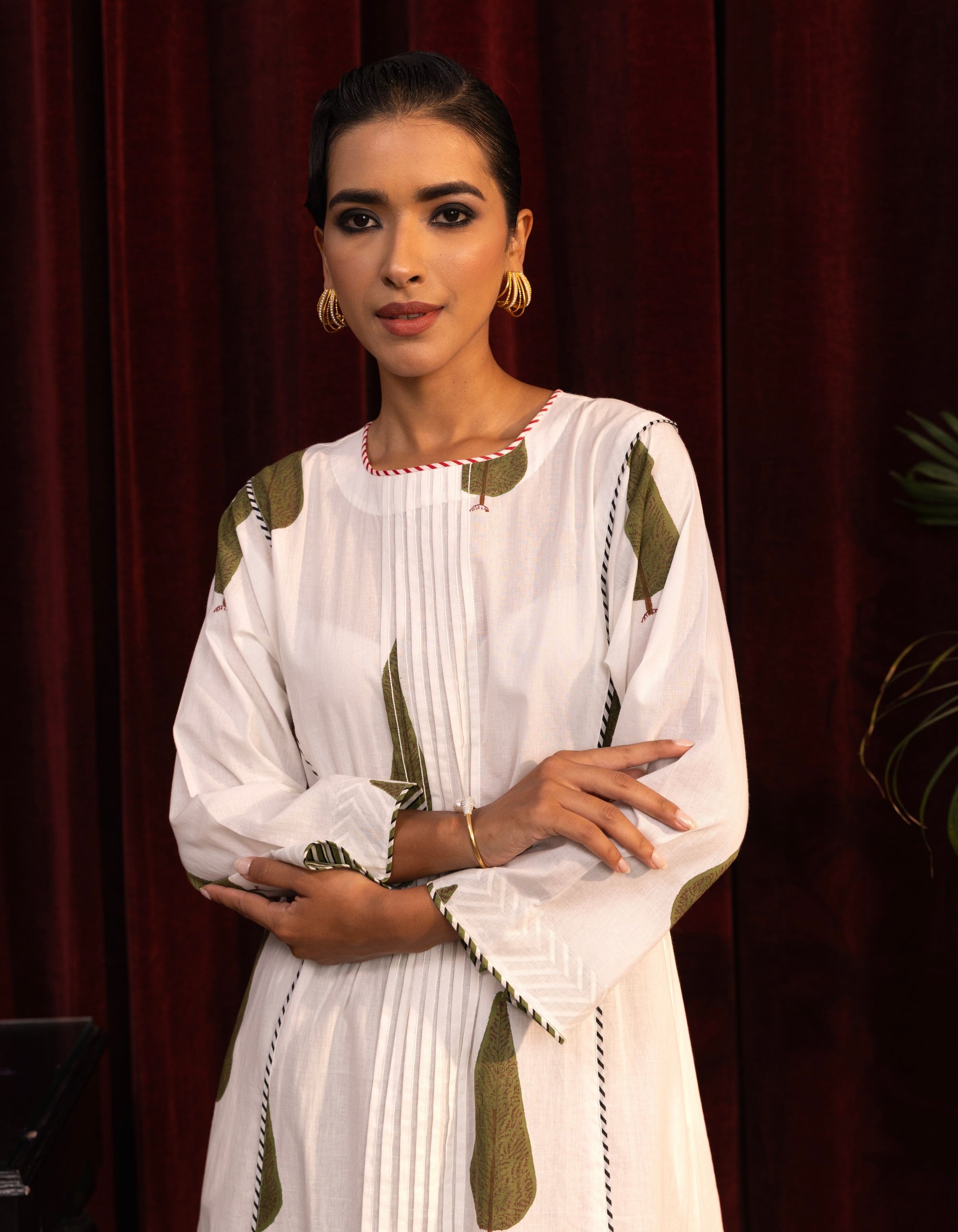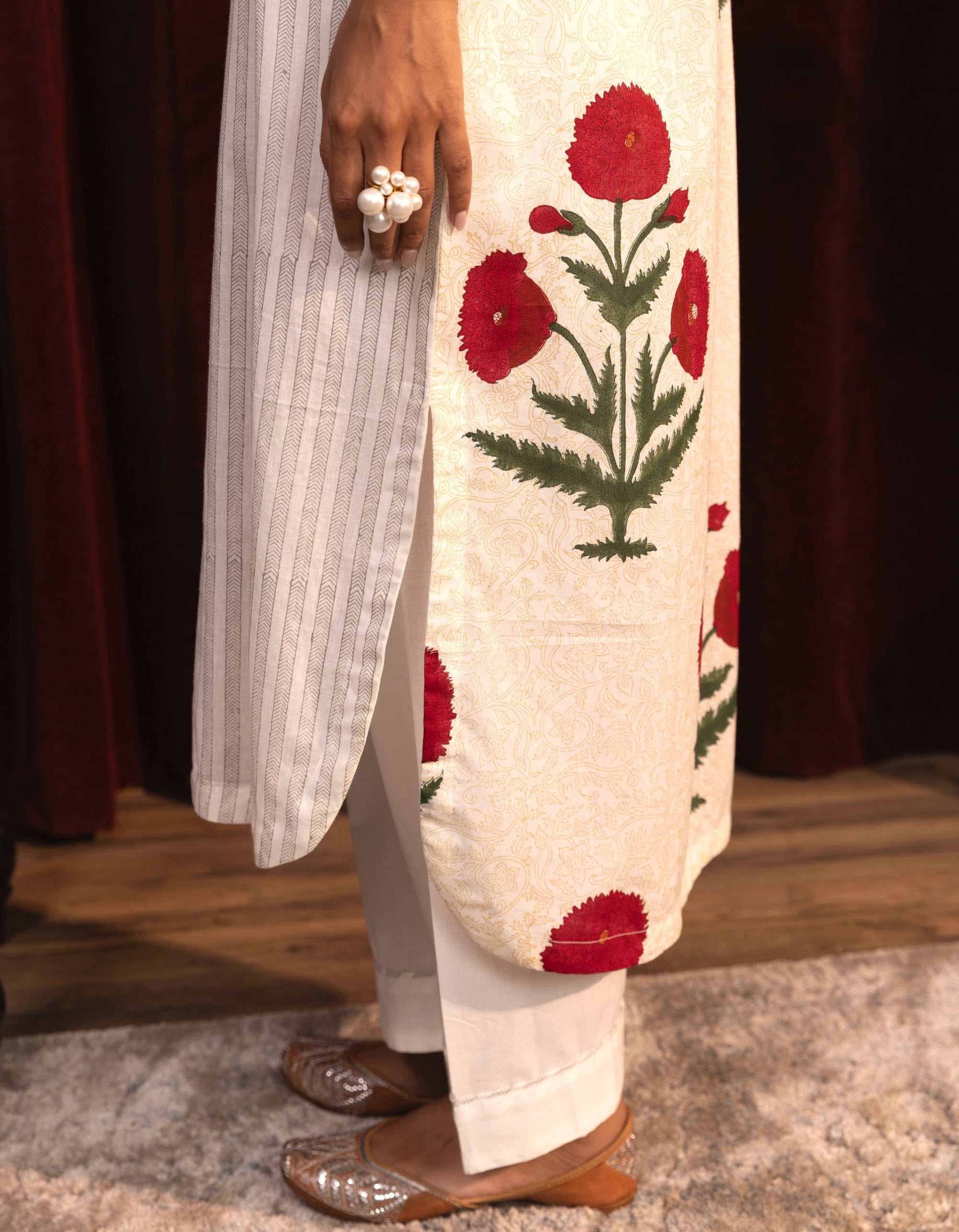 White Cypress Leaf and Poppy Print Mogra Kurta Set