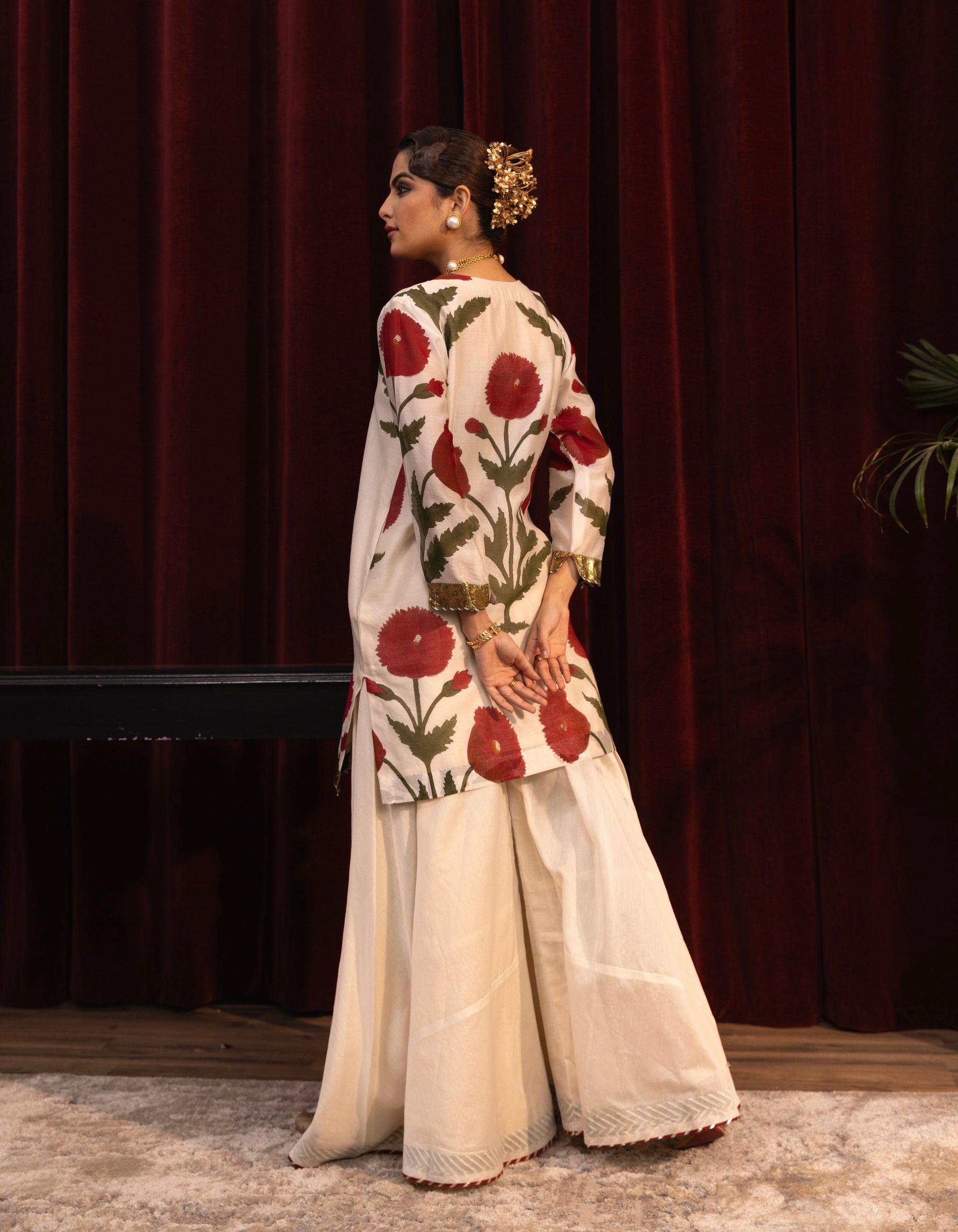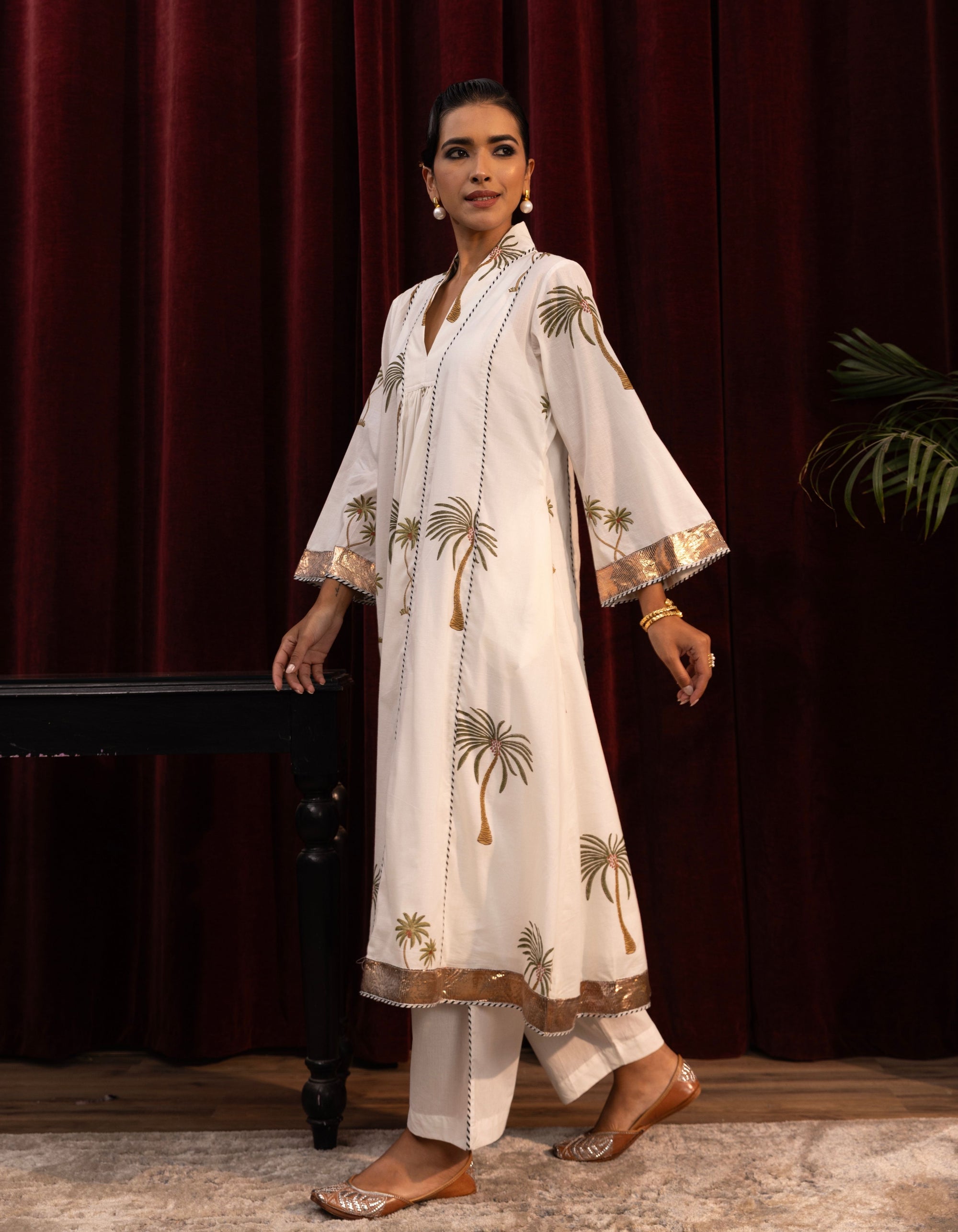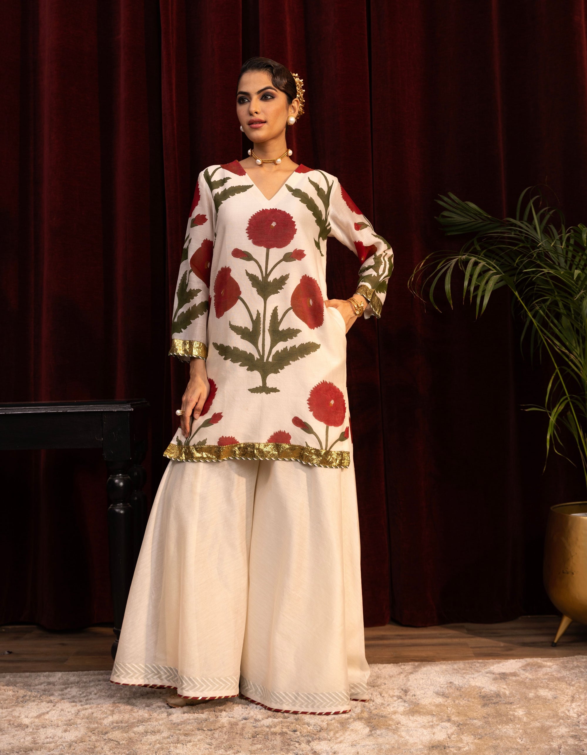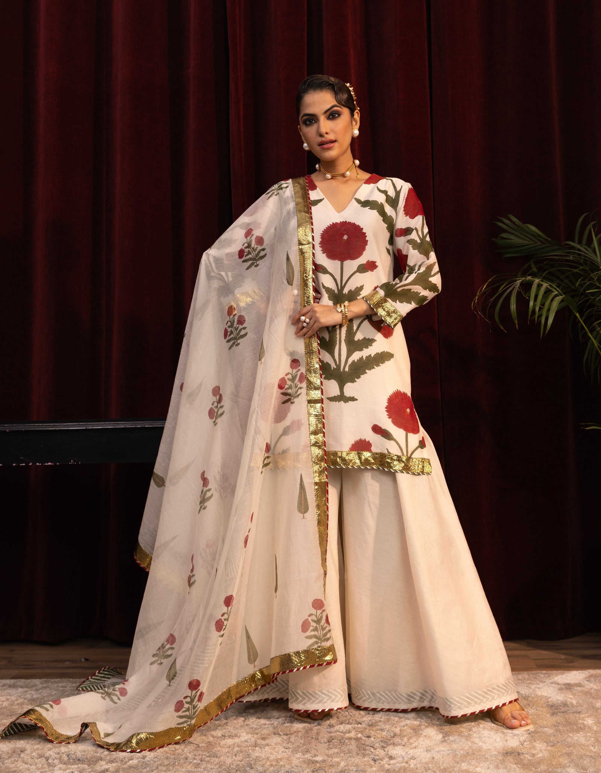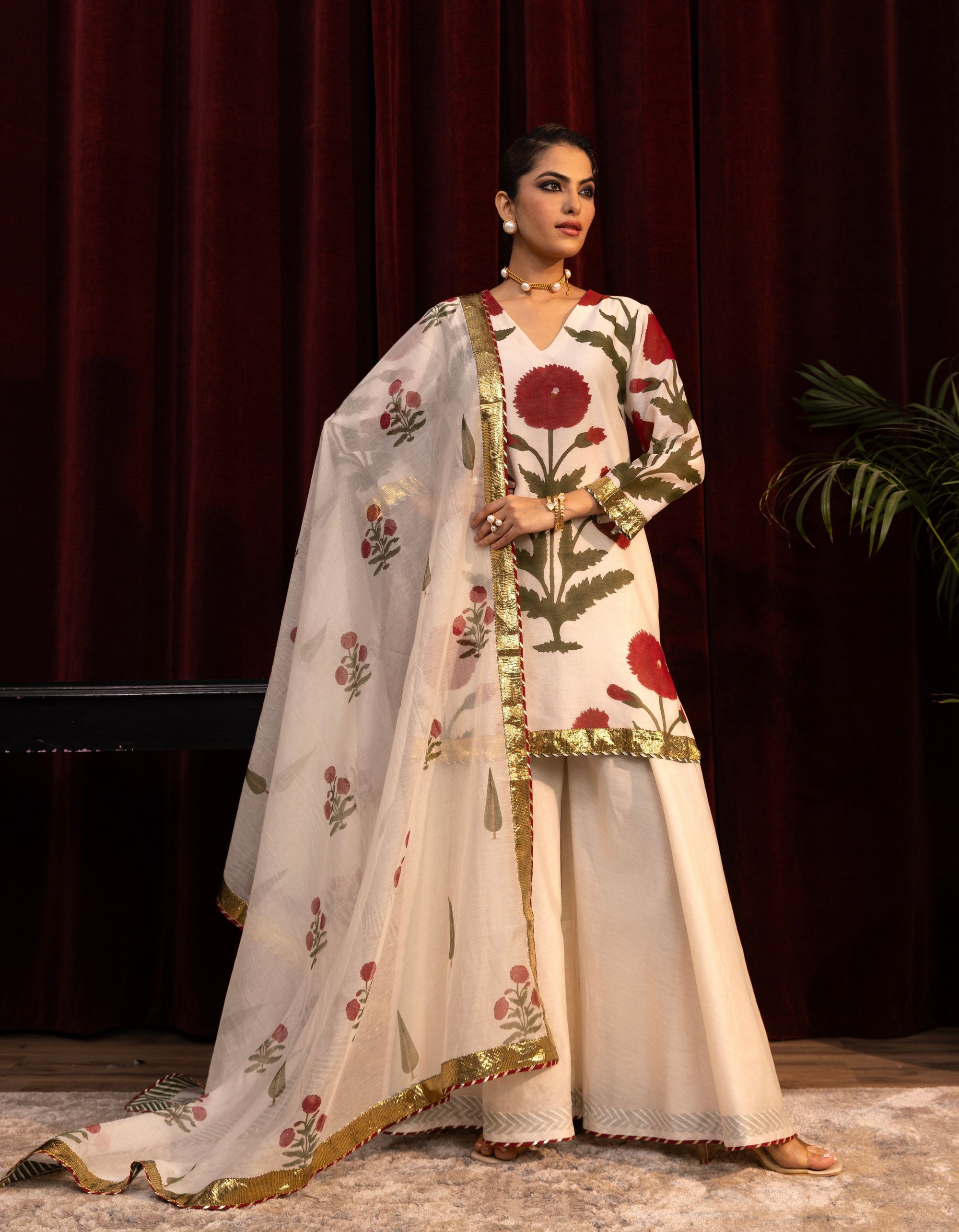 White Cypress Leaf and Poppy Print Mogra Kurta Set