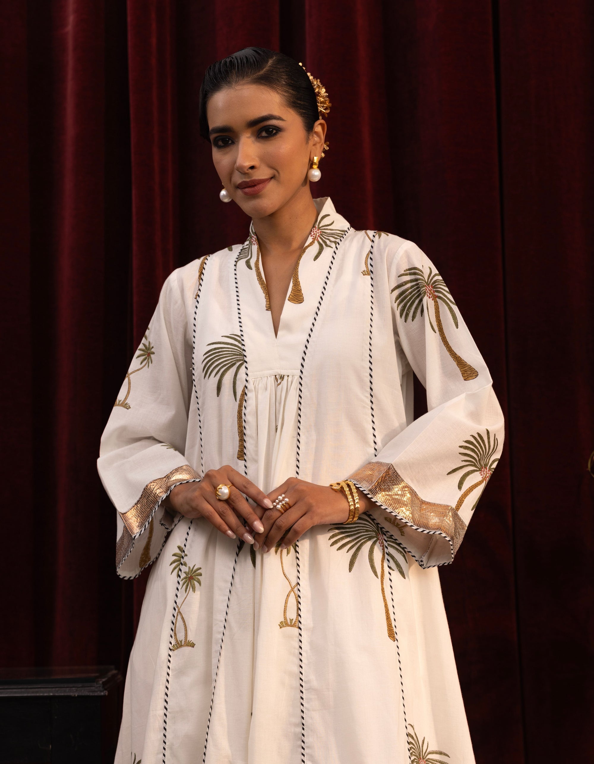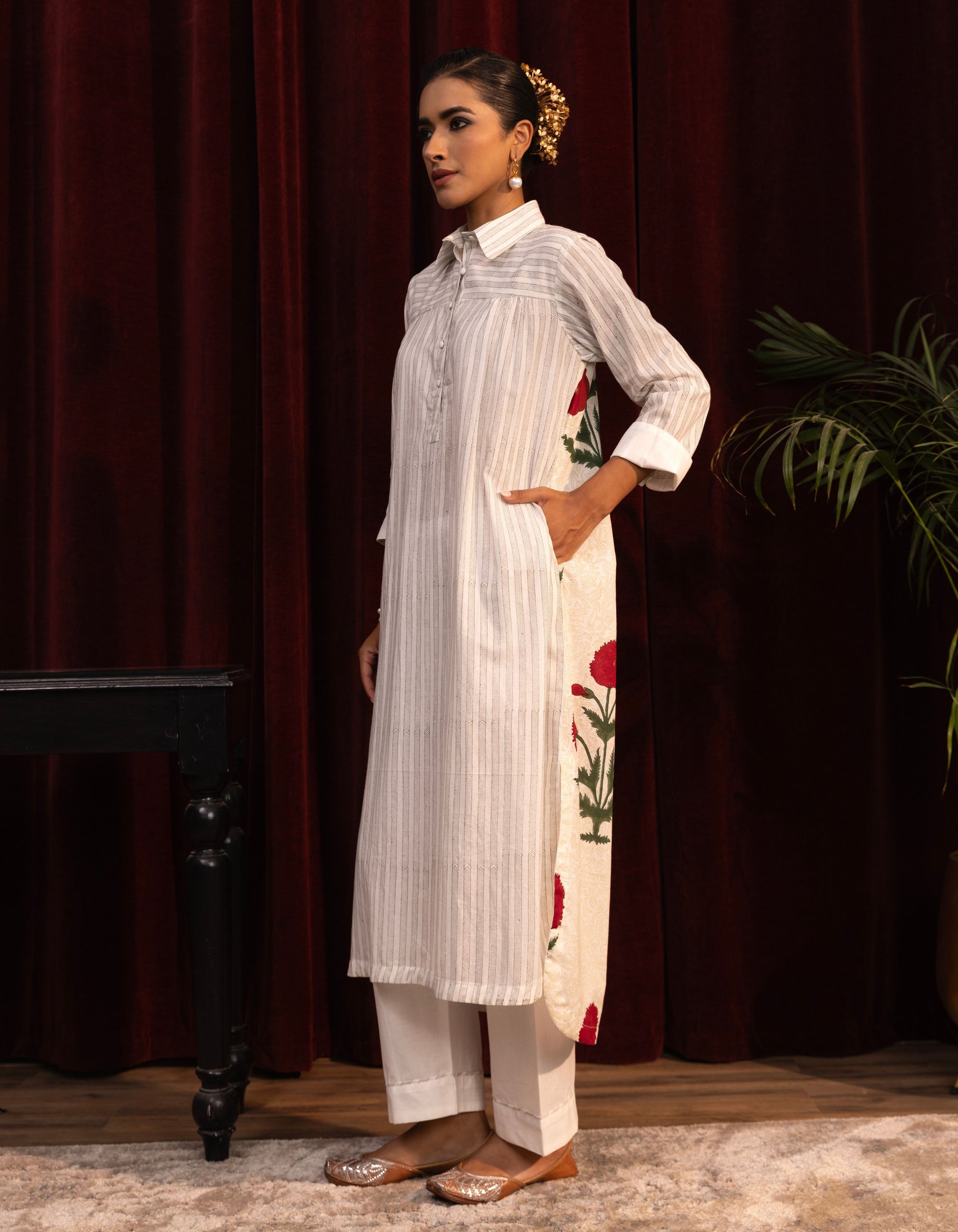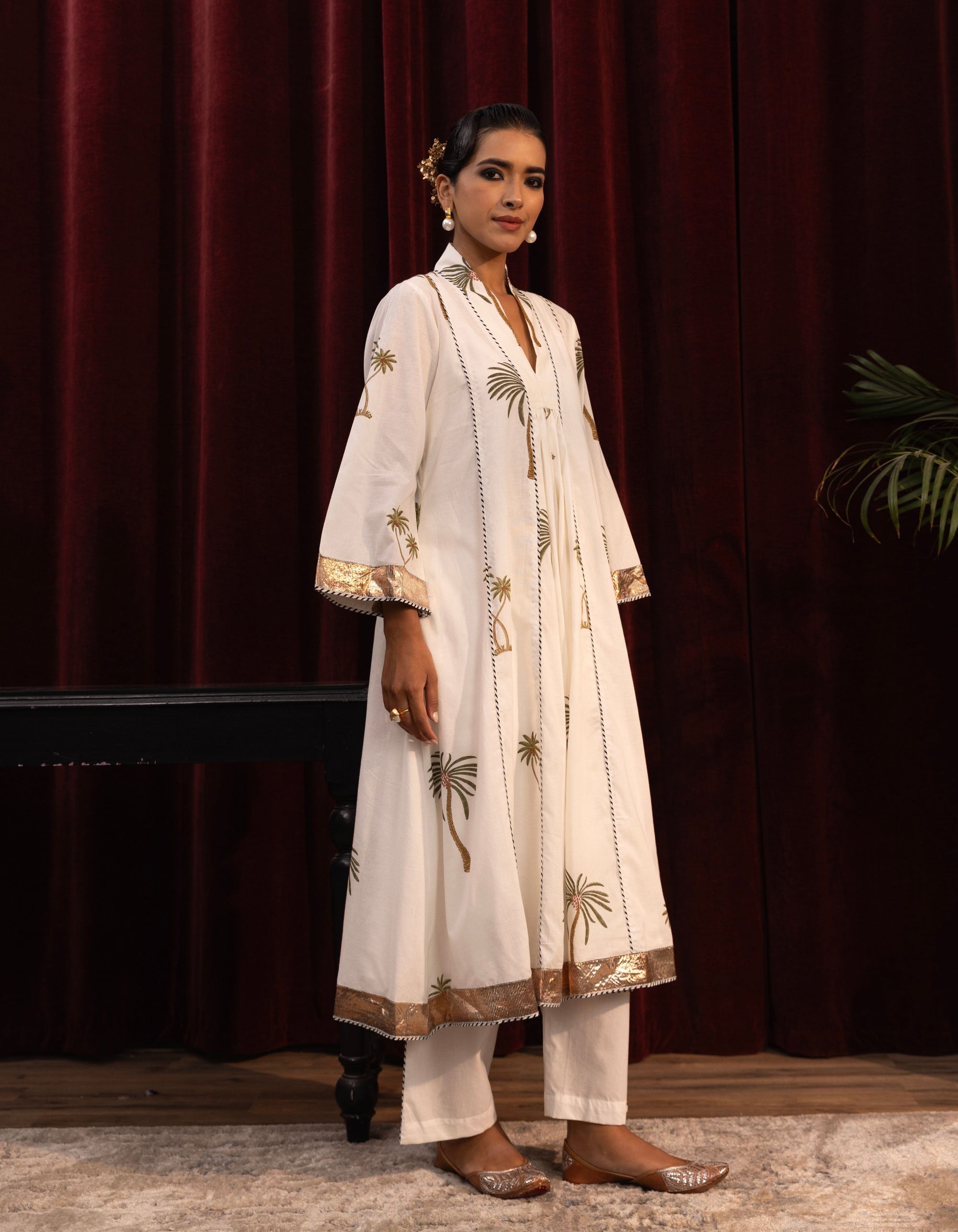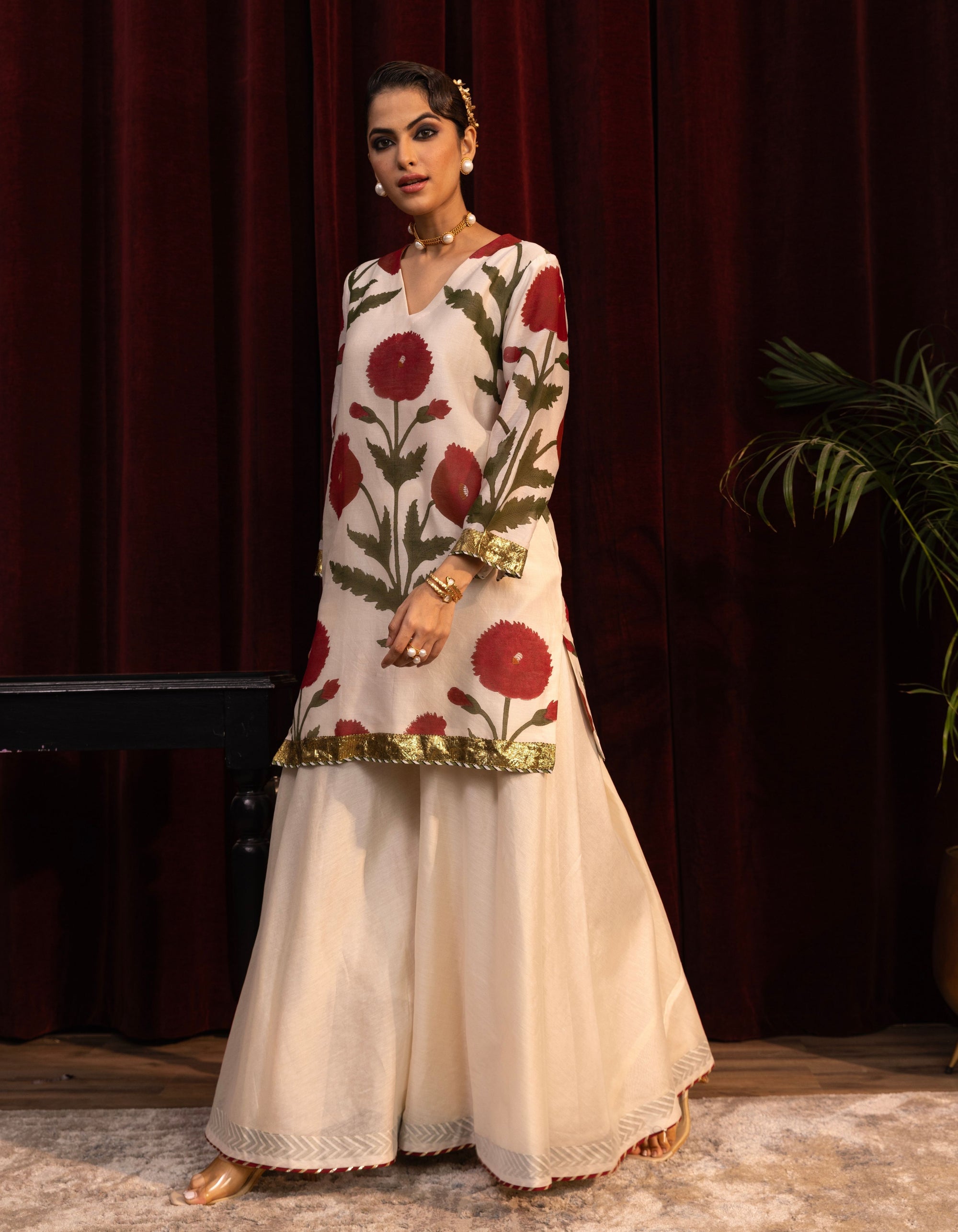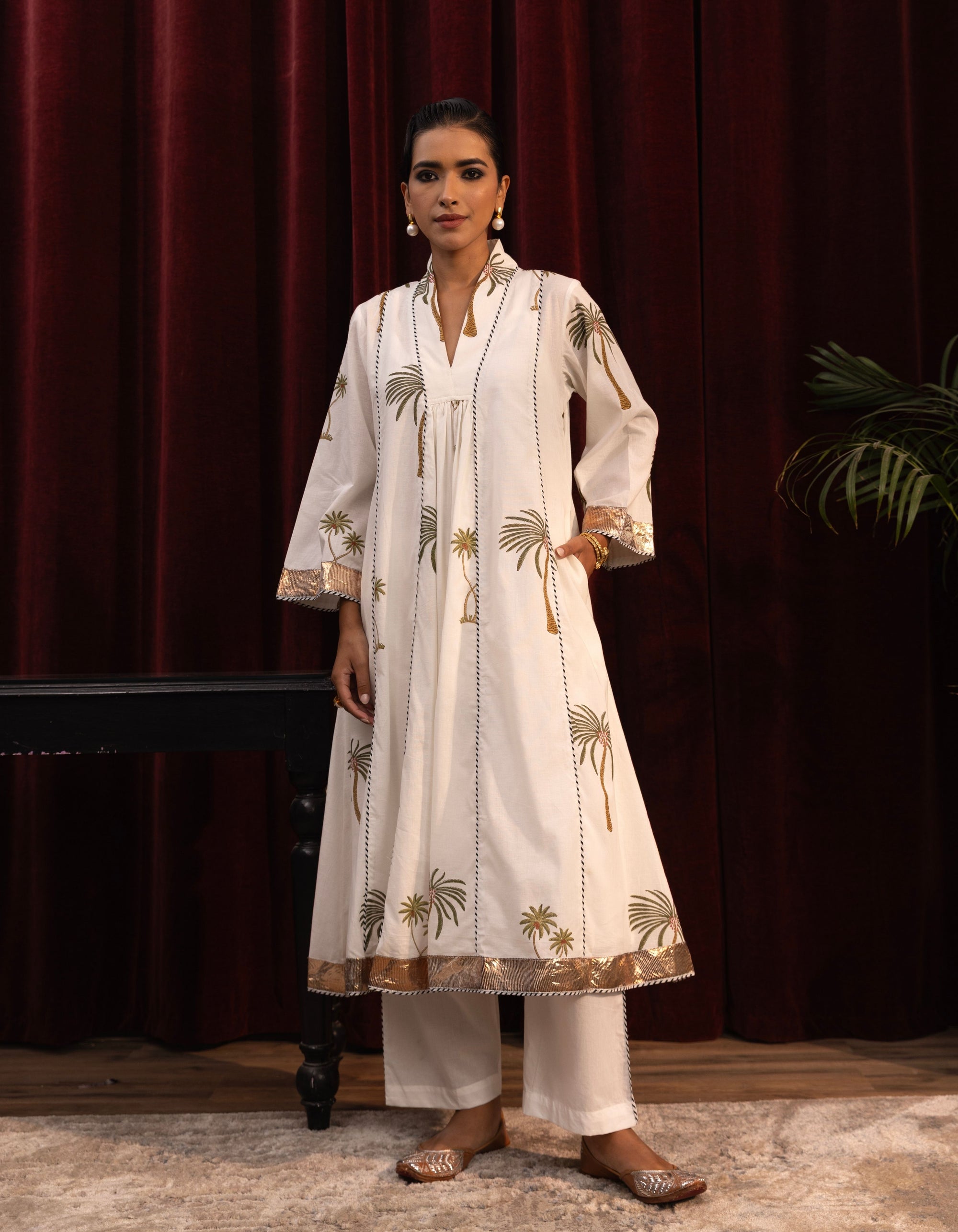 White Cypress Leaf and Poppy Print Mogra Kurta Set