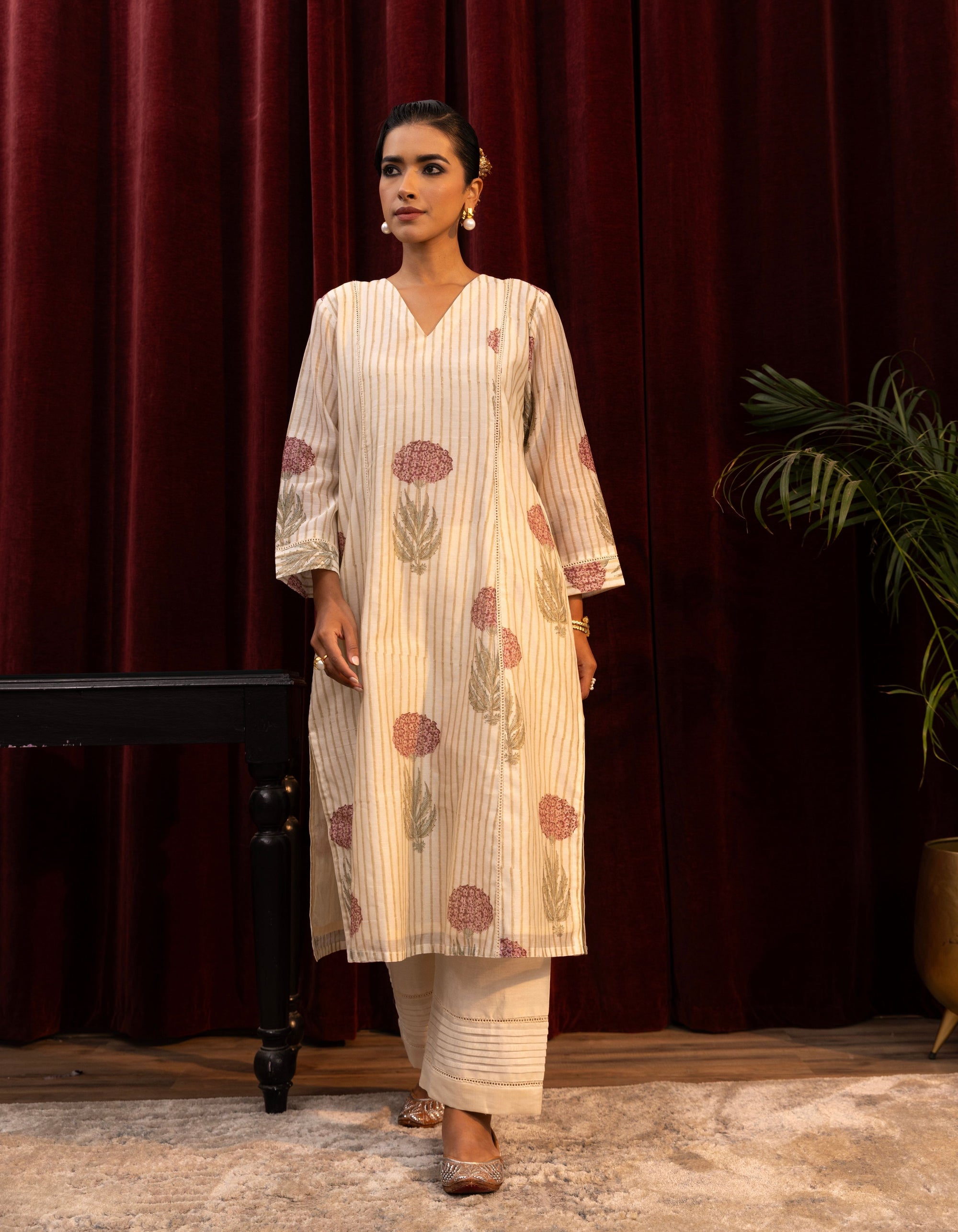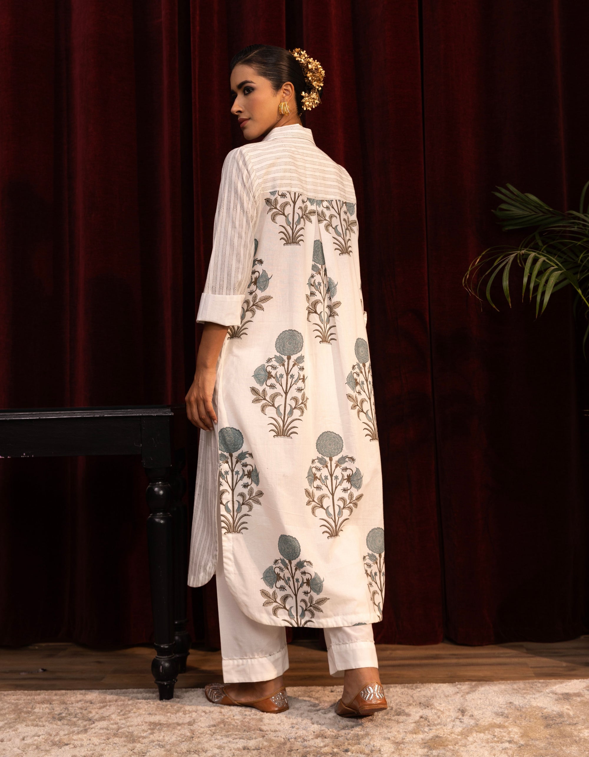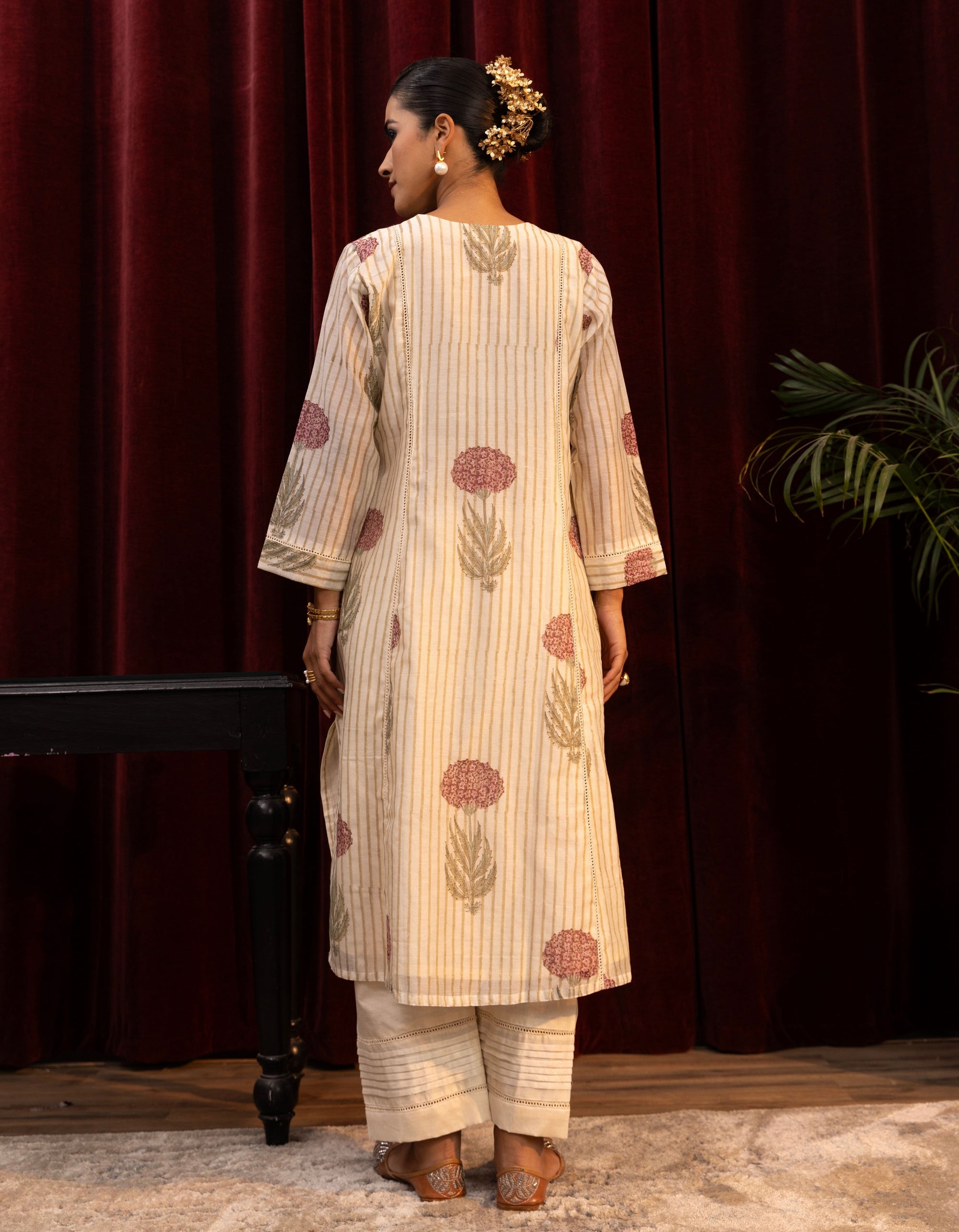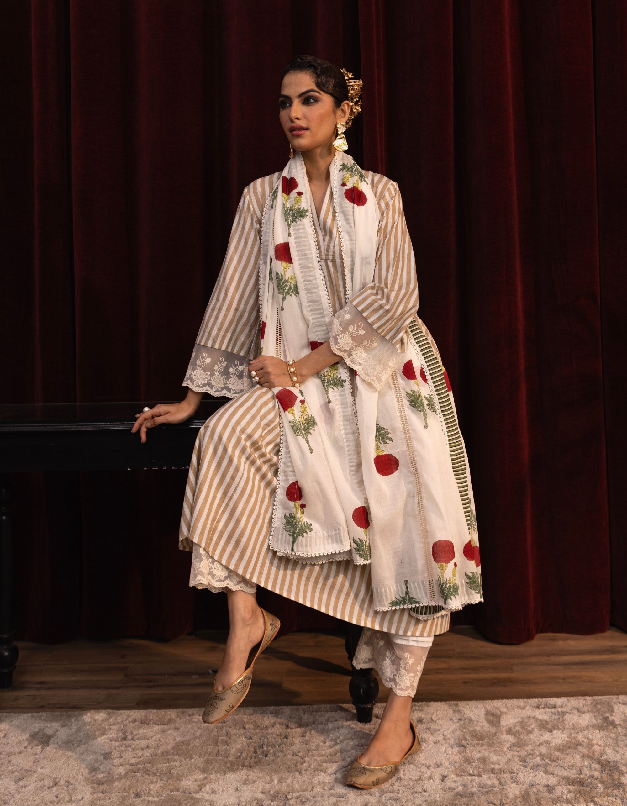 Ivory Stripes Block Print A-line Mogra Kurta Set
