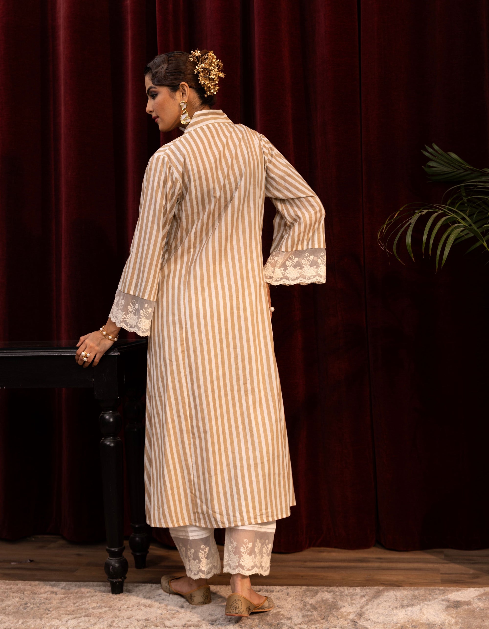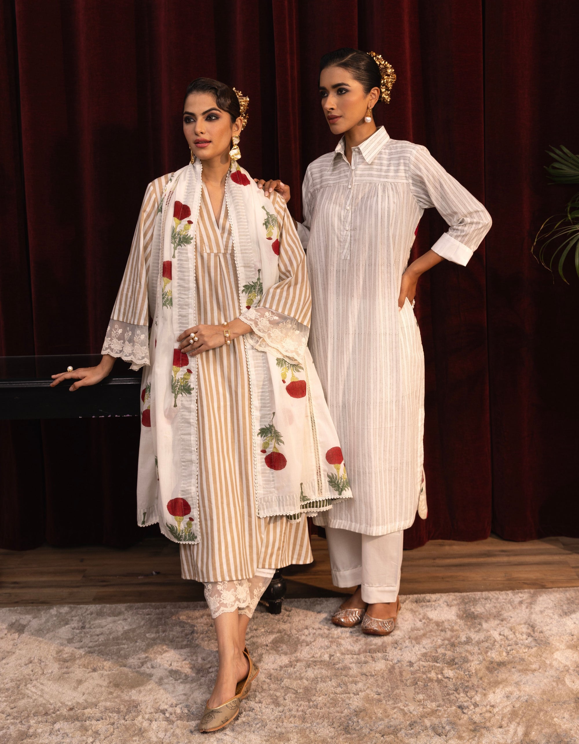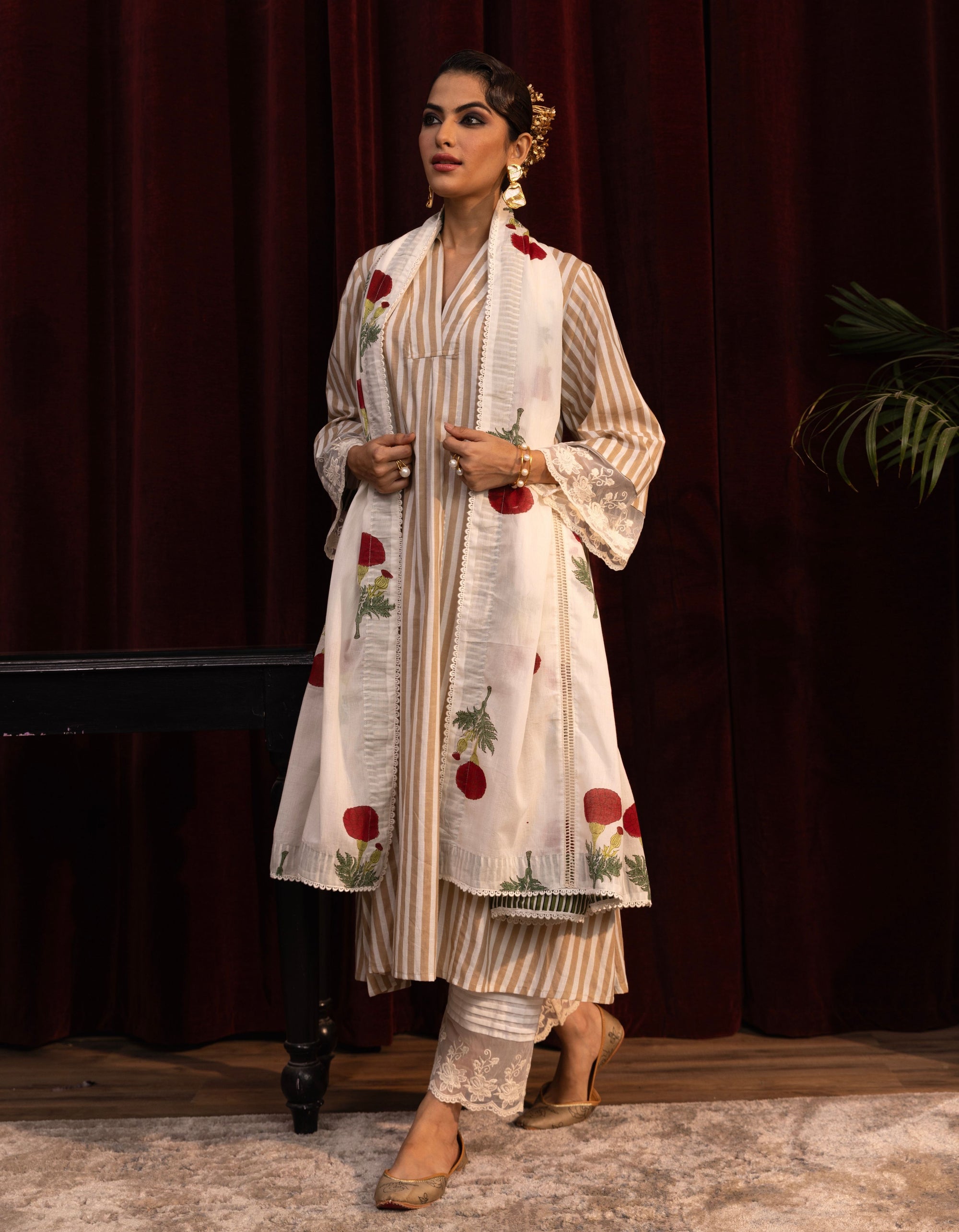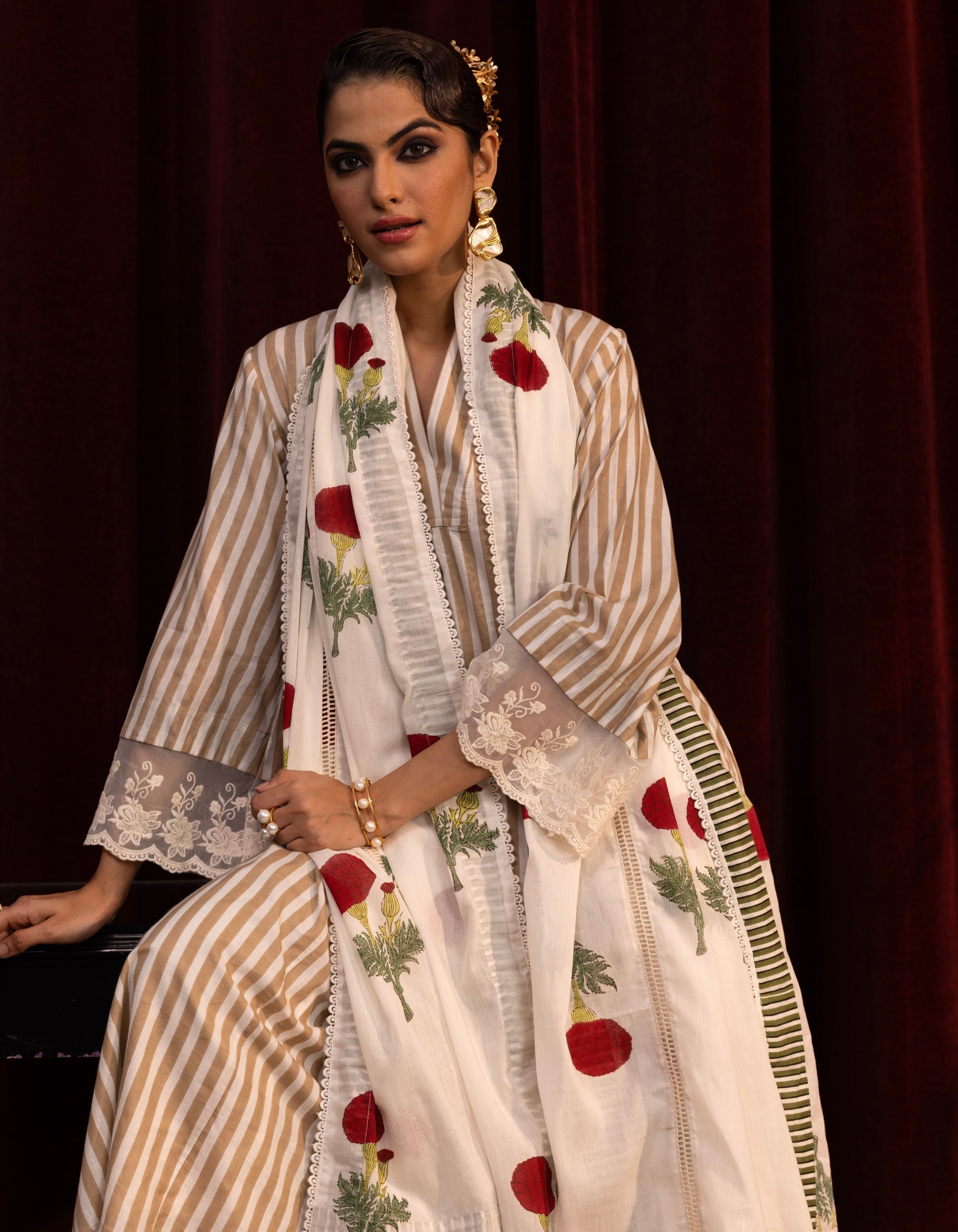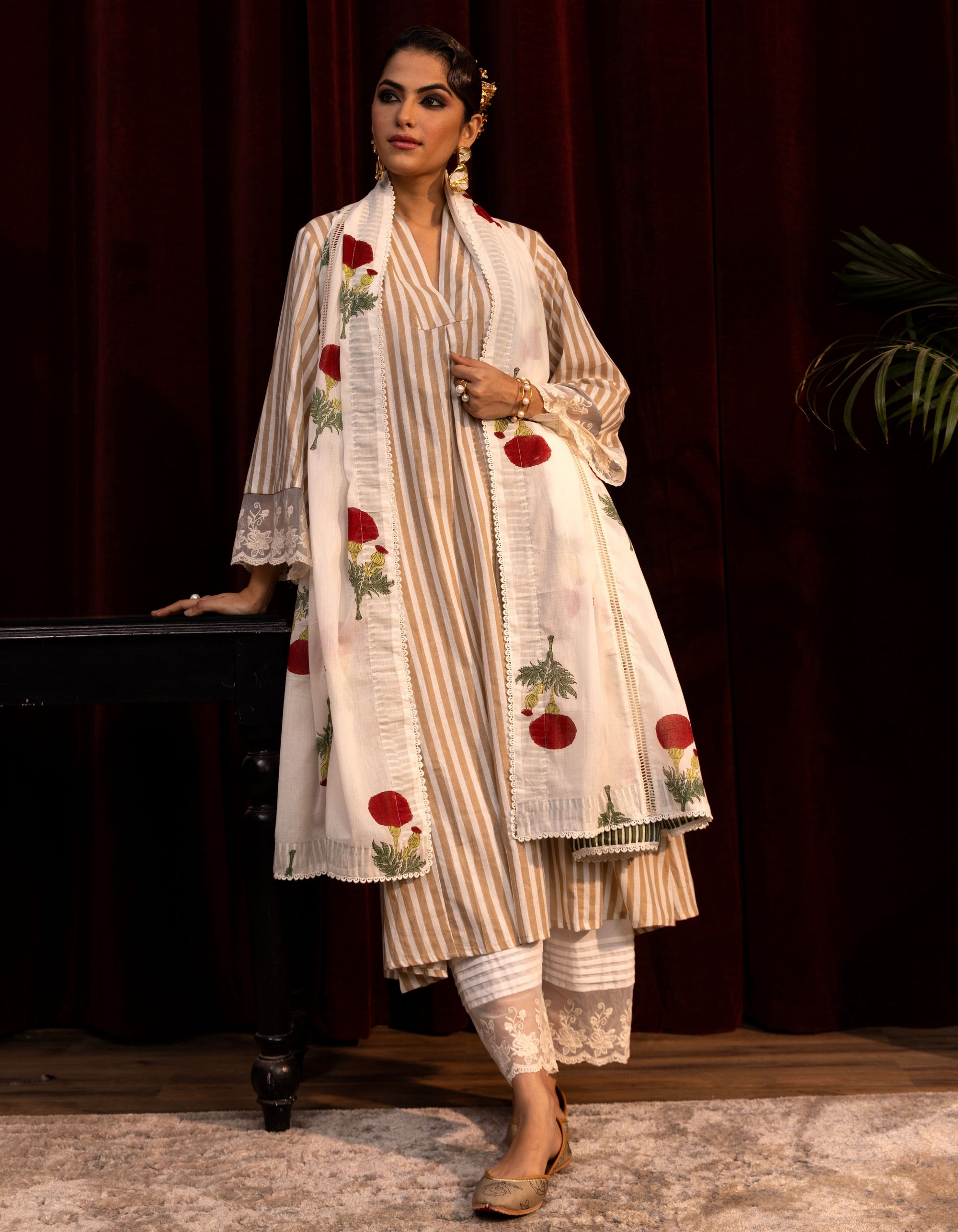 Ivory Stripes Block Print A-line Mogra Kurta Set