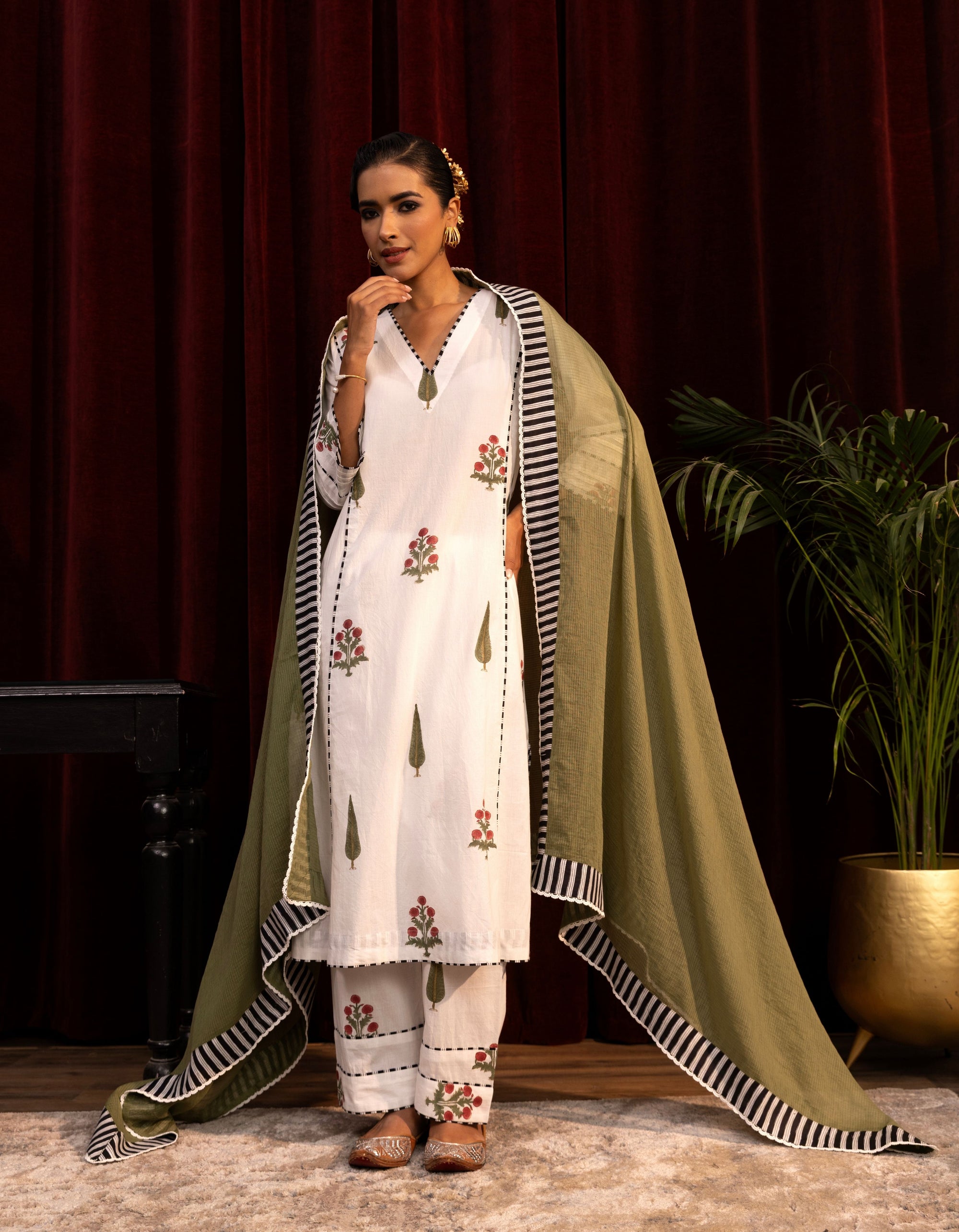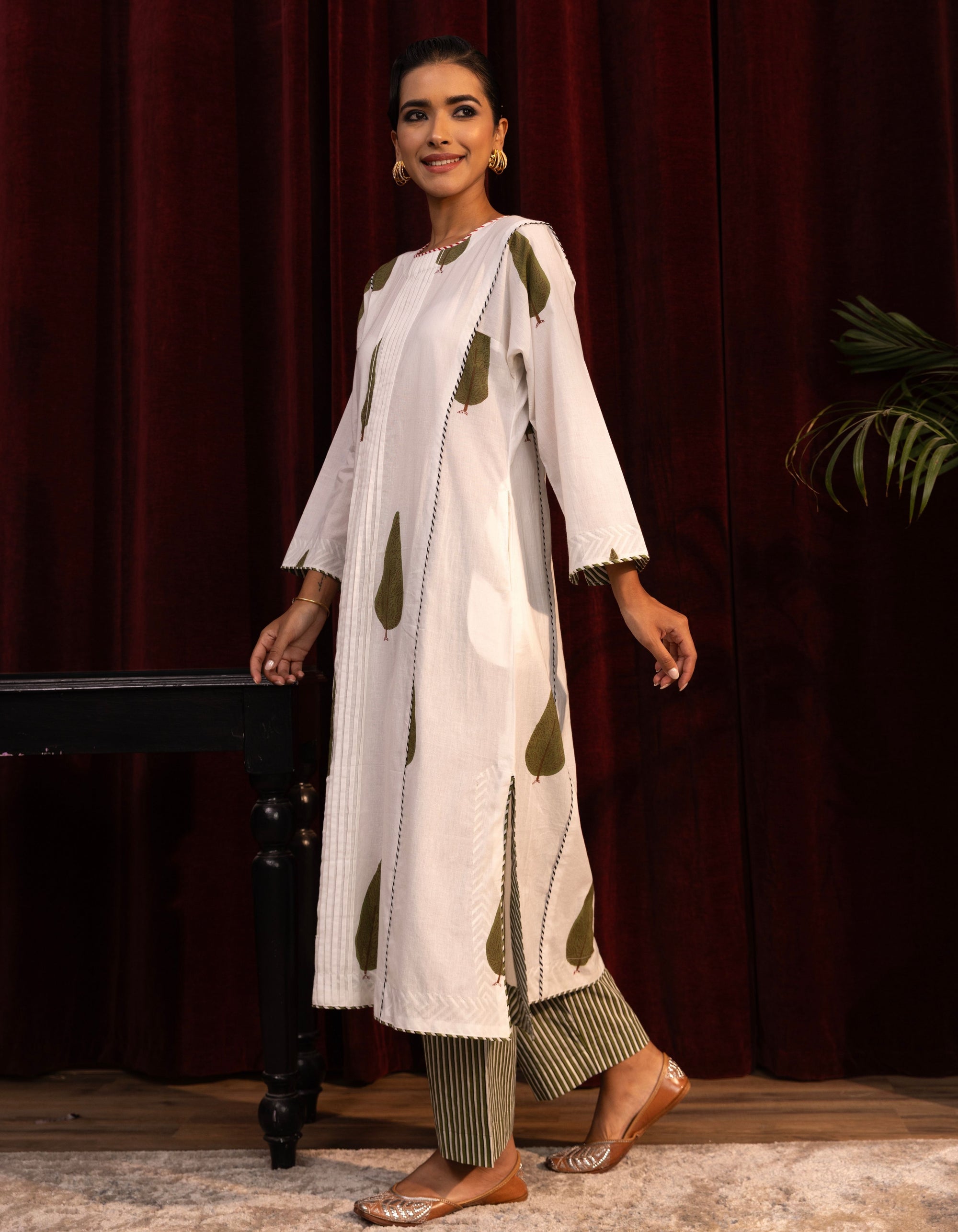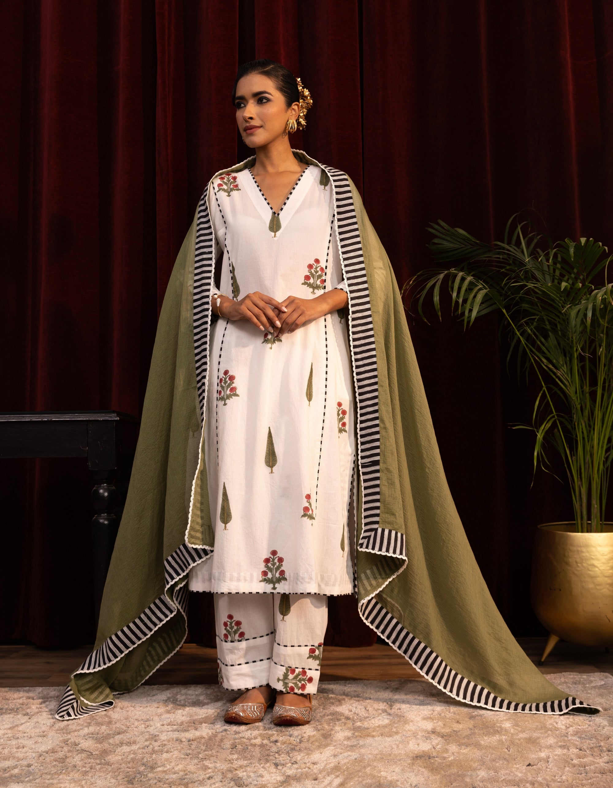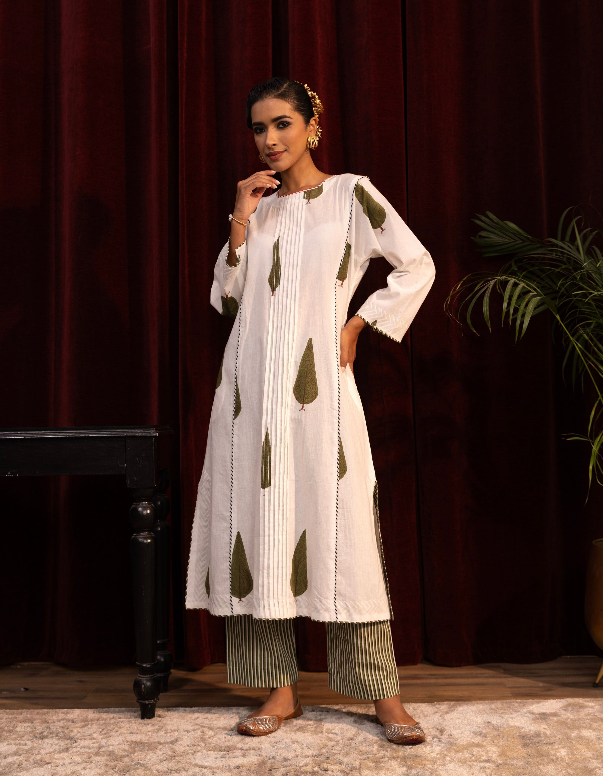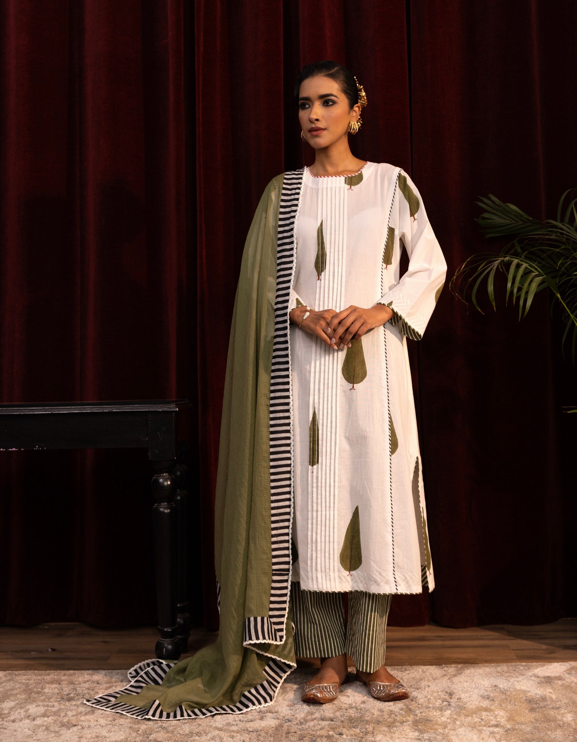 White Cypress Leaf and Stripes Print Mogra Kurta Set