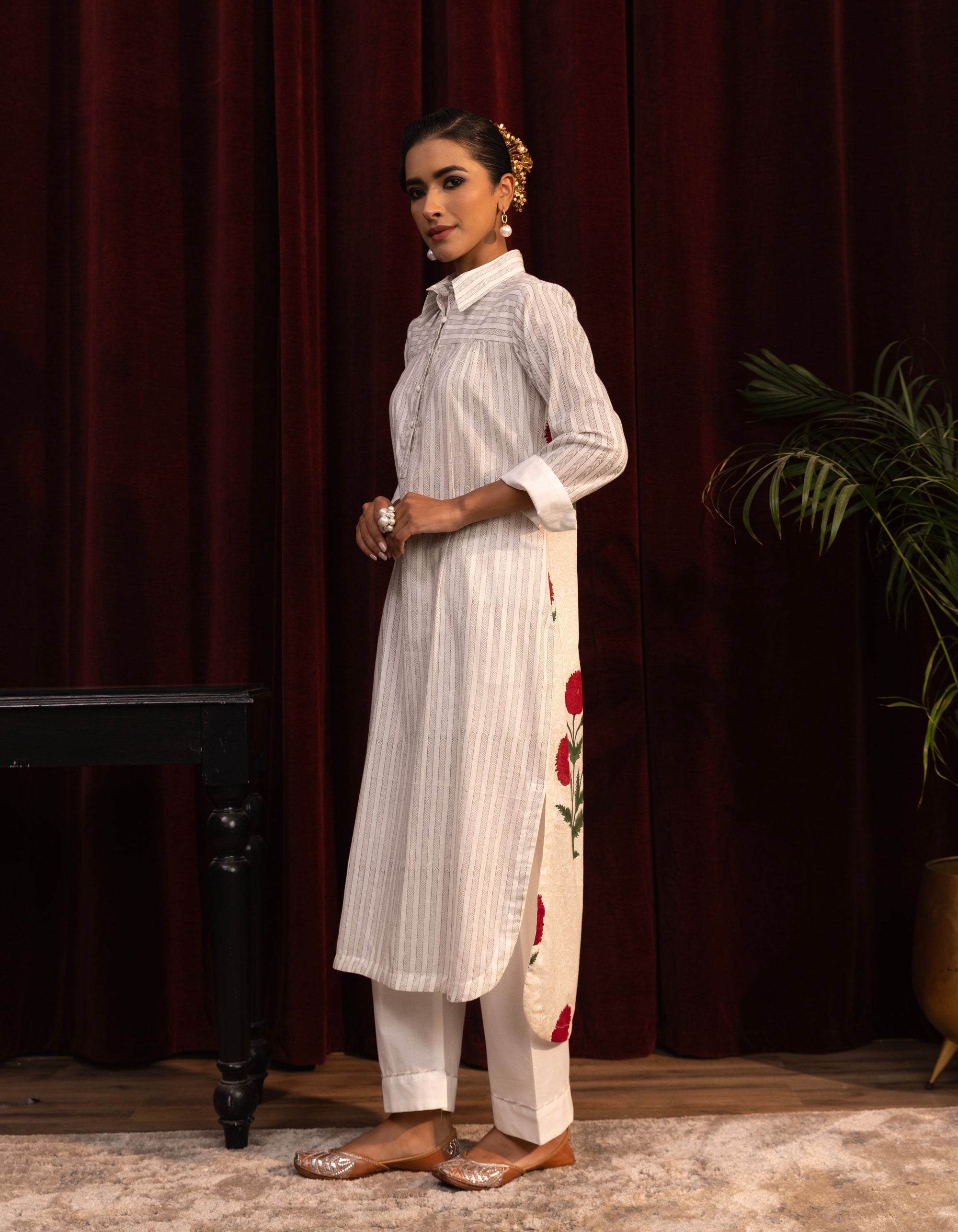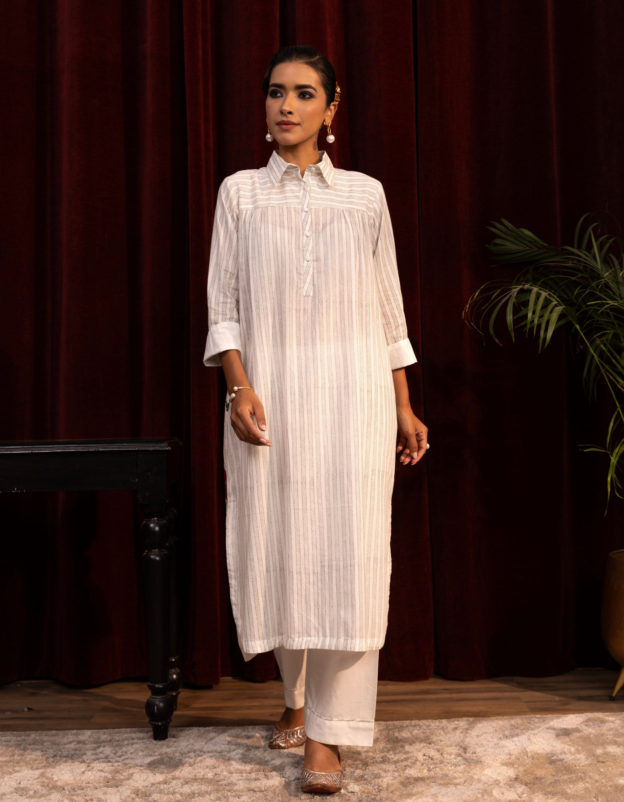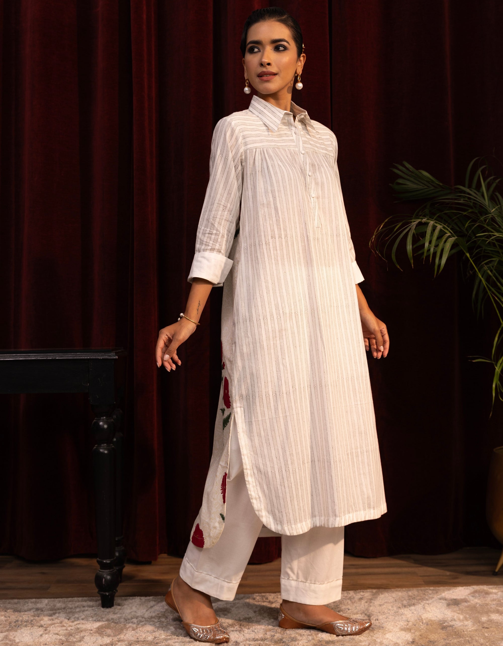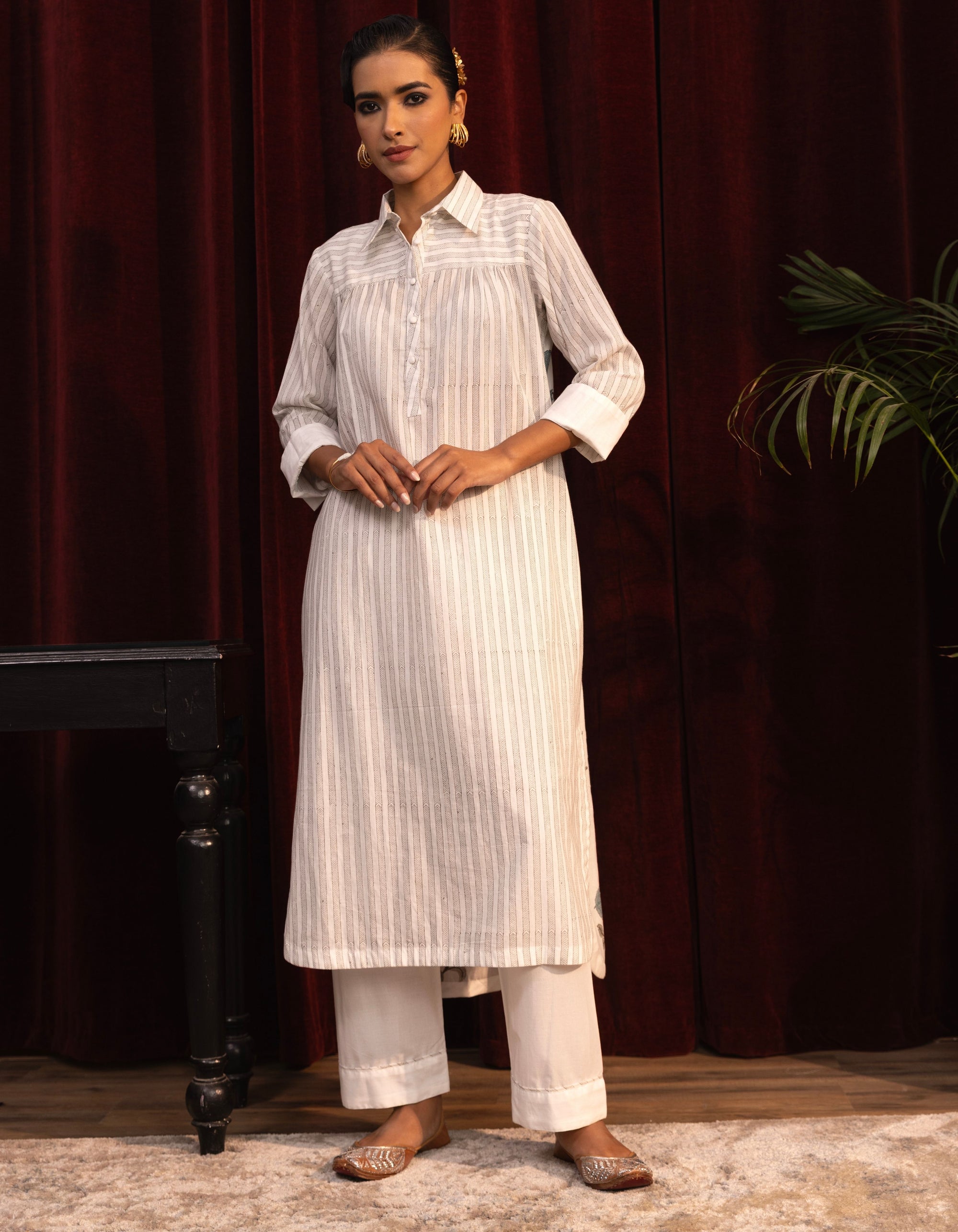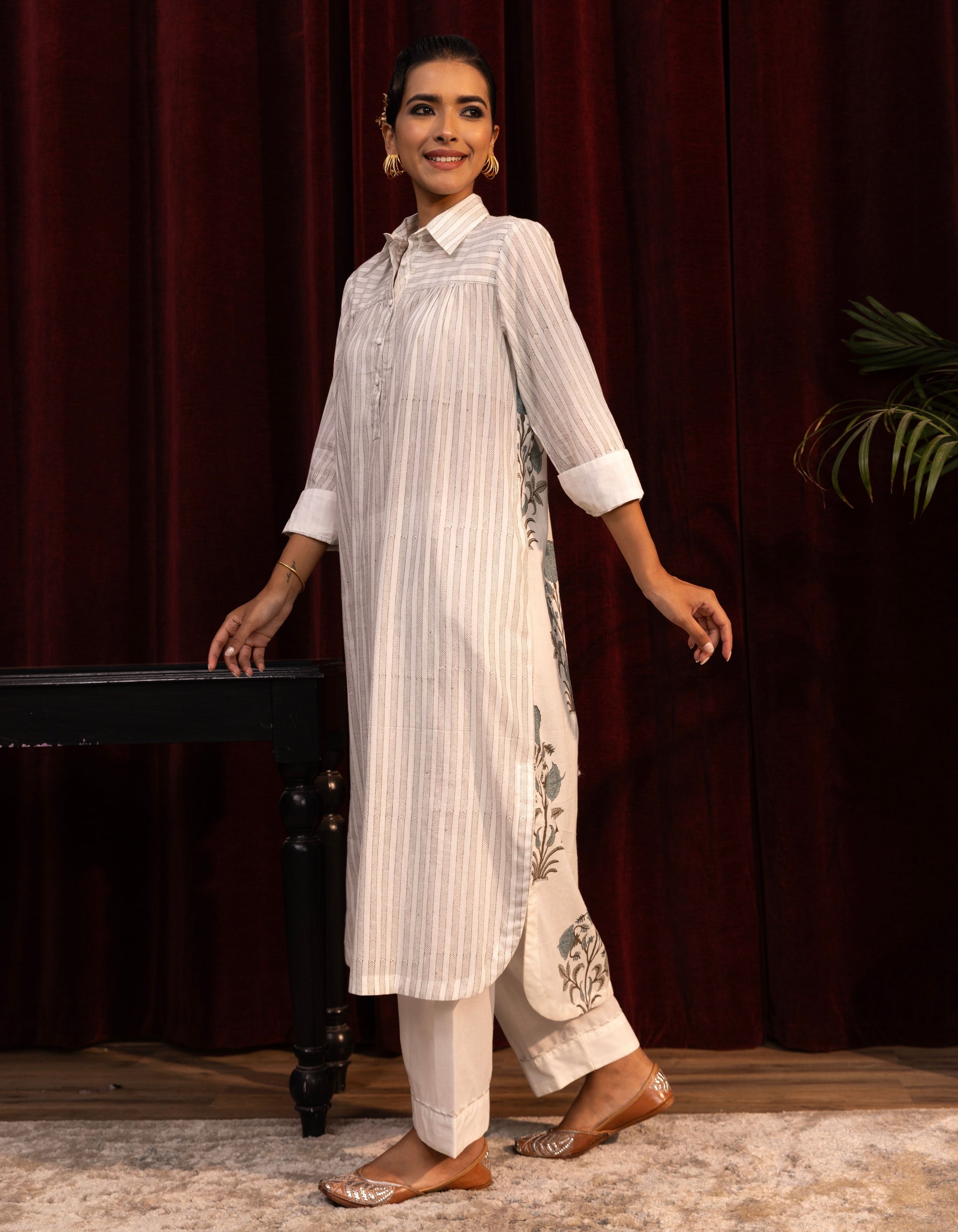 White Cypress Leaf and Stripes Print Mogra Kurta Set