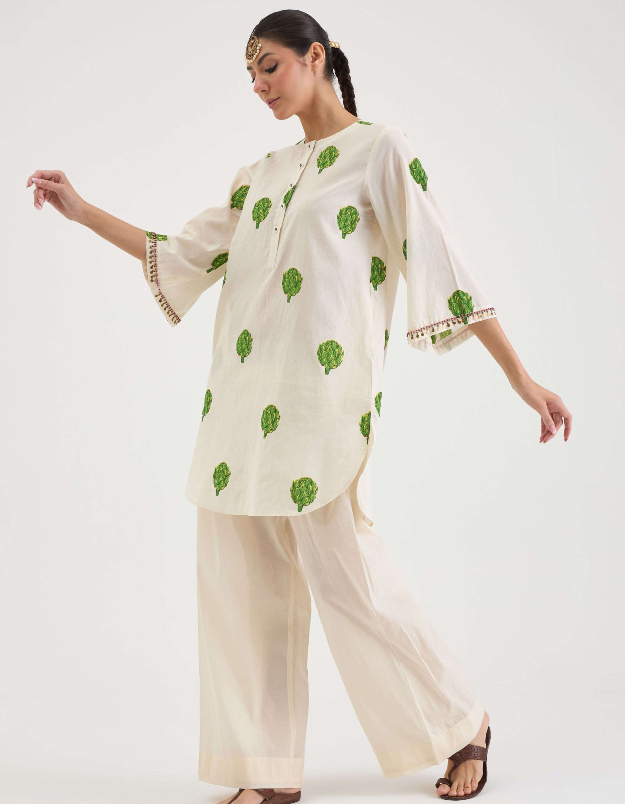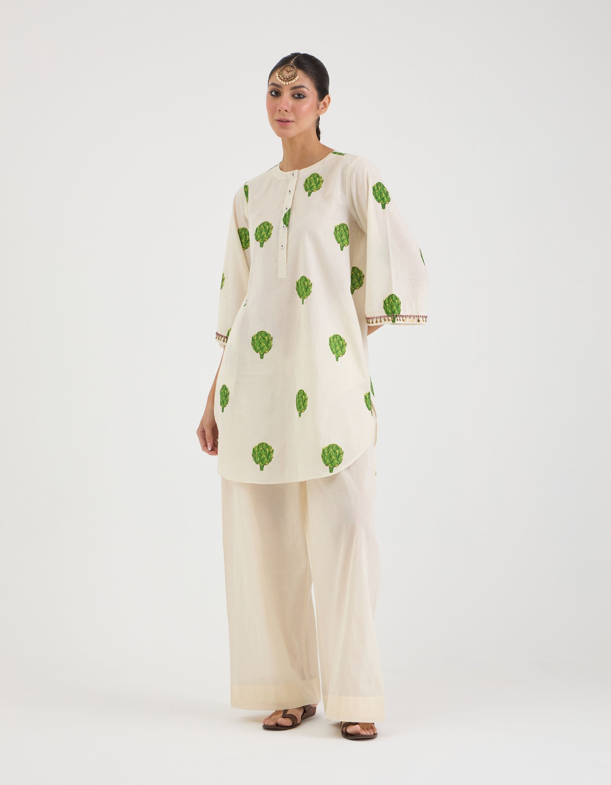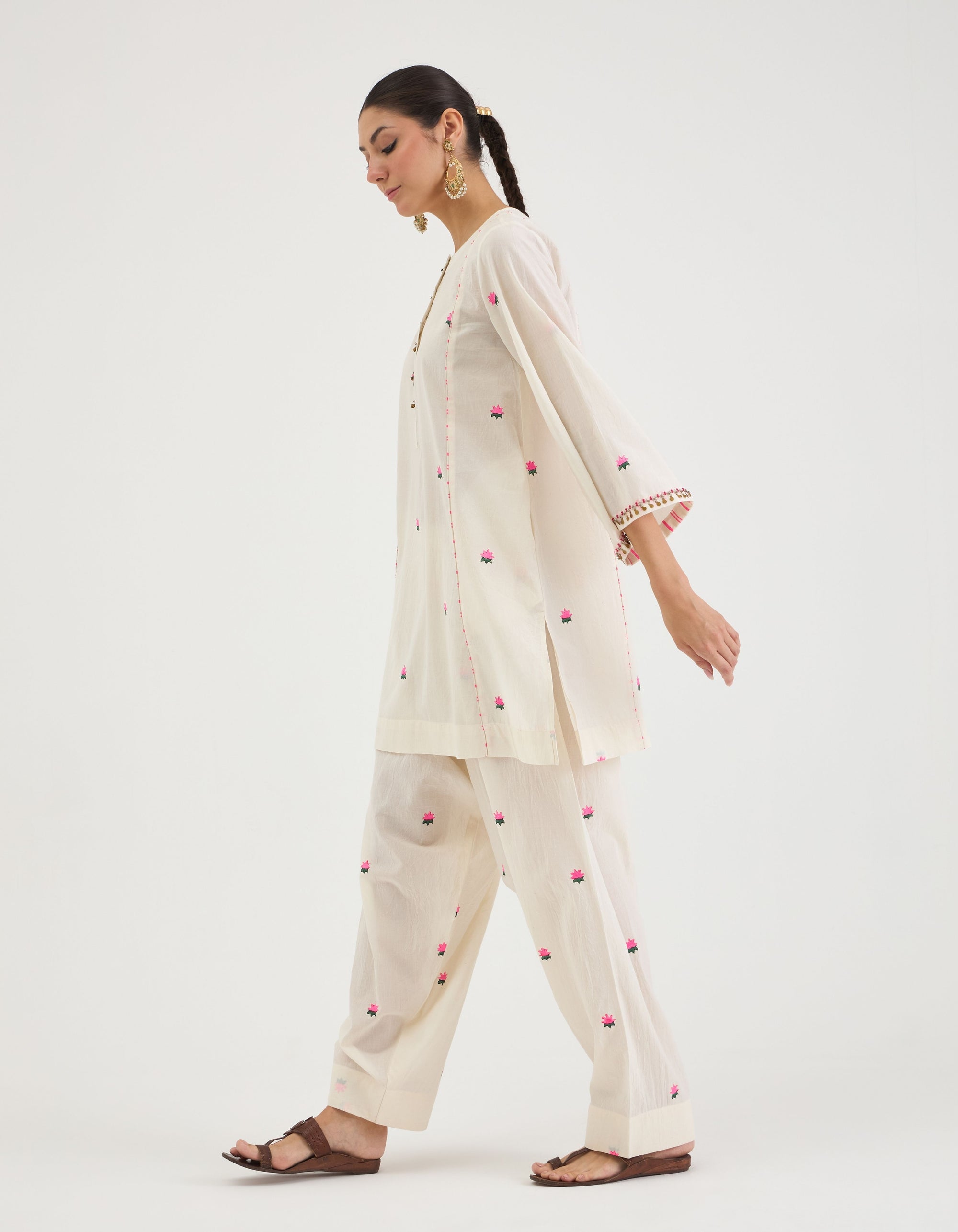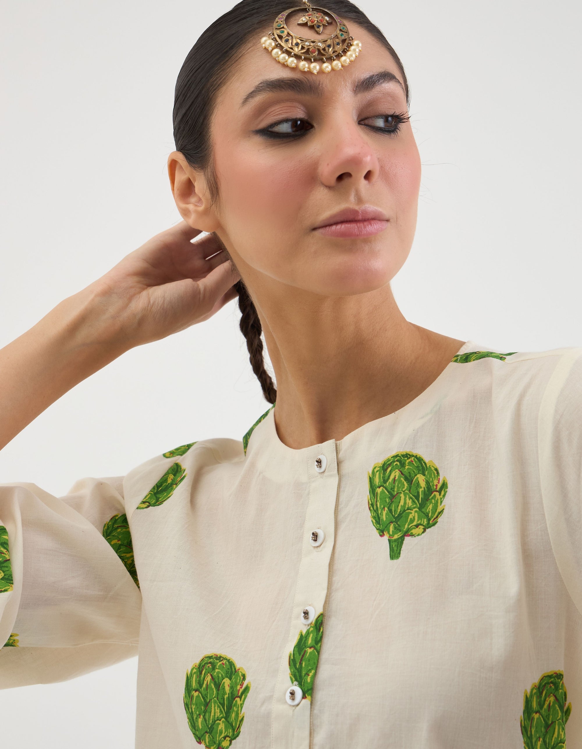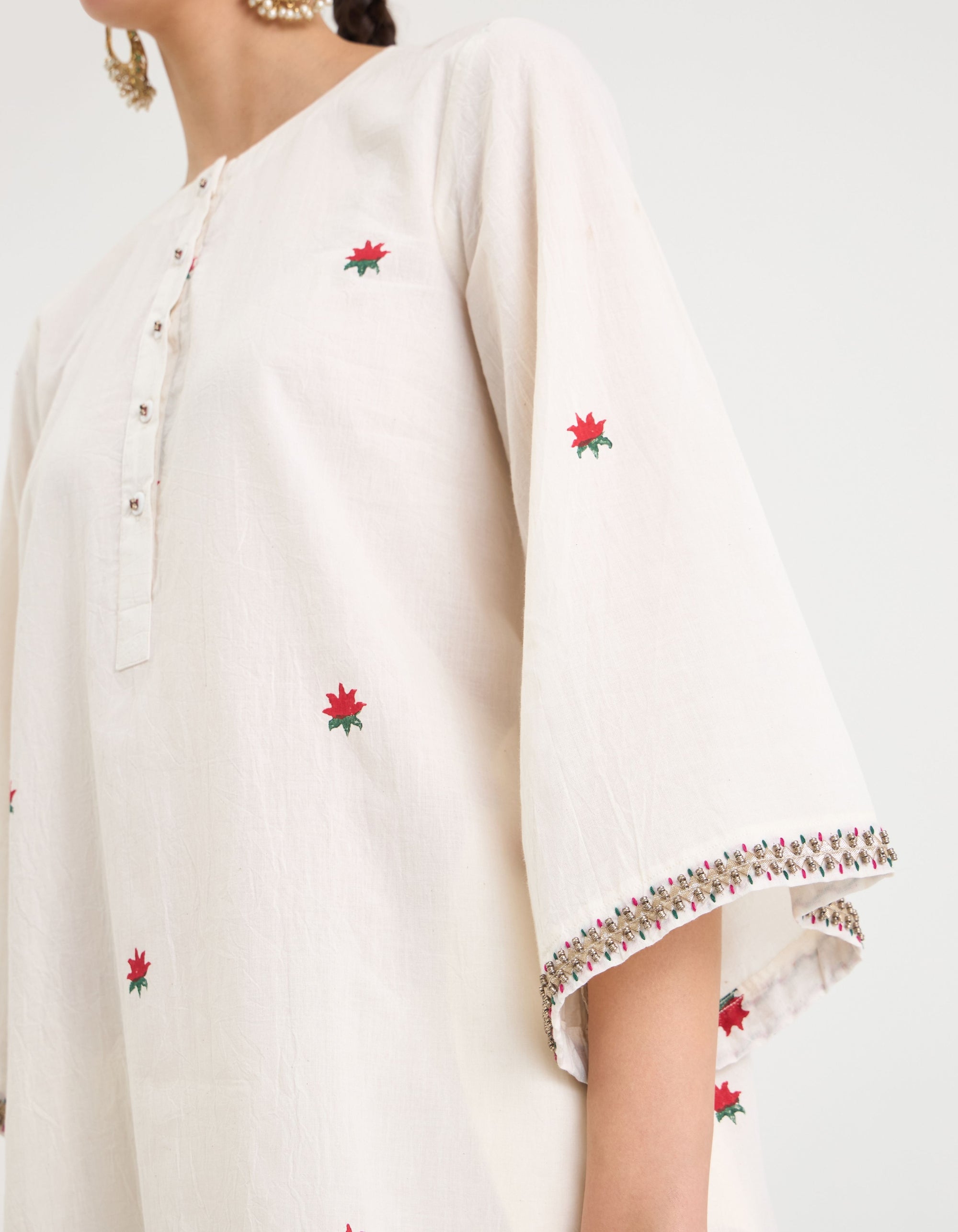 White Cypress Leaf and Poppy Print Mogra Kurta Set
