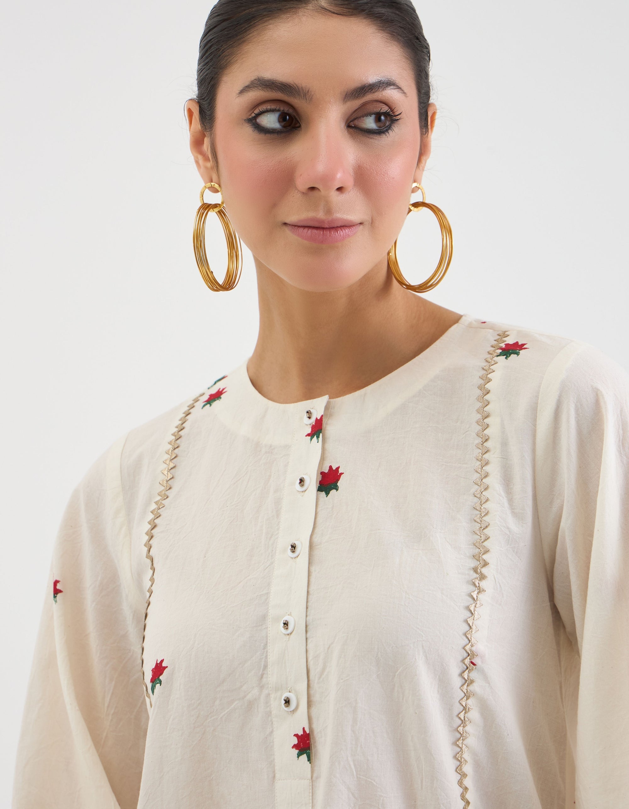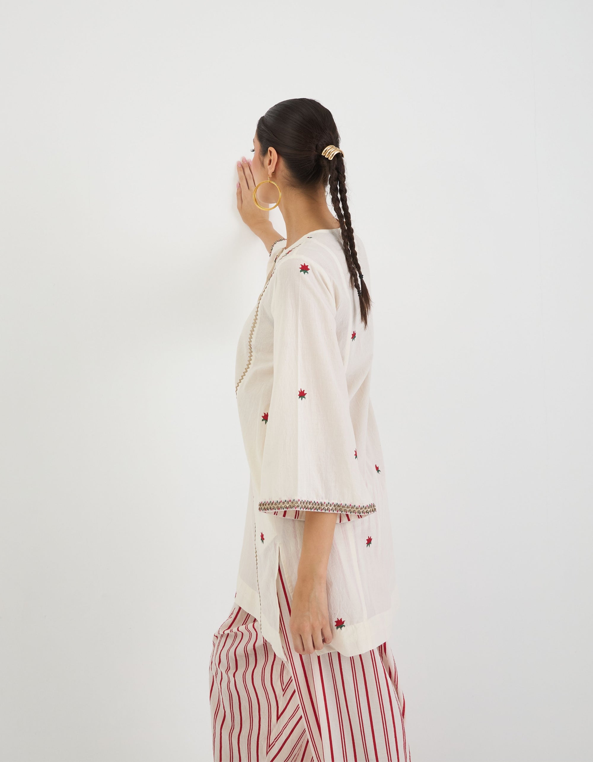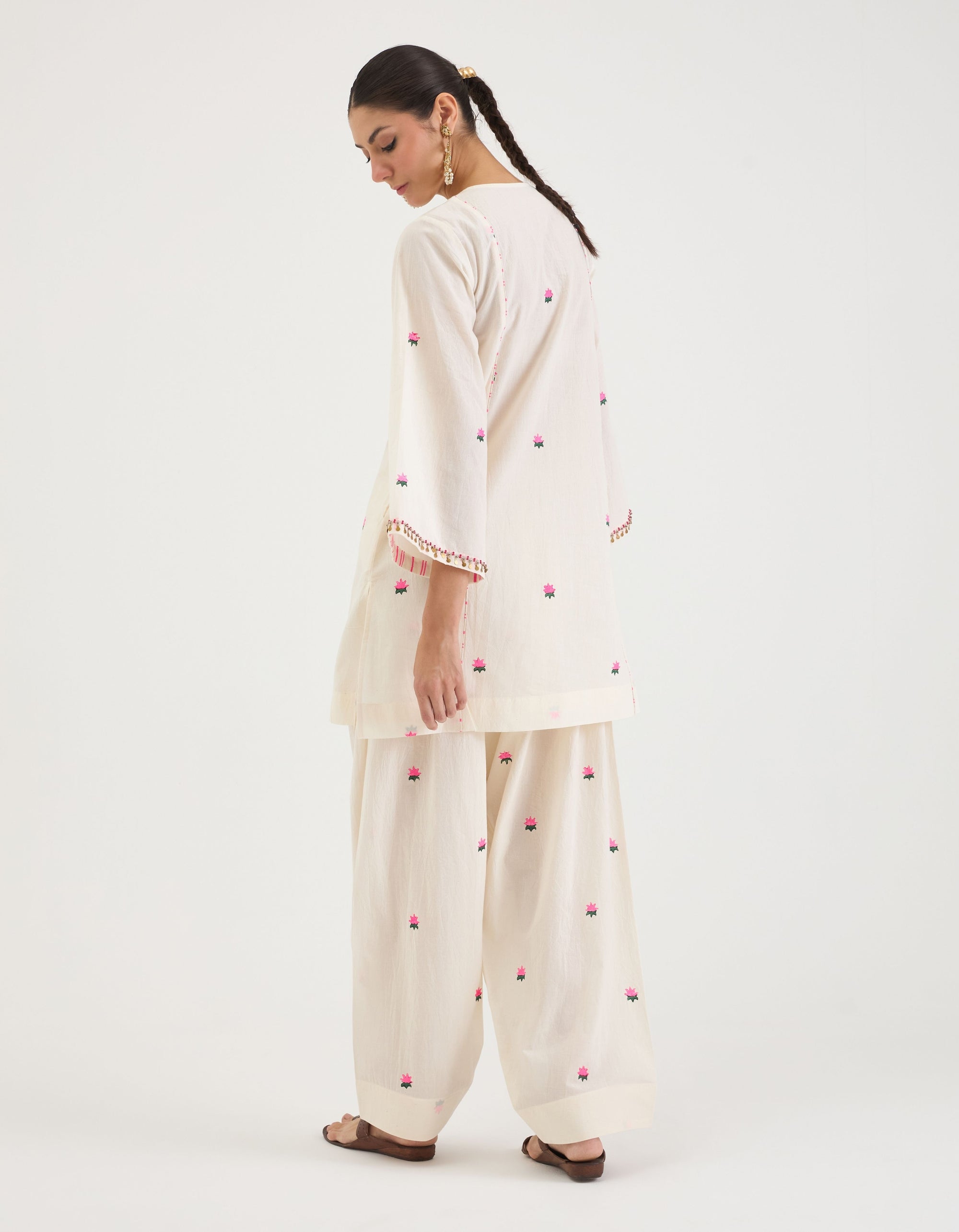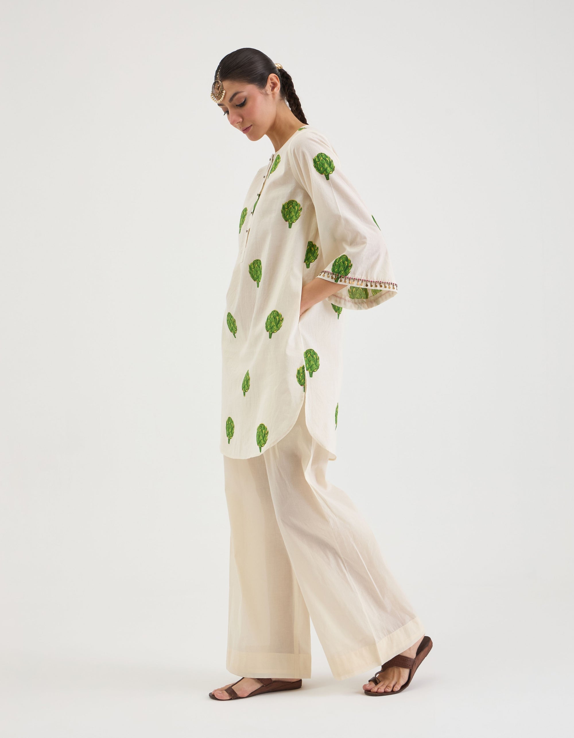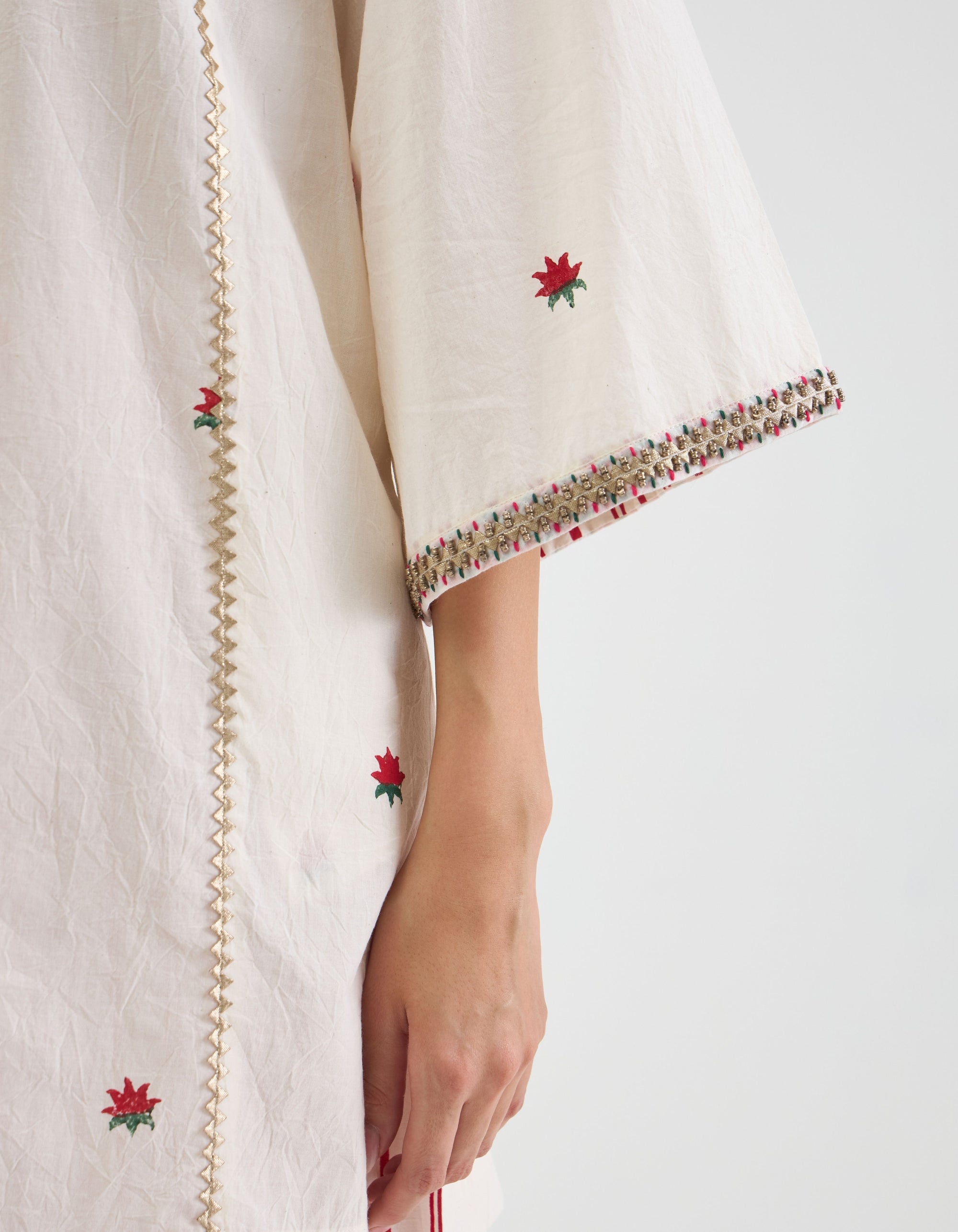 White Cypress Leaf and Poppy Print Mogra Kurta Set
