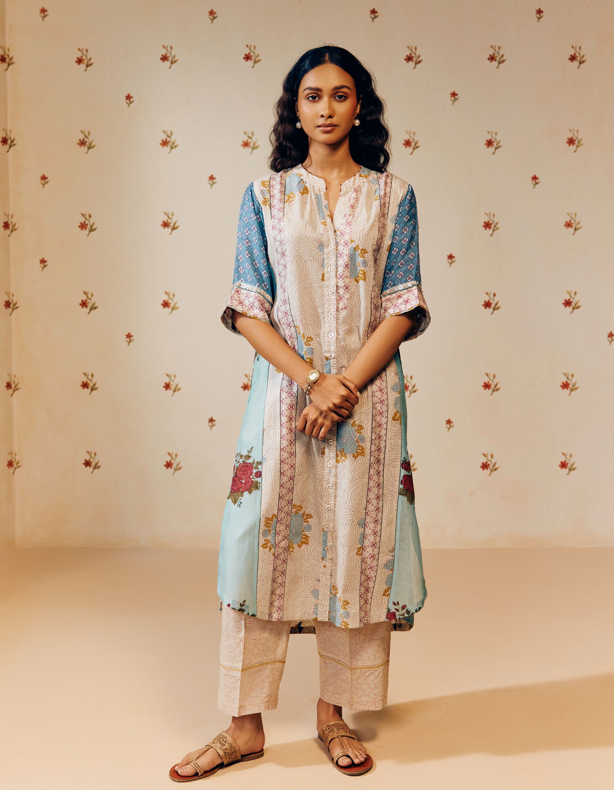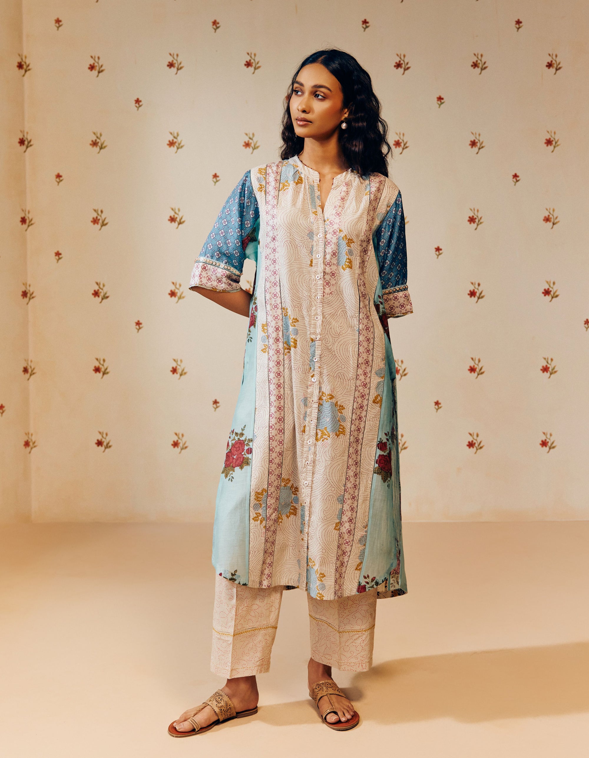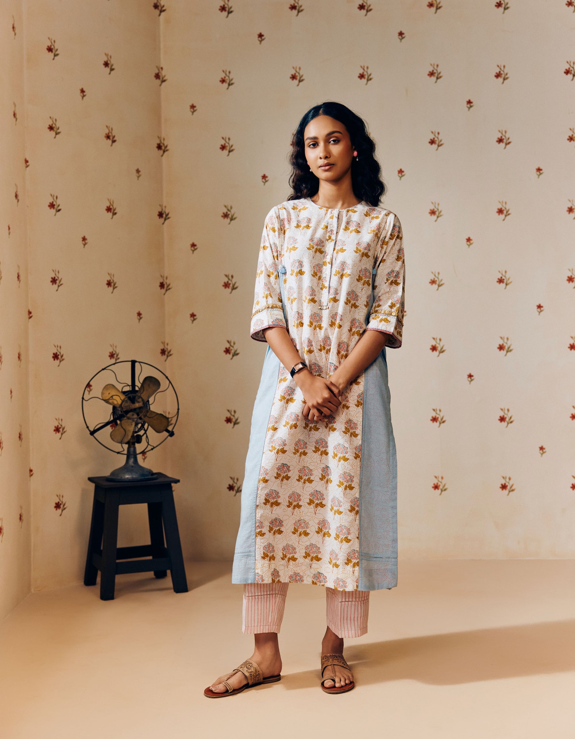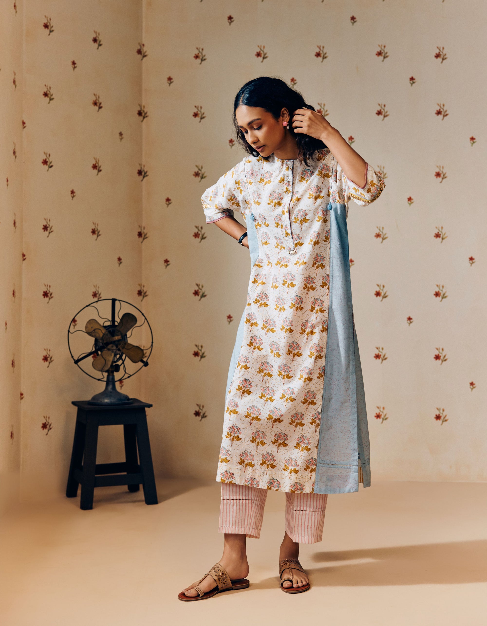 Blue and Off White Front Button Placket Hand Block Printed Multi Panel Mia Kurta Set