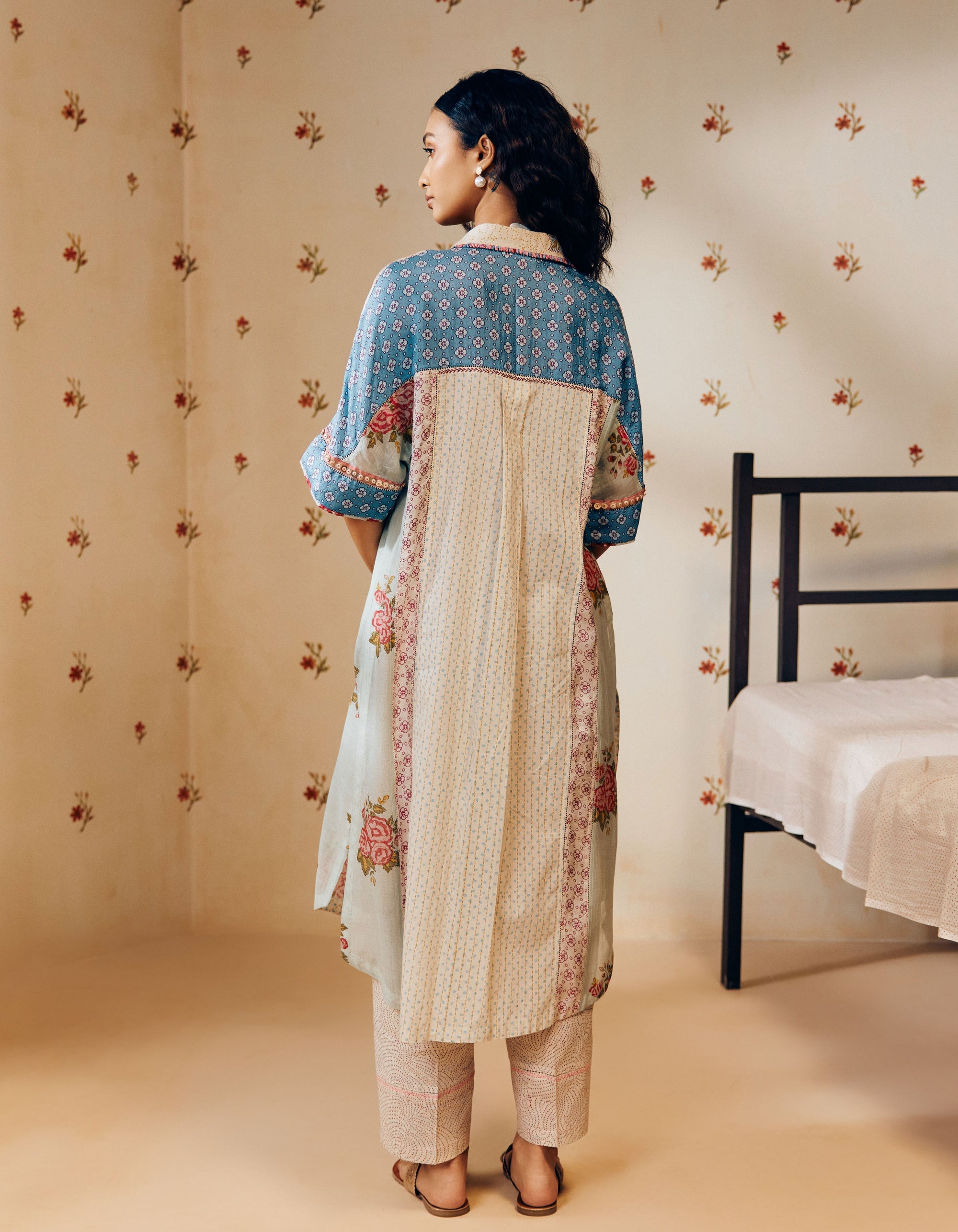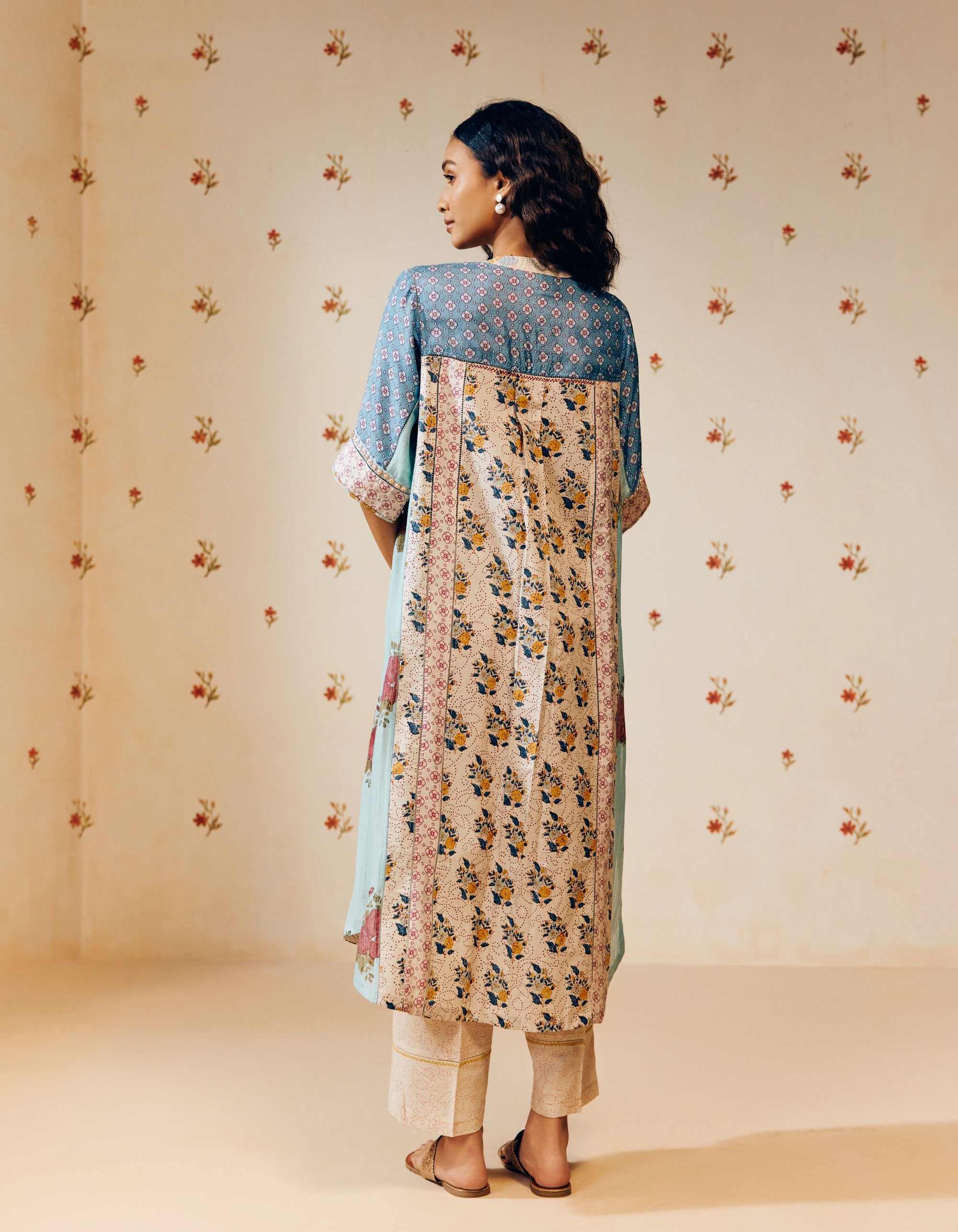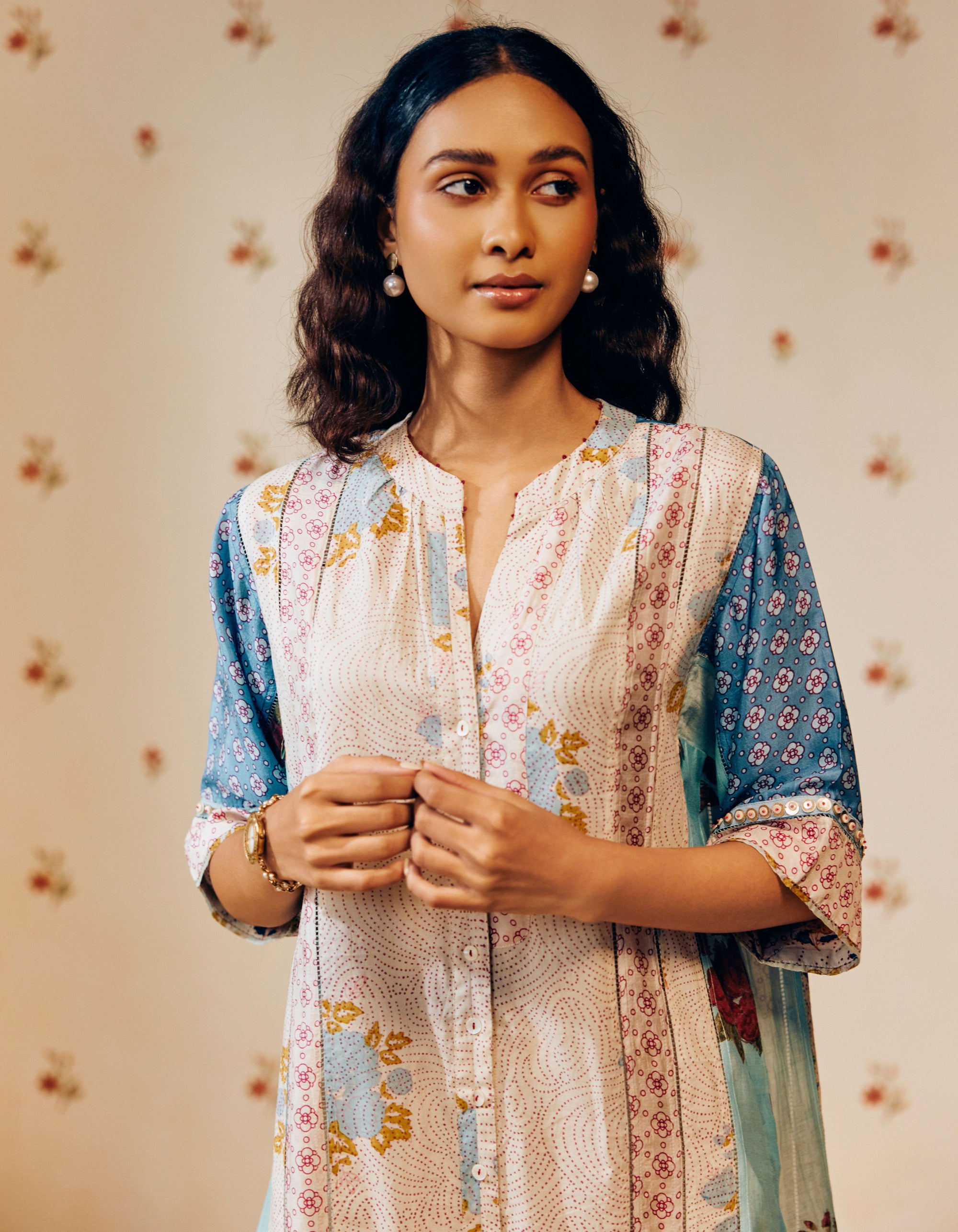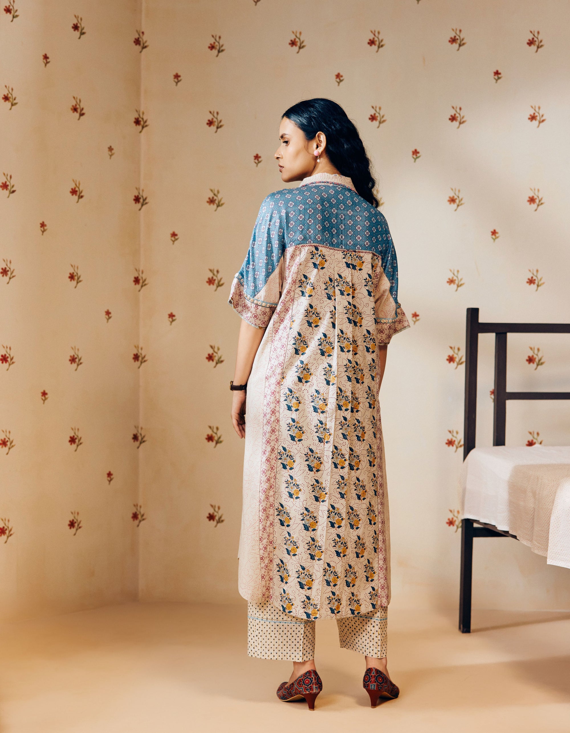 Blue and Off White Front Button Placket Hand Block Printed Multi Panel Mia Kurta Set