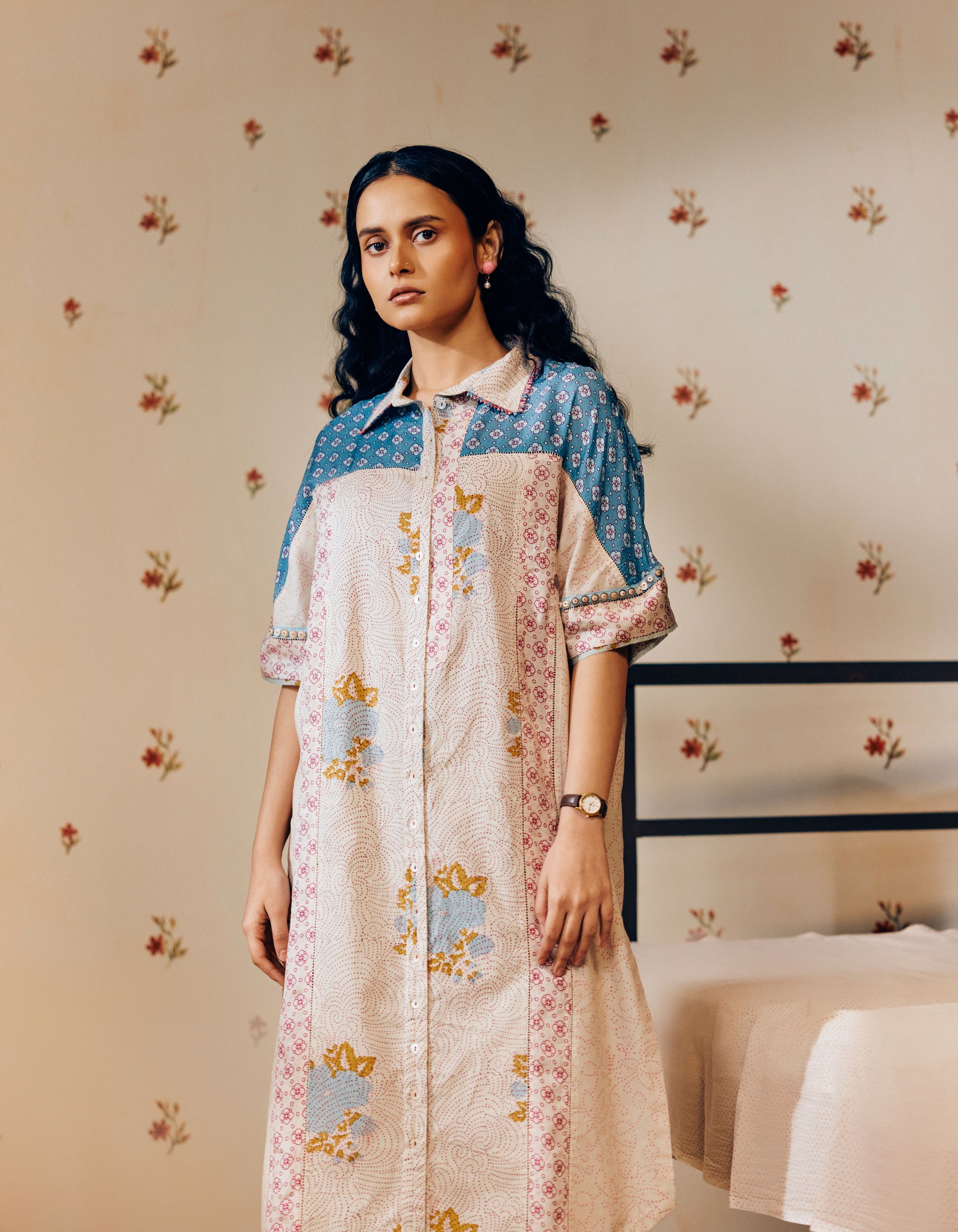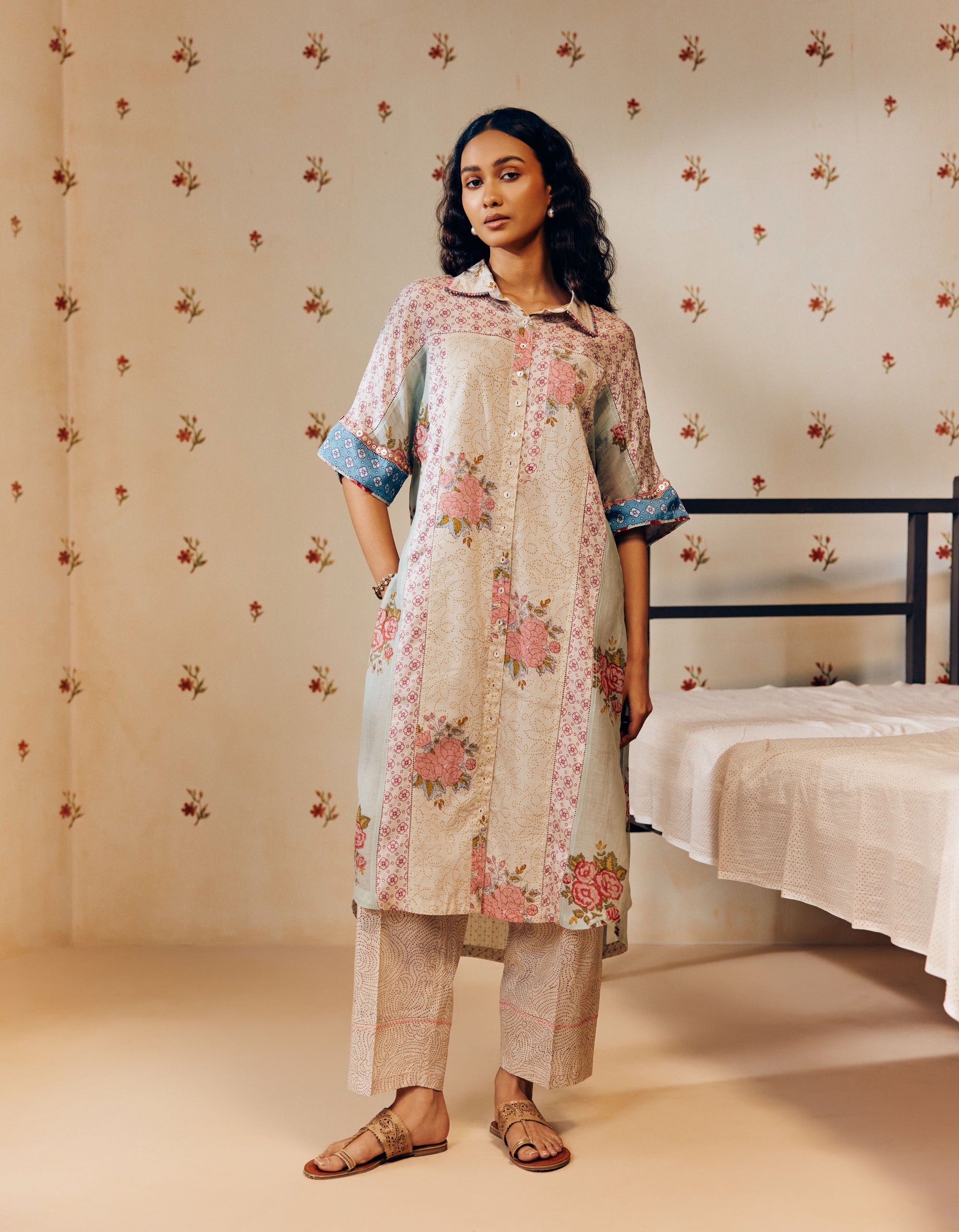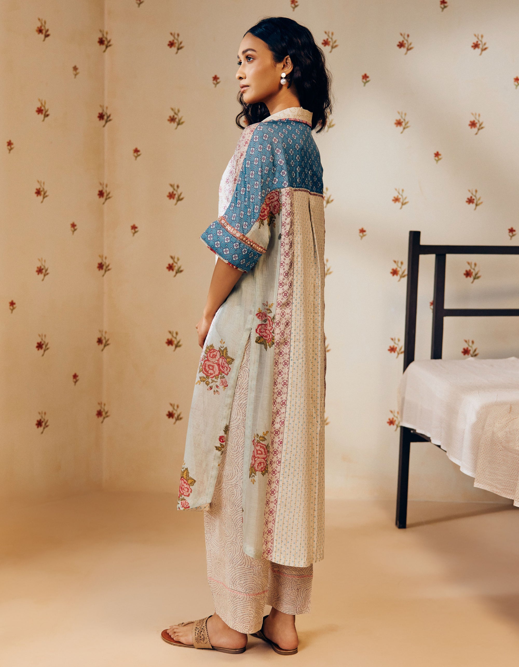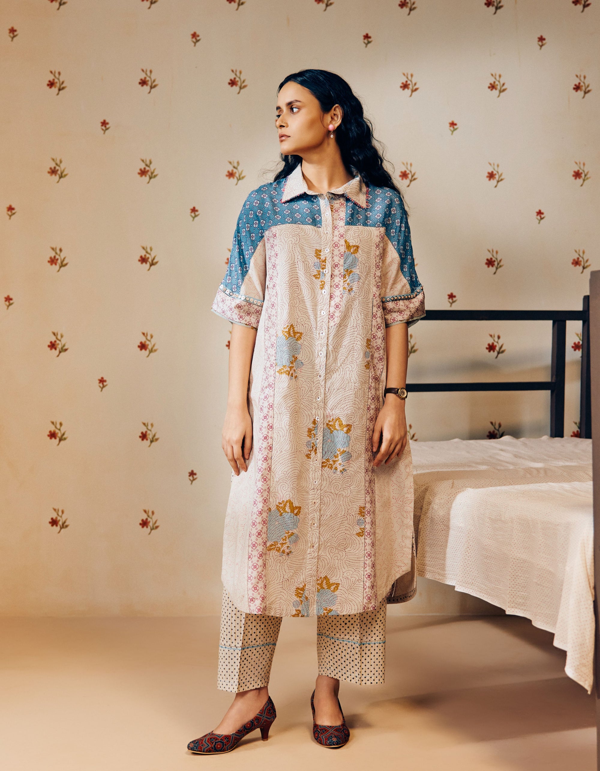 Blue and Off White Front Button Placket Hand Block Printed Multi Panel Mia Kurta Set