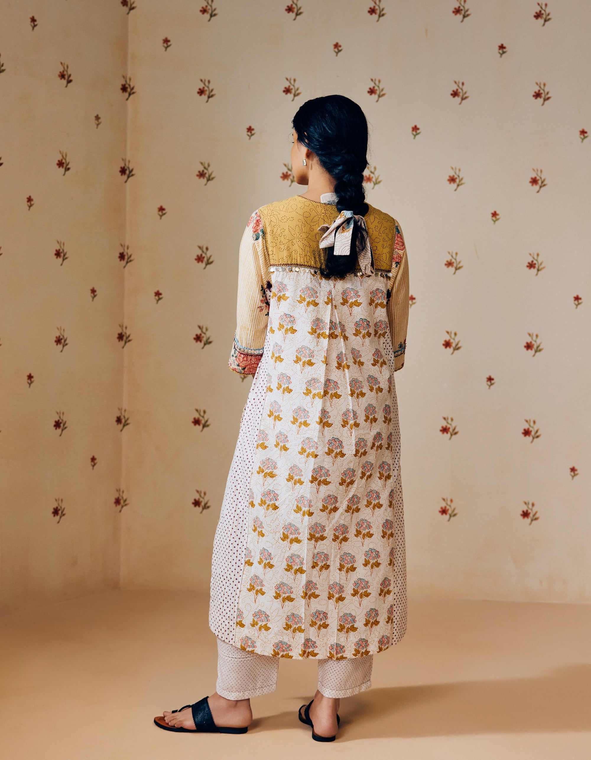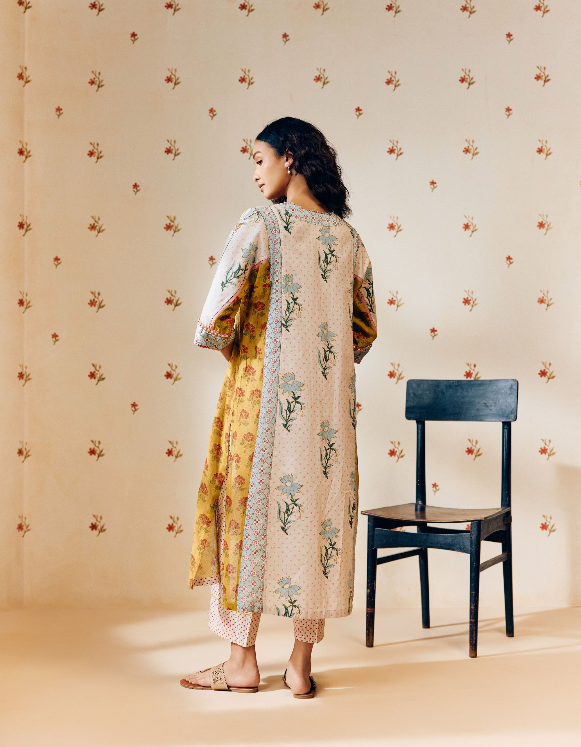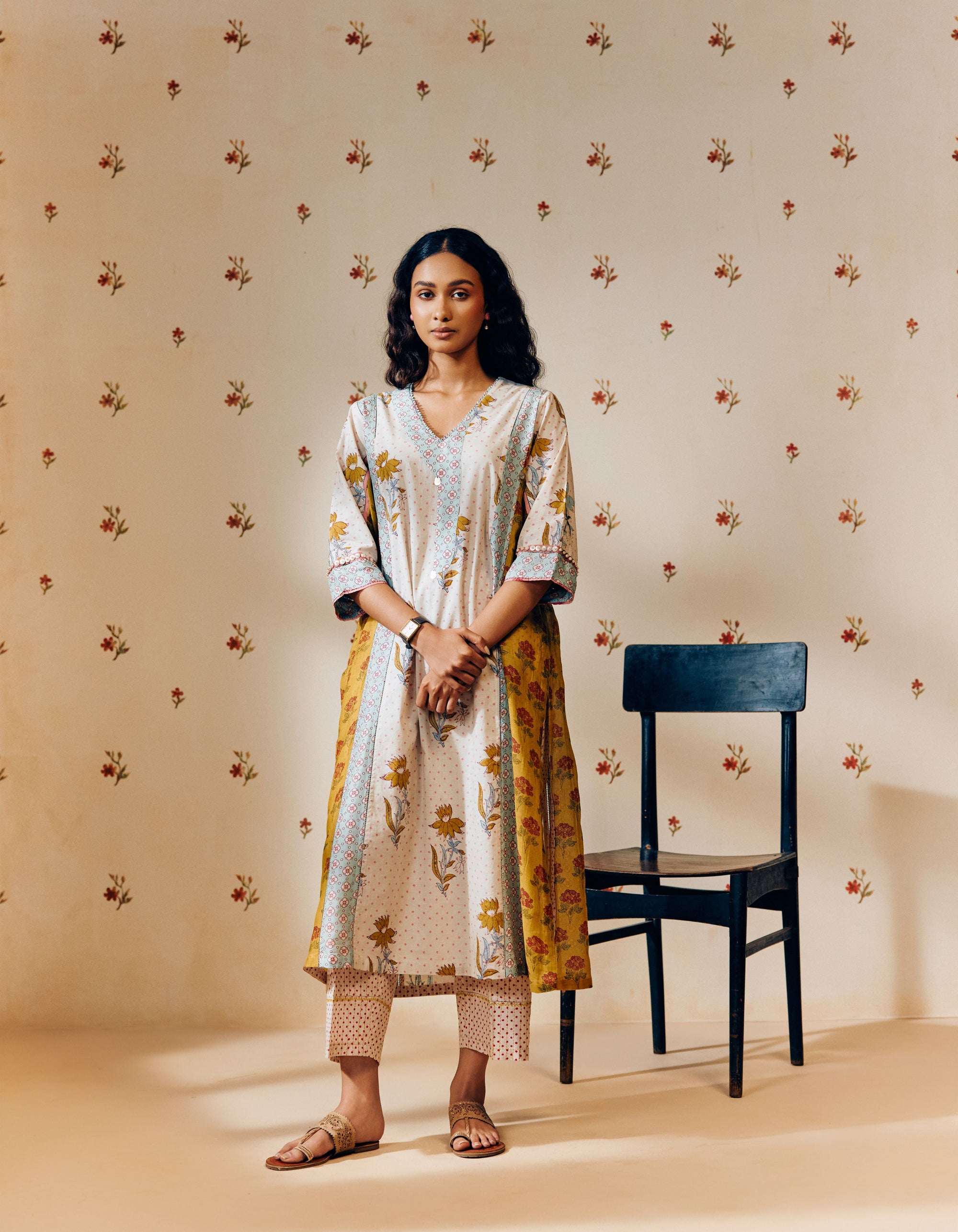 Off White And Mustard Hand Block Printed Silk Multi Panel Mia Kurta Set