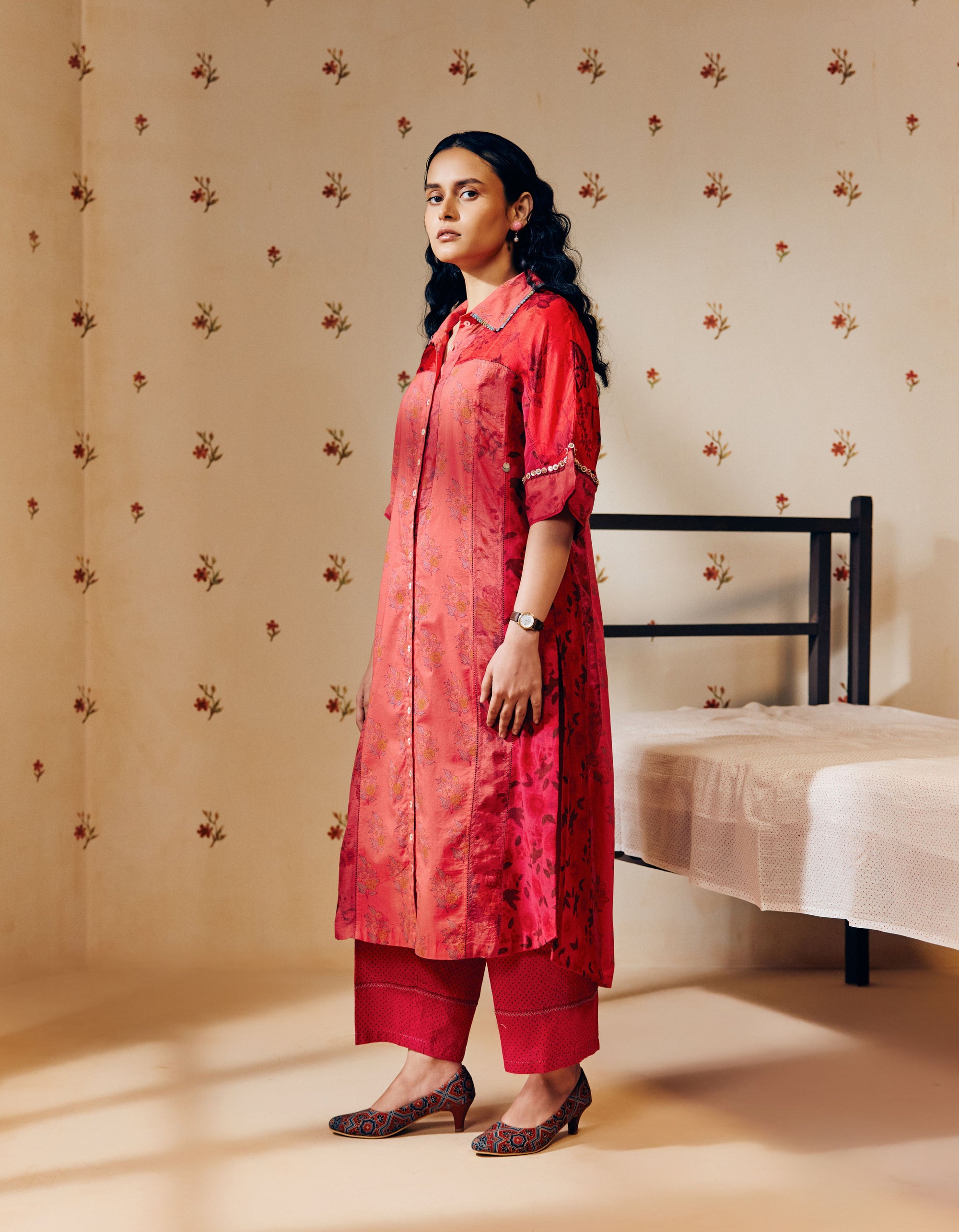 Rani Pink Hand Block Shirt Collar Printed Mia Kurta Set