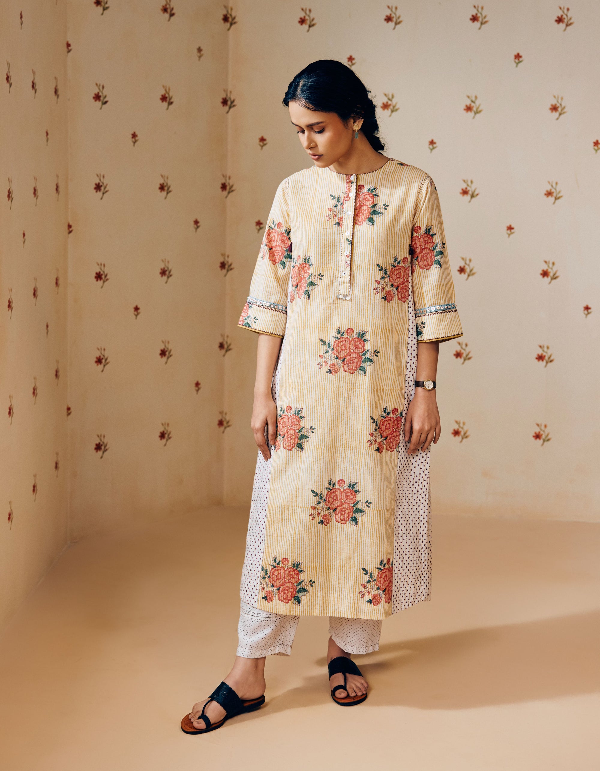 Mustard Stripes and Overlap Rose Hand Block Print Mia Kurta Set