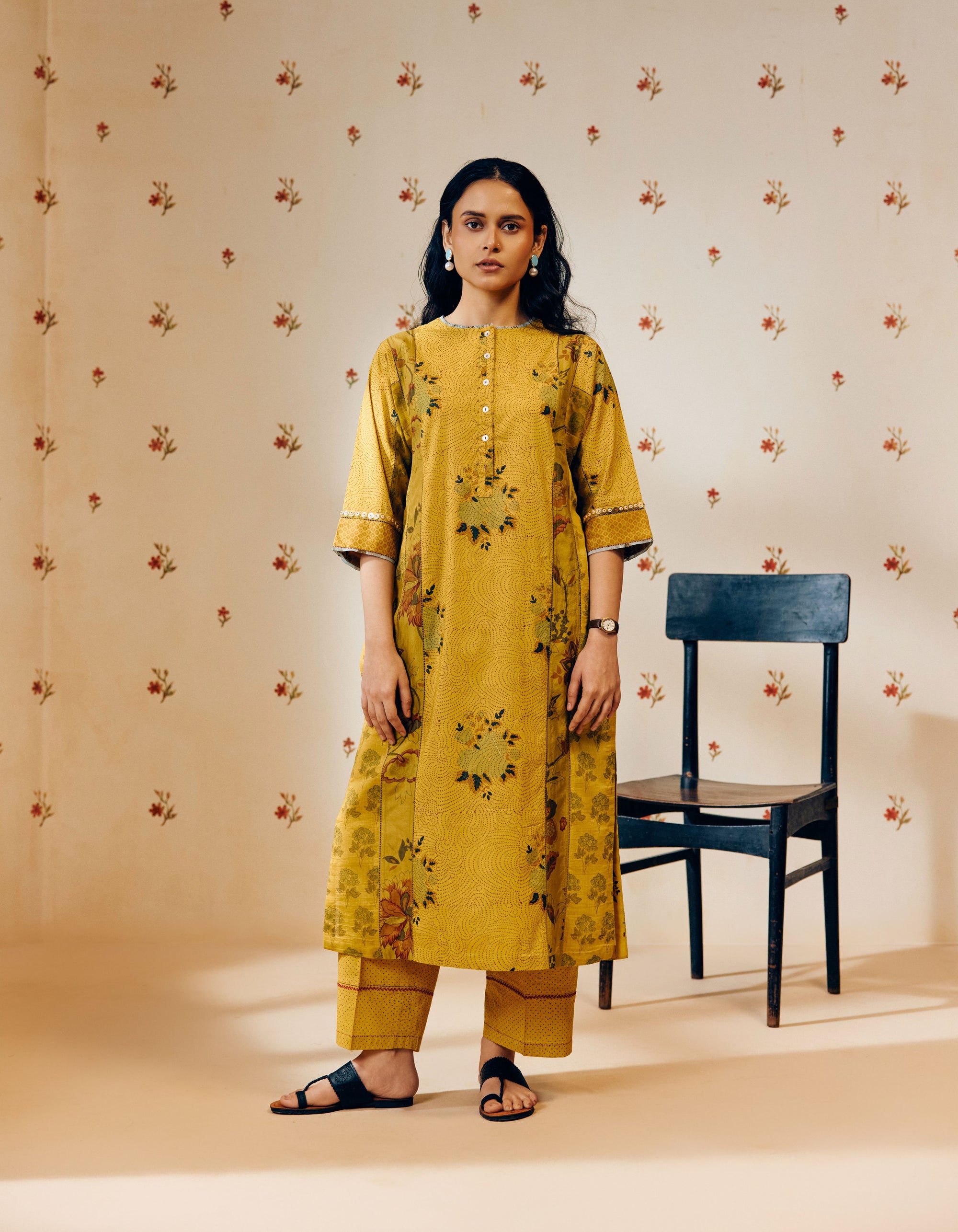 Mustard Hand Block Printed Multi Panel Mia Kurta Set