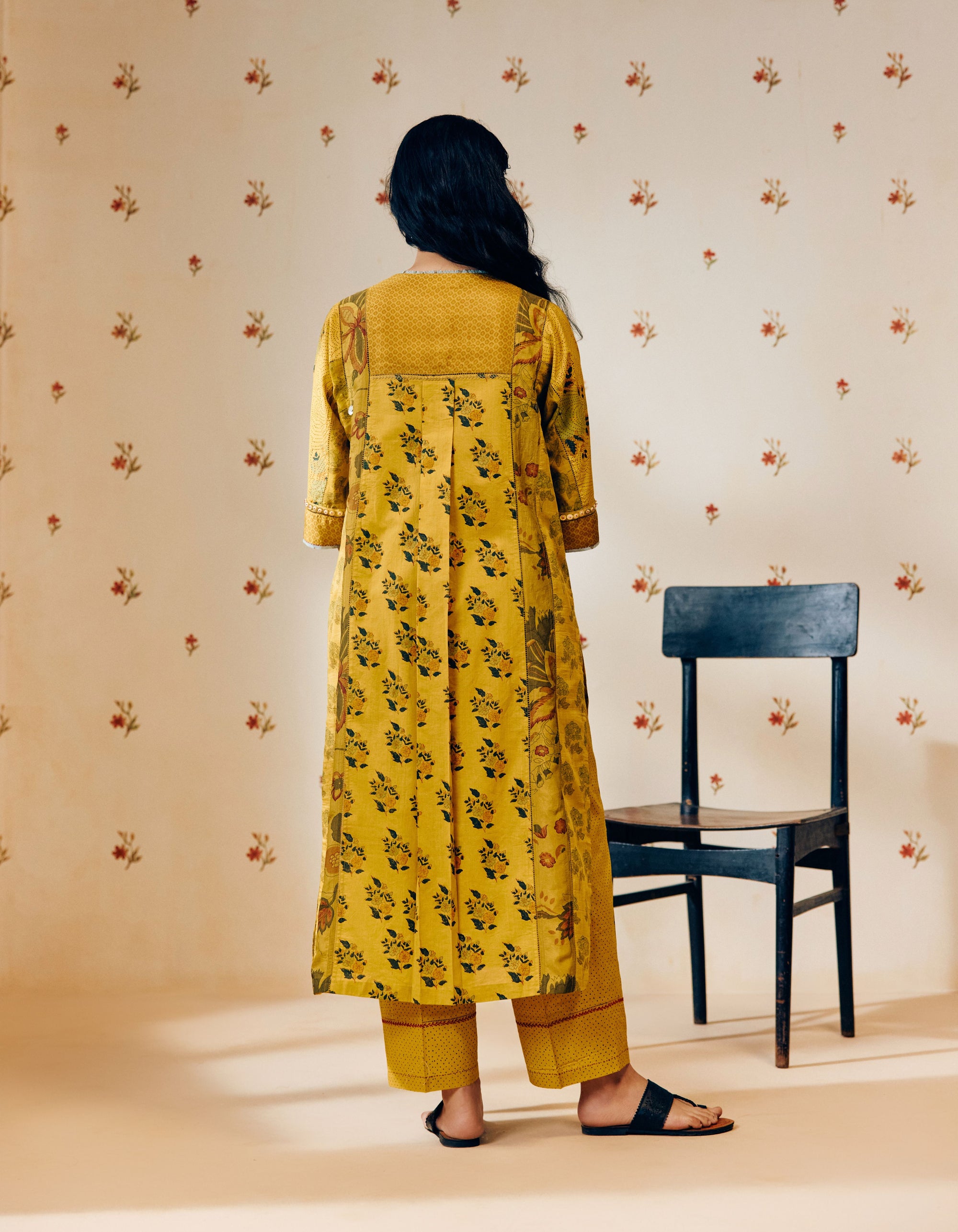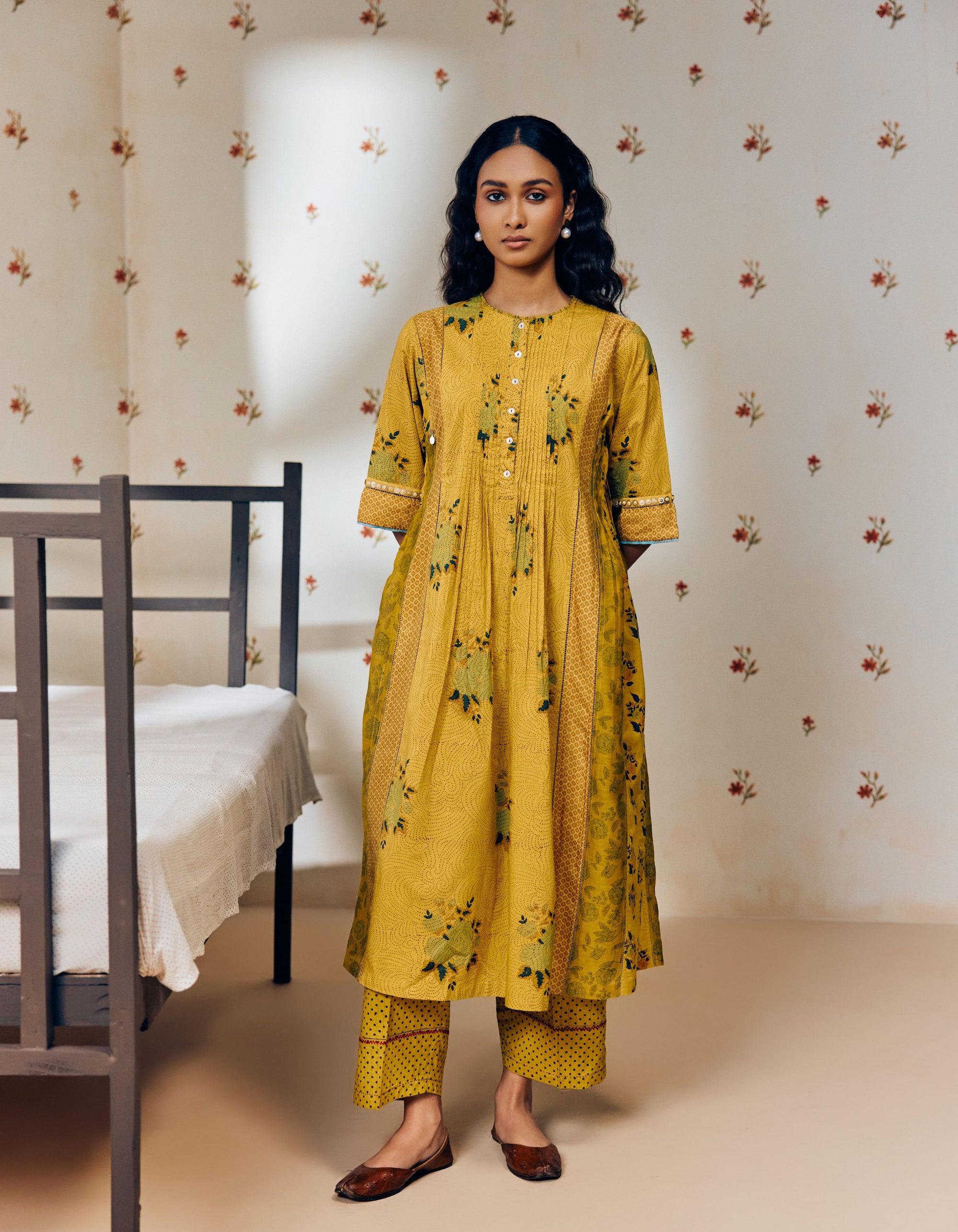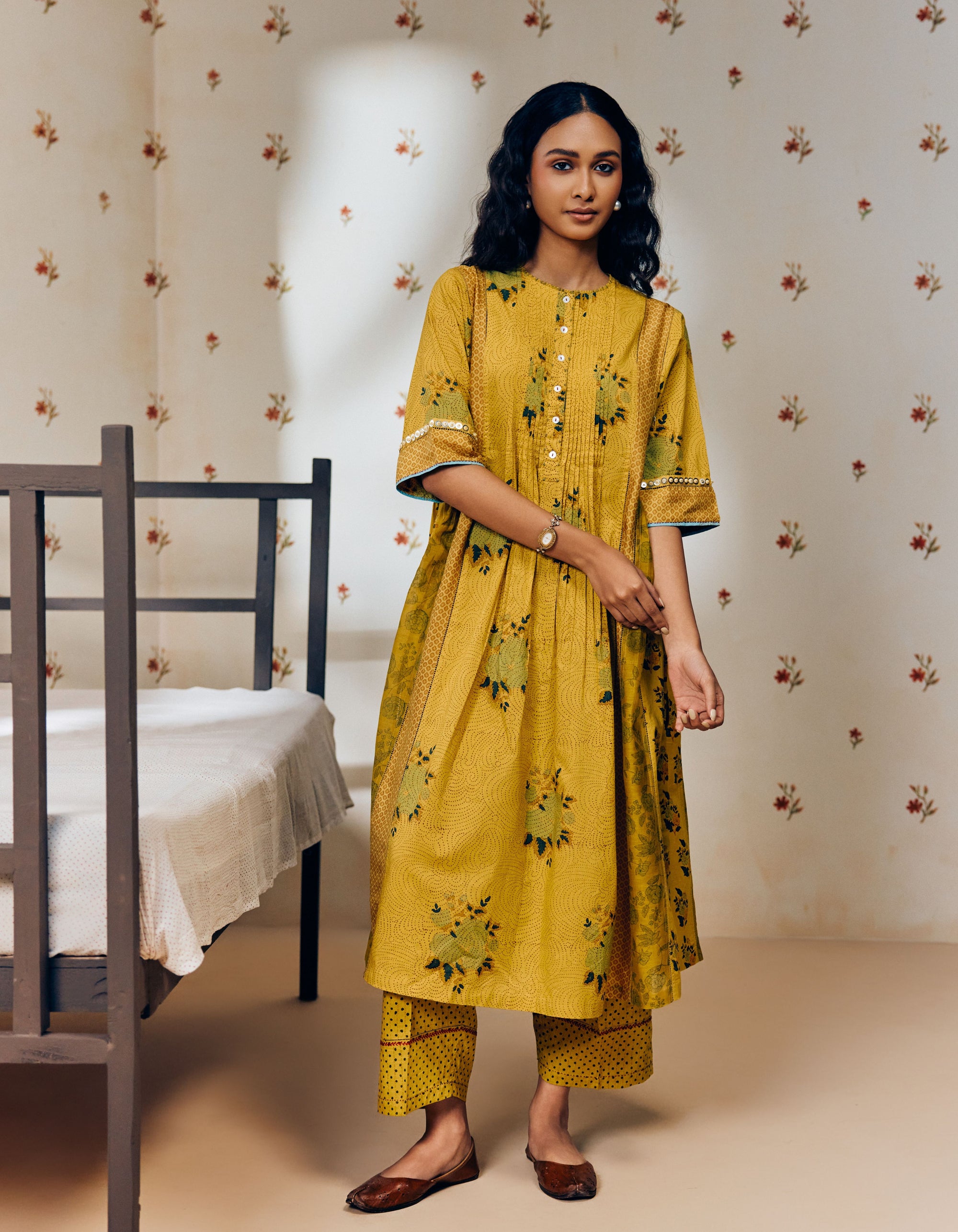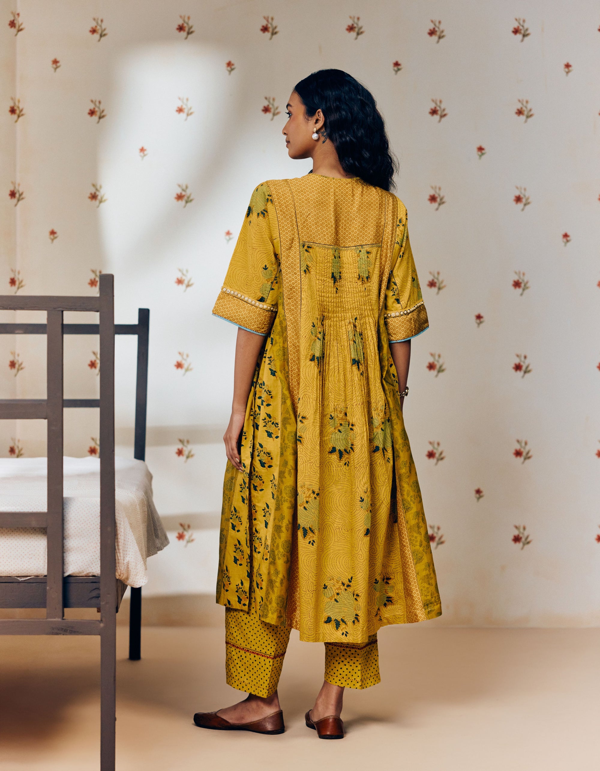 Mustard Front Gathers Hand Block Printed Multi Panel Mia Kurta Set
