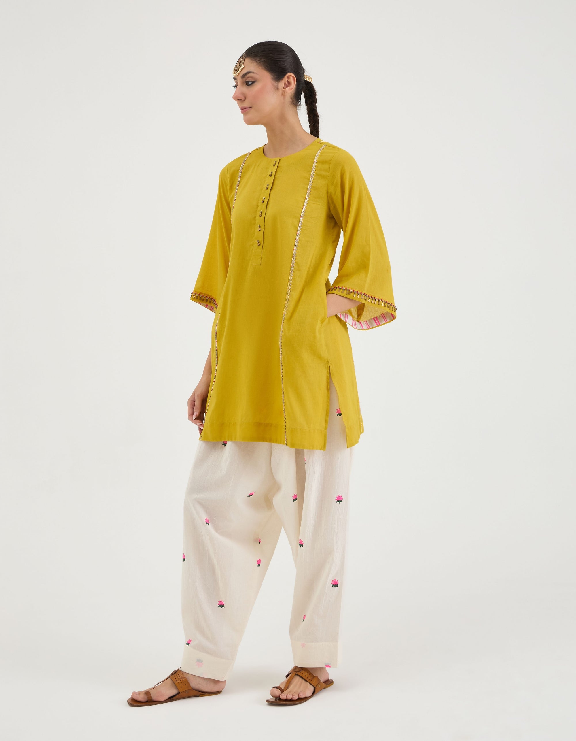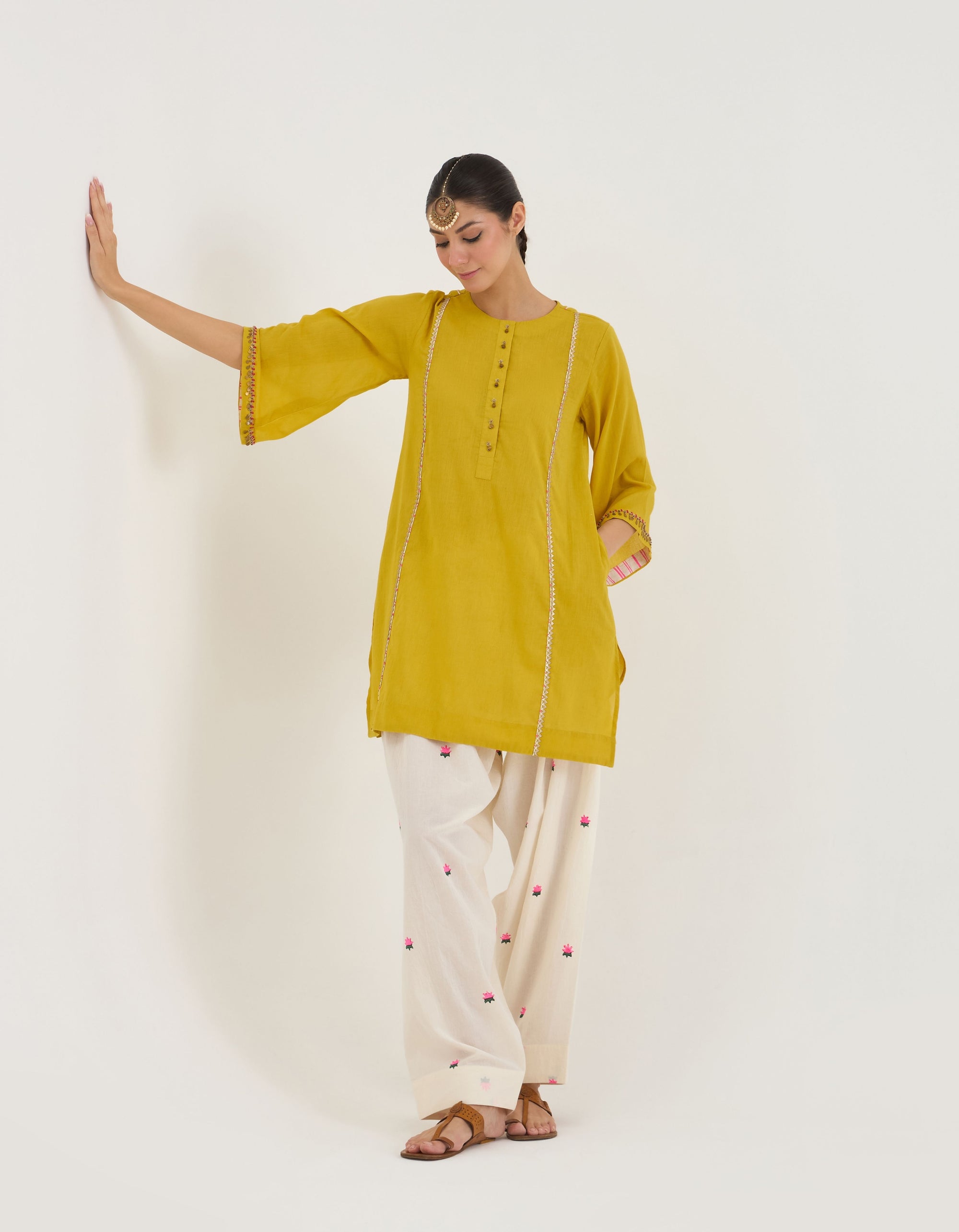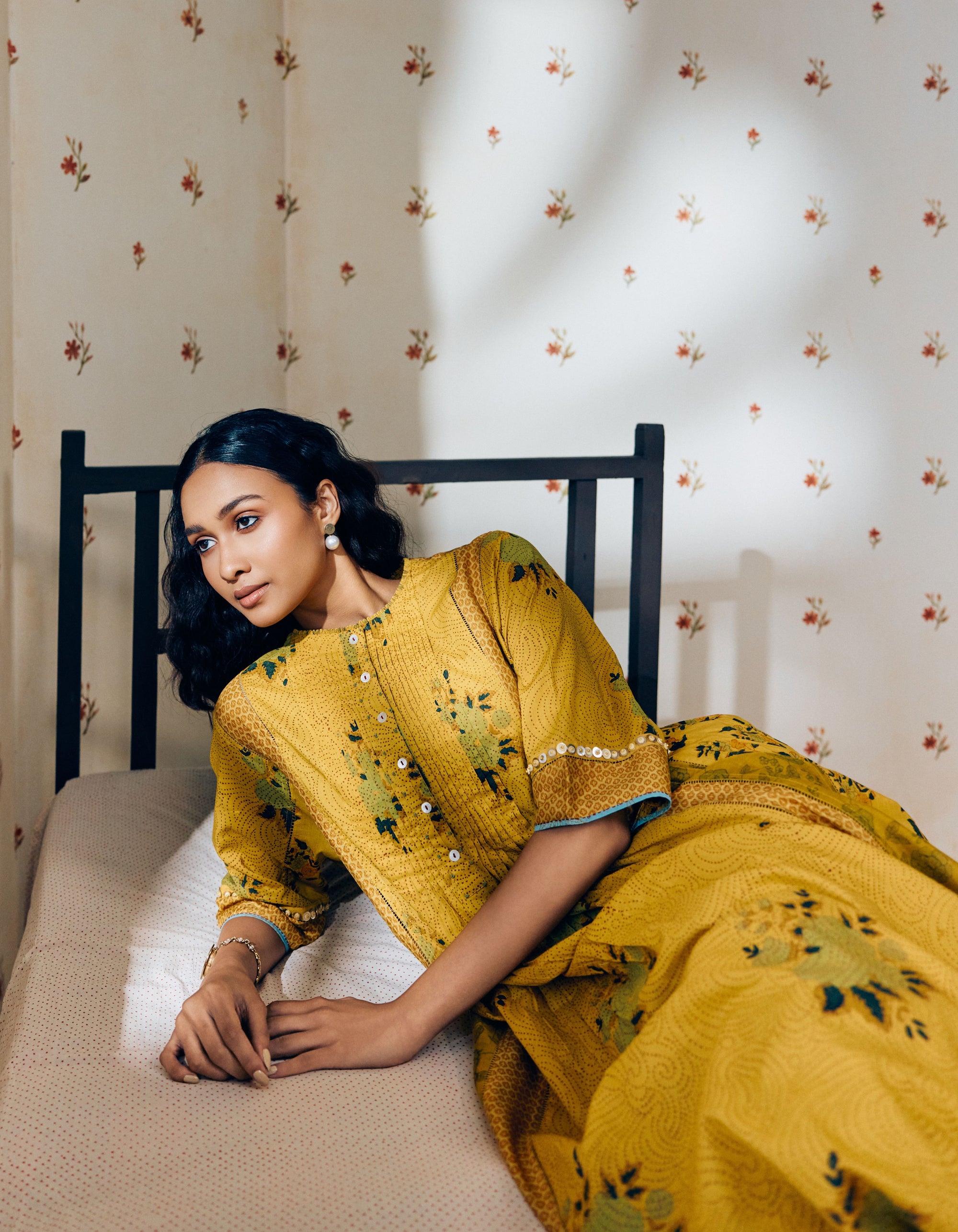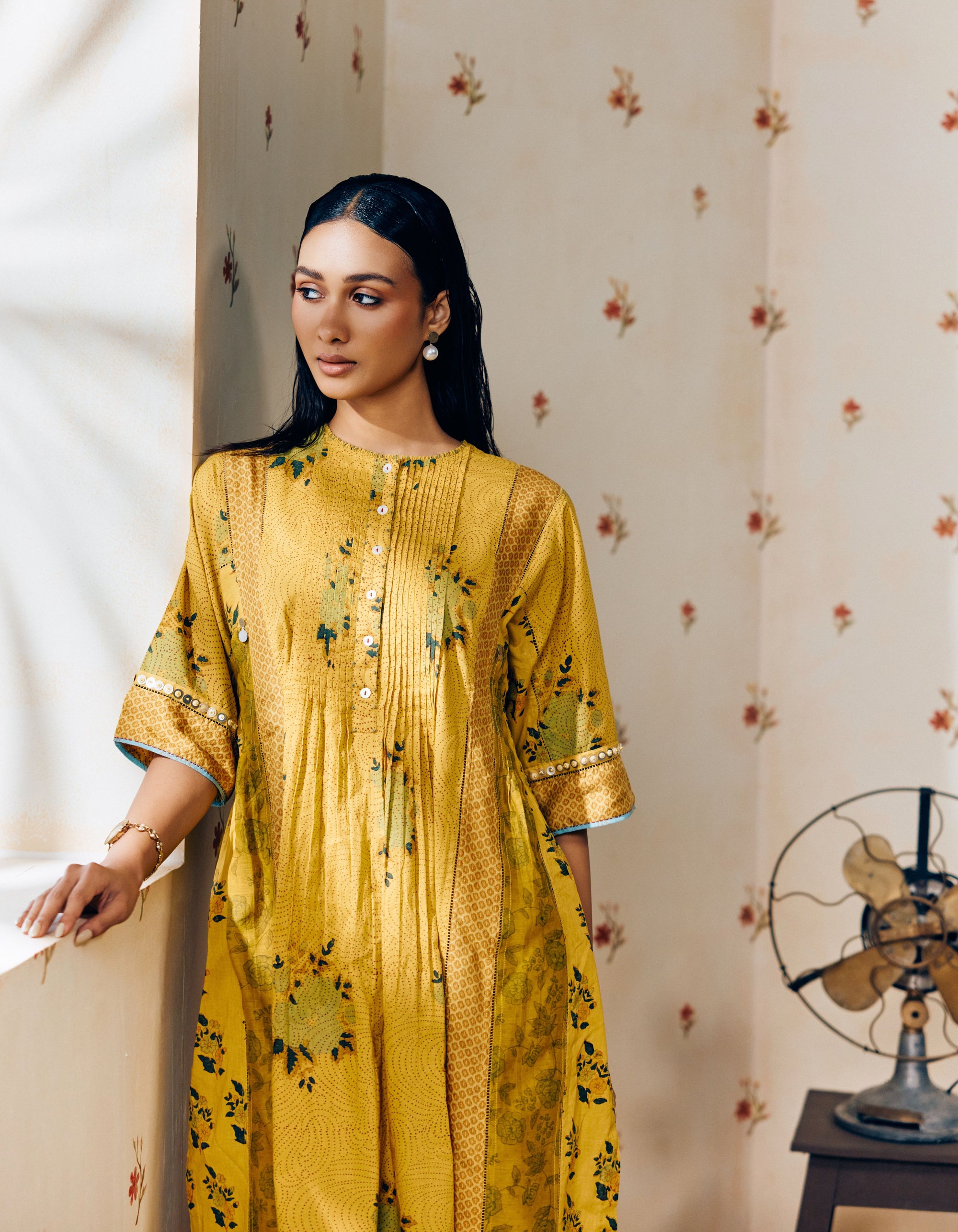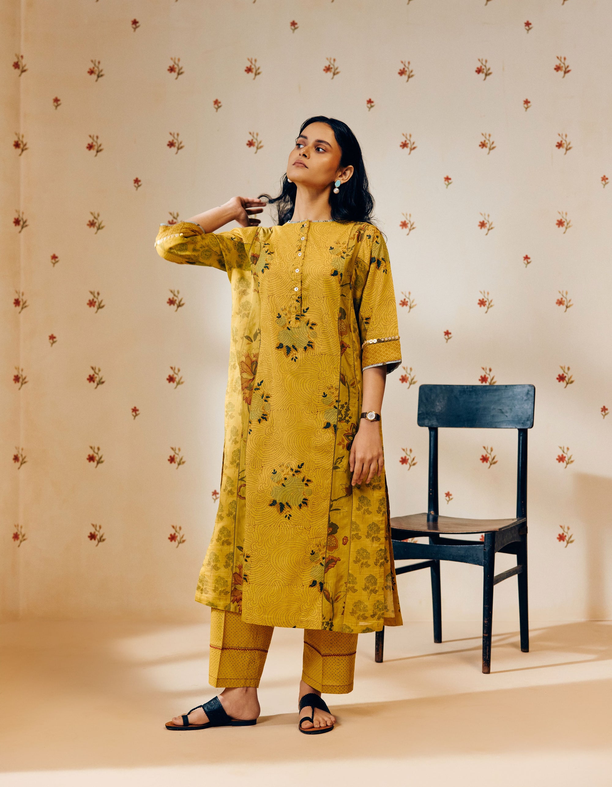 Mustard Front Gathers Hand Block Printed Multi Panel Mia Kurta Set